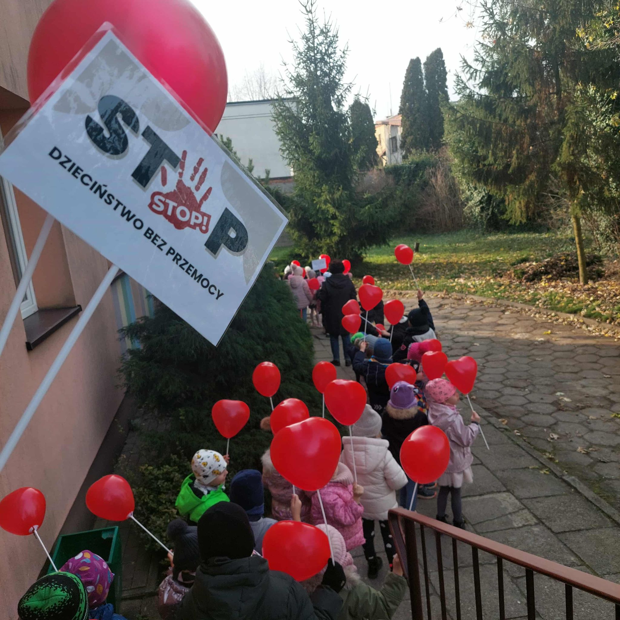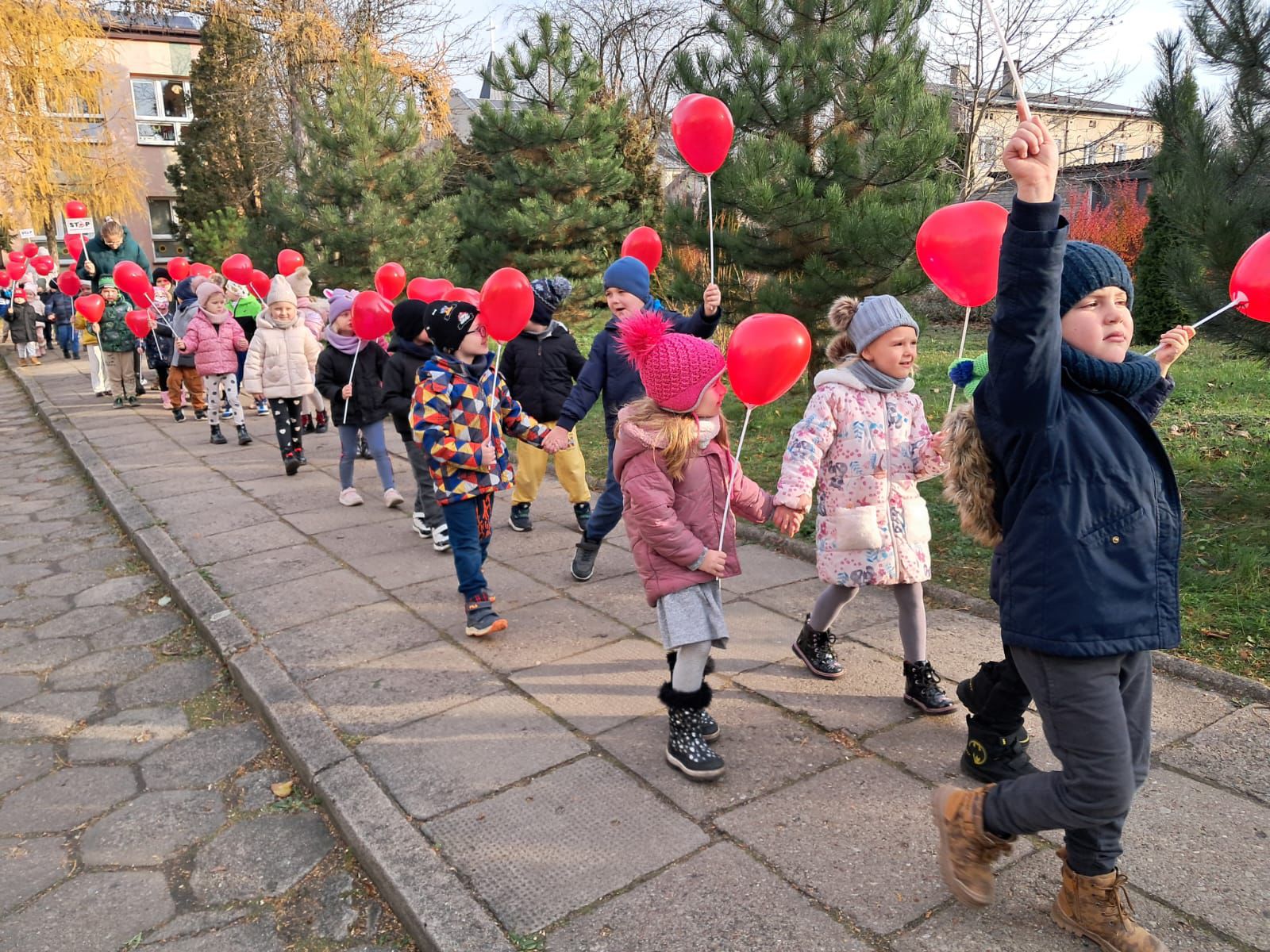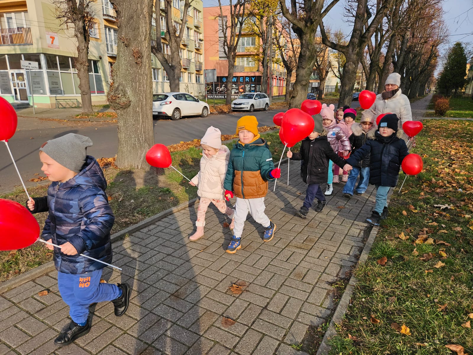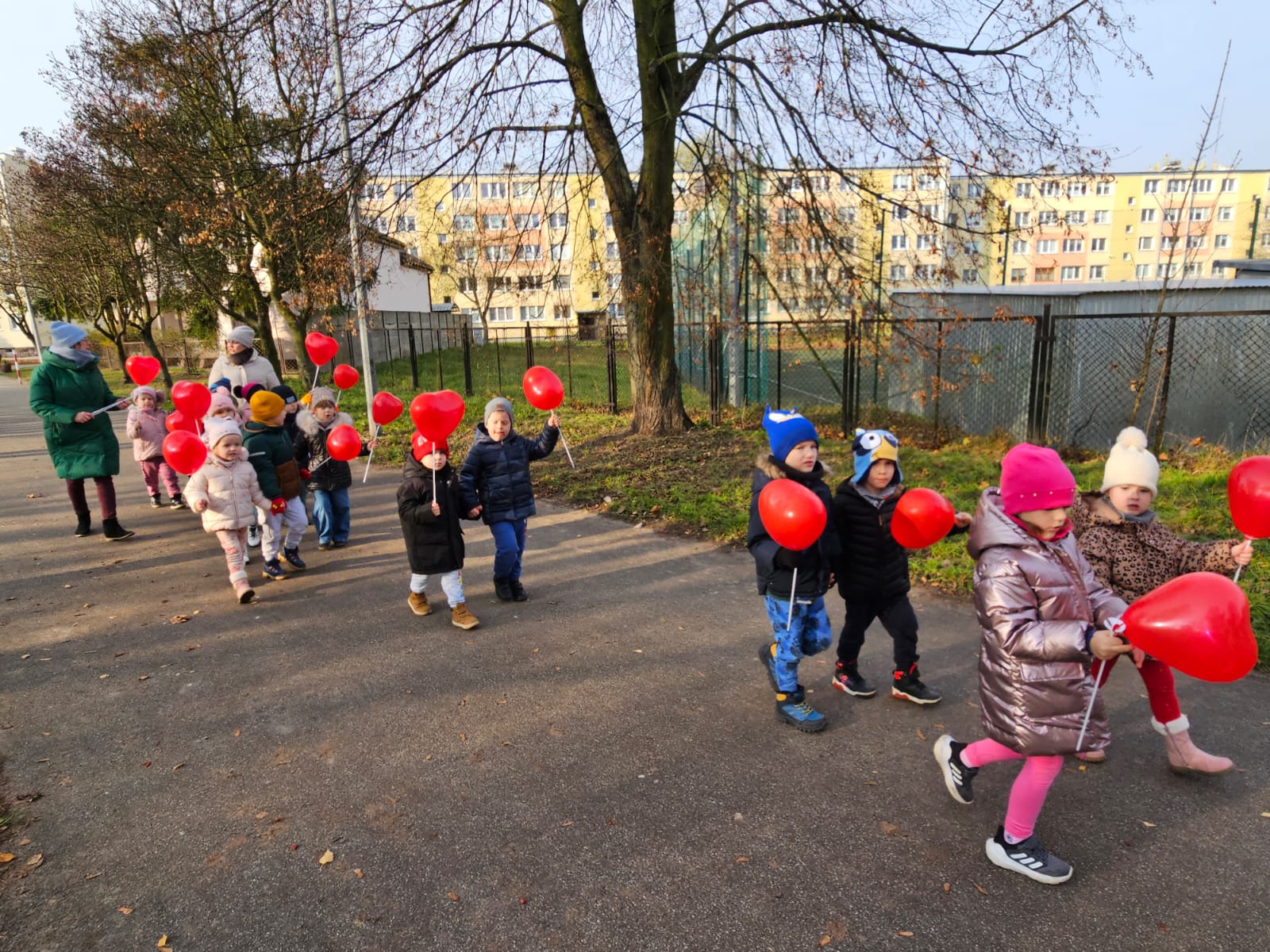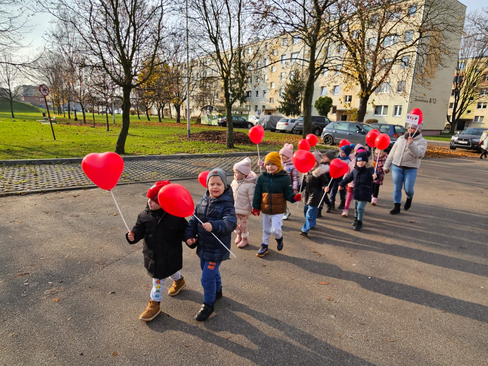 Dołączyliśmy się do Kampanii Ogólnopolskiej "Dzieciństwo Mocy Bez Przemocy". Rozmawialiśmy o przemocy z naszą panią psycholog. Potem otrzymaliśmy od niej czerwone balony w kształcie serc i ruszyliśmy w korowodzie ulicami osiedla. Wszyscy mogli nas zobaczyć i naszą dziecięcą radość.