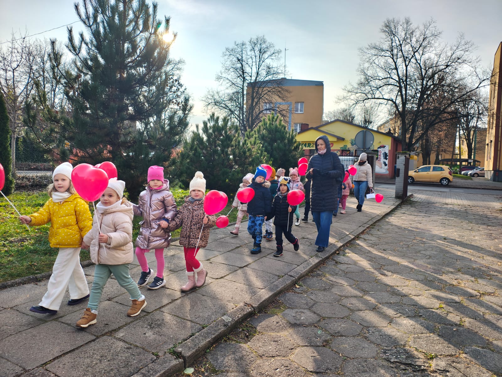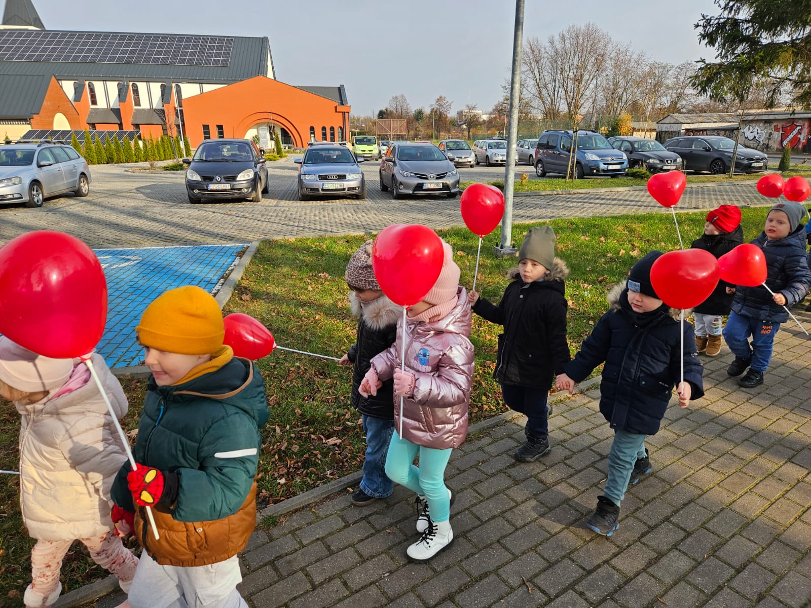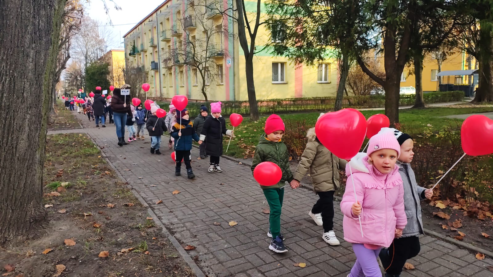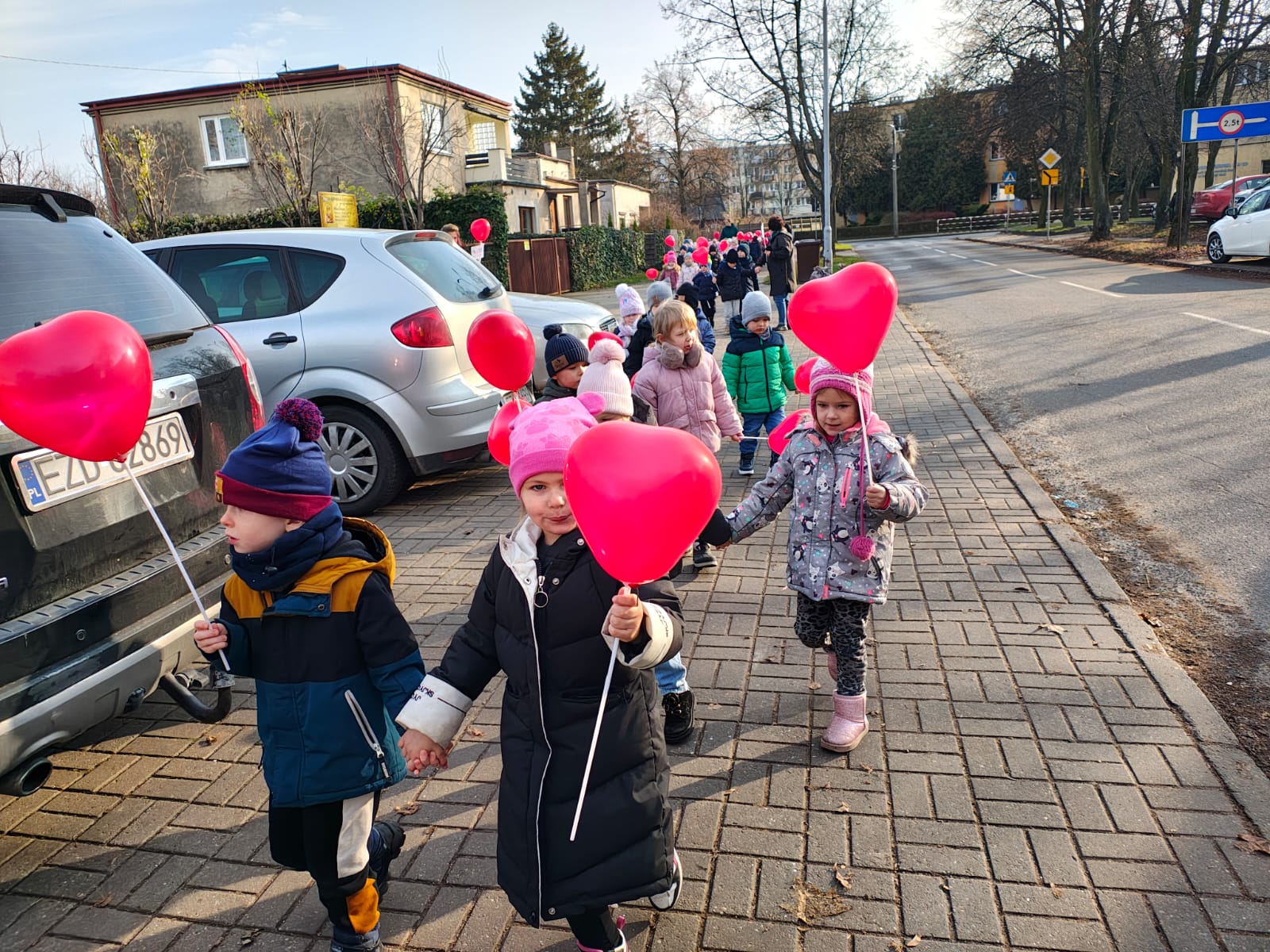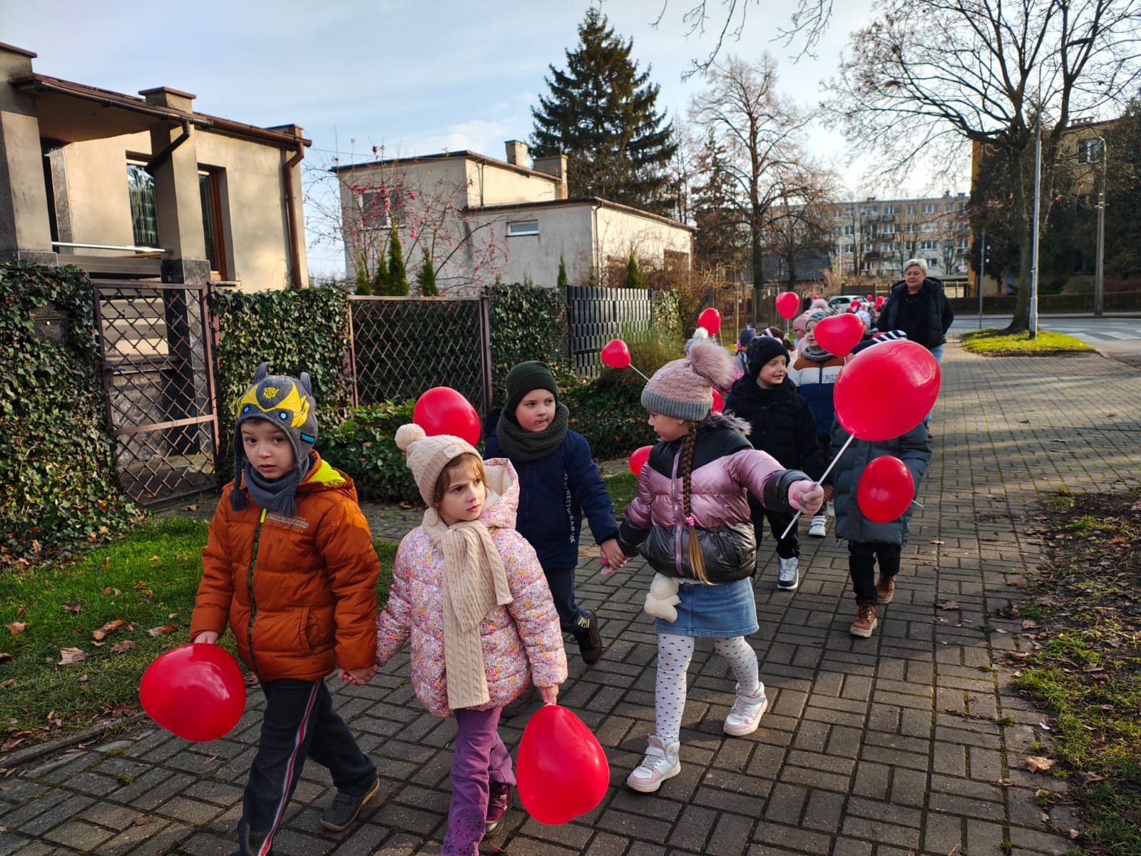 Dołączyliśmy się do Kampanii Ogólnopolskiej "Dzieciństwo Mocy Bez Przemocy". Rozmawialiśmy o przemocy z naszą panią psycholog. Potem otrzymaliśmy od niej czerwone balony w kształcie serc i ruszyliśmy w korowodzie ulicami osiedla. Wszyscy mogli nas zobaczyć i naszą dziecięcą radość.