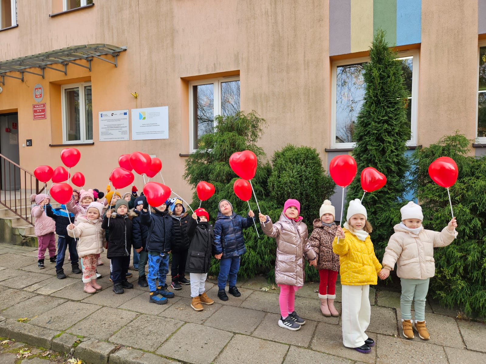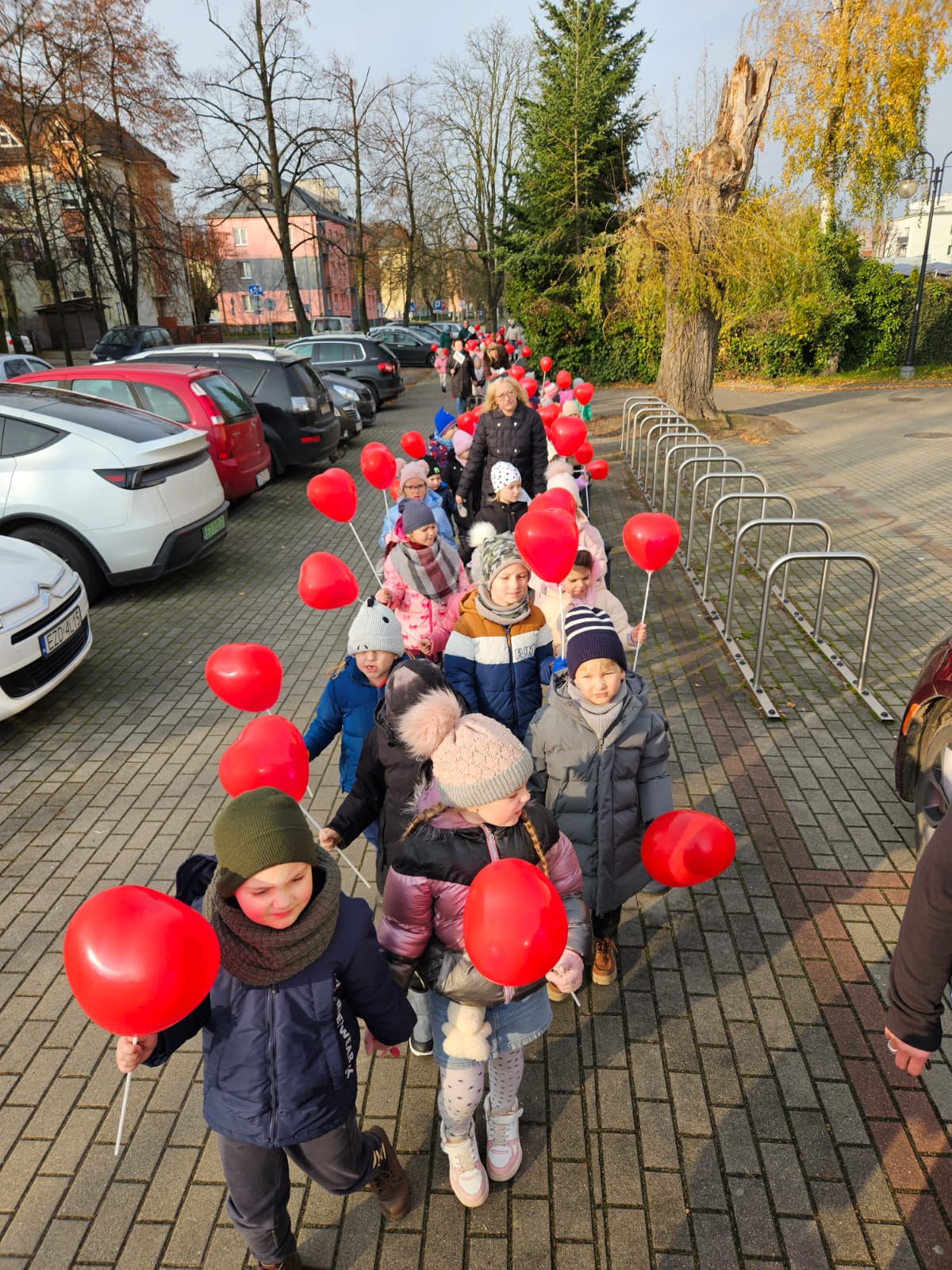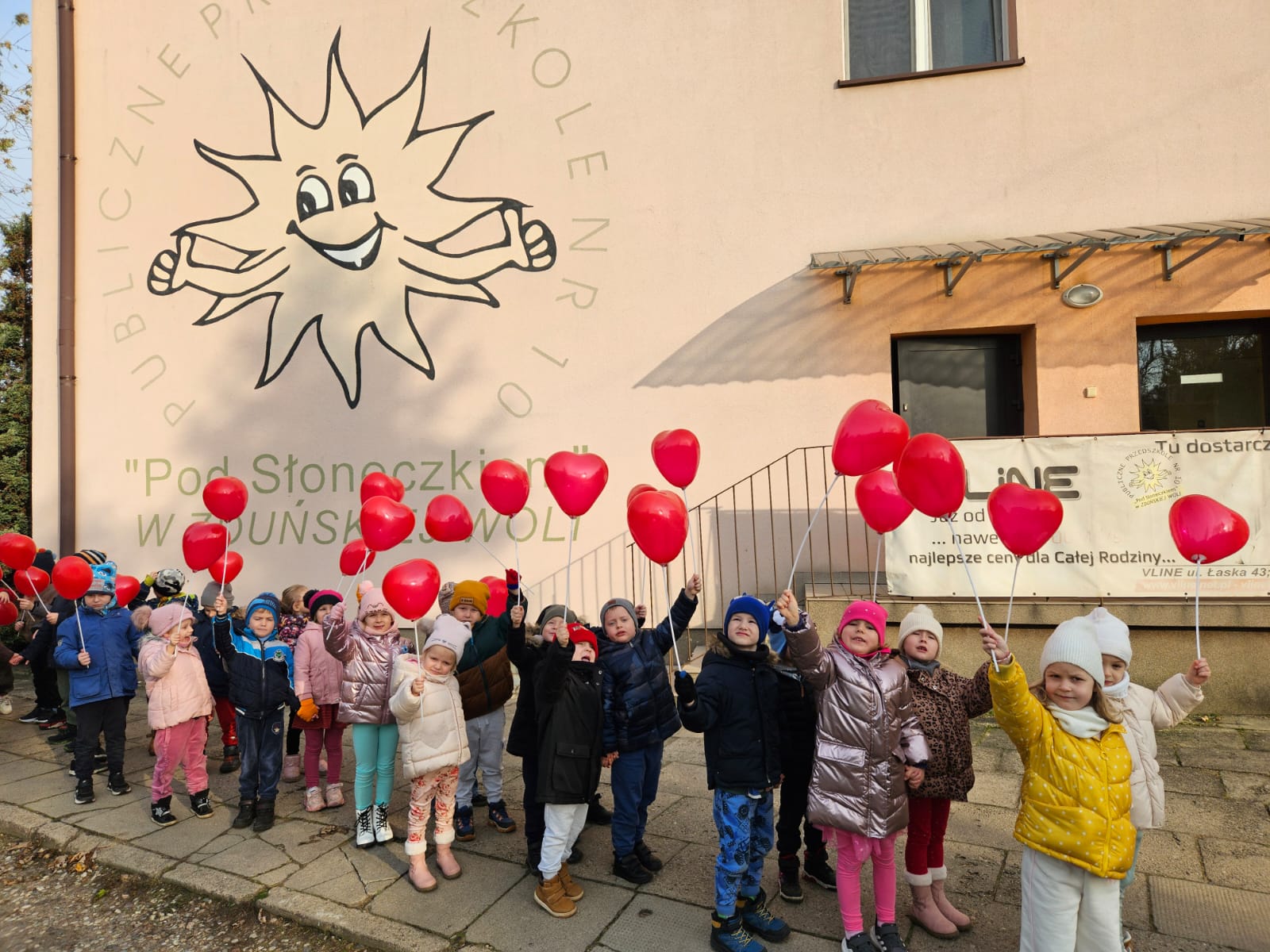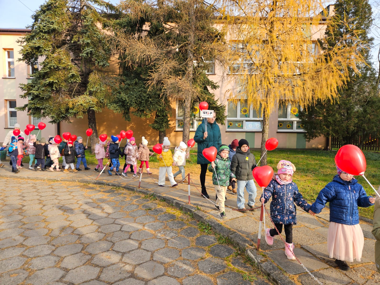 Dołączyliśmy się do Kampanii Ogólnopolskiej "Dzieciństwo Mocy Bez Przemocy". Rozmawialiśmy o przemocy z naszą panią psycholog. Potem otrzymaliśmy od niej czerwone balony w kształcie serc i ruszyliśmy w korowodzie ulicami osiedla. Wszyscy mogli nas zobaczyć i naszą dziecięcą radość.
