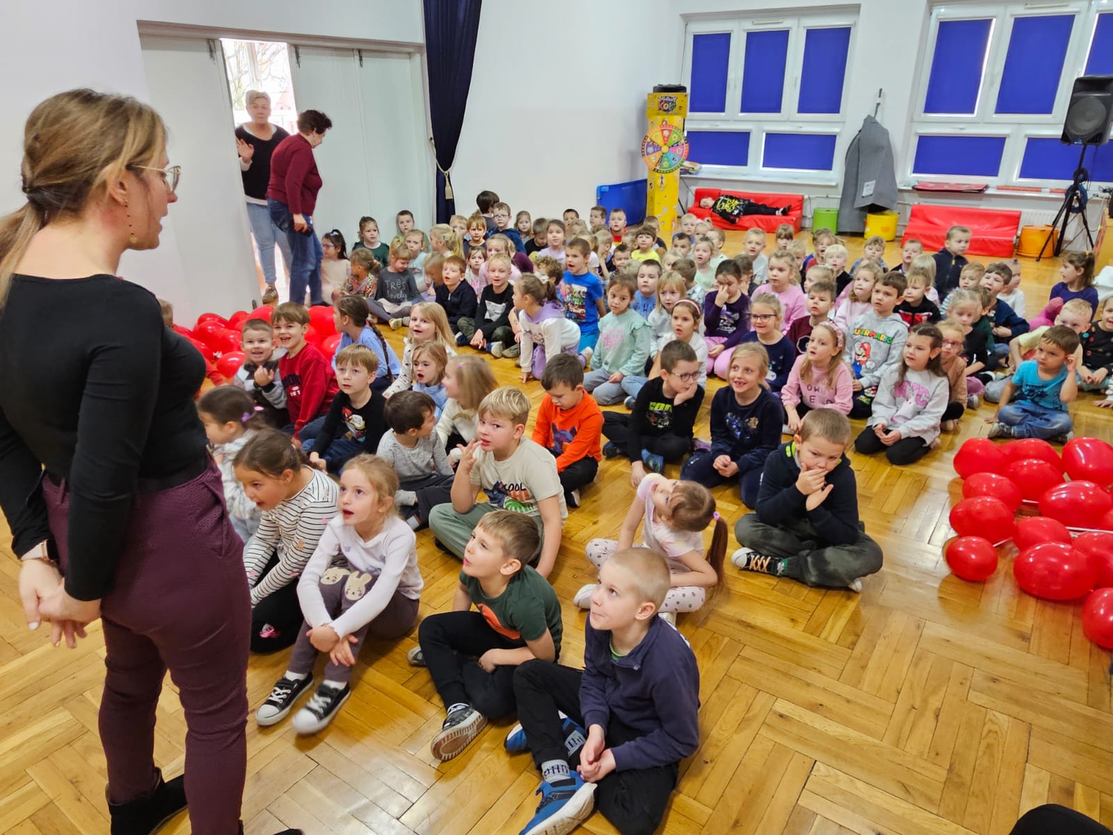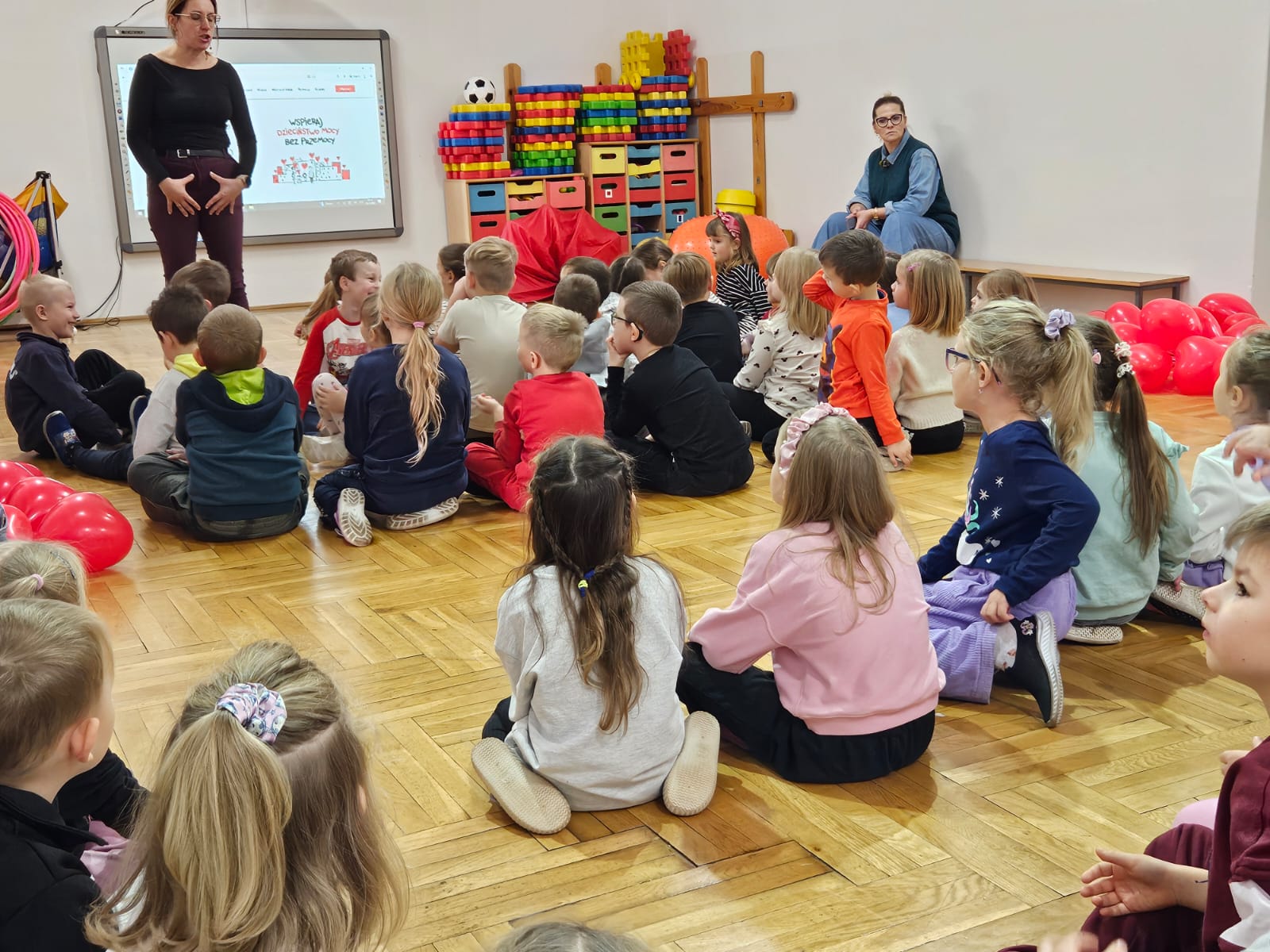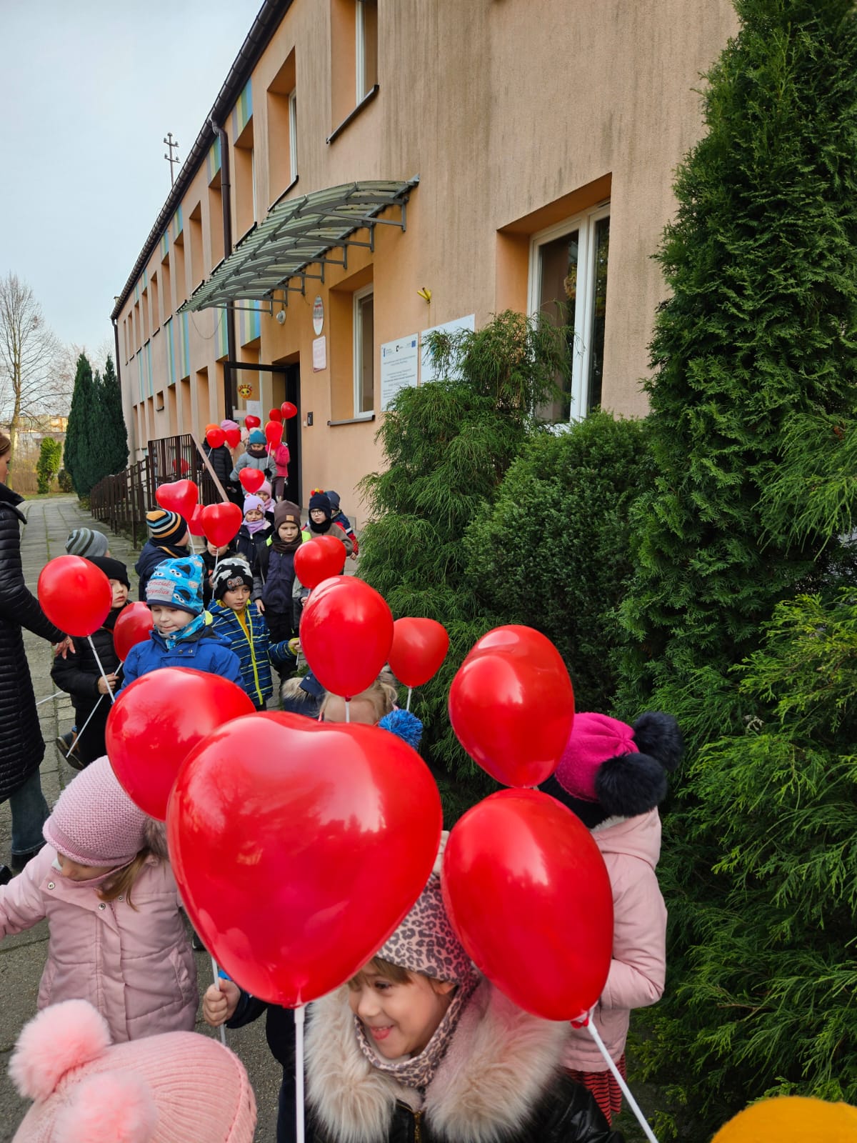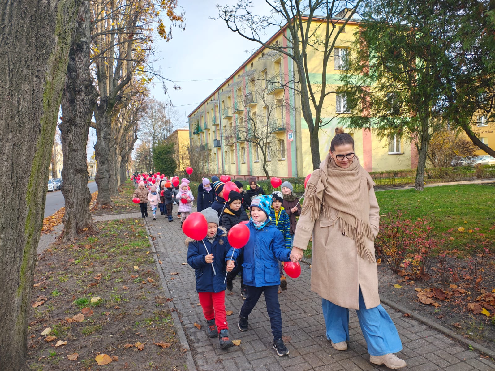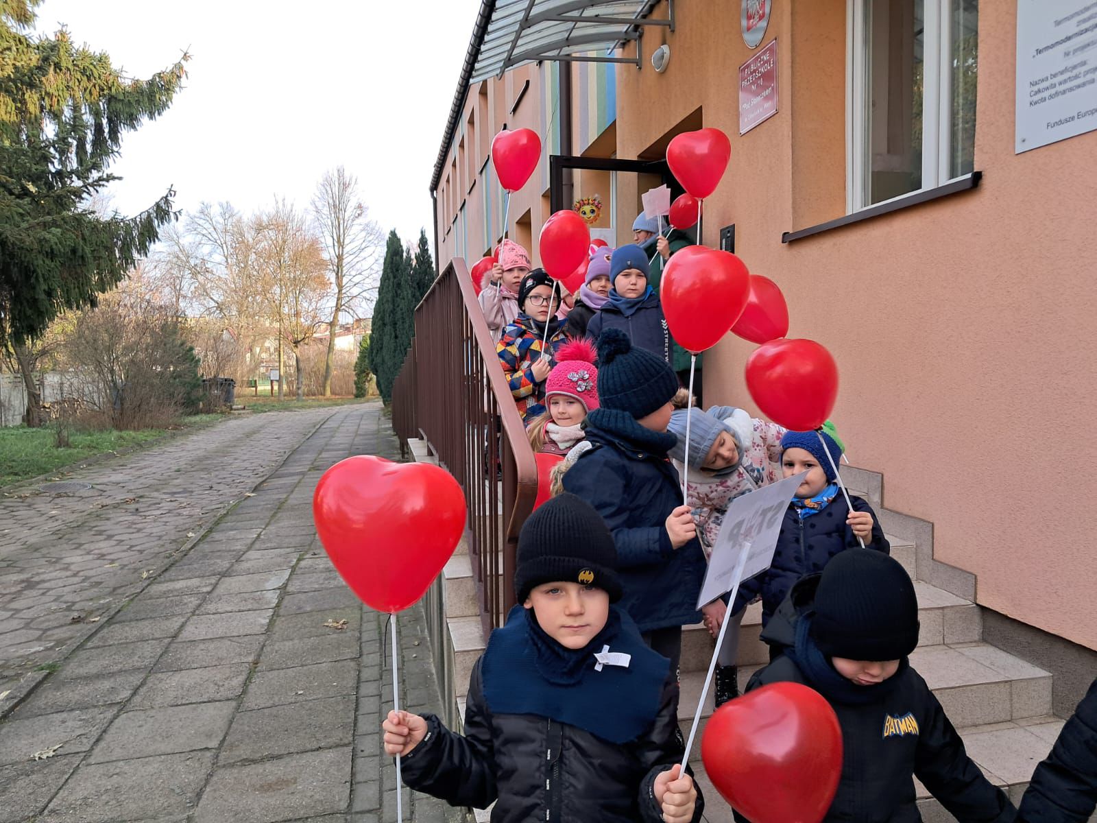 Dołączyliśmy się do Kampanii Ogólnopolskiej "Dzieciństwo Mocy Bez Przemocy". Rozmawialiśmy o przemocy z naszą panią psycholog. Potem otrzymaliśmy od niej czerwone balony w kształcie serc i ruszyliśmy w korowodzie ulicami osiedla. Wszyscy mogli nas zobaczyć i naszą dziecięcą radość.