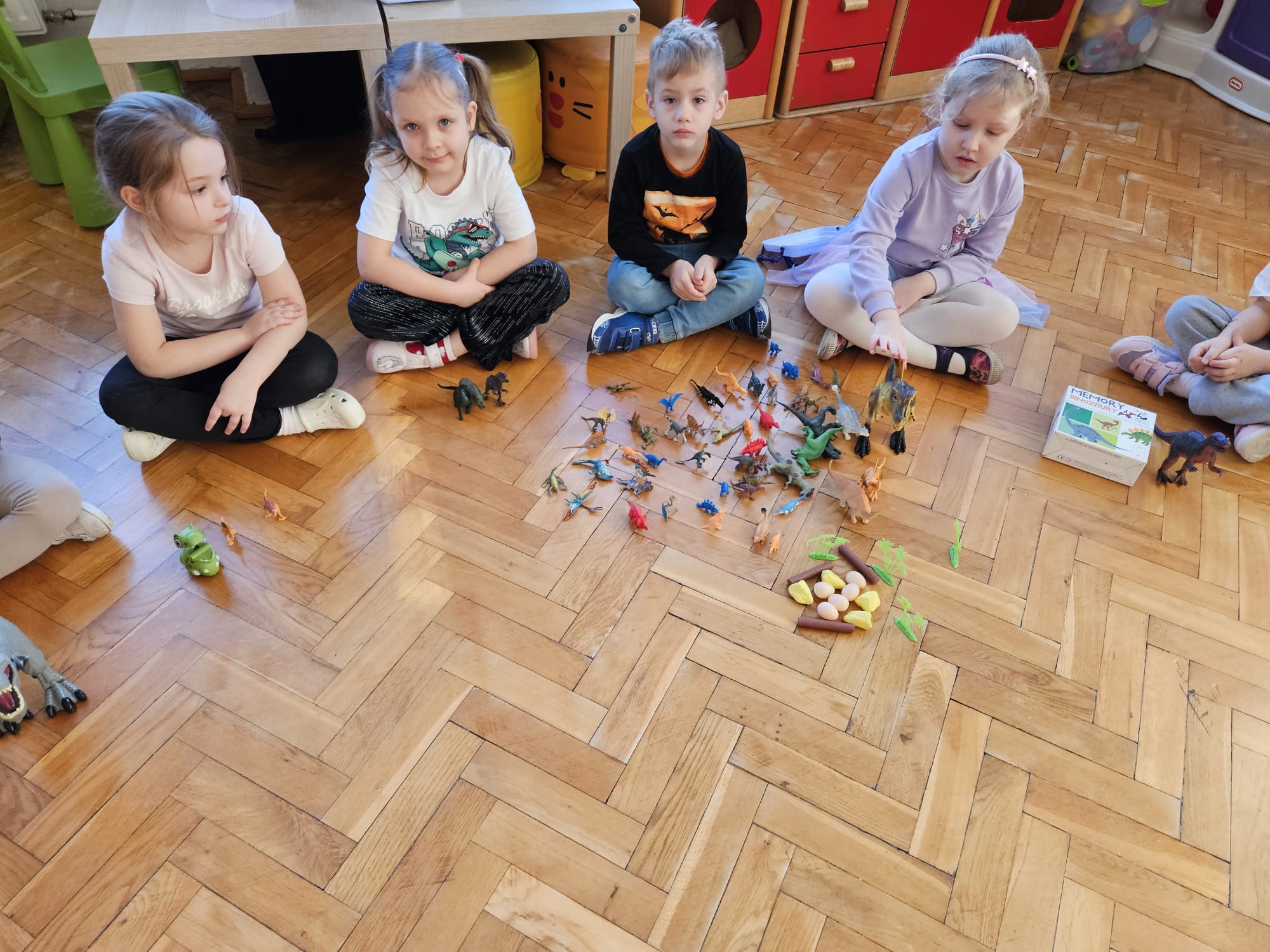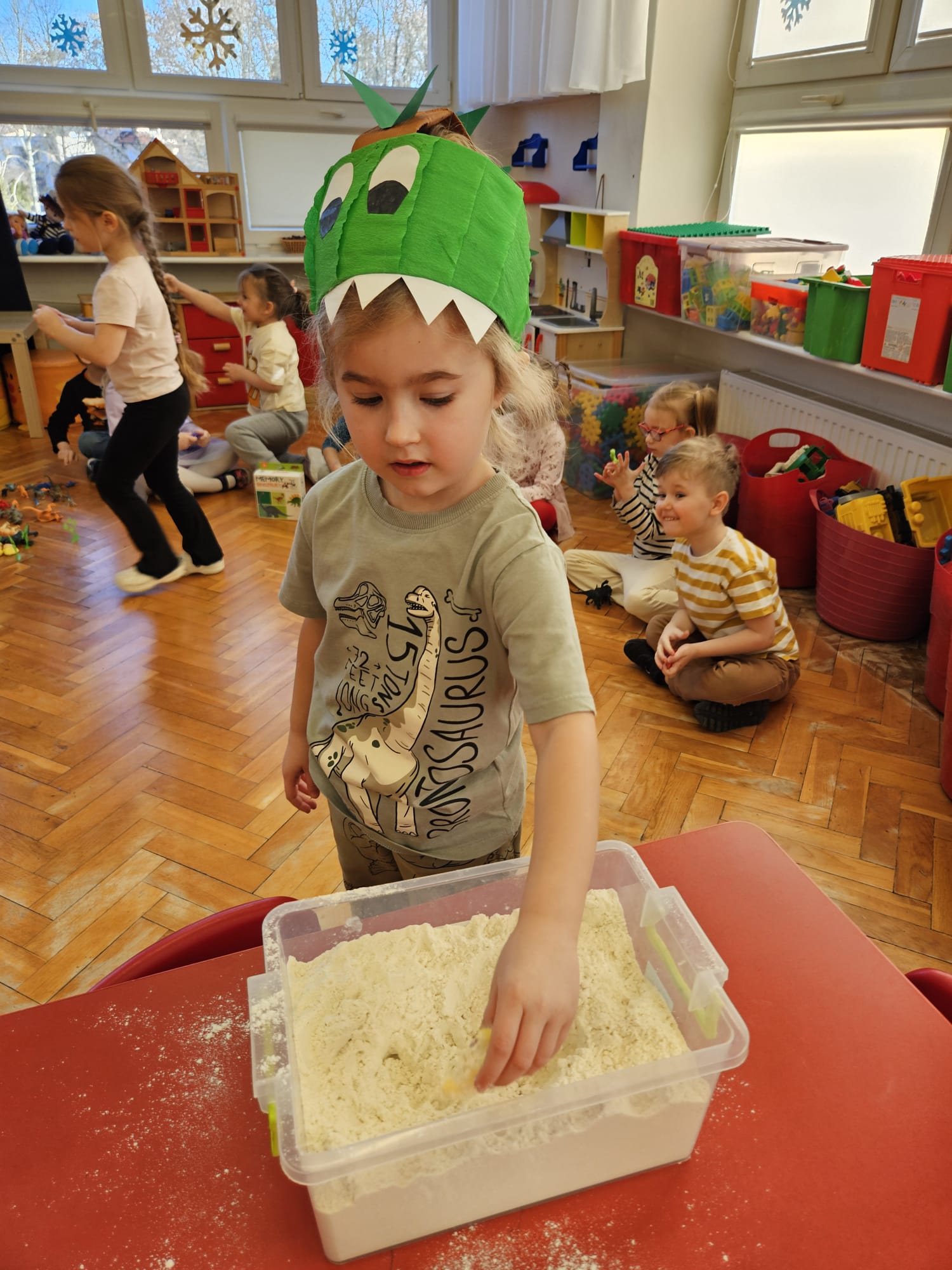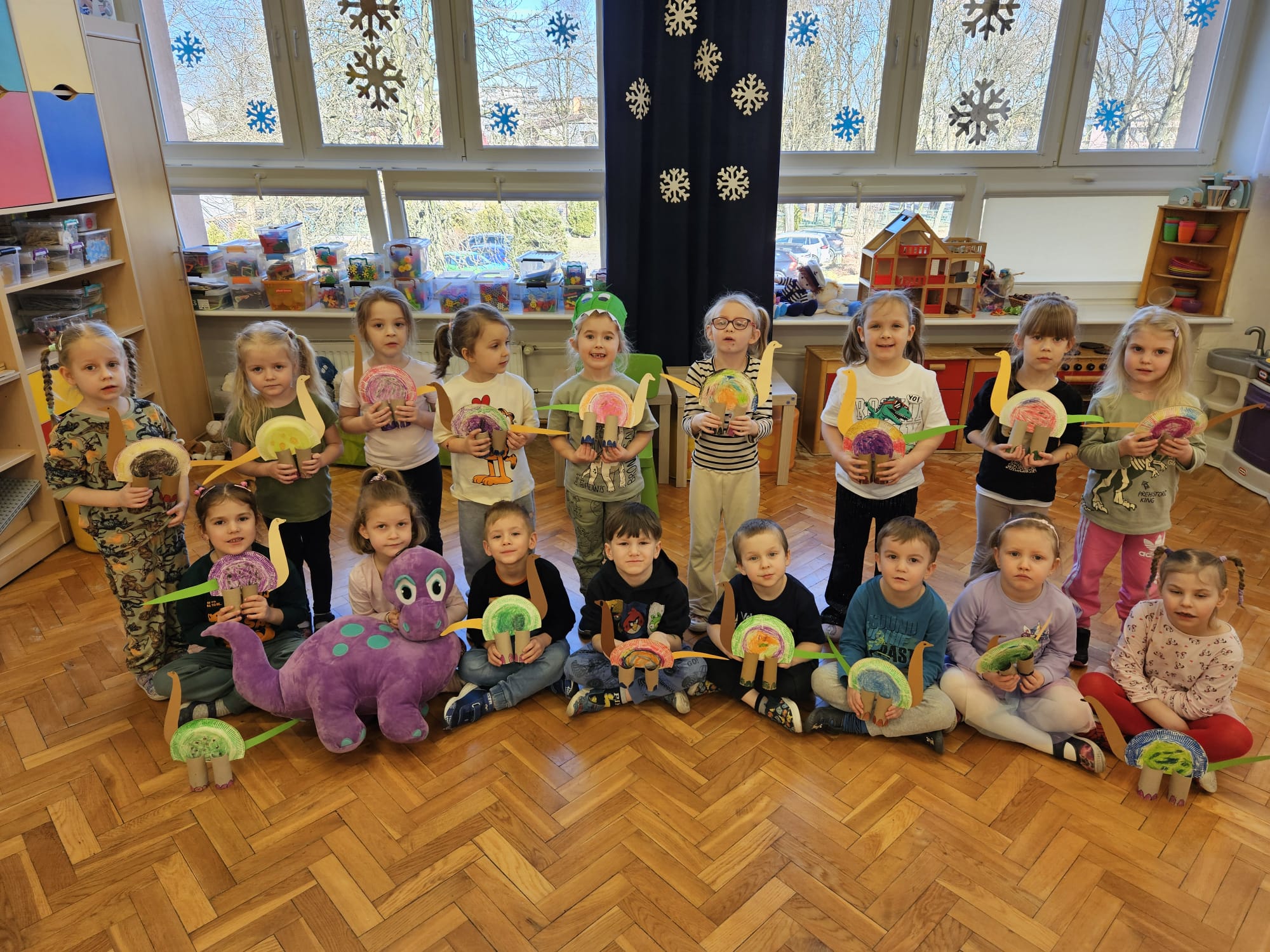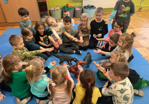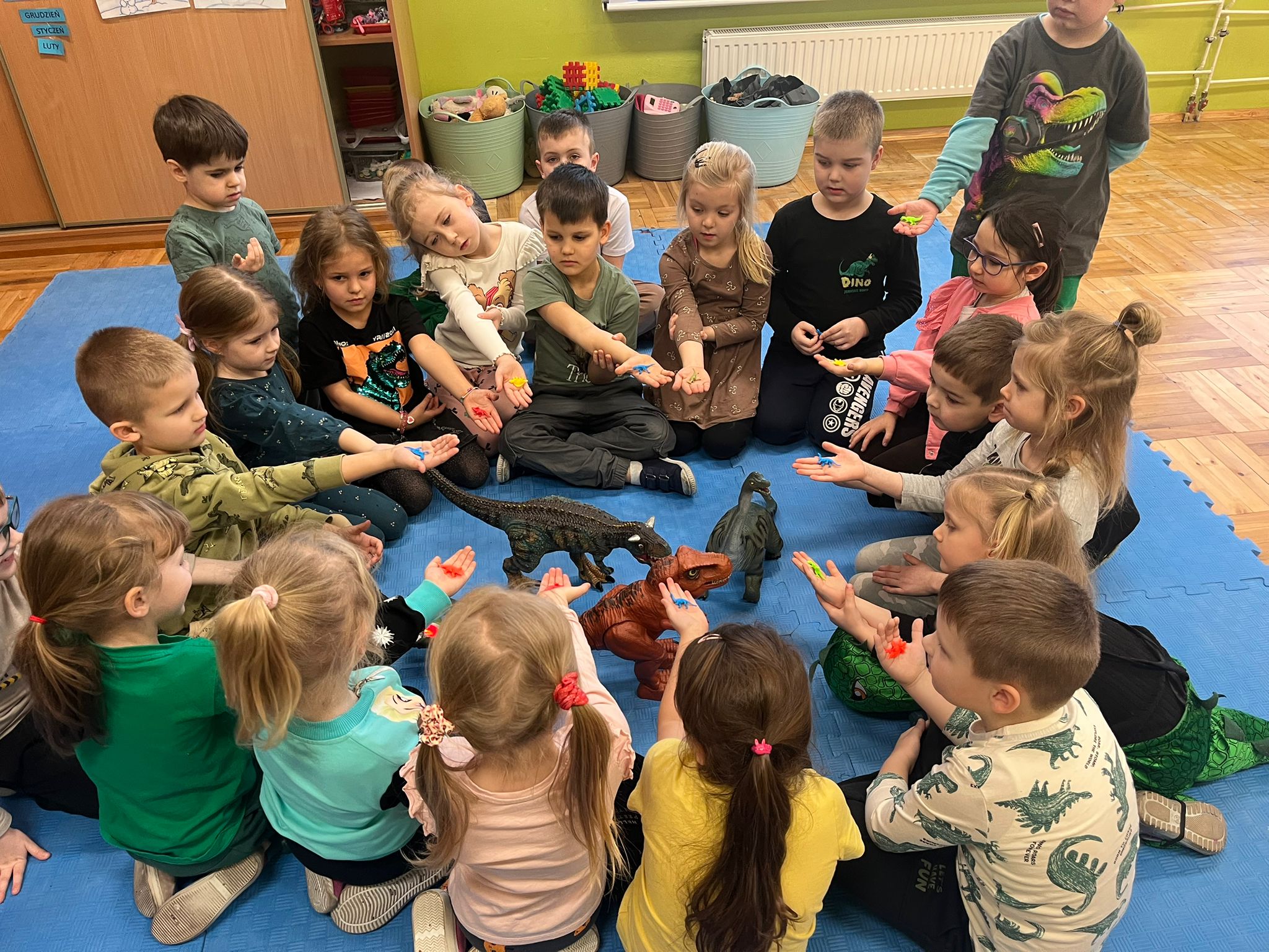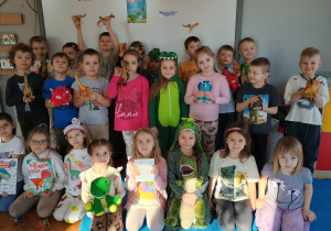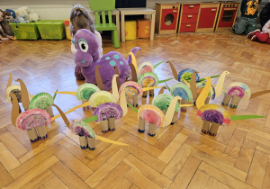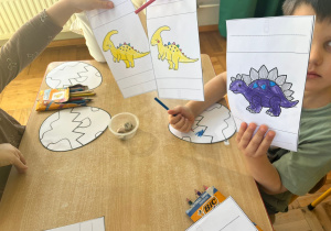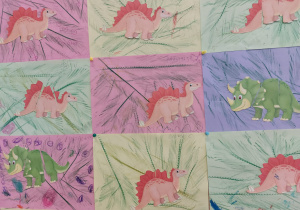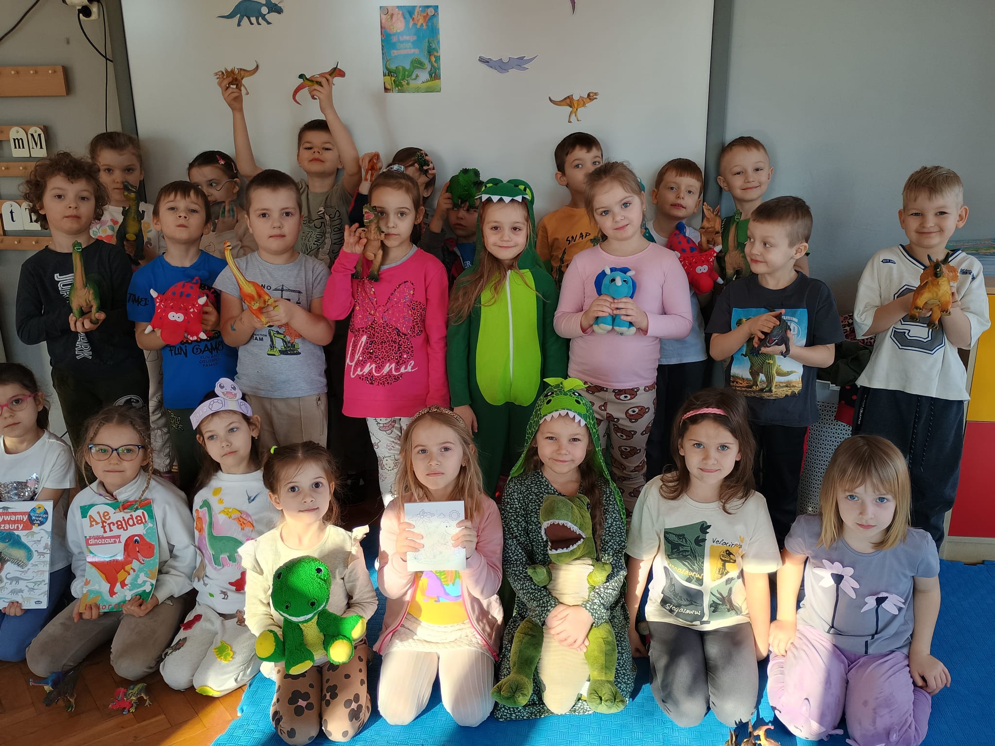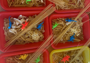 Od rana do przedszkola szliśmy bardzo ciekawi wydarzeń tego dnia. W torebkach i kieszeniach nieśliśmy dinozaury różnej wielkości. Niektórzy z nas przebrali się za dinozaury. Po poznaniu ciekawostek na ich temat i obejrzeniu naszych zbiorów przeszliśmy do zabaw z dinozaurami. Były zabawy badawcze - robiliśmy wybuch wulkanu z octu i sody, płynu do mycia naczyń i barwnika. Prowadziliśmy wykopaliska archeologiczne w mące. Układaliśmy szkielety dinozaurów w masie solnej. Układaliśmy dinozaury z części, tworzyliśmy prace plastyczne w jurajskim parku. To był niezwykły dzień.
