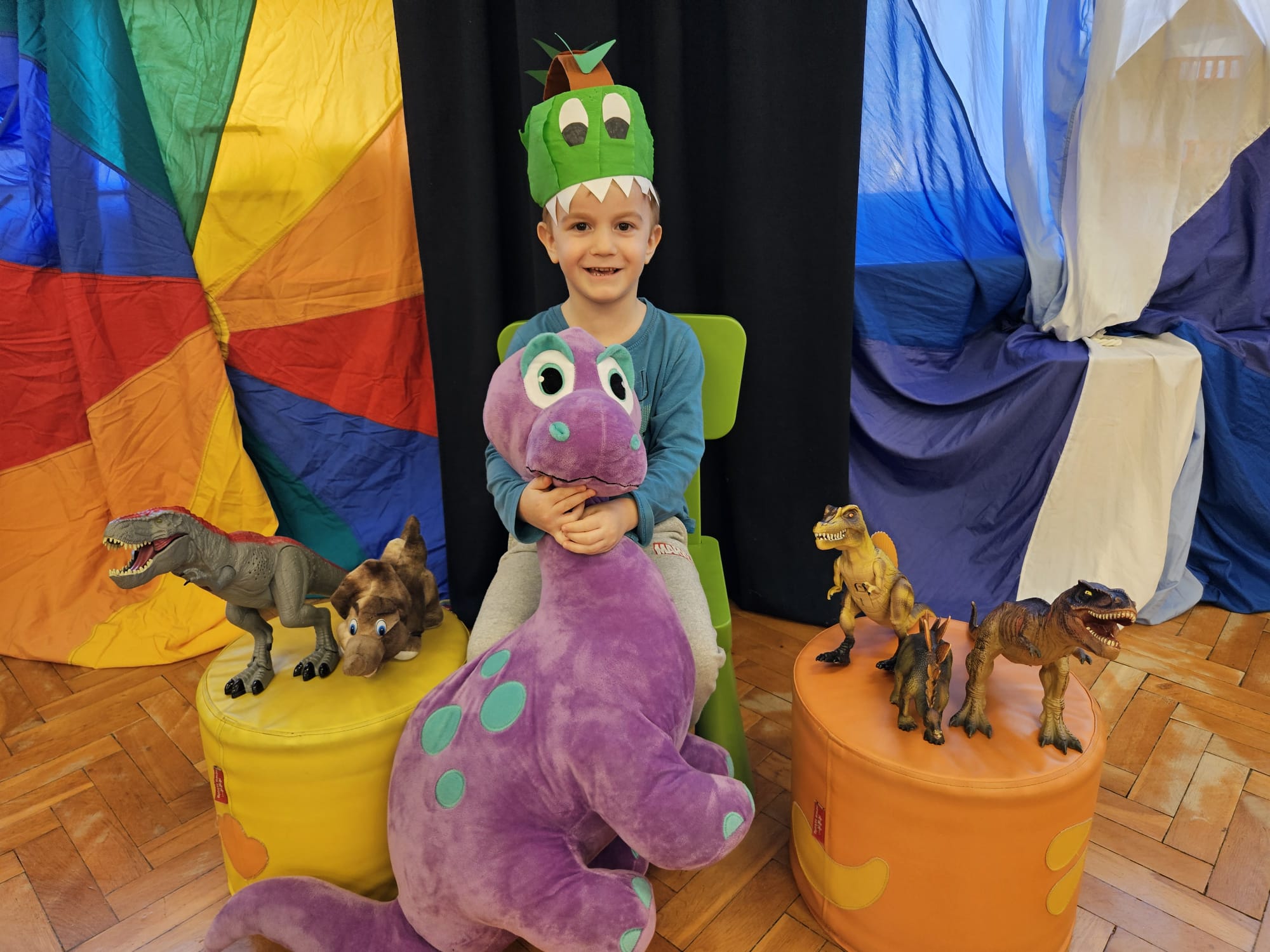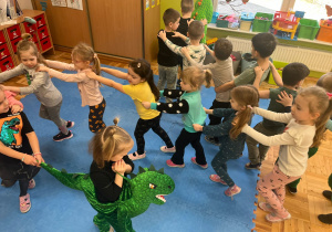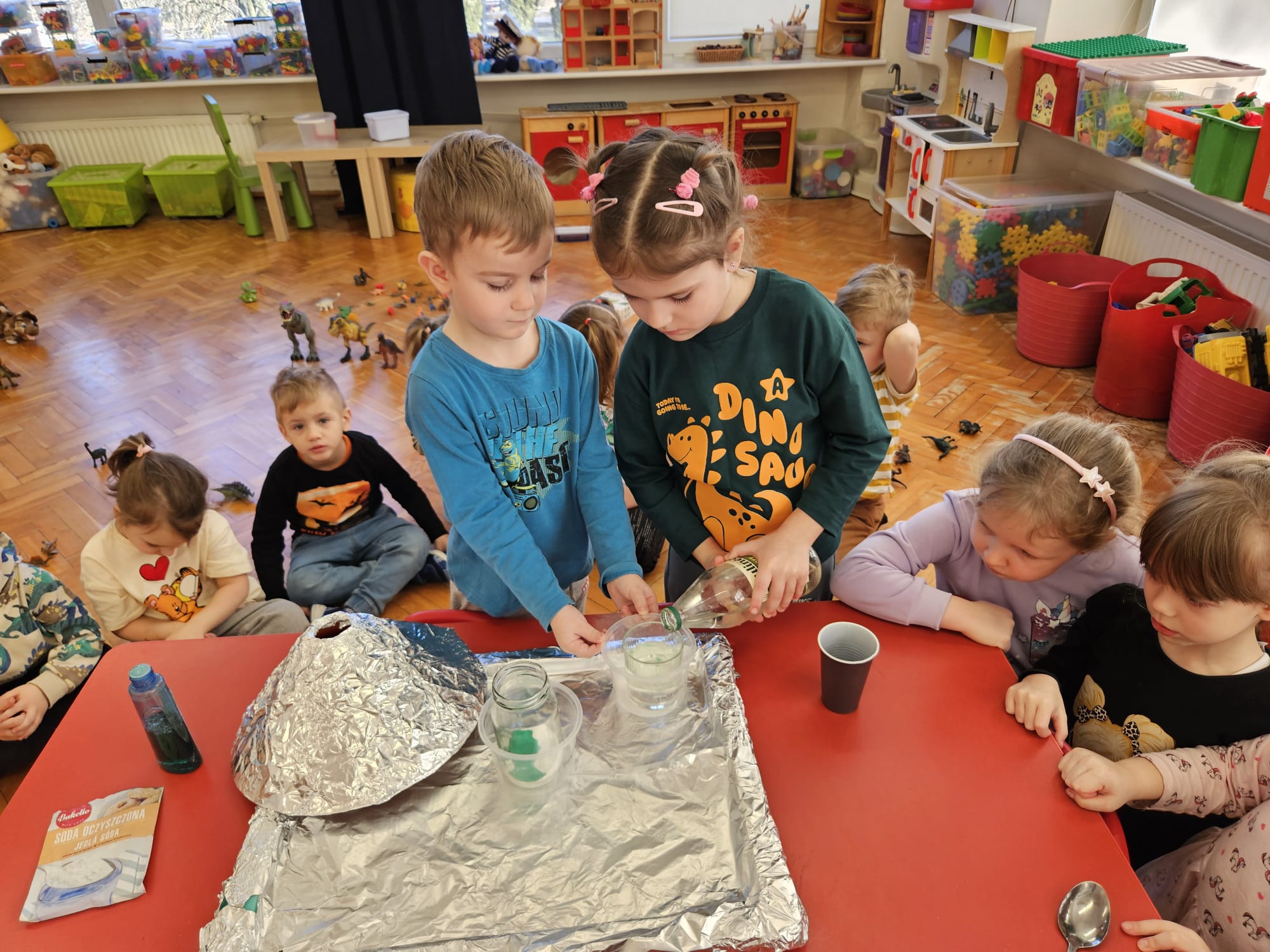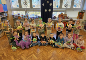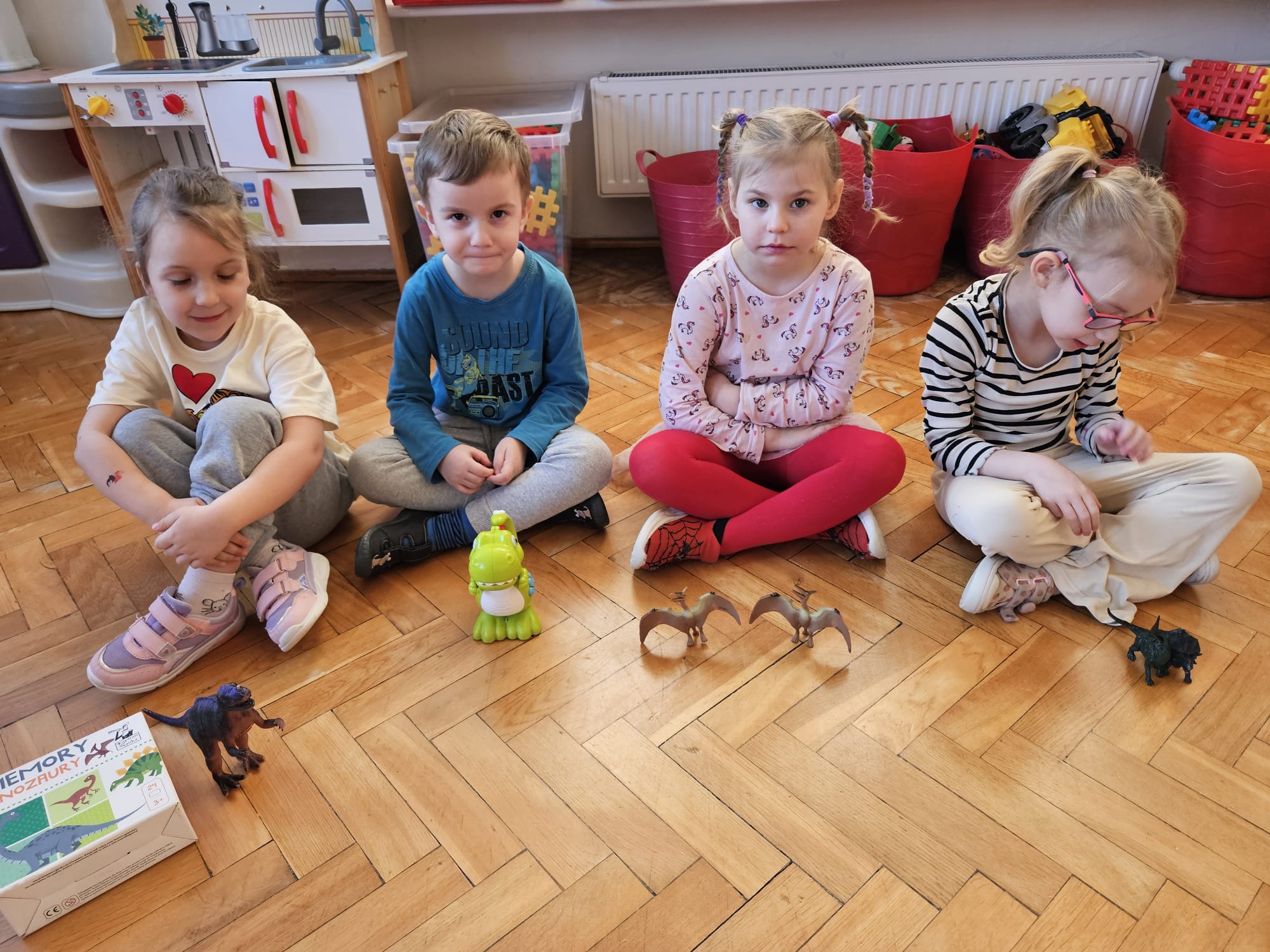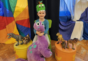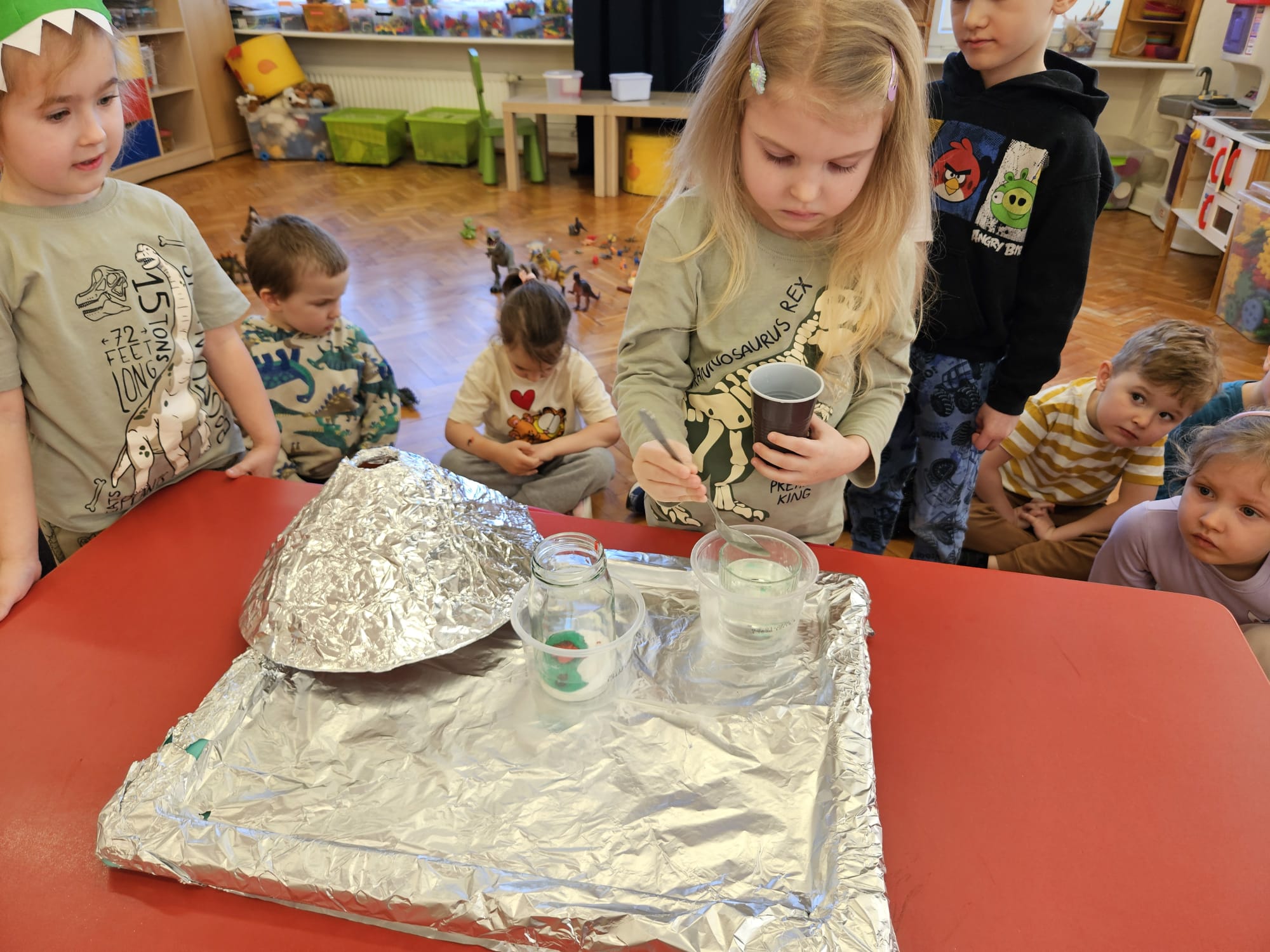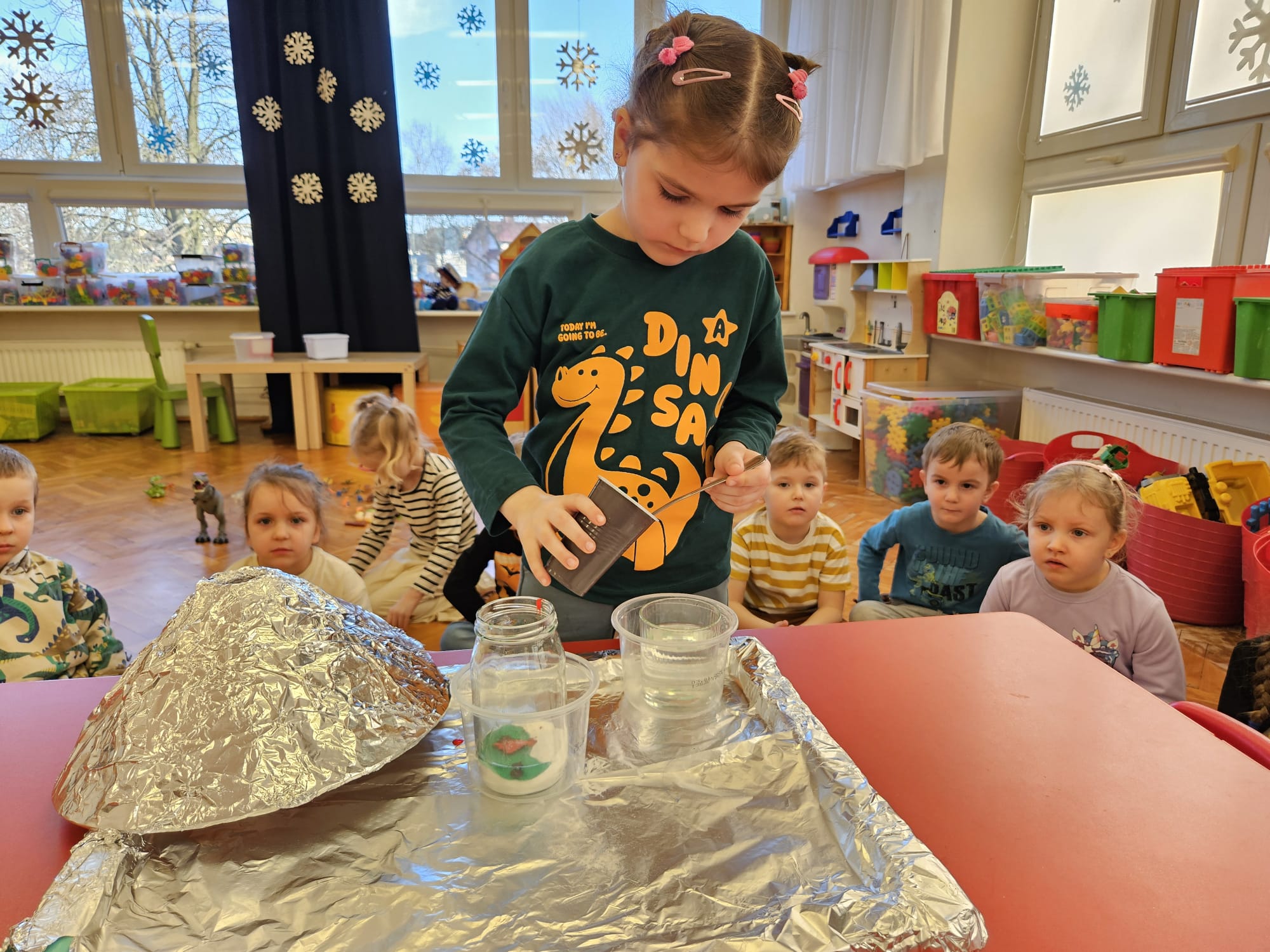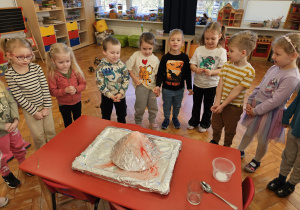 Od rana do przedszkola szliśmy bardzo ciekawi wydarzeń tego dnia. W torebkach i kieszeniach nieśliśmy dinozaury różnej wielkości. Niektórzy z nas przebrali się za dinozaury. Po poznaniu ciekawostek na ich temat i obejrzeniu naszych zbiorów przeszliśmy do zabaw z dinozaurami. Były zabawy badawcze - robiliśmy wybuch wulkanu z octu i sody, płynu do mycia naczyń i barwnika. Prowadziliśmy wykopaliska archeologiczne w mące. Układaliśmy szkielety dinozaurów w masie solnej. Układaliśmy dinozaury z części, tworzyliśmy prace plastyczne w jurajskim parku. To był niezwykły dzień.