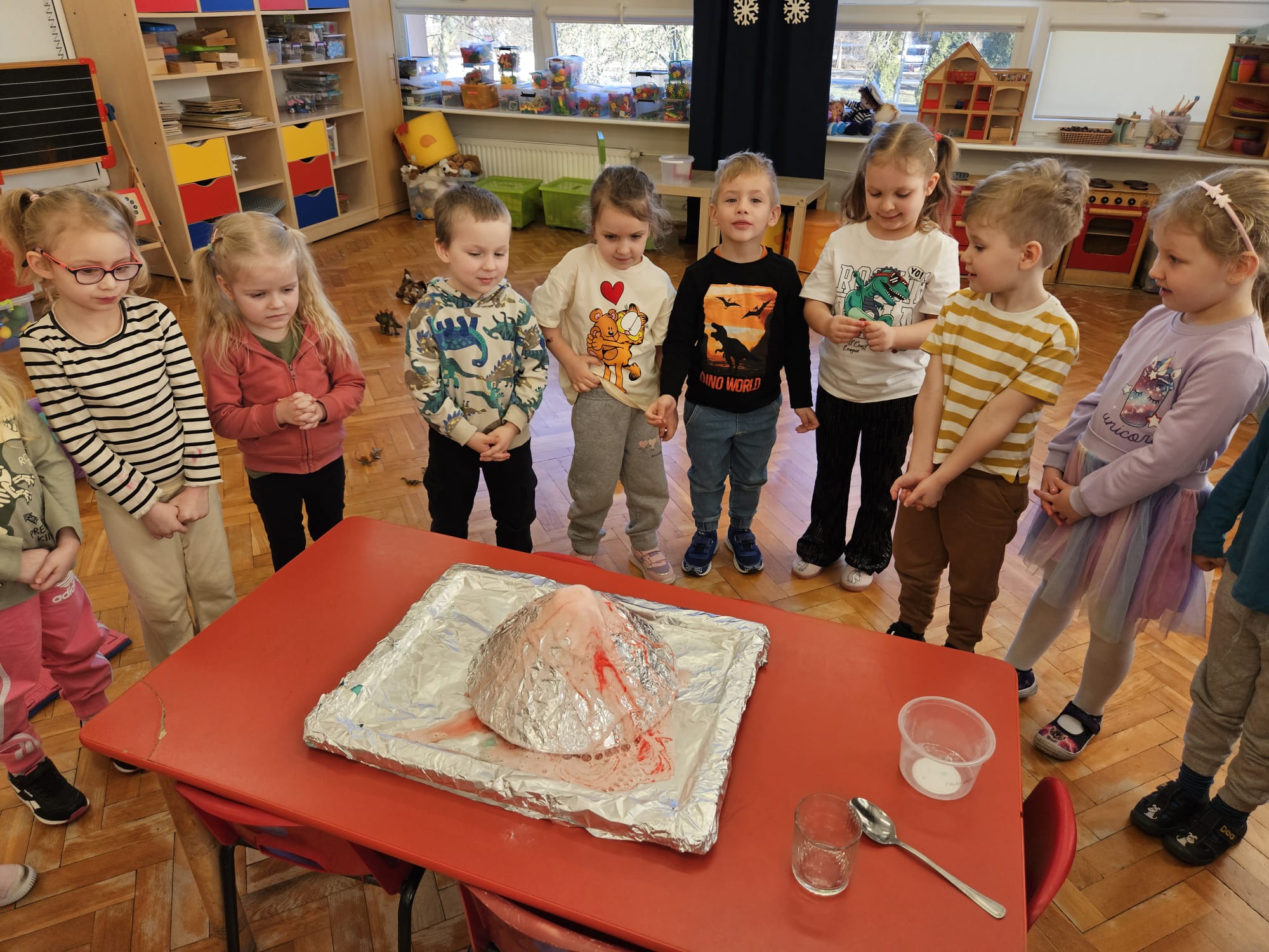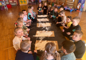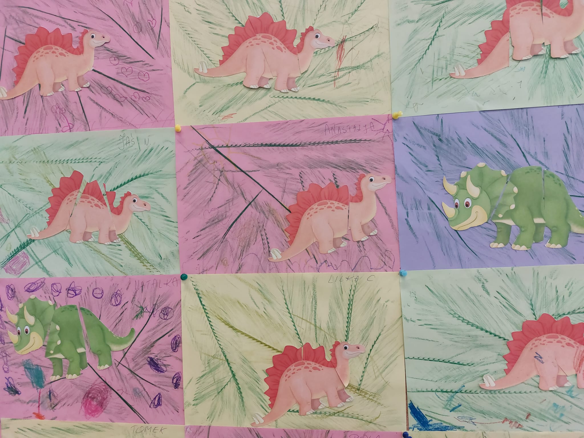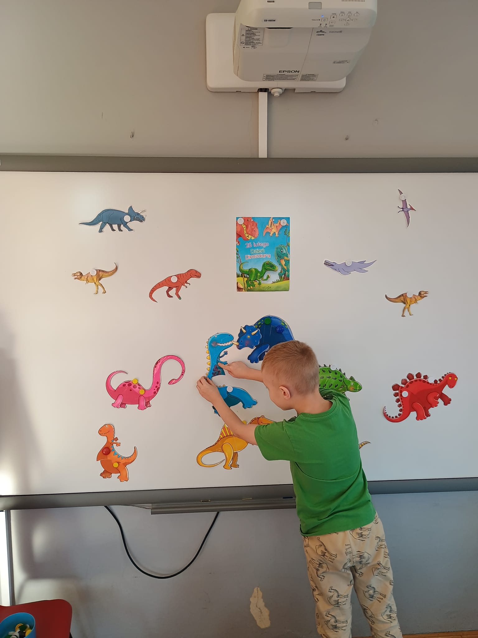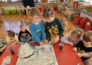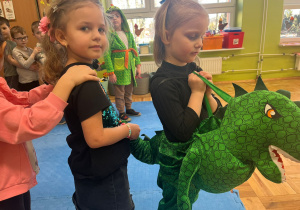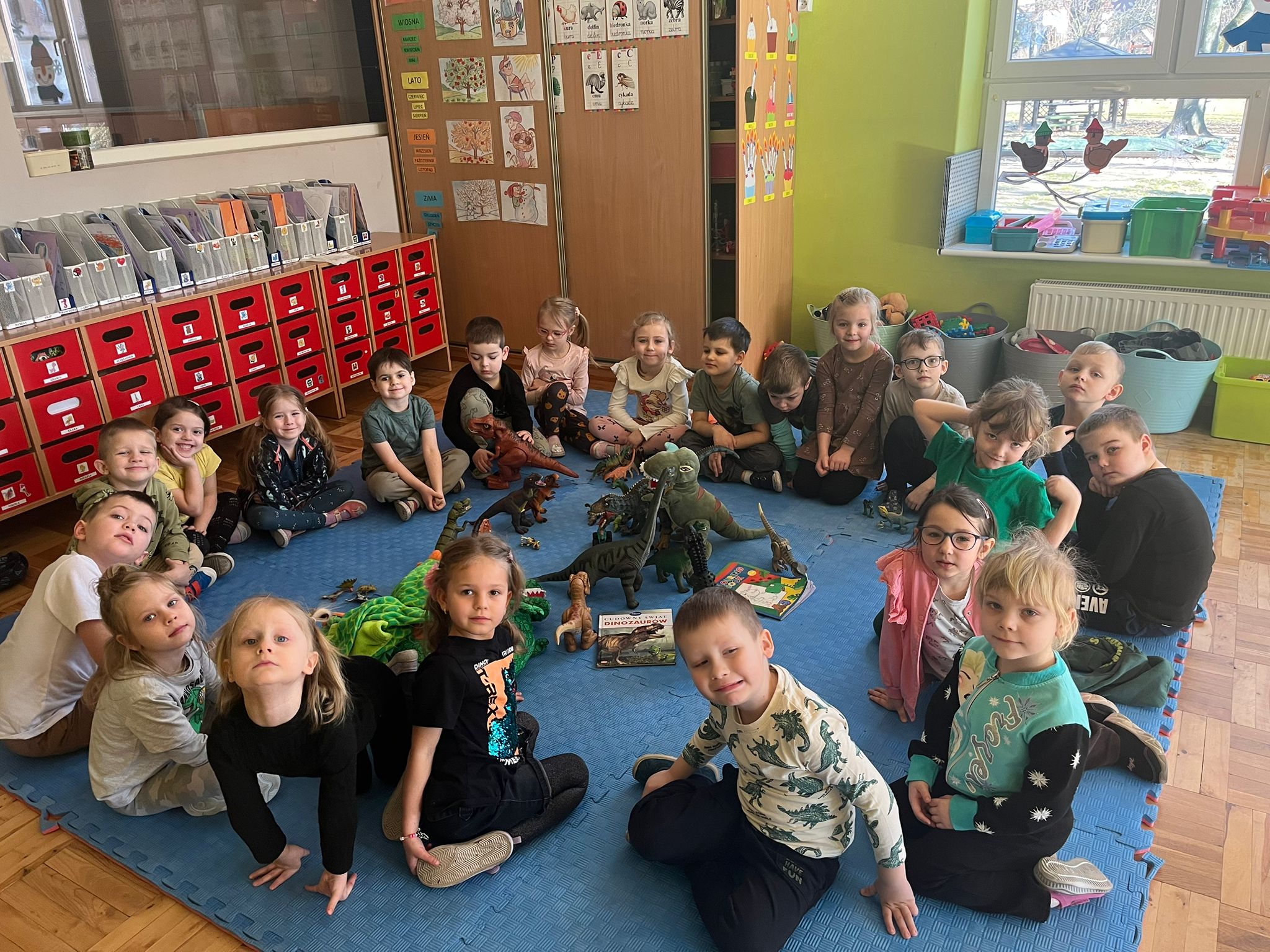 Od rana do przedszkola szliśmy bardzo ciekawi wydarzeń tego dnia. W torebkach i kieszeniach nieśliśmy dinozaury różnej wielkości. Niektórzy z nas przebrali się za dinozaury. Po poznaniu ciekawostek na ich temat i obejrzeniu naszych zbiorów przeszliśmy do zabaw z dinozaurami. Były zabawy badawcze - robiliśmy wybuch wulkanu z octu i sody, płynu do mycia naczyń i barwnika. Prowadziliśmy wykopaliska archeologiczne w mące. Układaliśmy szkielety dinozaurów w masie solnej. Układaliśmy dinozaury z części, tworzyliśmy prace plastyczne w jurajskim parku. To był niezwykły dzień.