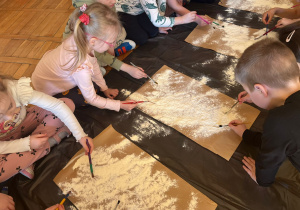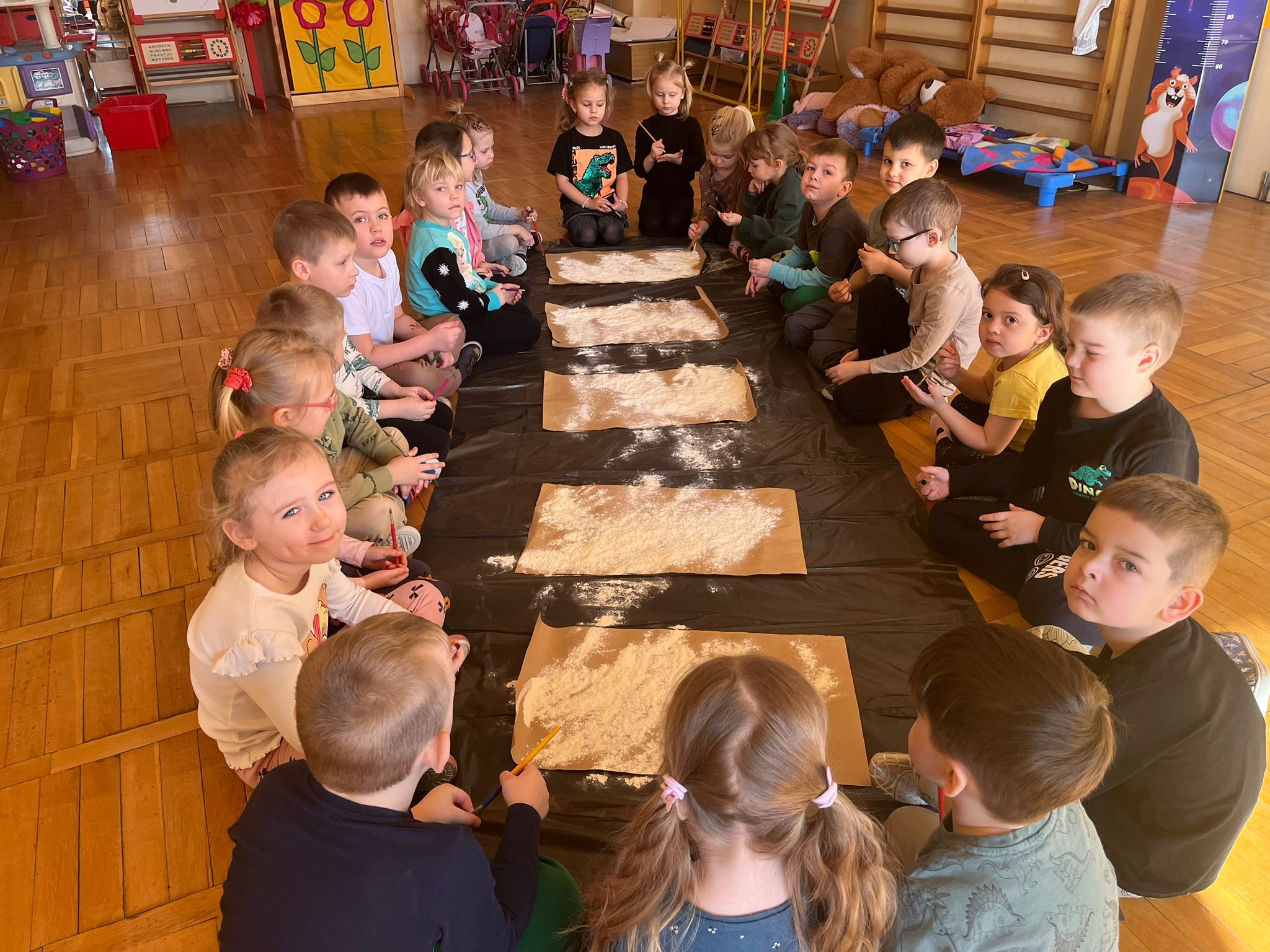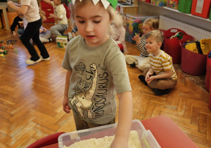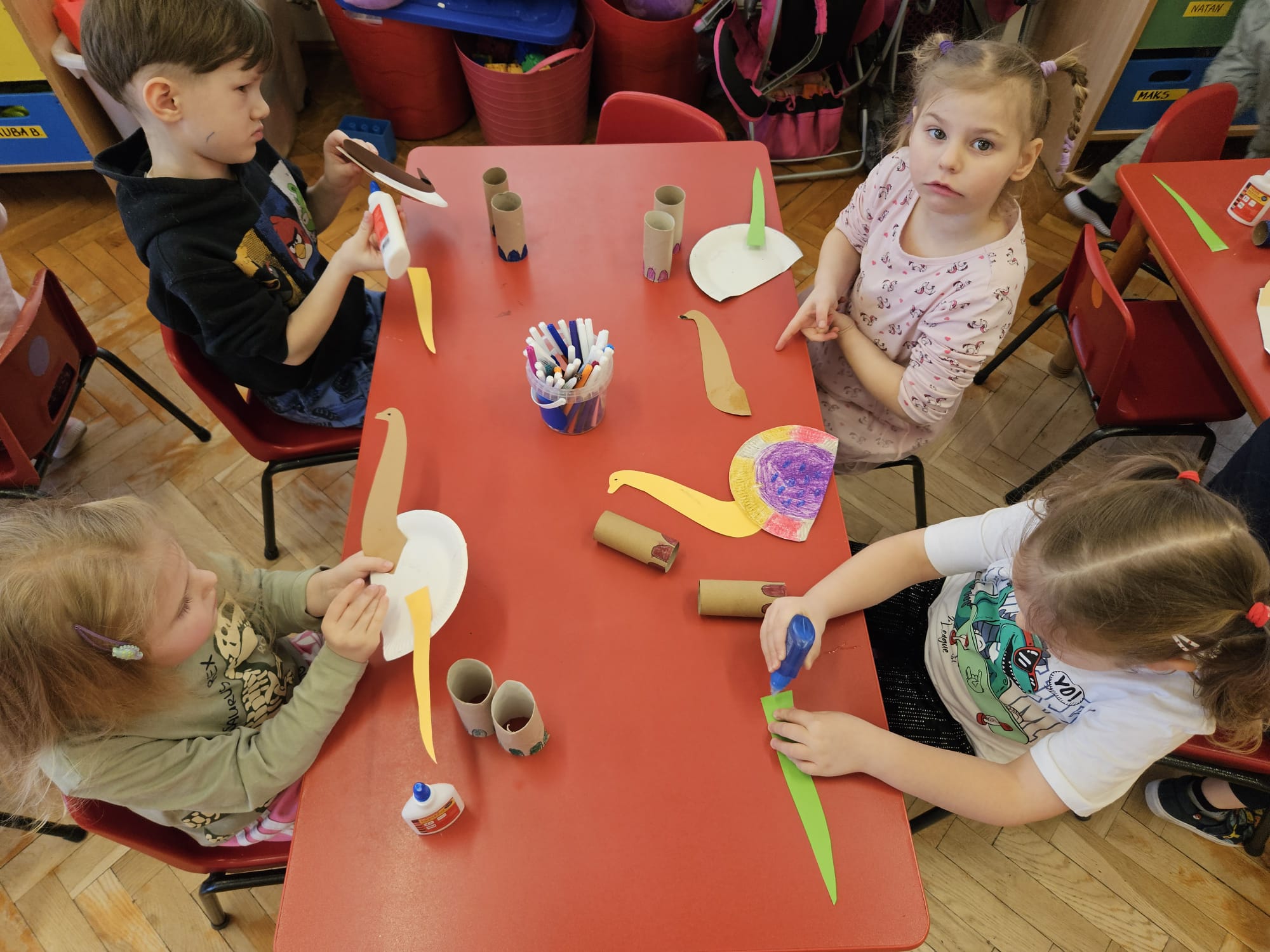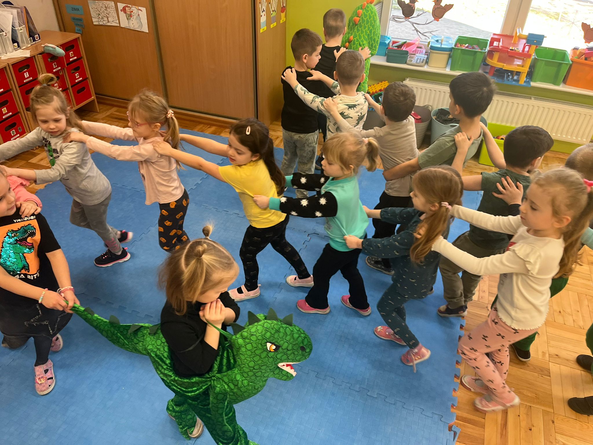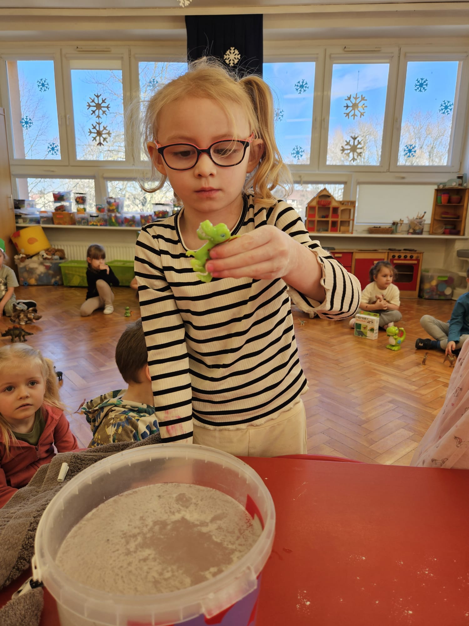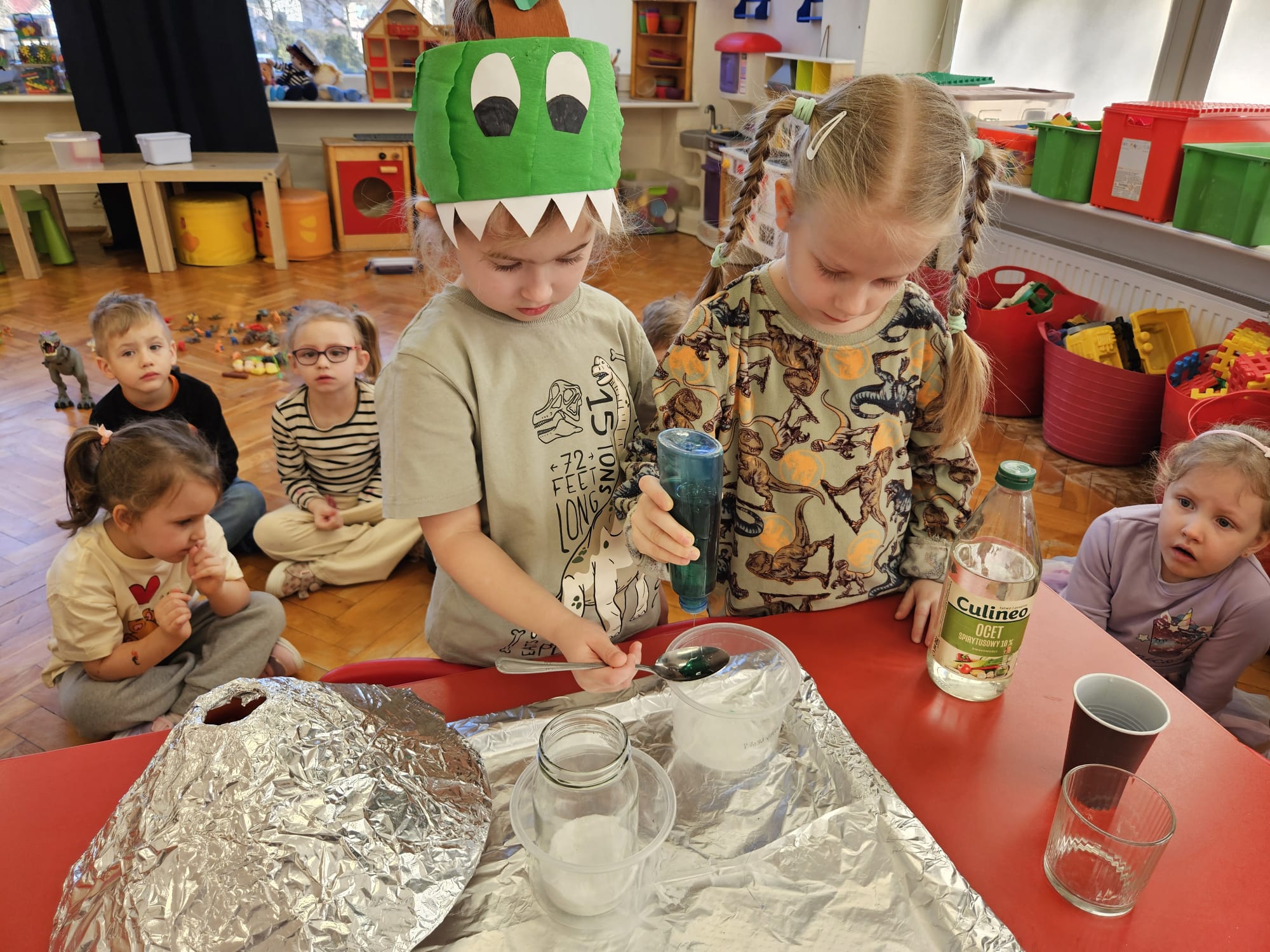 Od rana do przedszkola szliśmy bardzo ciekawi wydarzeń tego dnia. W torebkach i kieszeniach nieśliśmy dinozaury różnej wielkości. Niektórzy z nas przebrali się za dinozaury. Po poznaniu ciekawostek na ich temat i obejrzeniu naszych zbiorów przeszliśmy do zabaw z dinozaurami. Były zabawy badawcze - robiliśmy wybuch wulkanu z octu i sody, płynu do mycia naczyń i barwnika. Prowadziliśmy wykopaliska archeologiczne w mące. Układaliśmy szkielety dinozaurów w masie solnej. Układaliśmy dinozaury z części, tworzyliśmy prace plastyczne w jurajskim parku. To był niezwykły dzień.