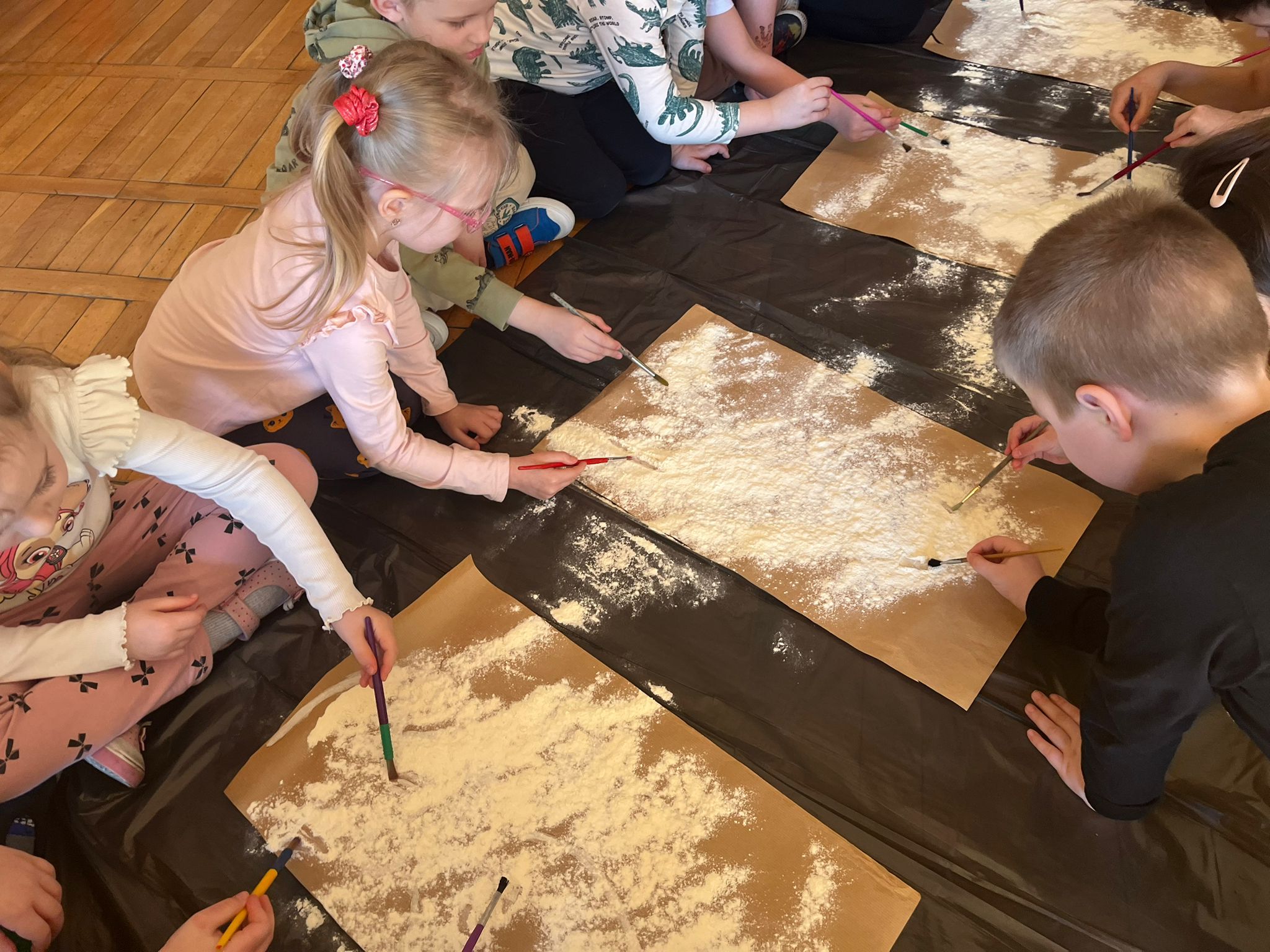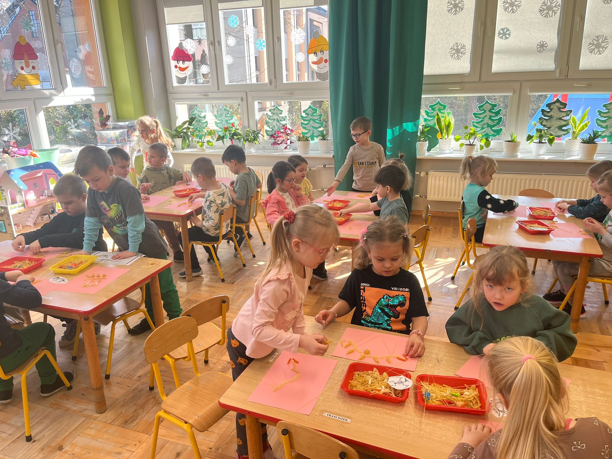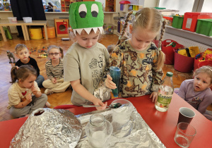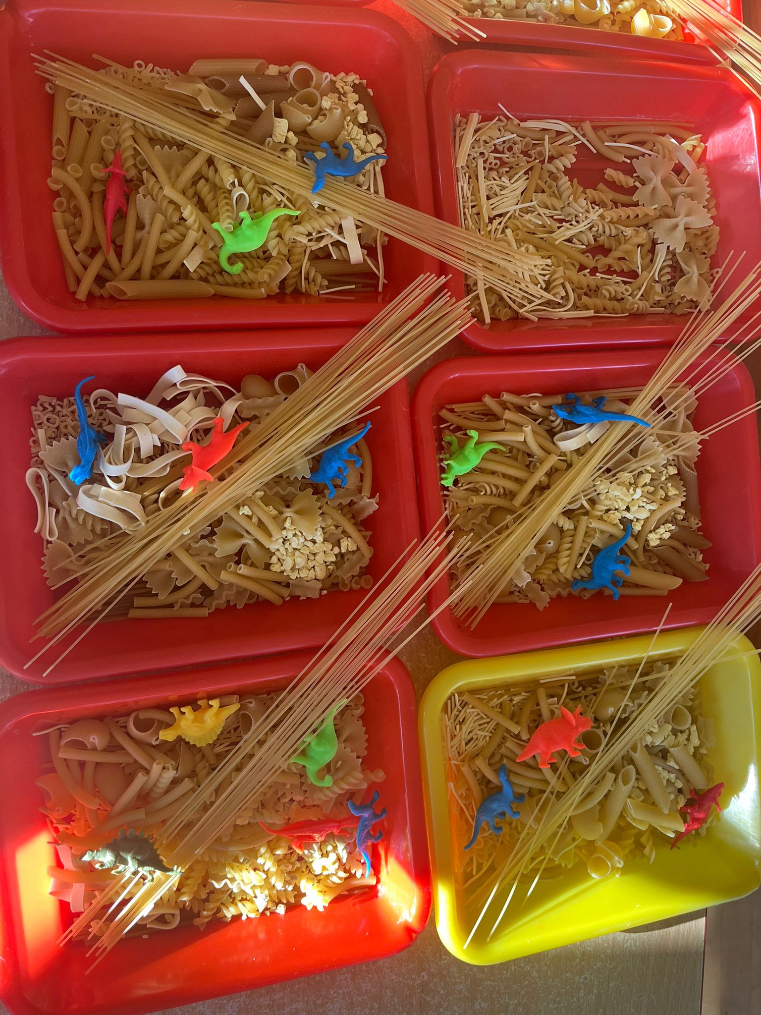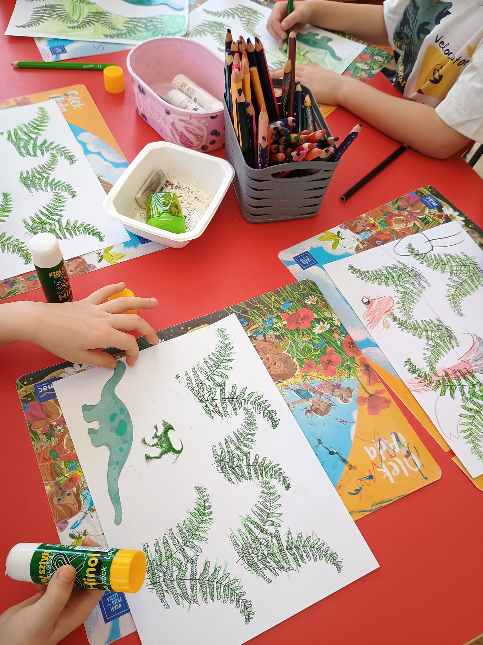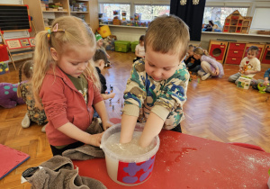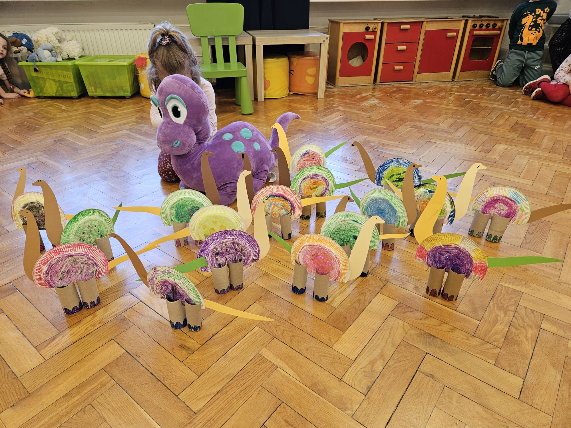 Od rana do przedszkola szliśmy bardzo ciekawi wydarzeń tego dnia. W torebkach i kieszeniach nieśliśmy dinozaury różnej wielkości. Niektórzy z nas przebrali się za dinozaury. Po poznaniu ciekawostek na ich temat i obejrzeniu naszych zbiorów przeszliśmy do zabaw z dinozaurami. Były zabawy badawcze - robiliśmy wybuch wulkanu z octu i sody, płynu do mycia naczyń i barwnika. Prowadziliśmy wykopaliska archeologiczne w mące. Układaliśmy szkielety dinozaurów w masie solnej. Układaliśmy dinozaury z części, tworzyliśmy prace plastyczne w jurajskim parku. To był niezwykły dzień.