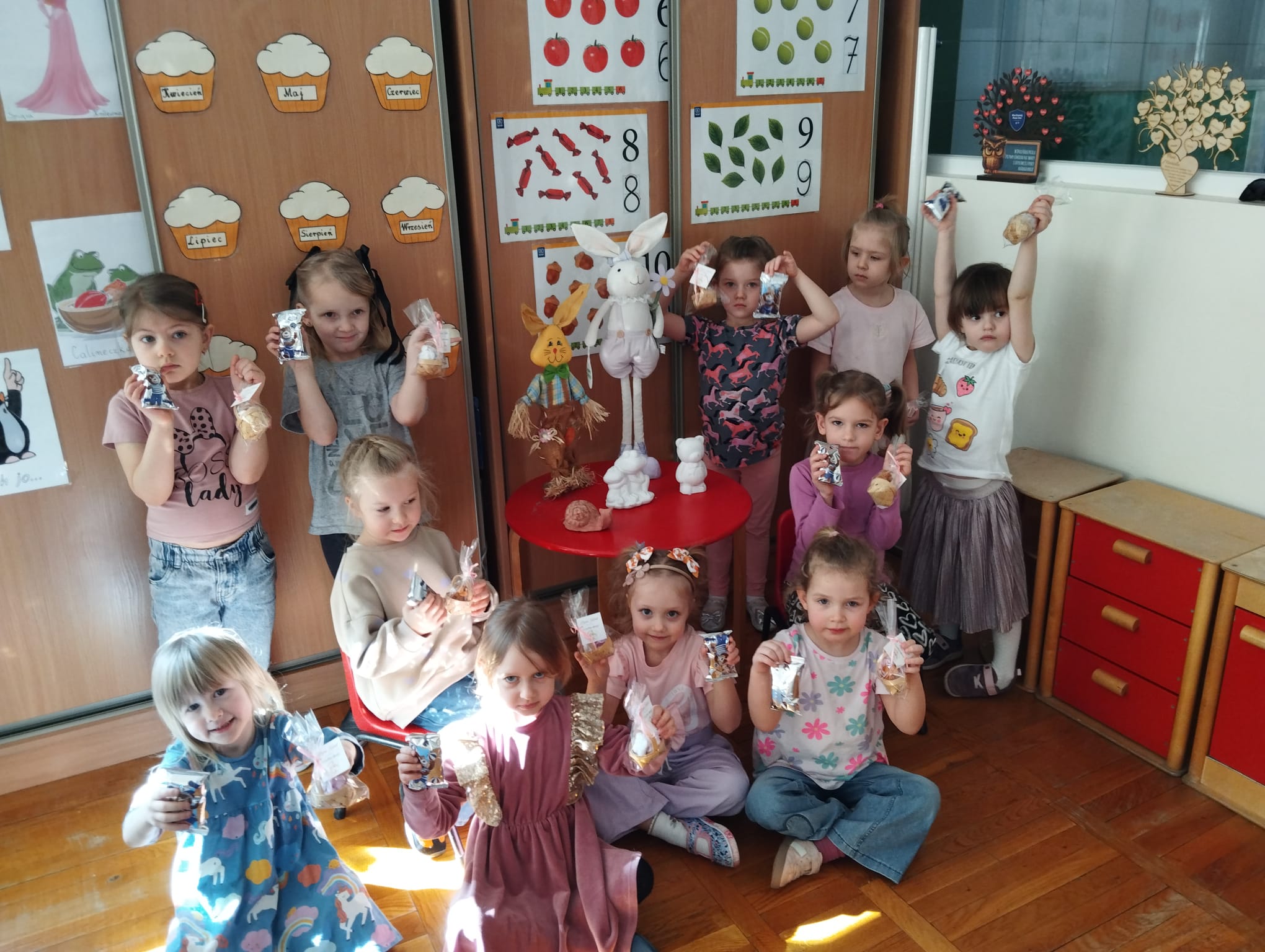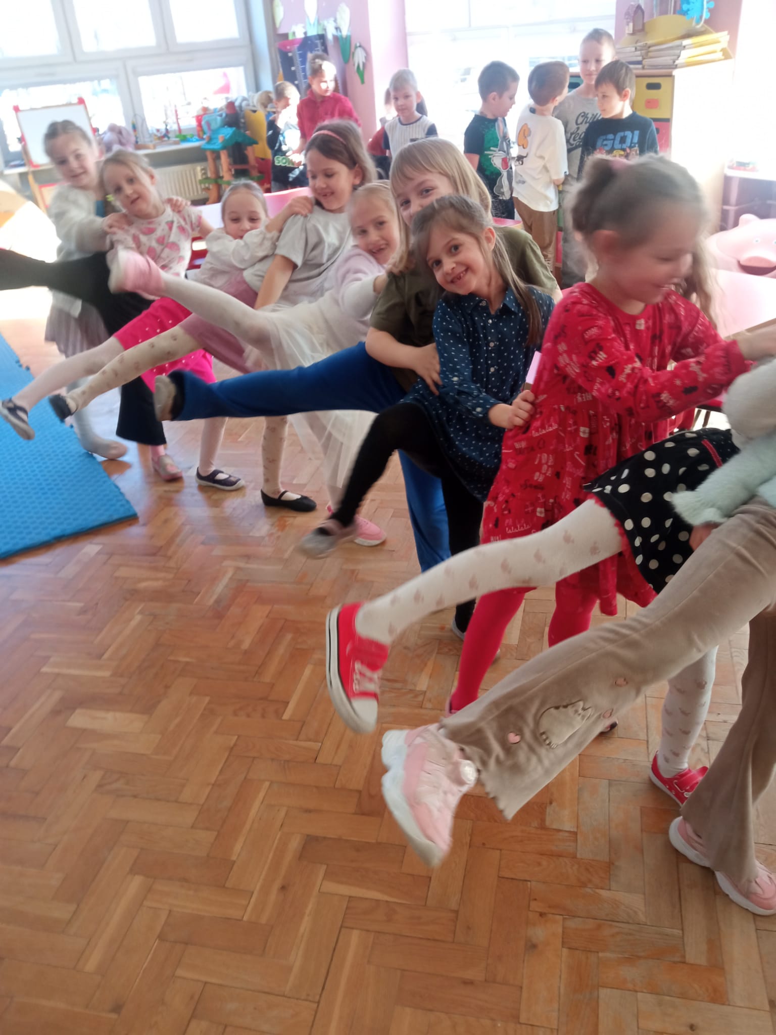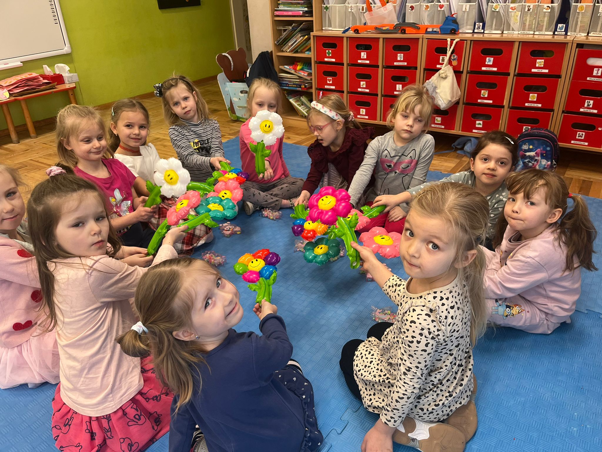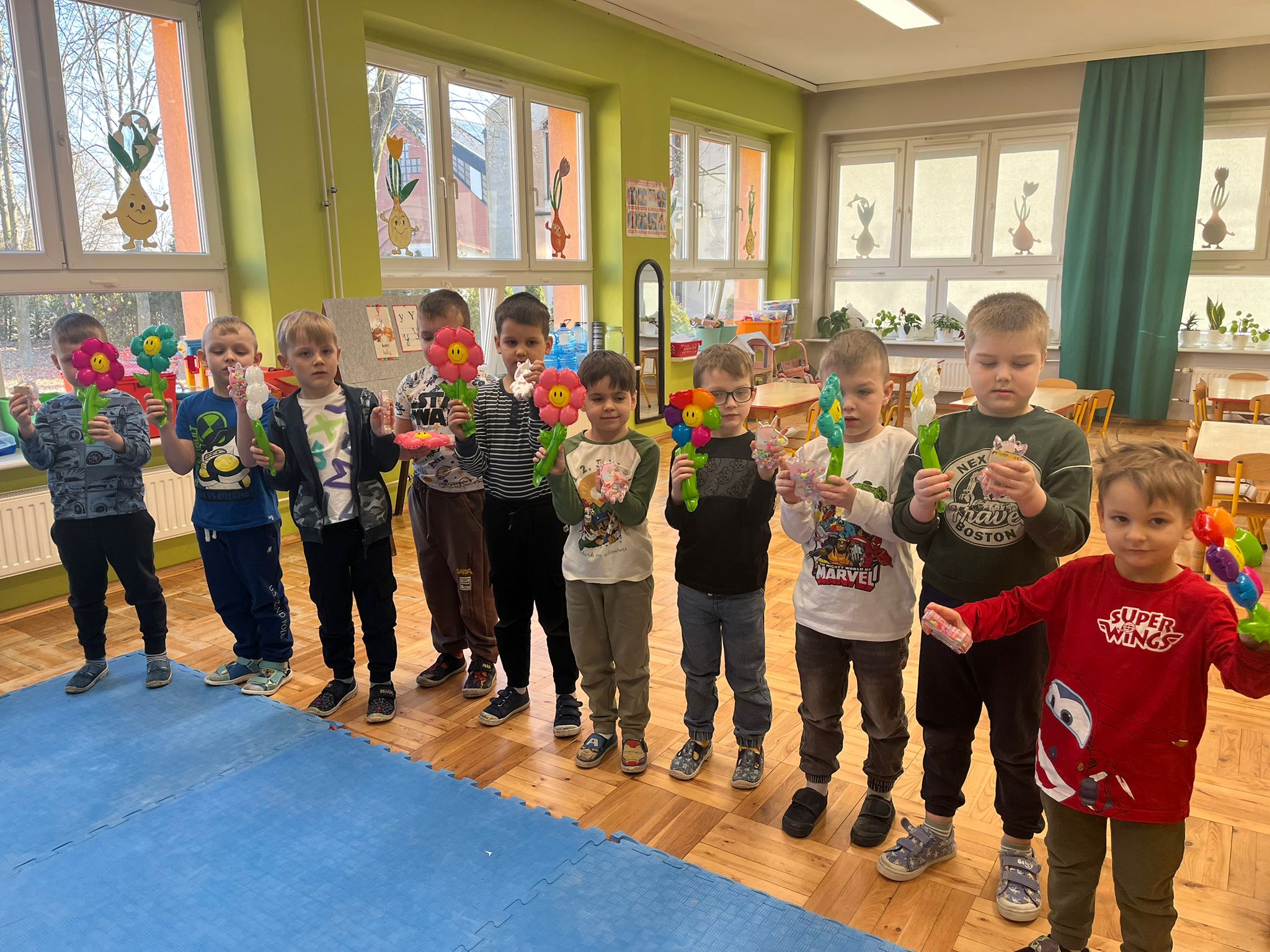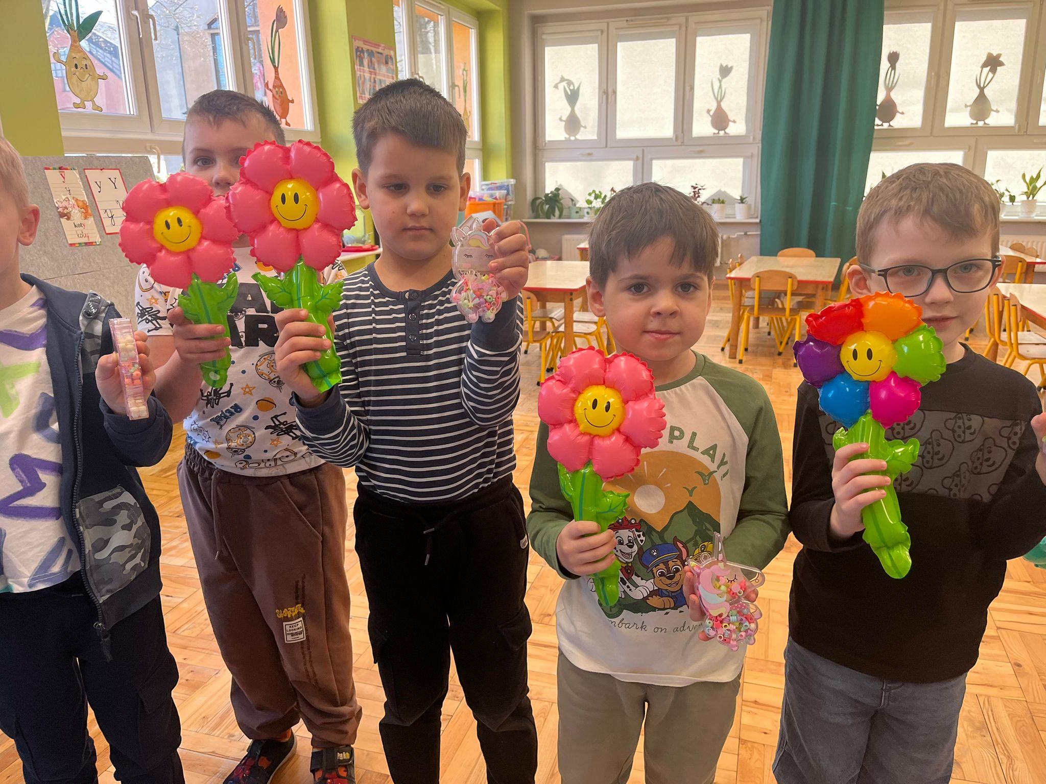 Od rana do przedszkola przychodziły wystrojone nasze koleżanki jak przystało na ich święto. My chłopaki przygotowaliśmy w domu z rodzicami laurki dla naszych koleżanek i wręczyliśmy je im składając życzenia. Otrzymały również drobne upominki. Dziewczynki dostały korony z napisem Mała Miss oraz szarfę. Spacerowały po czerwonym dywanie. Siedziały na tronie w asyście swoich kolegów. Potem to już była wspólna zabawa. Zabawy z kolorową chustą, nawleknie korali na czas czy zabawy z piłką i balonami. Lubimy świętować wspólnie.