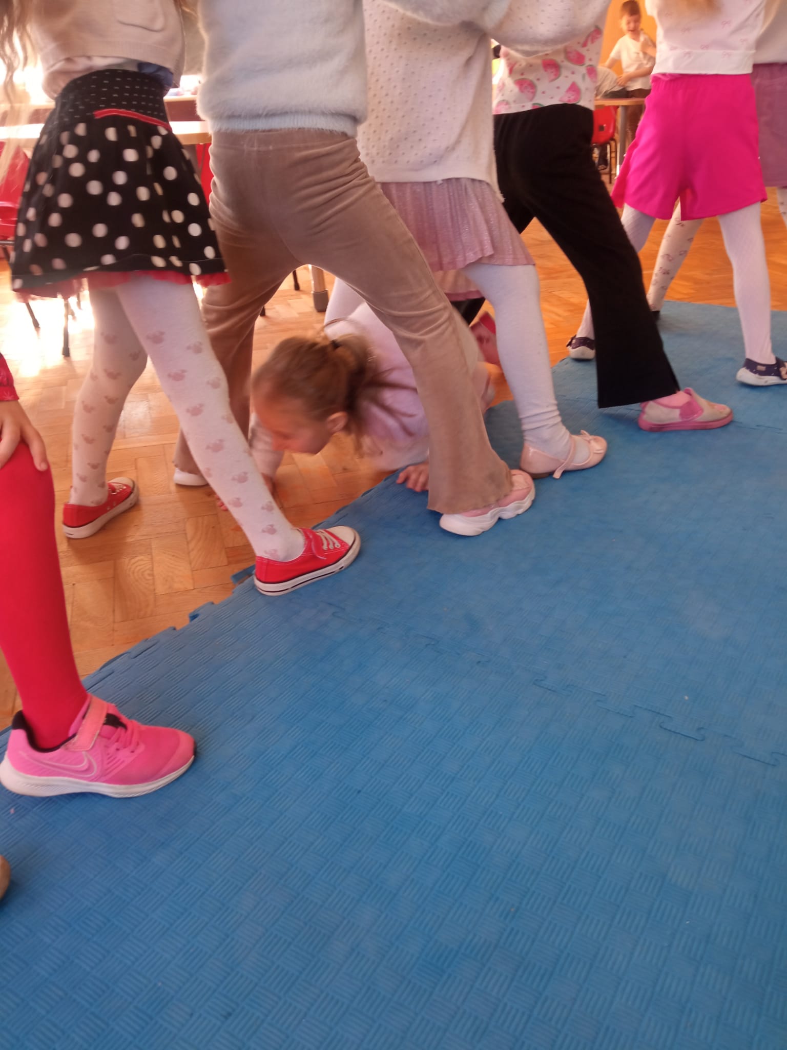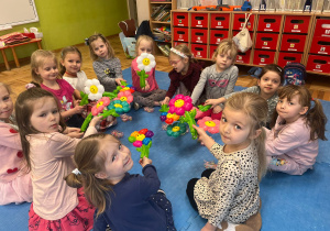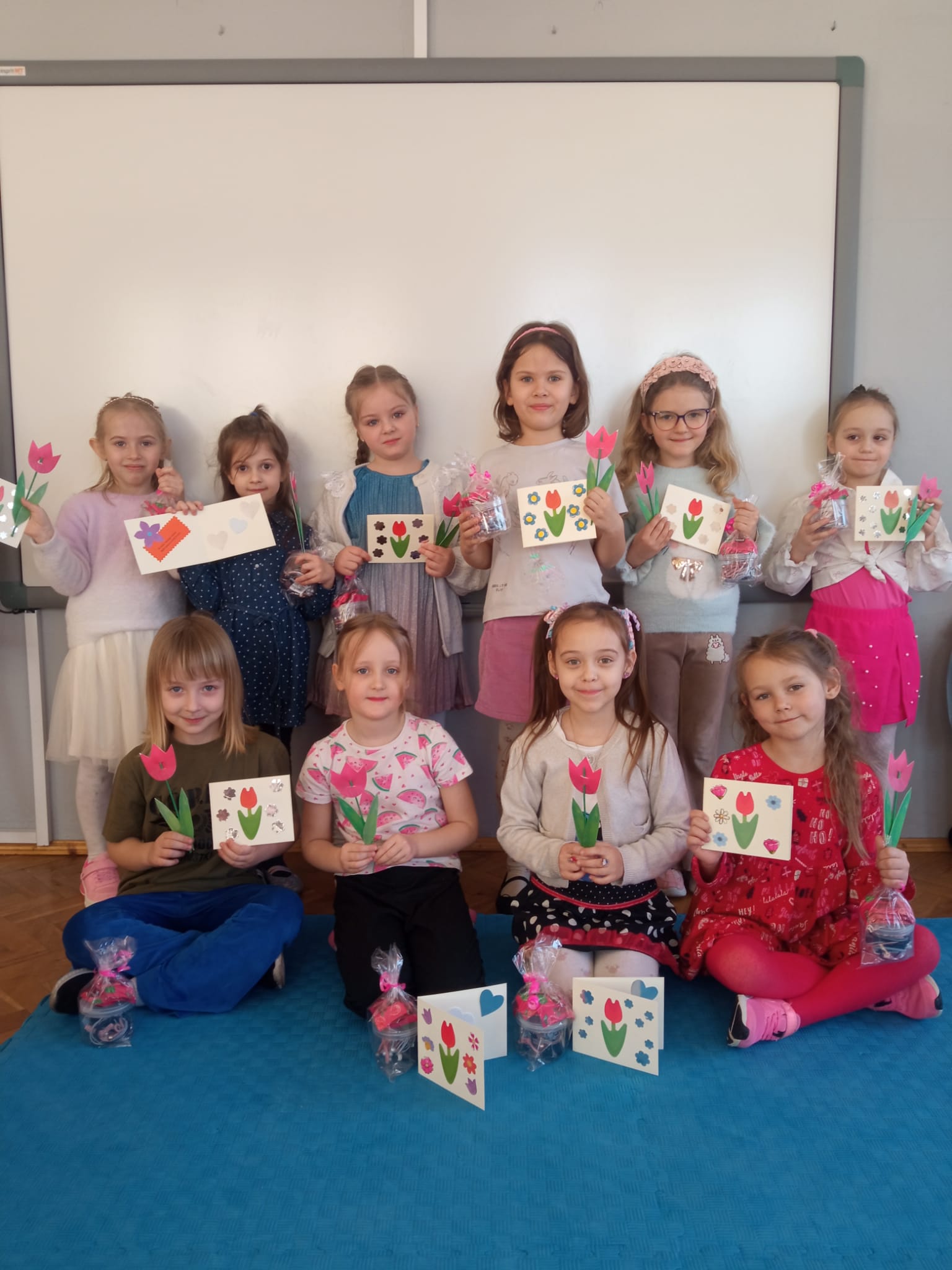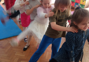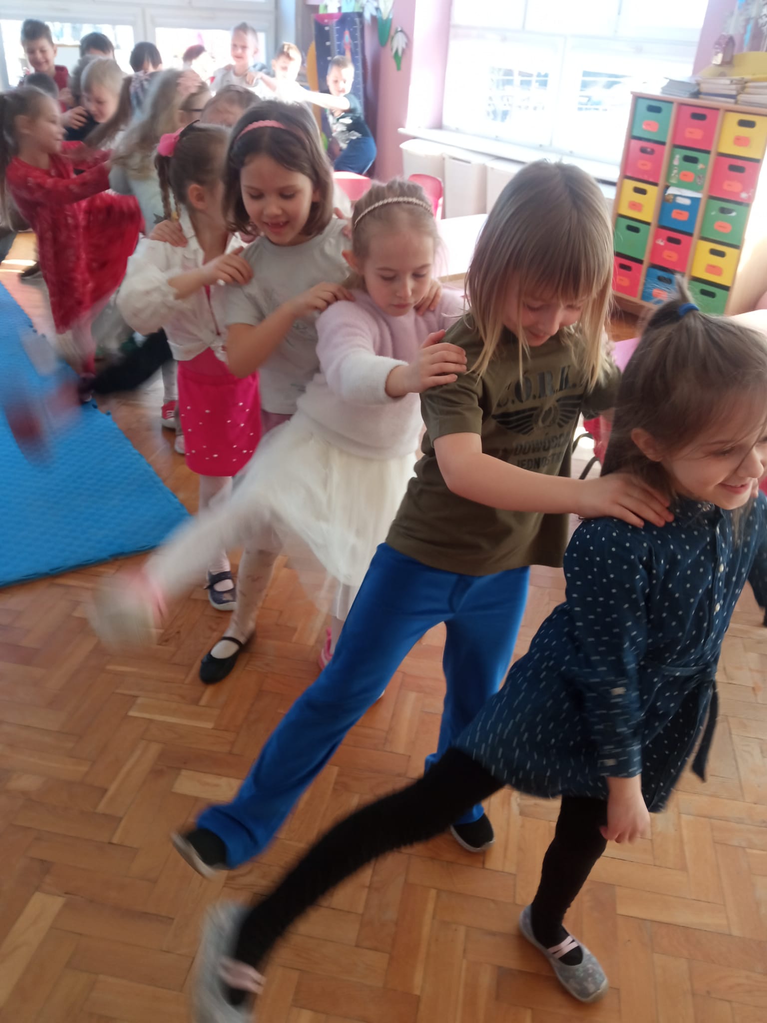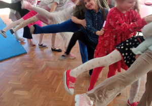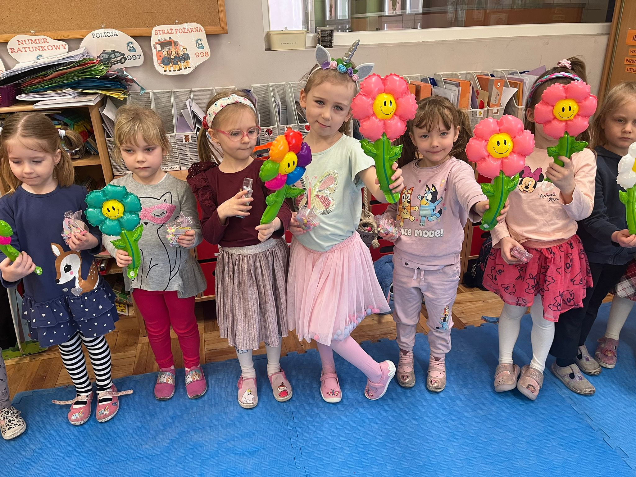 Od rana do przedszkola przychodziły wystrojone nasze koleżanki jak przystało na ich święto. My chłopaki przygotowaliśmy w domu z rodzicami laurki dla naszych koleżanek i wręczyliśmy je im składając życzenia. Otrzymały również drobne upominki. Dziewczynki dostały korony z napisem Mała Miss oraz szarfę. Spacerowały po czerwonym dywanie. Siedziały na tronie w asyście swoich kolegów. Potem to już była wspólna zabawa. Zabawy z kolorową chustą, nawleknie korali na czas czy zabawy z piłką i balonami. Lubimy świętować wspólnie.