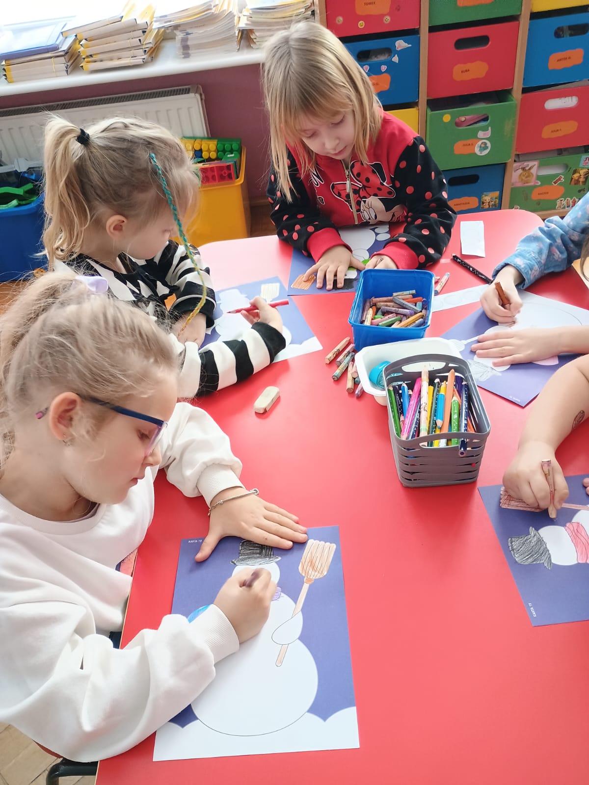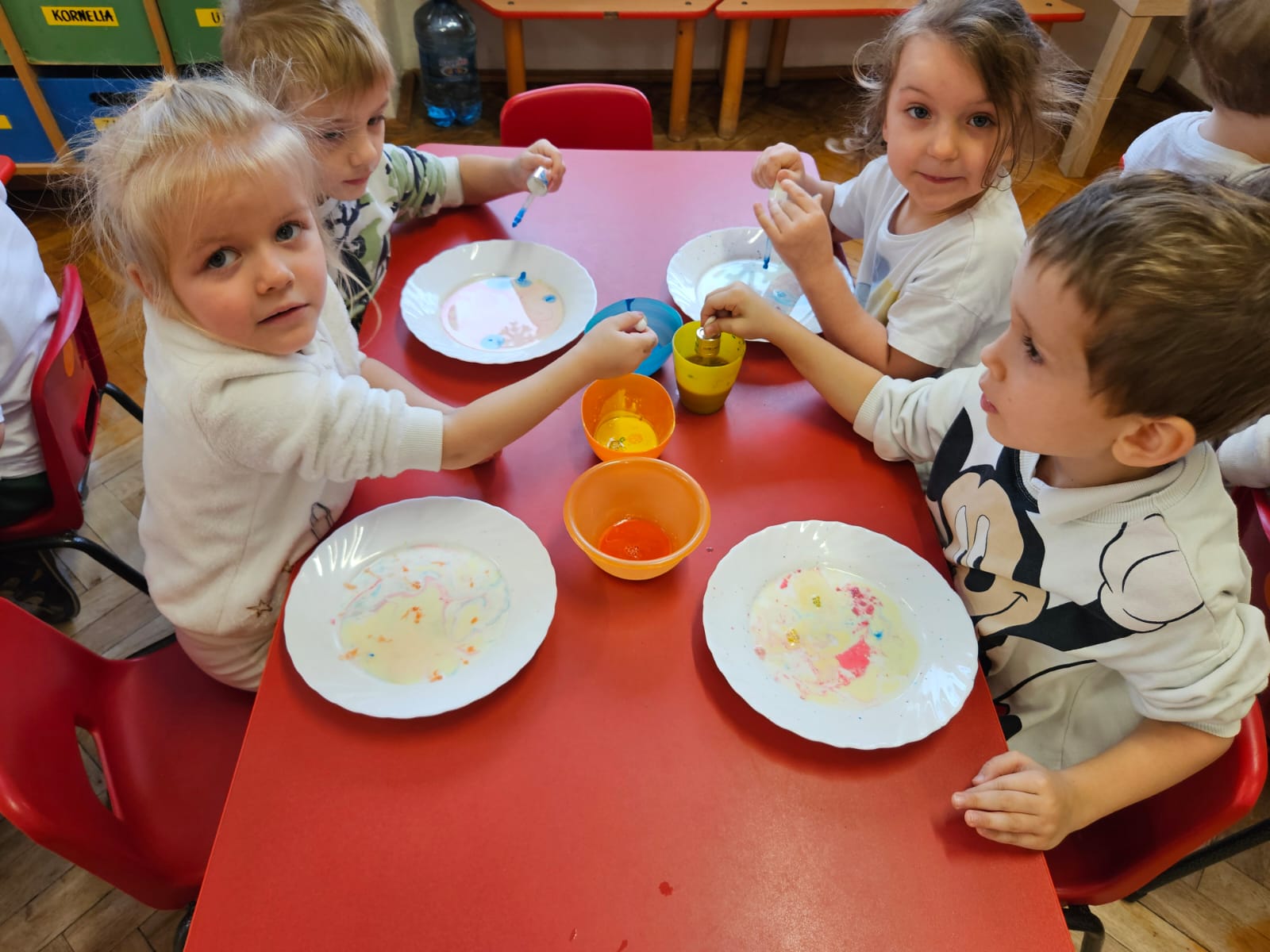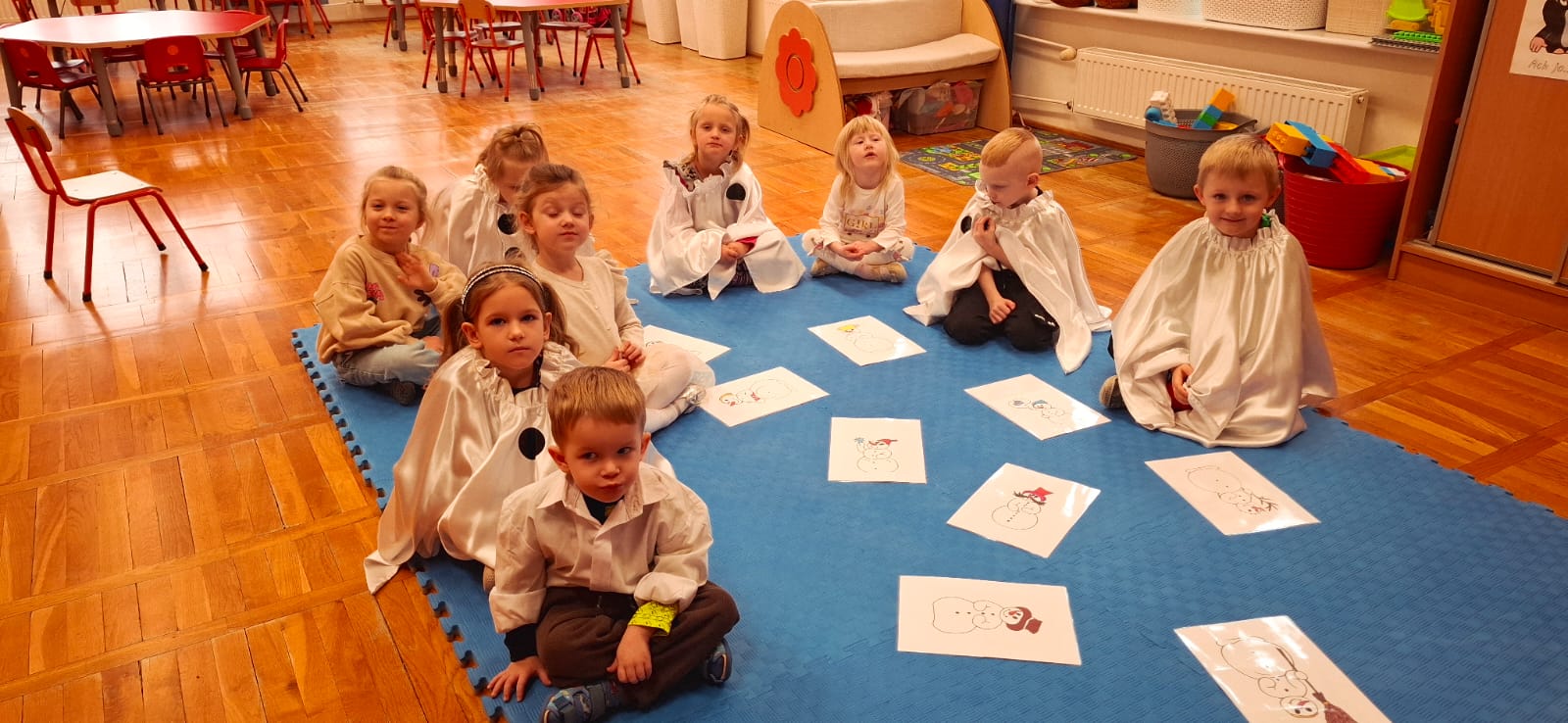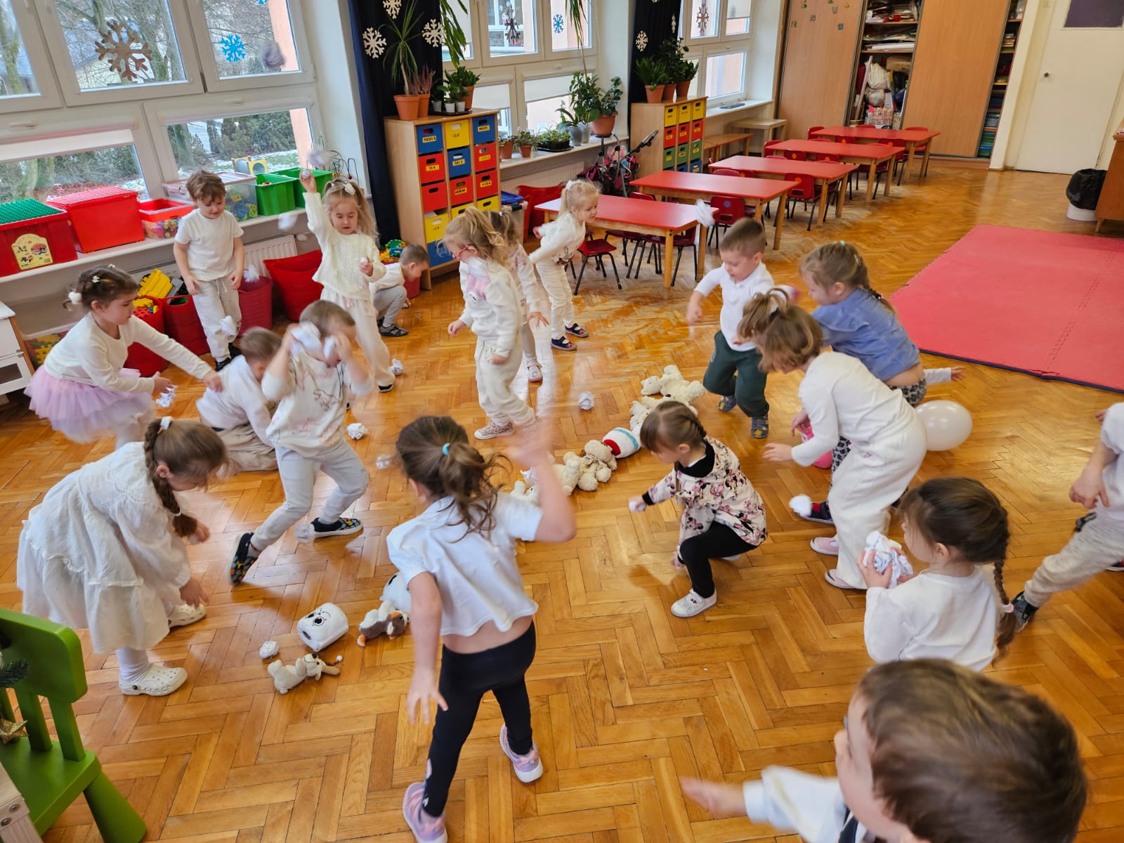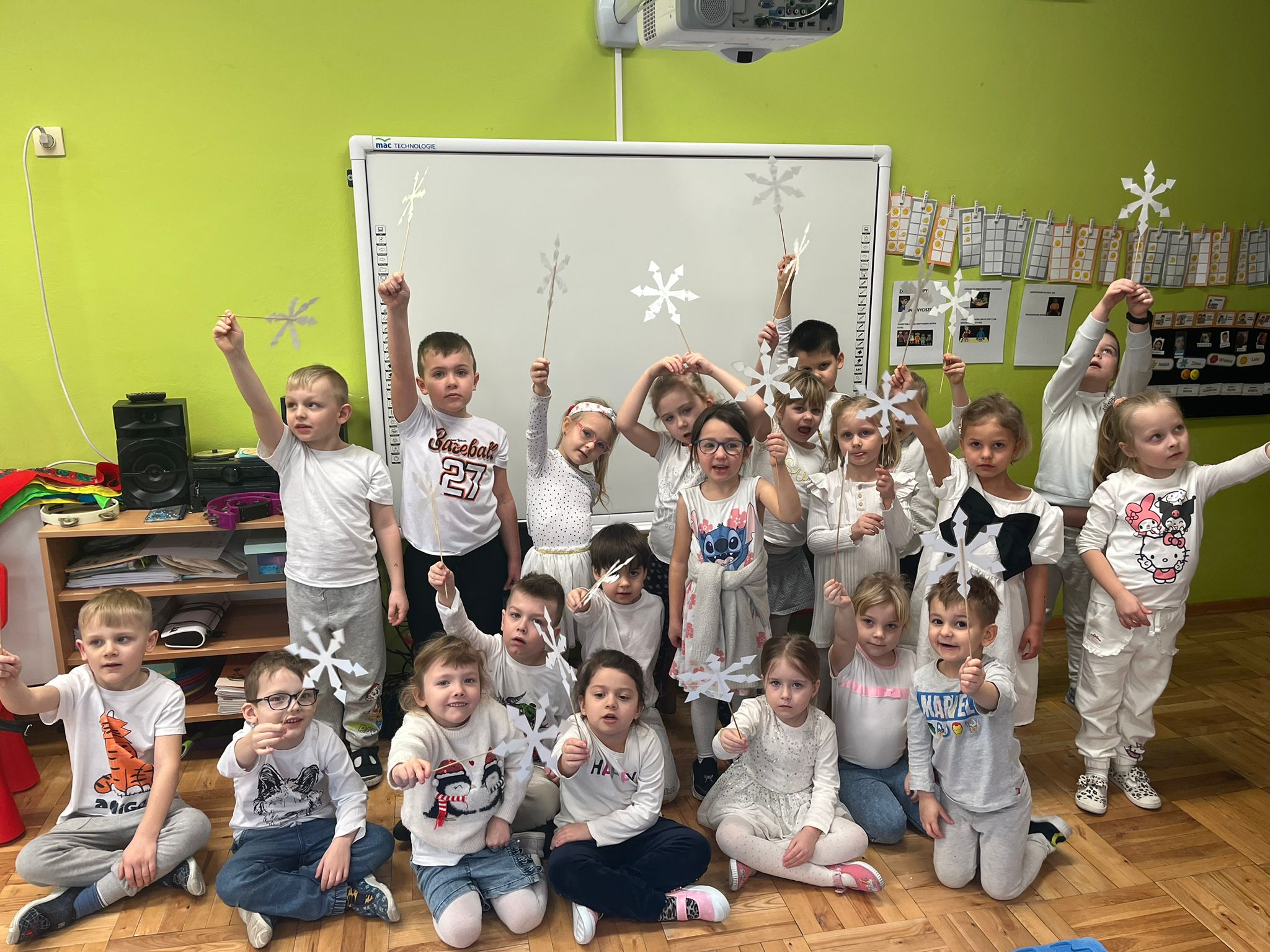 Dzień koloru białego a dla innych dzień śniegu. Tak czy siak i to białe i to. Choć pogoda zrobiła psikusa i śnieg stopniał to od rana w przedszkolu zrobiło się biało od naszych ubrań i przyniesionych białych maskotek. Okazało się biały kolor jest bardzo popularny w świecie zwierząt ale i roślin. Braliśmy udział w białym szaleństwie. Były bitwy na śnieżki, celowanie kulkami papieru do celu, zabawy z chustą animacyjną i śnieżnymi kulkami, zabawy z białym światłem w sali doświadczania świata, zabawy z białymi chustami i balonami i piórkami. Powstały białe obrazki - bałwanki z plasteliny, magiczne kule z bałwankiem, lodowe krainy, znikające śnieżne gwiazdki, obrazki na podświetlanej tablicy sensorycznej, ośnieżone drzewa. Na koniec picie mleka a wreszcie malowanie na mleku. To był niezwykły dzień.