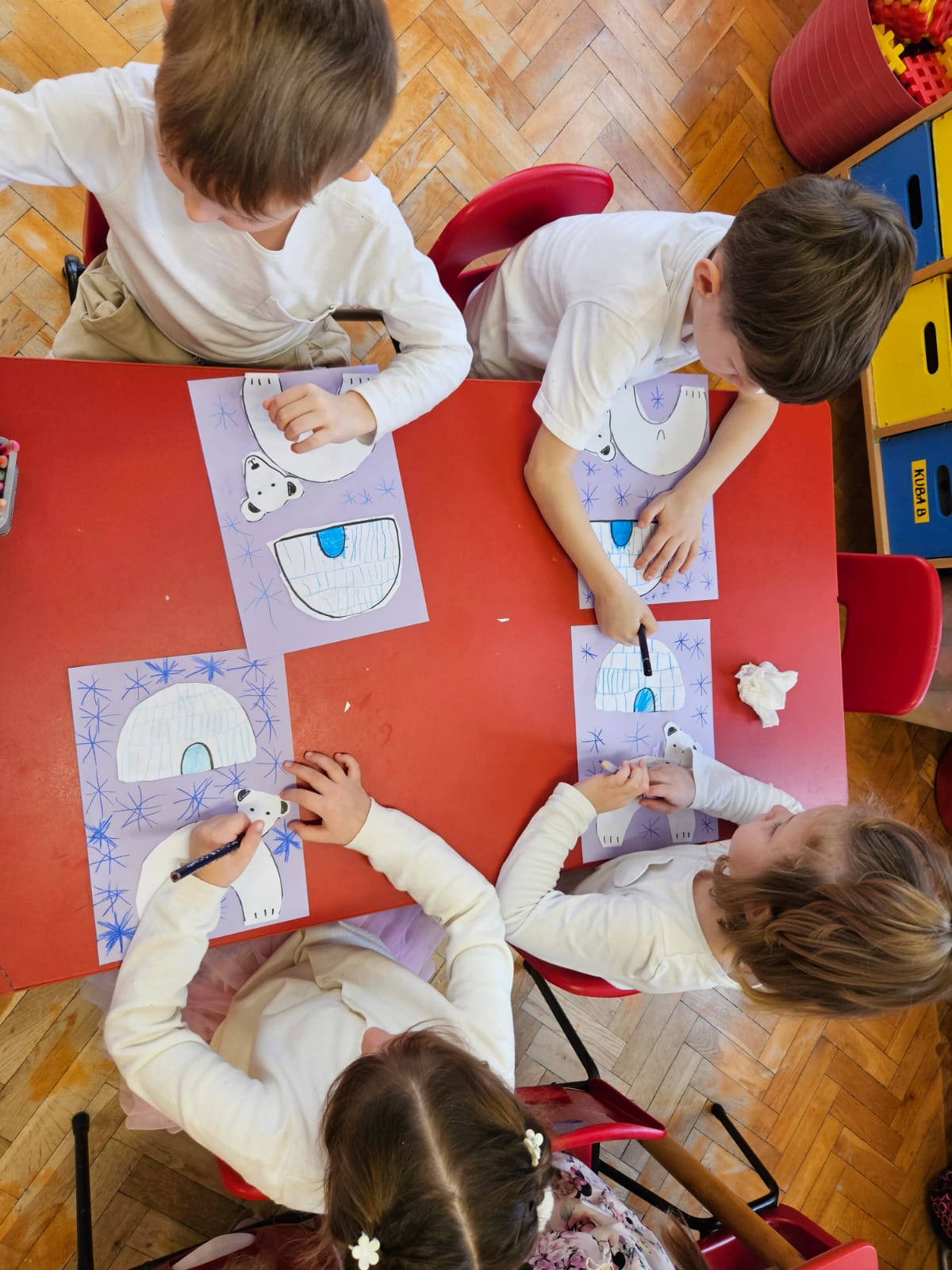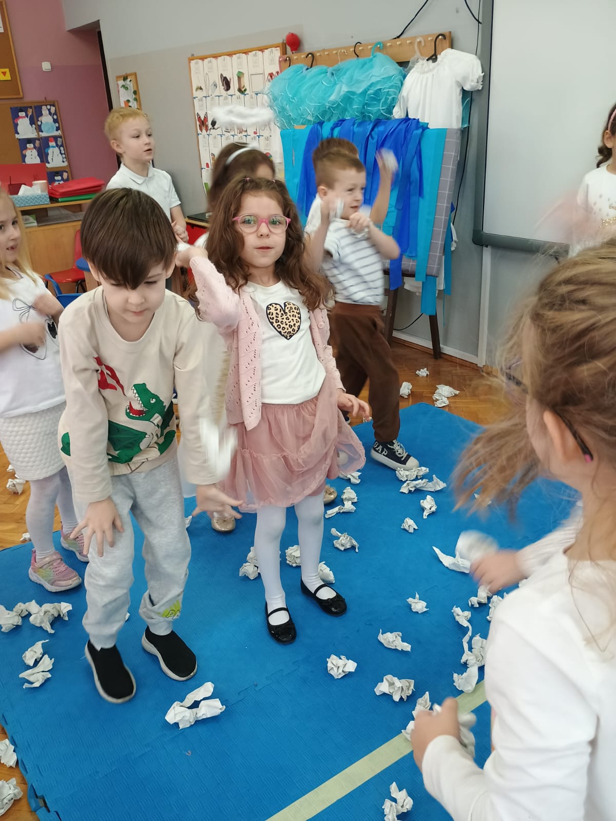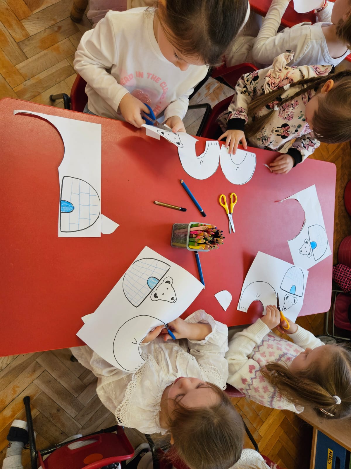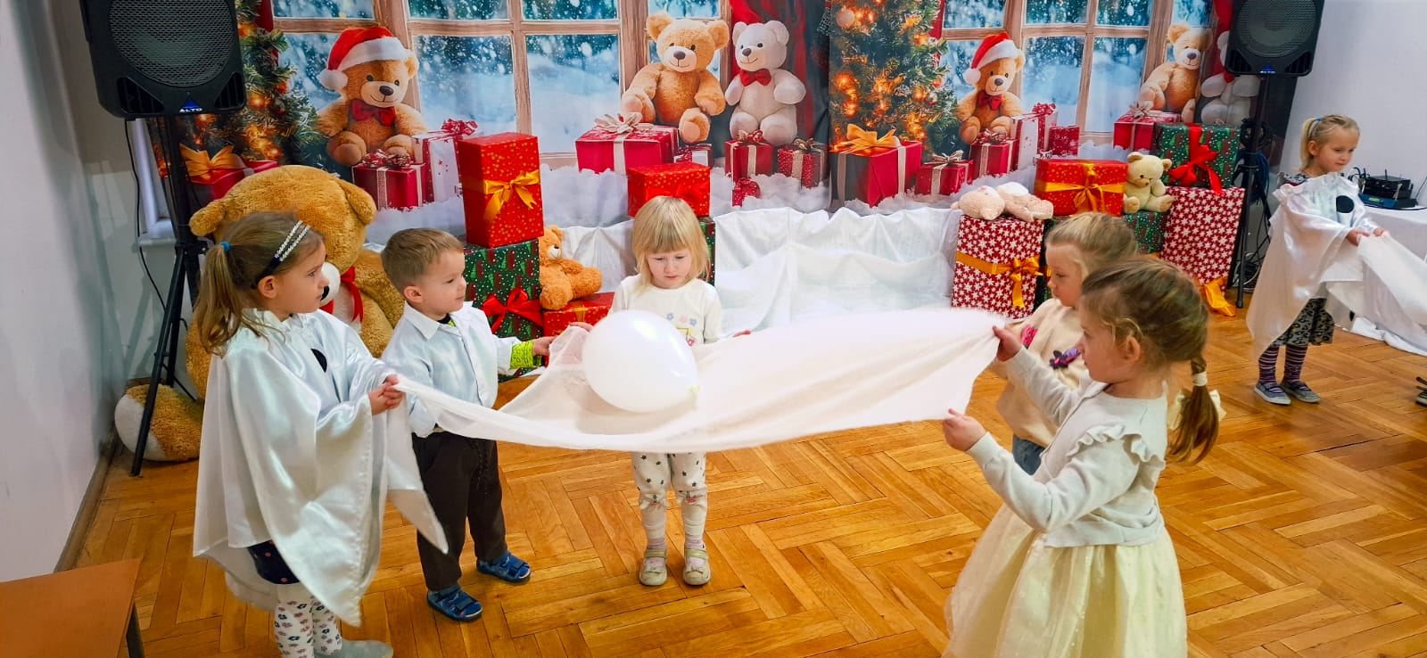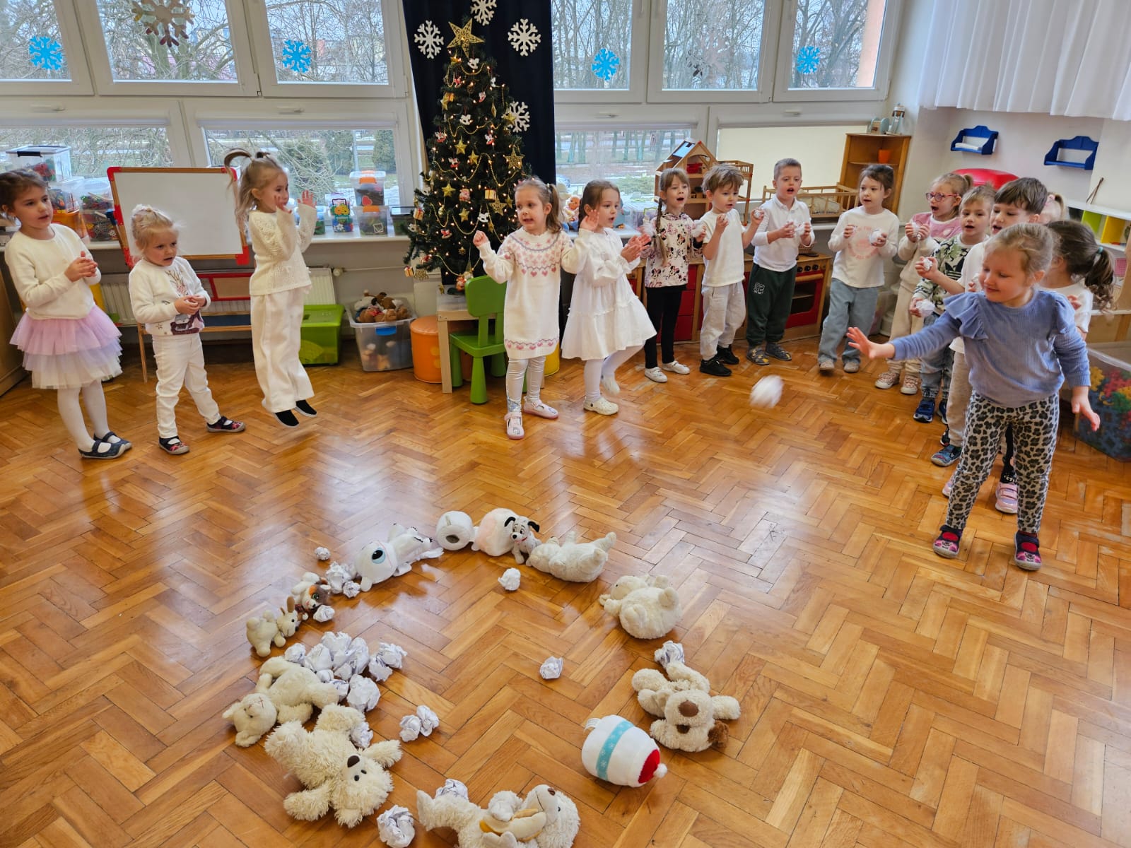Dzień koloru białego a dla innych dzień śniegu. Tak czy siak i to białe i to. Choć pogoda zrobiła psikusa i śnieg stopniał to od rana w przedszkolu zrobiło się biało od naszych ubrań i przyniesionych białych maskotek. Okazało się biały kolor jest bardzo popularny w świecie zwierząt ale i roślin. Braliśmy udział w białym szaleństwie. Były bitwy na śnieżki, celowanie kulkami papieru do celu, zabawy z chustą animacyjną i śnieżnymi kulkami, zabawy z białym światłem w sali doświadczania świata, zabawy z białymi chustami i balonami i piórkami. Powstały białe obrazki - bałwanki z plasteliny, magiczne kule z bałwankiem, lodowe krainy, znikające śnieżne gwiazdki, obrazki na podświetlanej tablicy sensorycznej, ośnieżone drzewa. Na koniec picie mleka a wreszcie malowanie na mleku. To był niezwykły dzień.