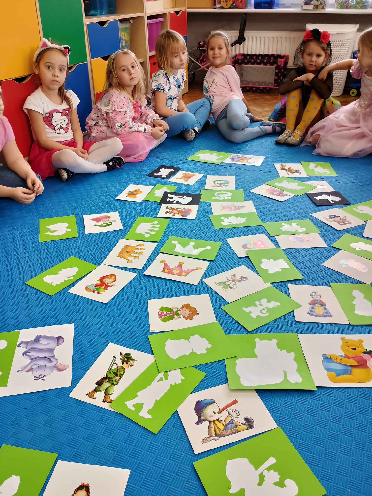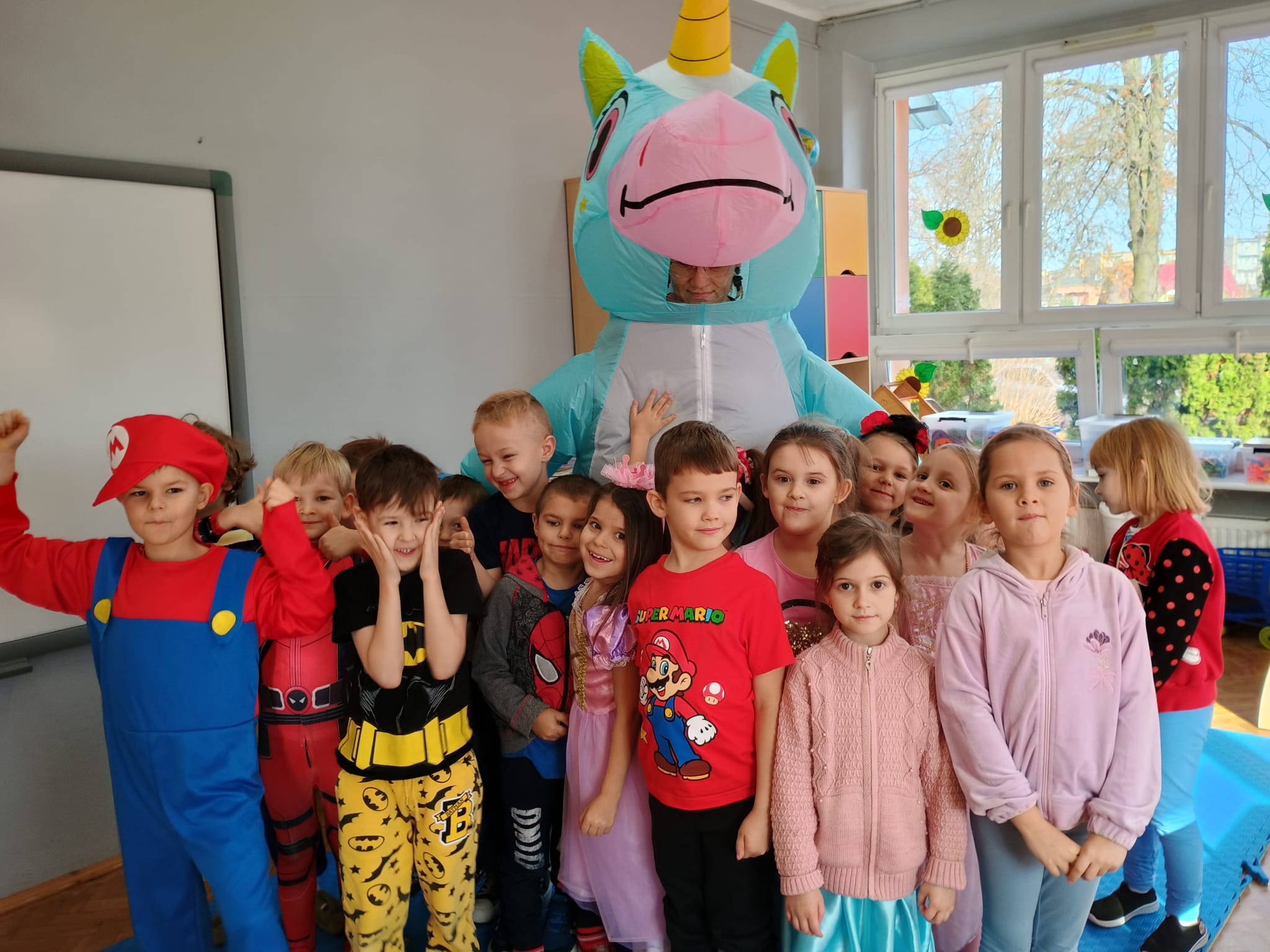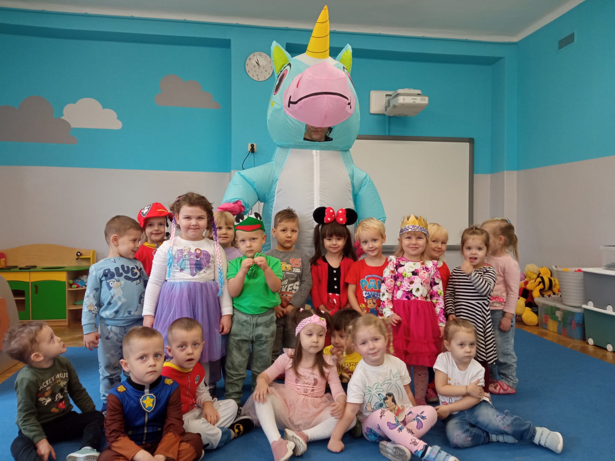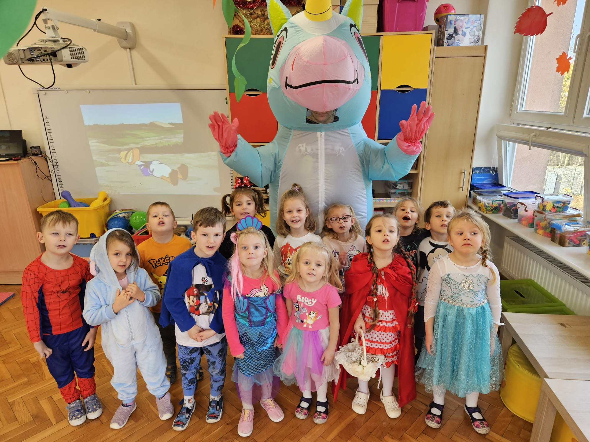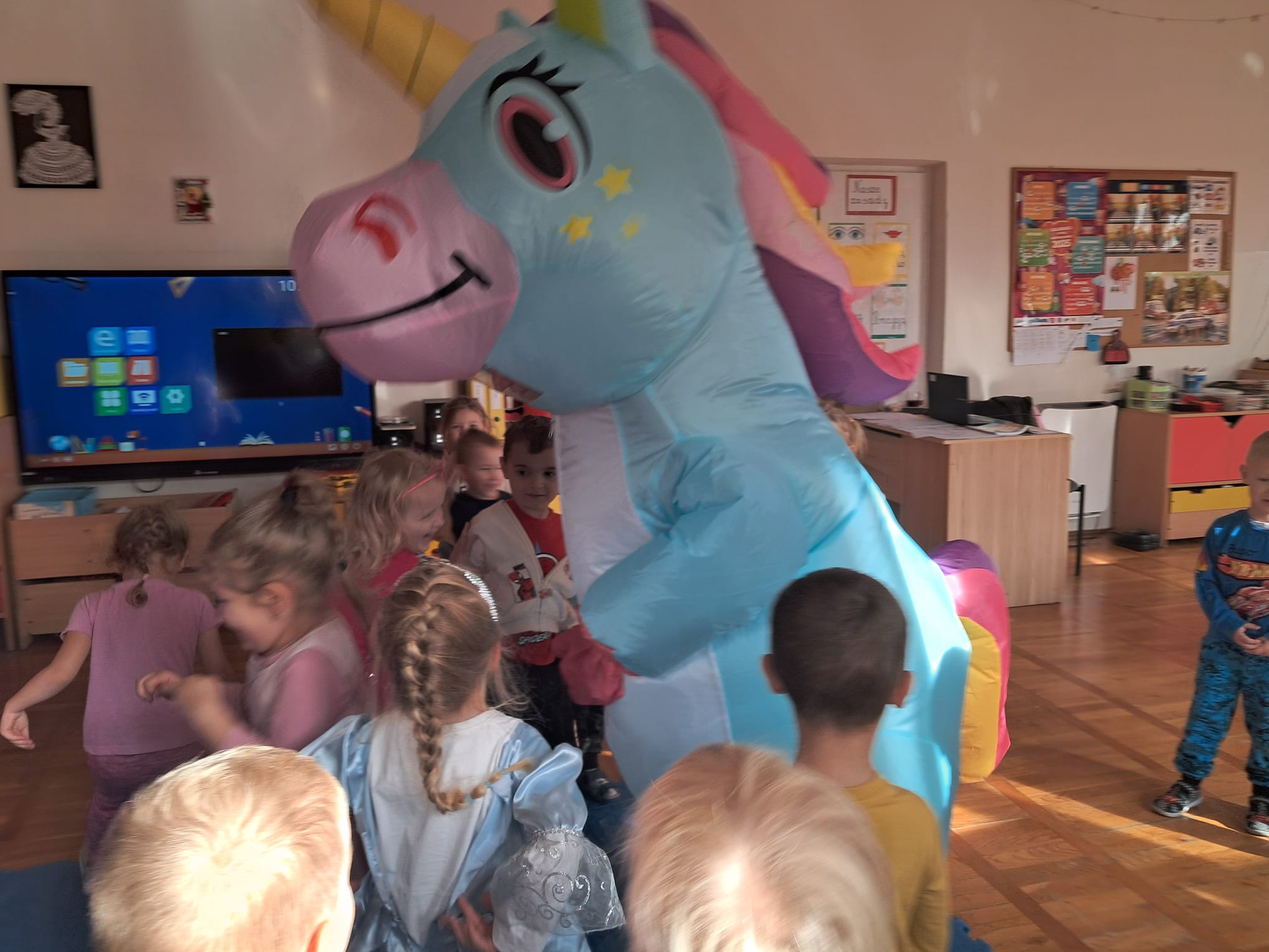 Od rana do przedszkola zamiast przedszkolaków wchodziły postaci z bajek, które ku naszemu zaskoczeniu witał Jednorożec. Podziw, radość i uśmiech zagościły na naszych twarzach. Zabawa zaczęła się w salach. Tańczyliśmy, bawiliśmy się, graliśmy w karty z postaciami z bajek i ich cieniami, układaliśmy puzzle, wykonywaliśmy prace plastyczne, robiliśmy książeczki, korony i pantofelki. Przynieśliśmy pluszaki z bajek. Było bajkowo.