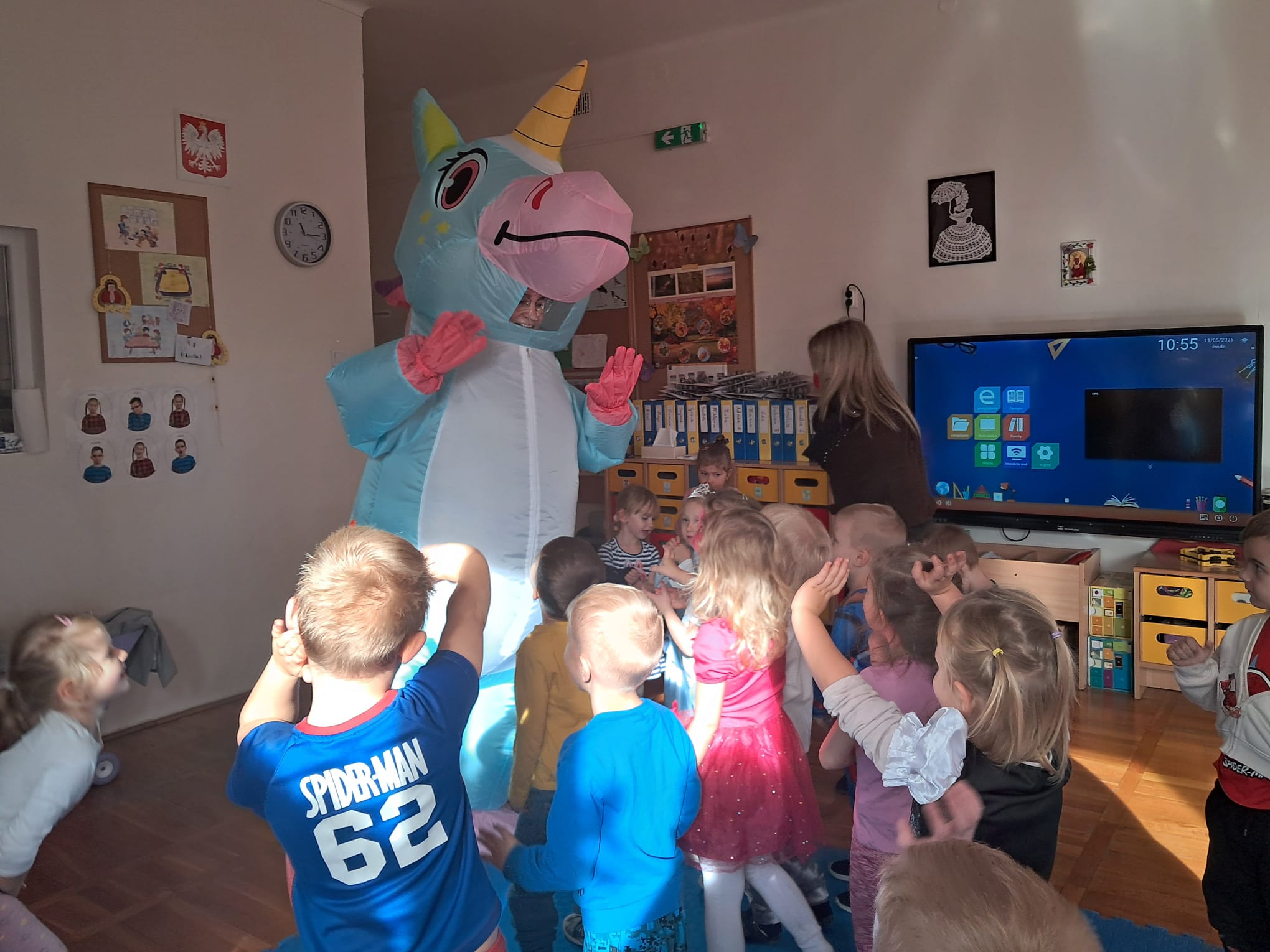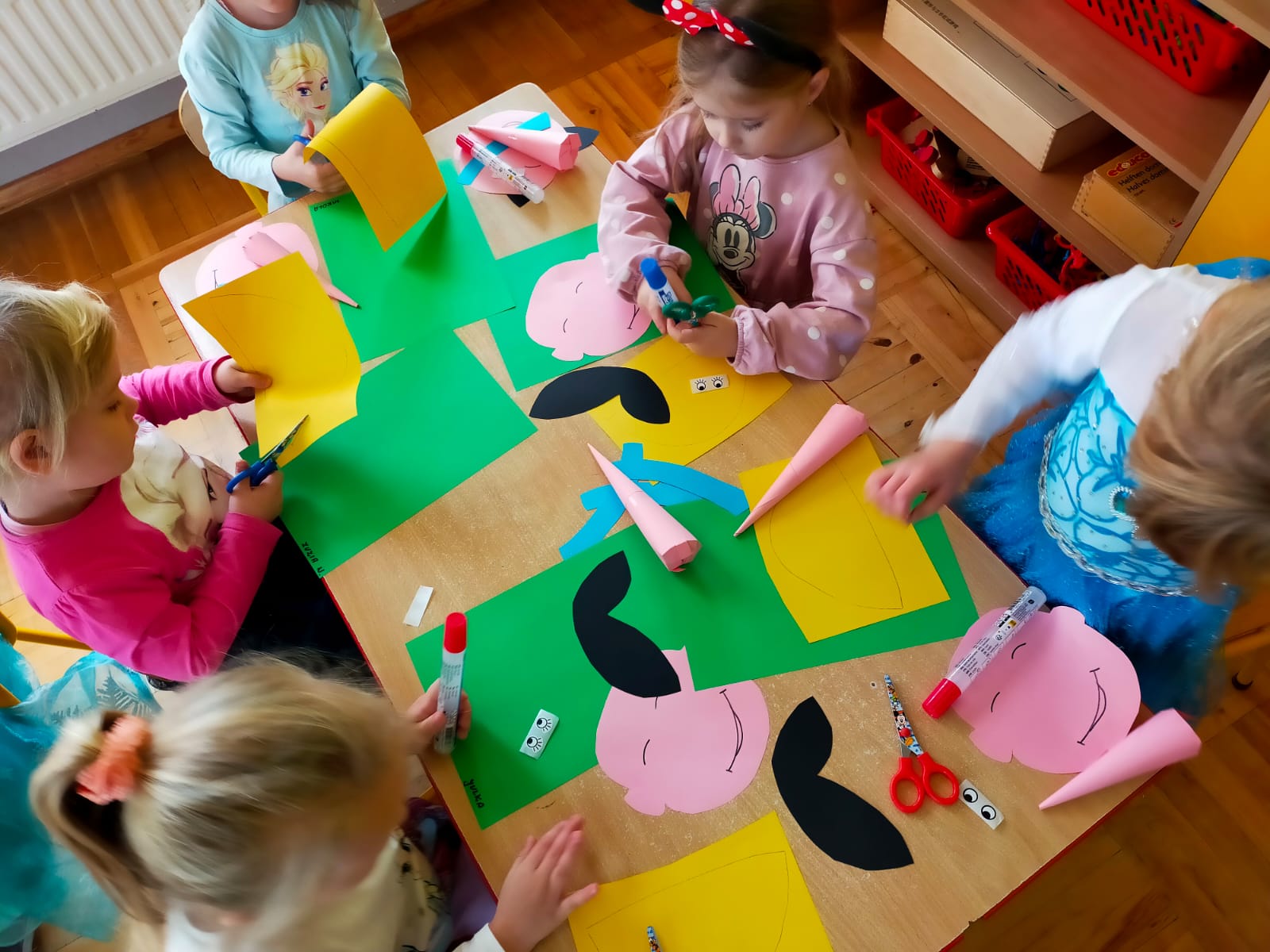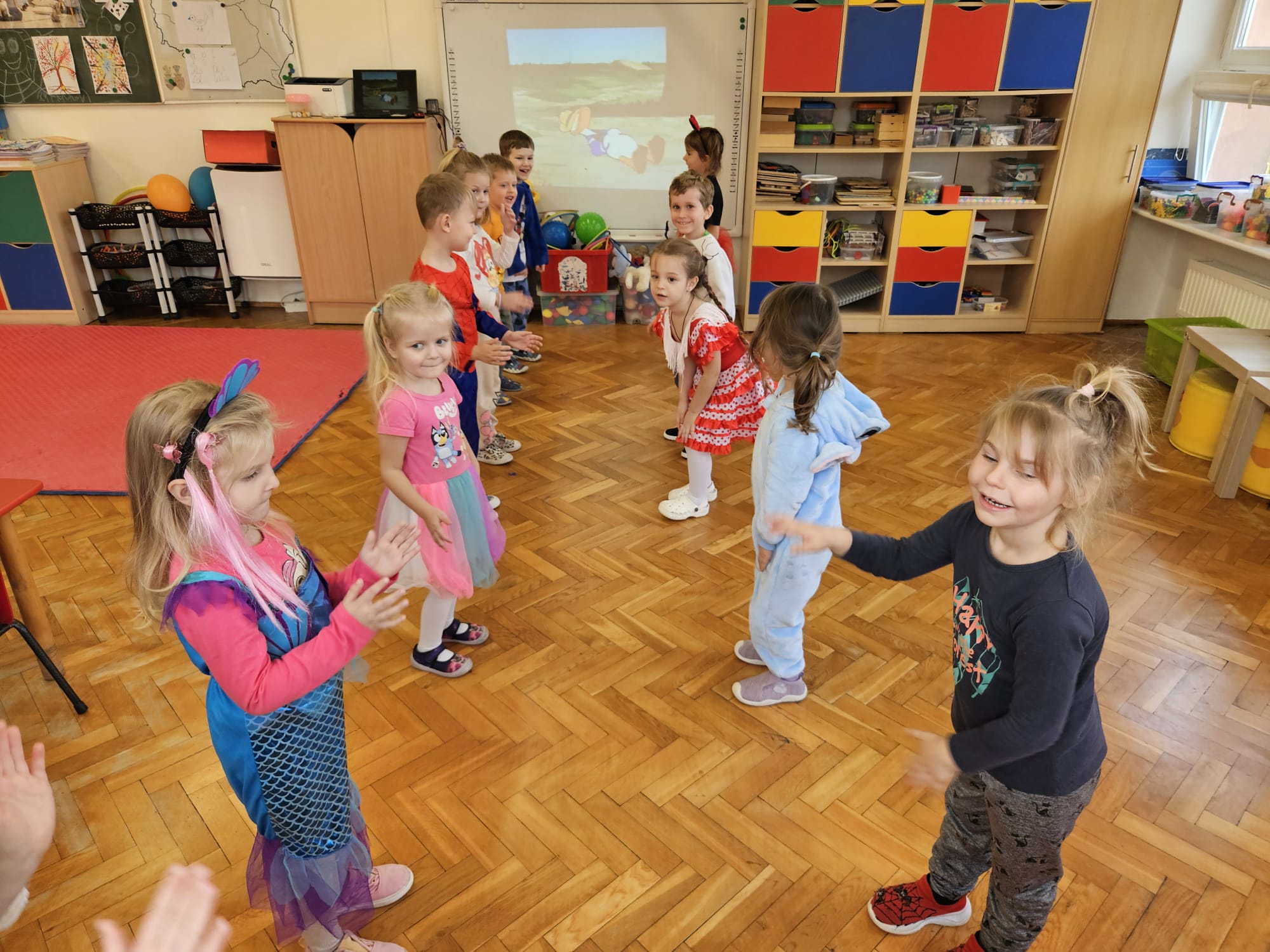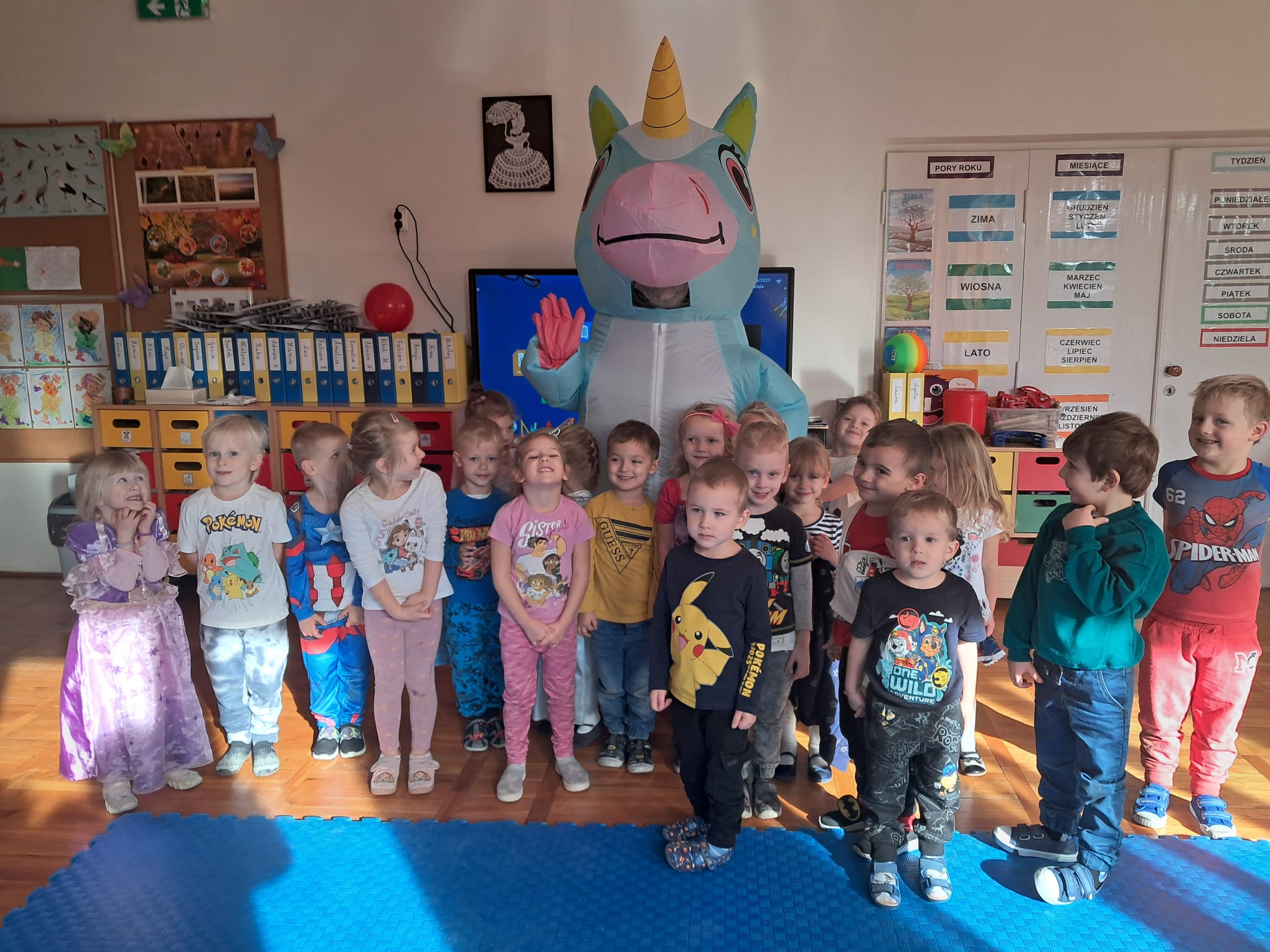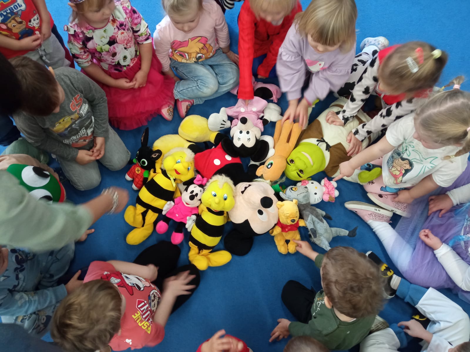 Od rana do przedszkola zamiast przedszkolaków wchodziły postaci z bajek, które ku naszemu zaskoczeniu witał Jednorożec. Podziw, radość i uśmiech zagościły na naszych twarzach. Zabawa zaczęła się w salach. Tańczyliśmy, bawiliśmy się, graliśmy w karty z postaciami z bajek i ich cieniami, układaliśmy puzzle, wykonywaliśmy prace plastyczne, robiliśmy książeczki, korony i pantofelki. Przynieśliśmy pluszaki z bajek. Było bajkowo.