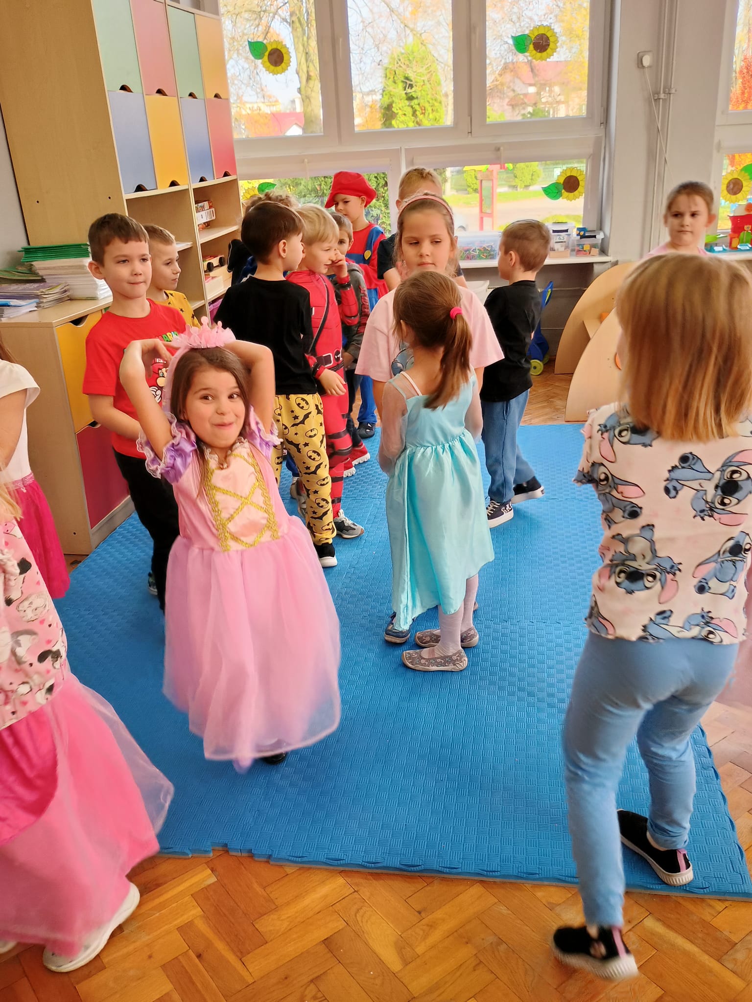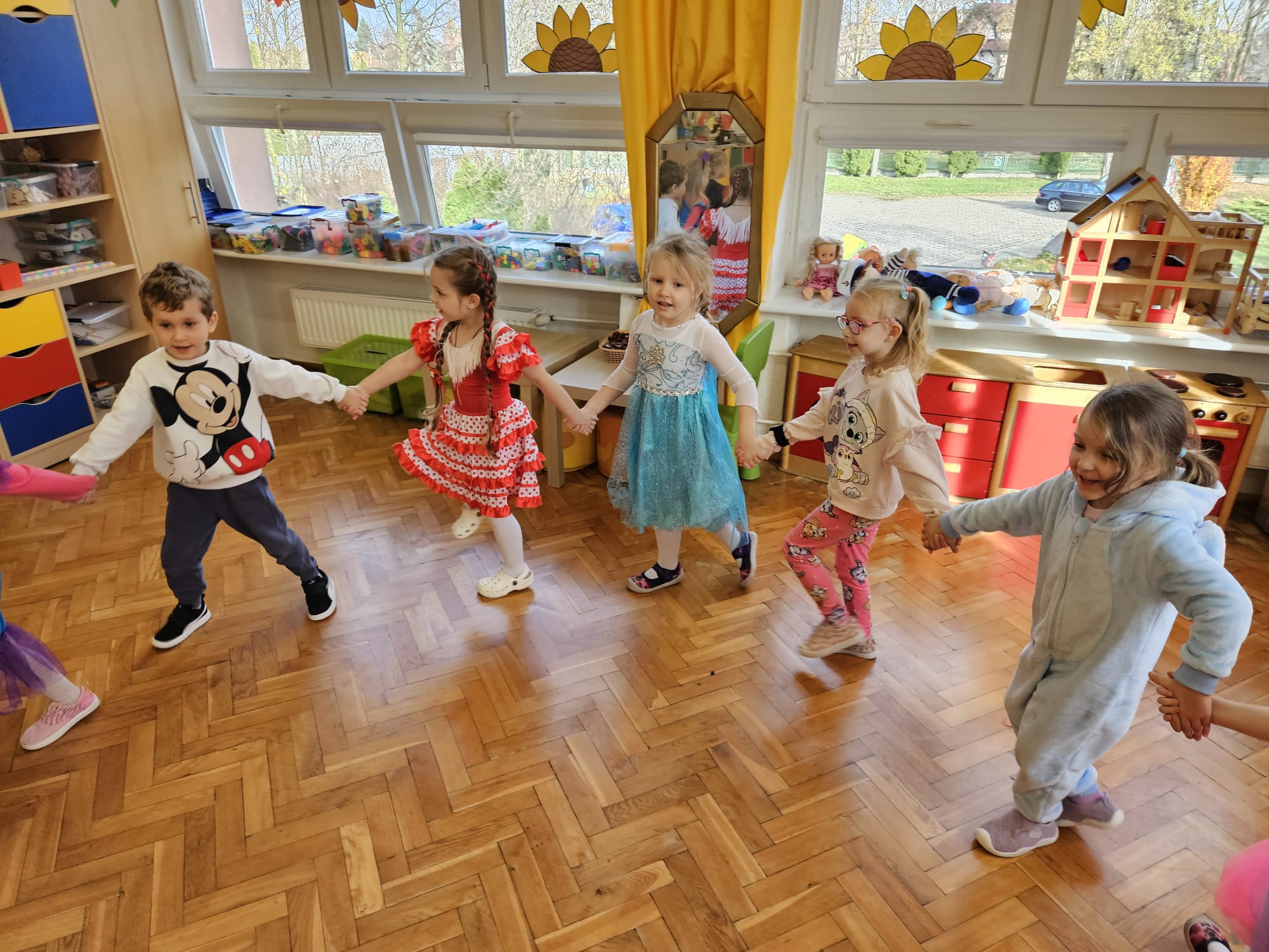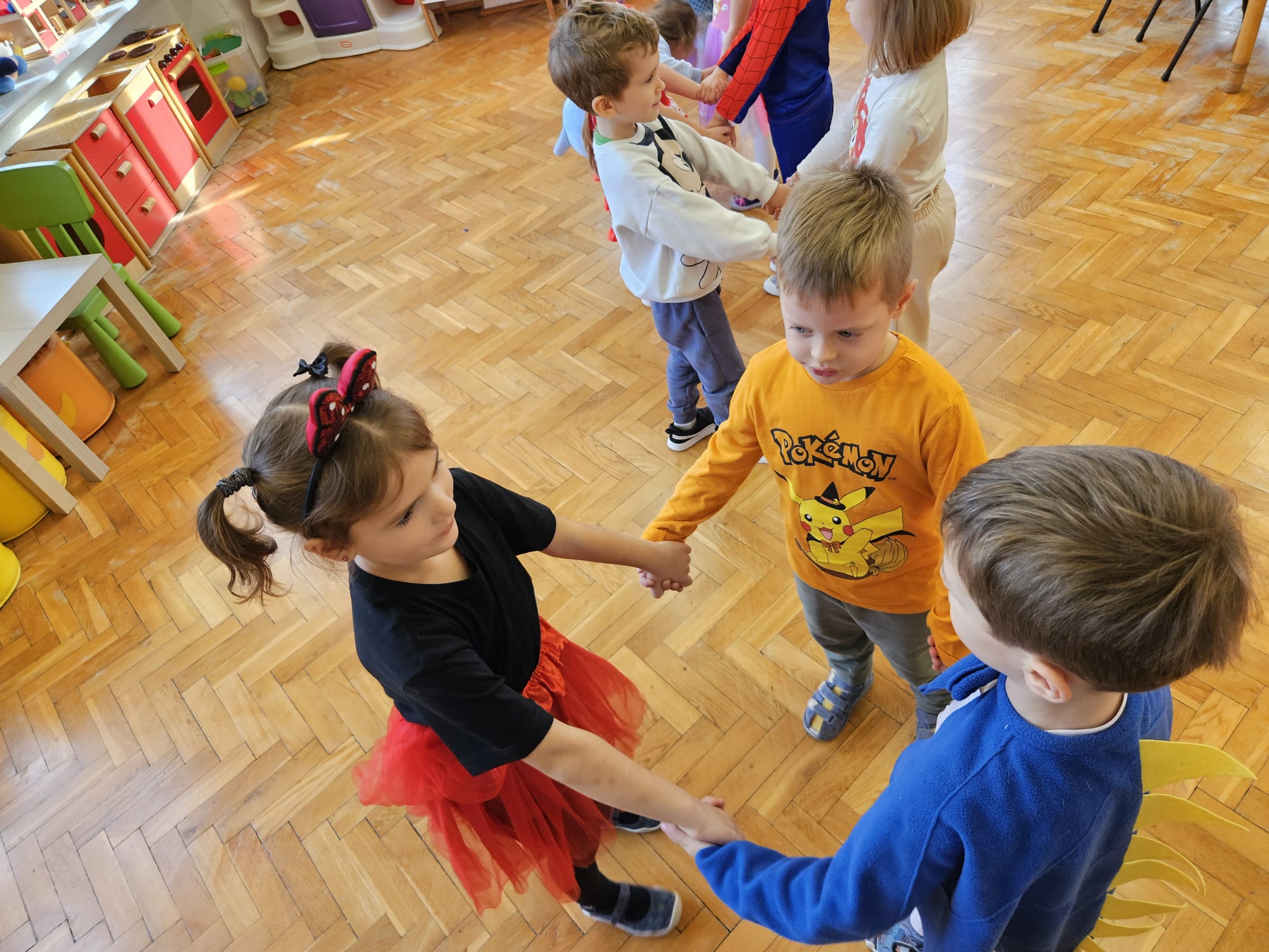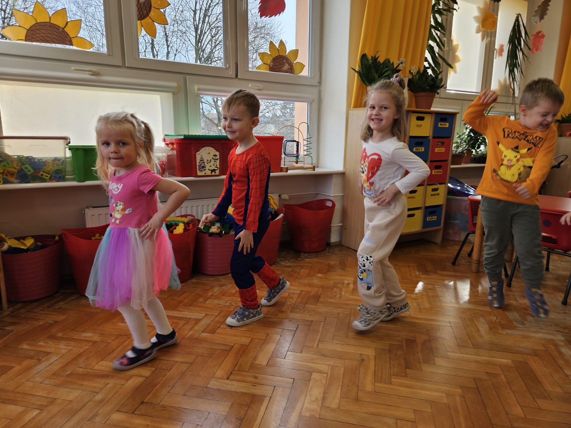 Od rana do przedszkola zamiast przedszkolaków wchodziły postaci z bajek, które ku naszemu zaskoczeniu witał Jednorożec. Podziw, radość i uśmiech zagościły na naszych twarzach. Zabawa zaczęła się w salach. Tańczyliśmy, bawiliśmy się, graliśmy w karty z postaciami z bajek i ich cieniami, układaliśmy puzzle, wykonywaliśmy prace plastyczne, robiliśmy książeczki, korony i pantofelki. Przynieśliśmy pluszaki z bajek. Było bajkowo.