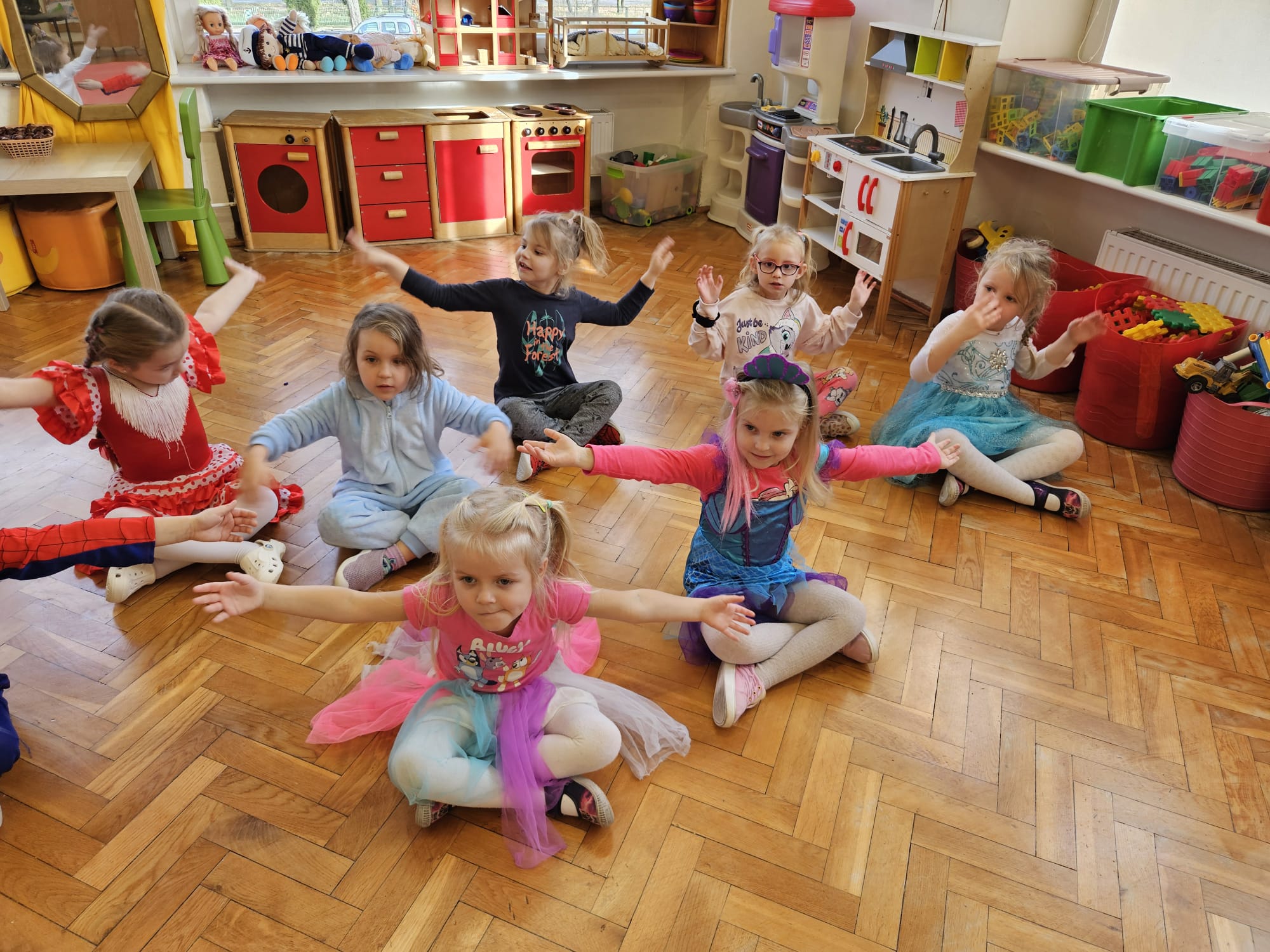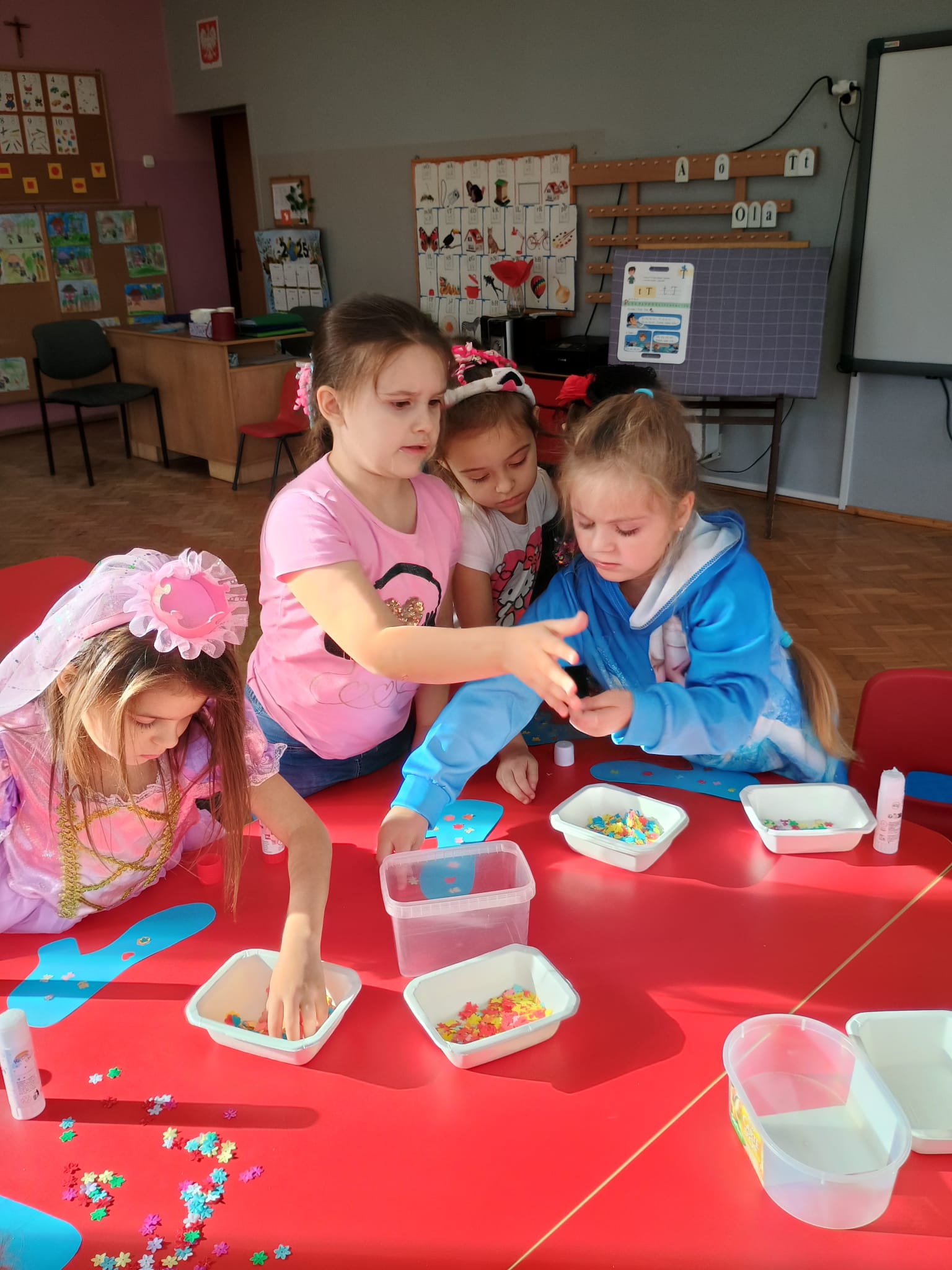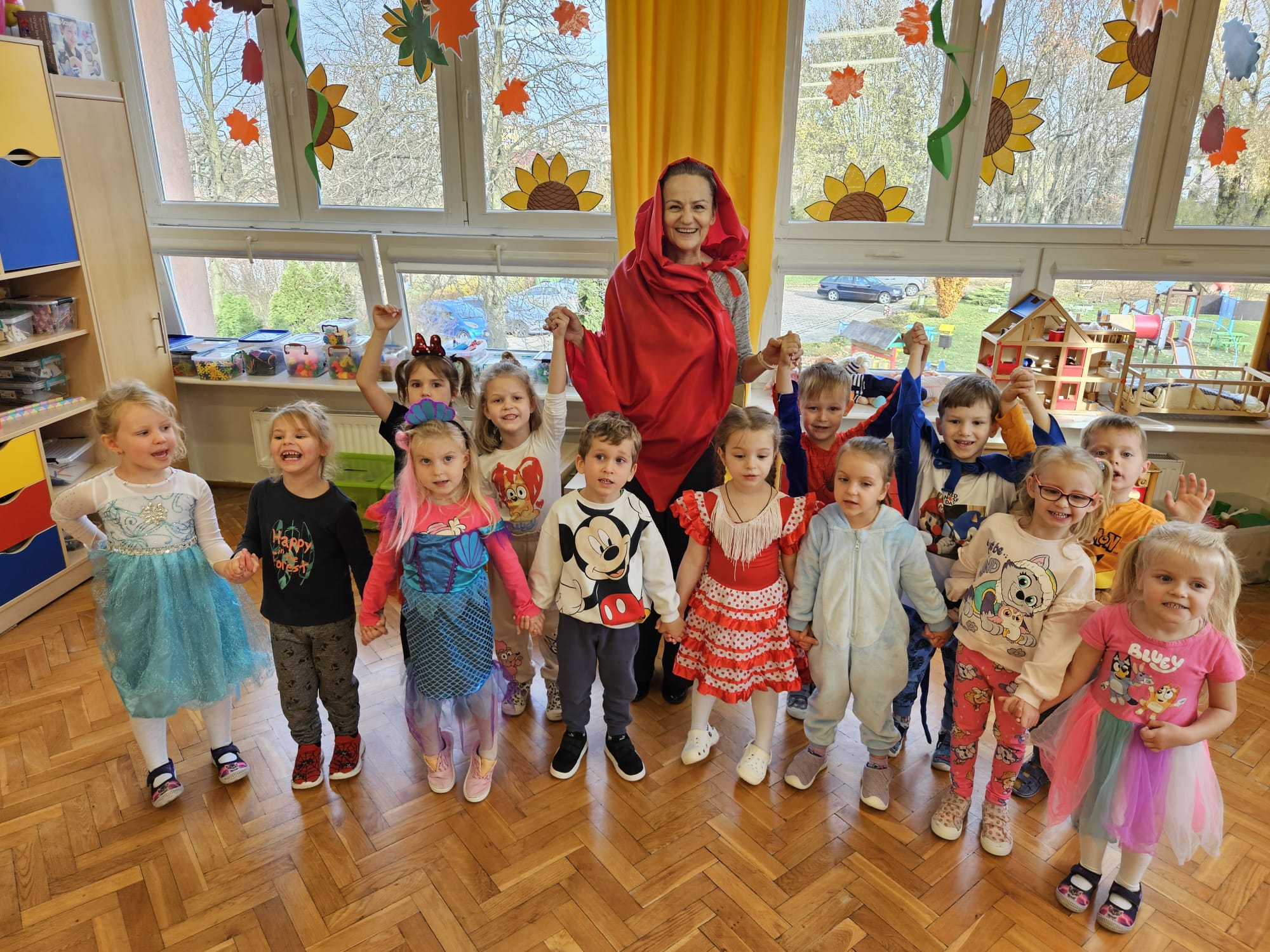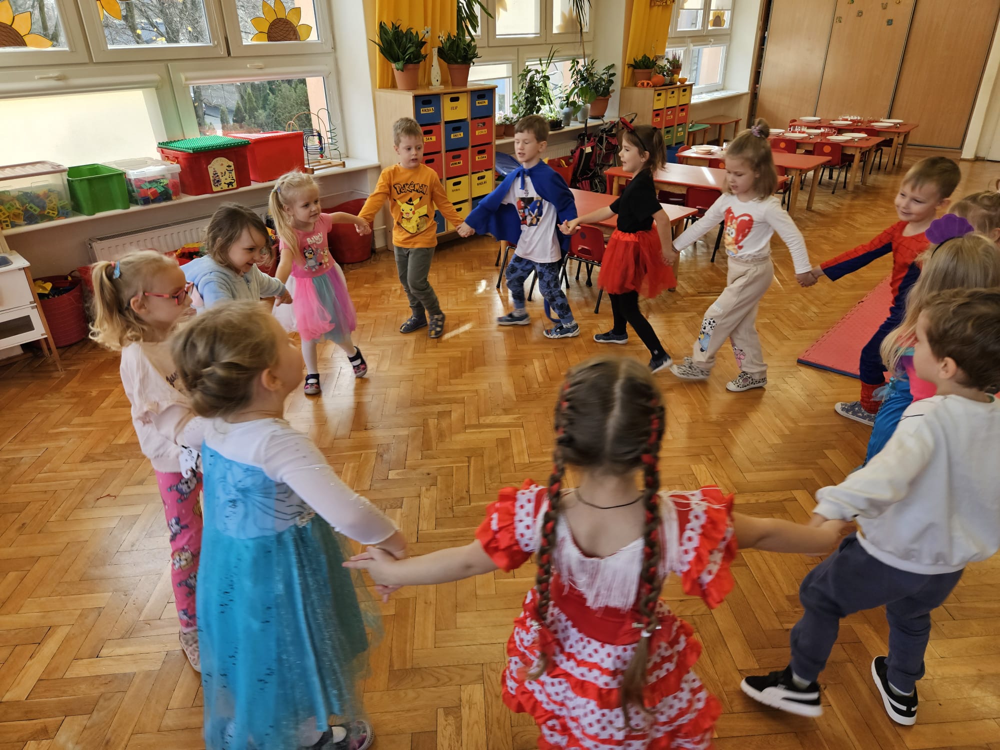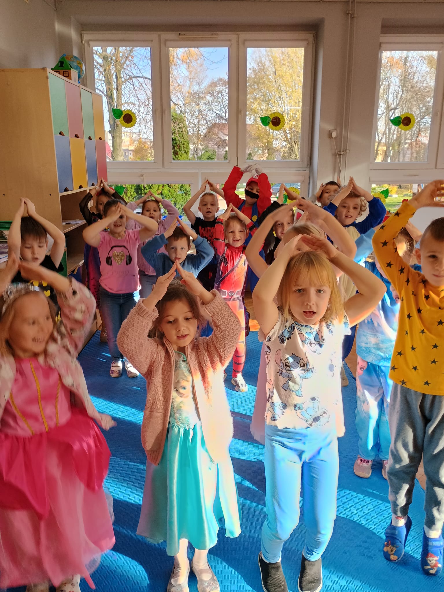 Od rana do przedszkola zamiast przedszkolaków wchodziły postaci z bajek, które ku naszemu zaskoczeniu witał Jednorożec. Podziw, radość i uśmiech zagościły na naszych twarzach. Zabawa zaczęła się w salach. Tańczyliśmy, bawiliśmy się, graliśmy w karty z postaciami z bajek i ich cieniami, układaliśmy puzzle, wykonywaliśmy prace plastyczne, robiliśmy książeczki, korony i pantofelki. Przynieśliśmy pluszaki z bajek. Było bajkowo.
