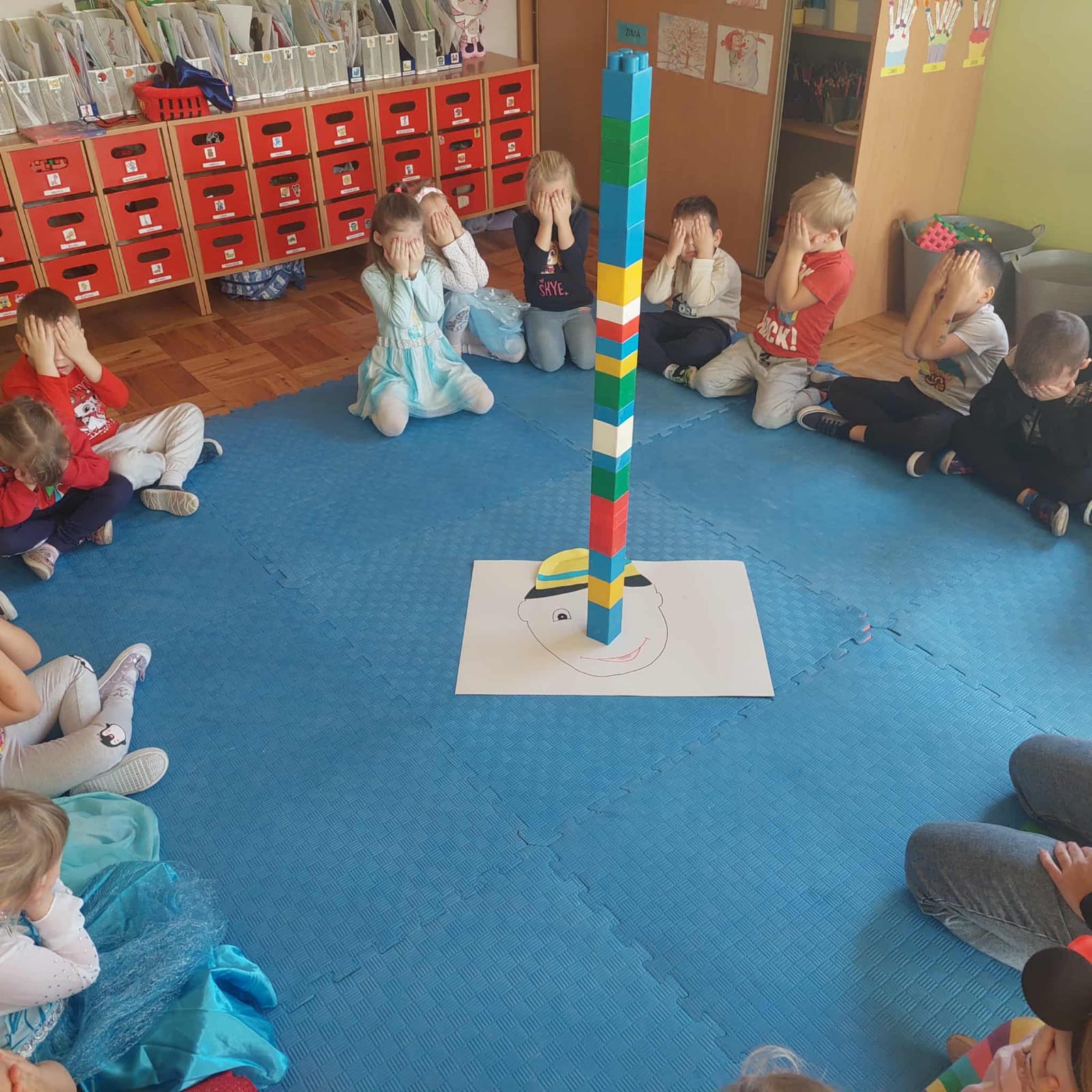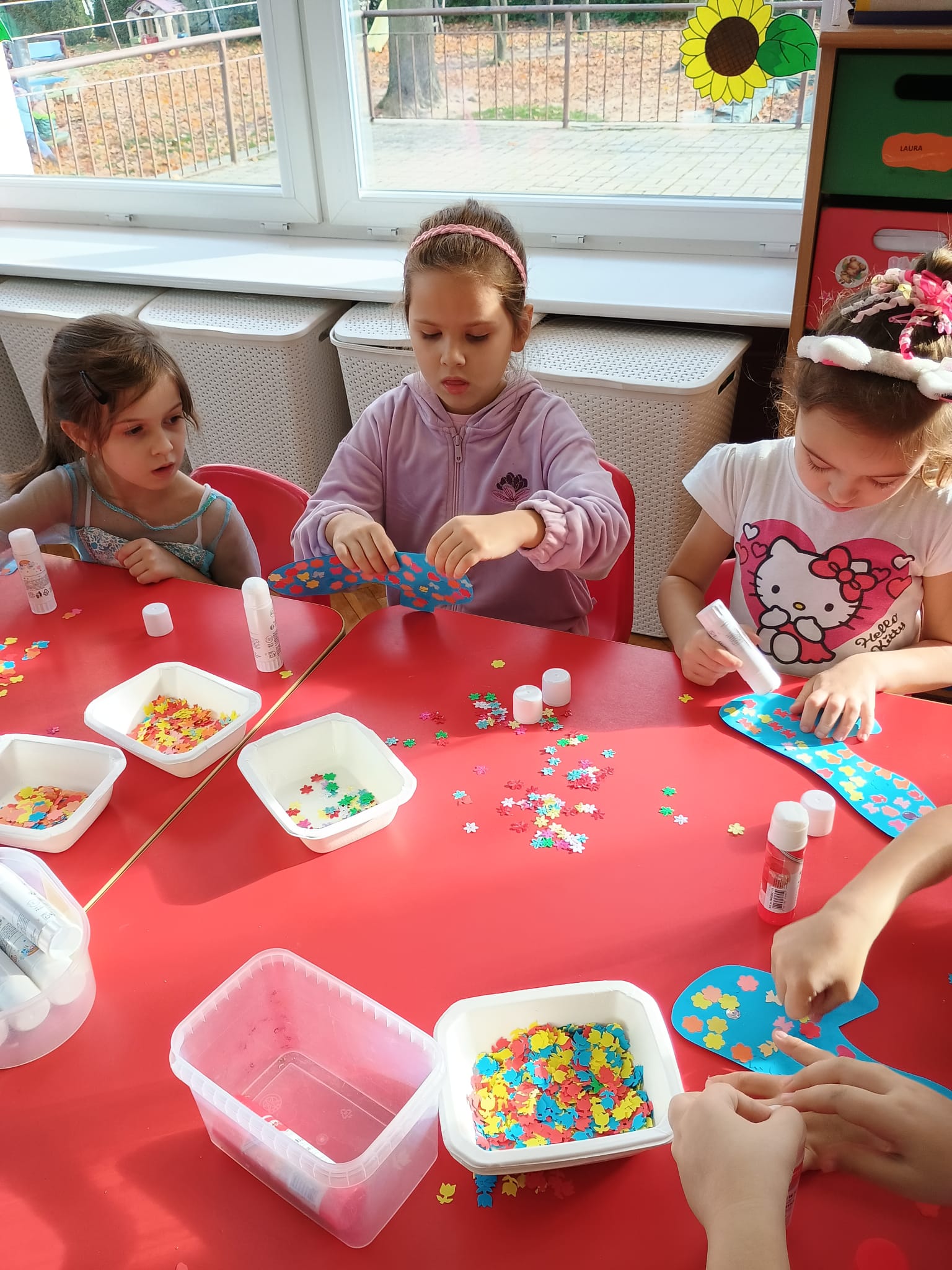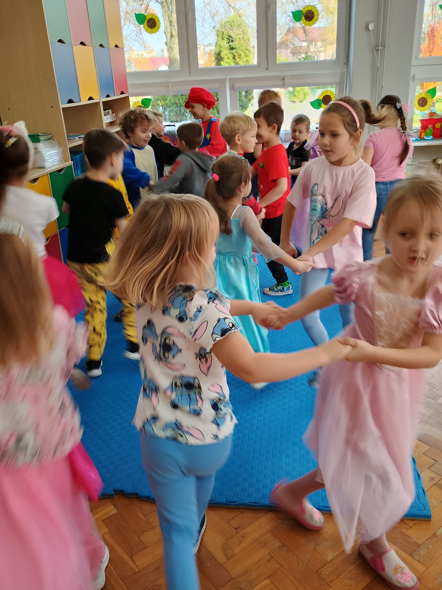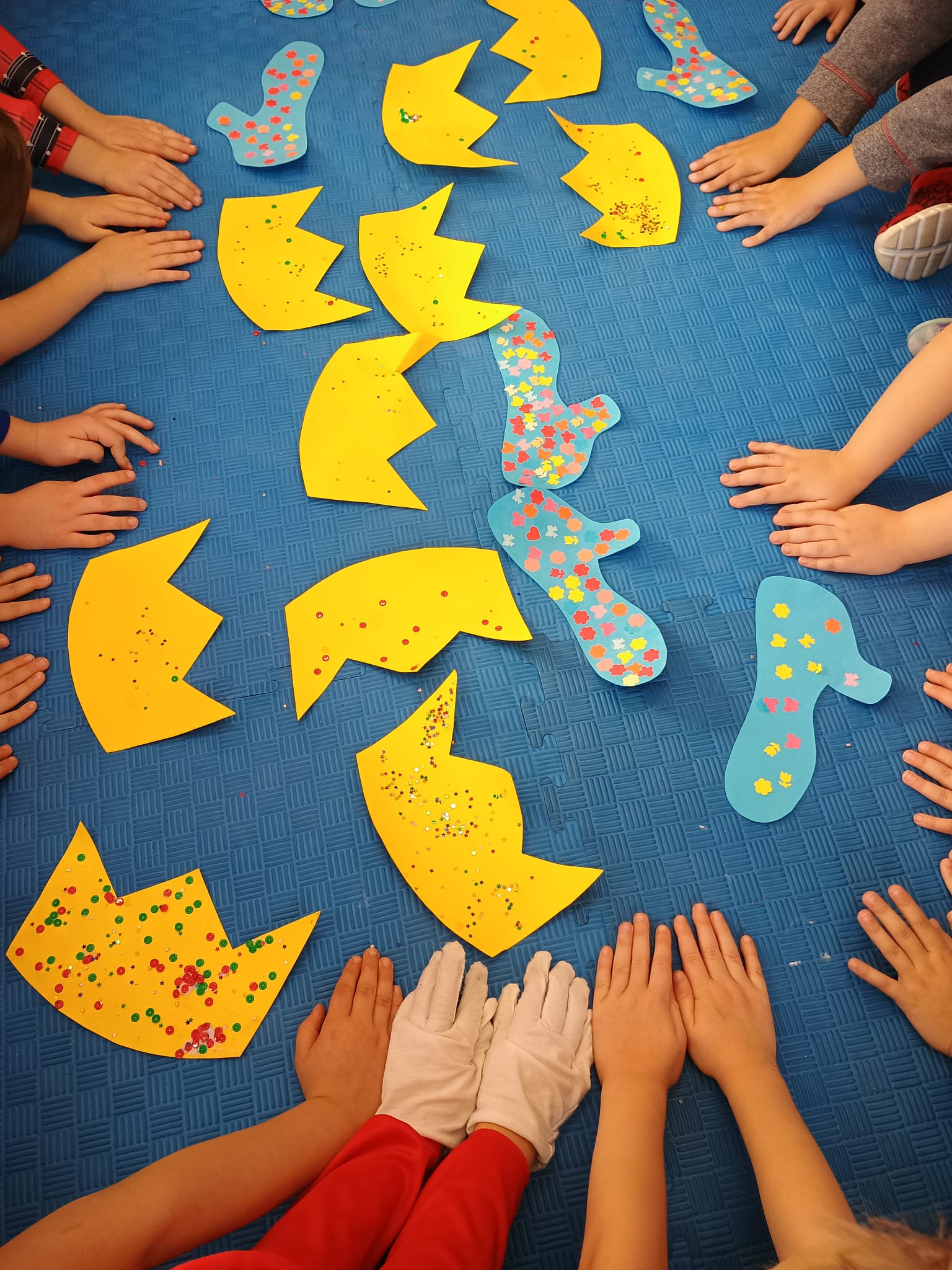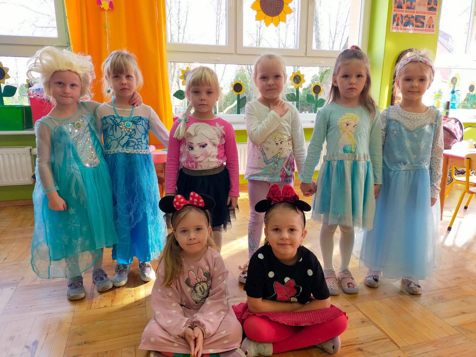 Od rana do przedszkola zamiast przedszkolaków wchodziły postaci z bajek, które ku naszemu zaskoczeniu witał Jednorożec. Podziw, radość i uśmiech zagościły na naszych twarzach. Zabawa zaczęła się w salach. Tańczyliśmy, bawiliśmy się, graliśmy w karty z postaciami z bajek i ich cieniami, układaliśmy puzzle, wykonywaliśmy prace plastyczne, robiliśmy książeczki, korony i pantofelki. Przynieśliśmy pluszaki z bajek. Było bajkowo.