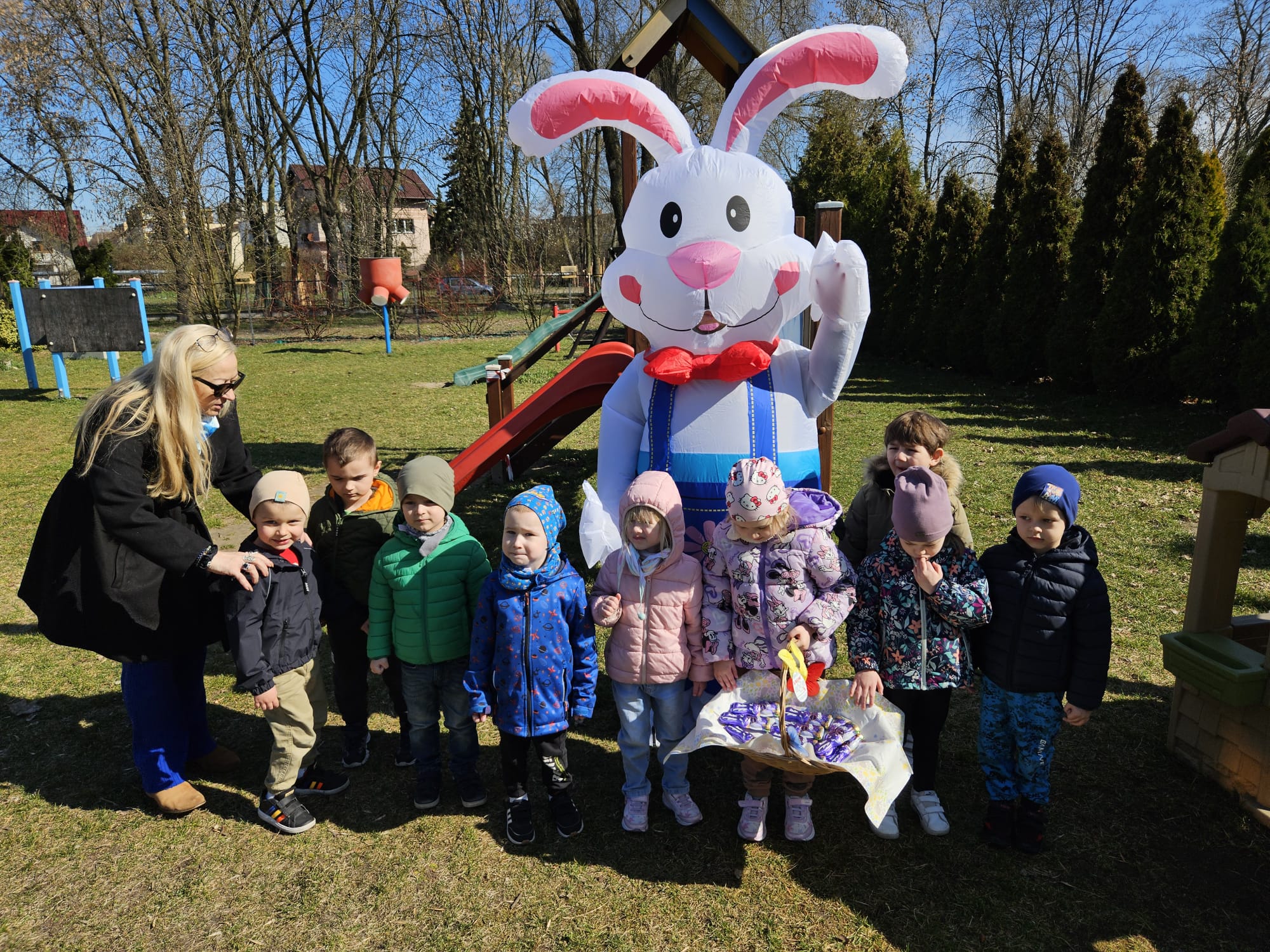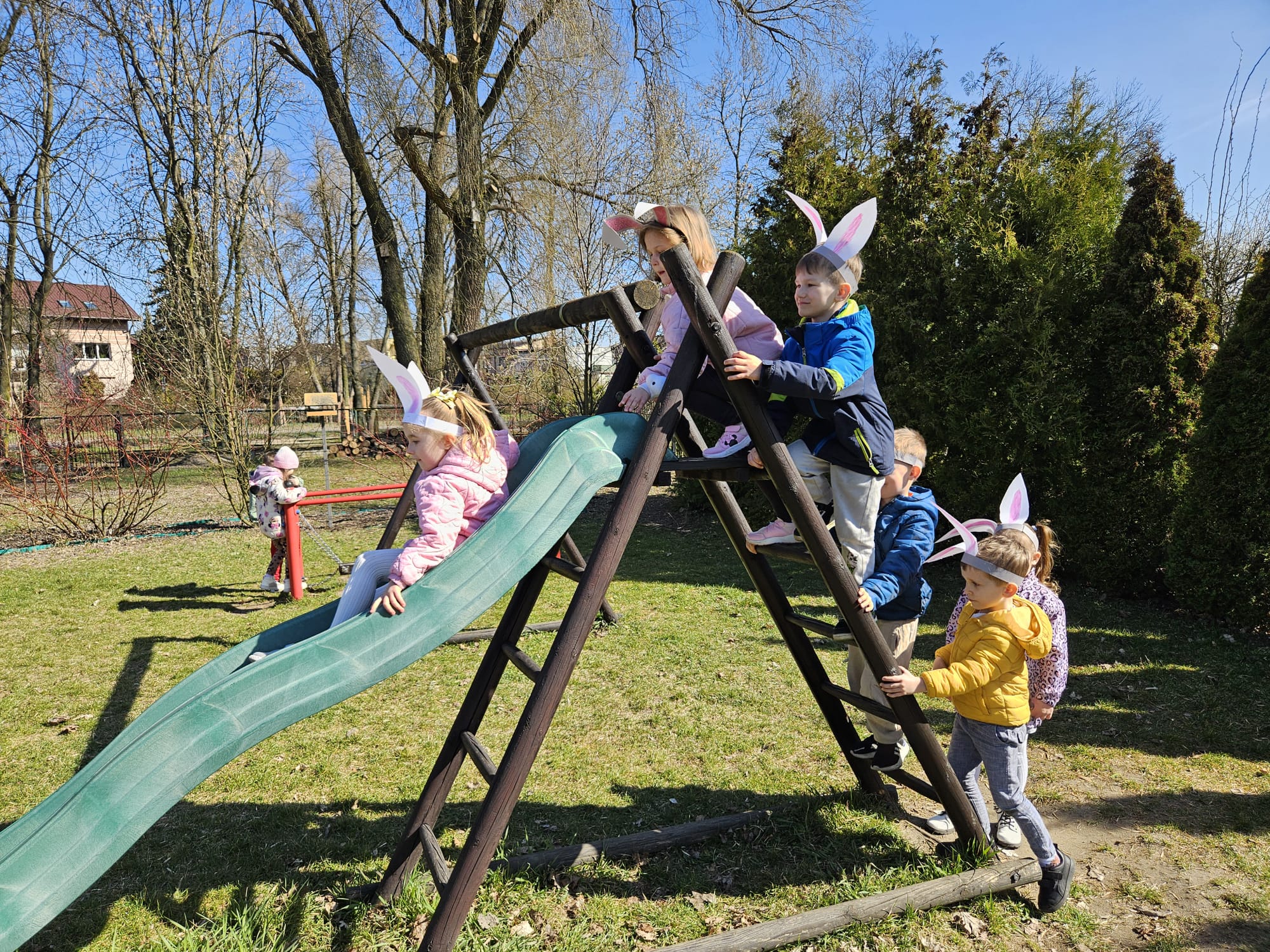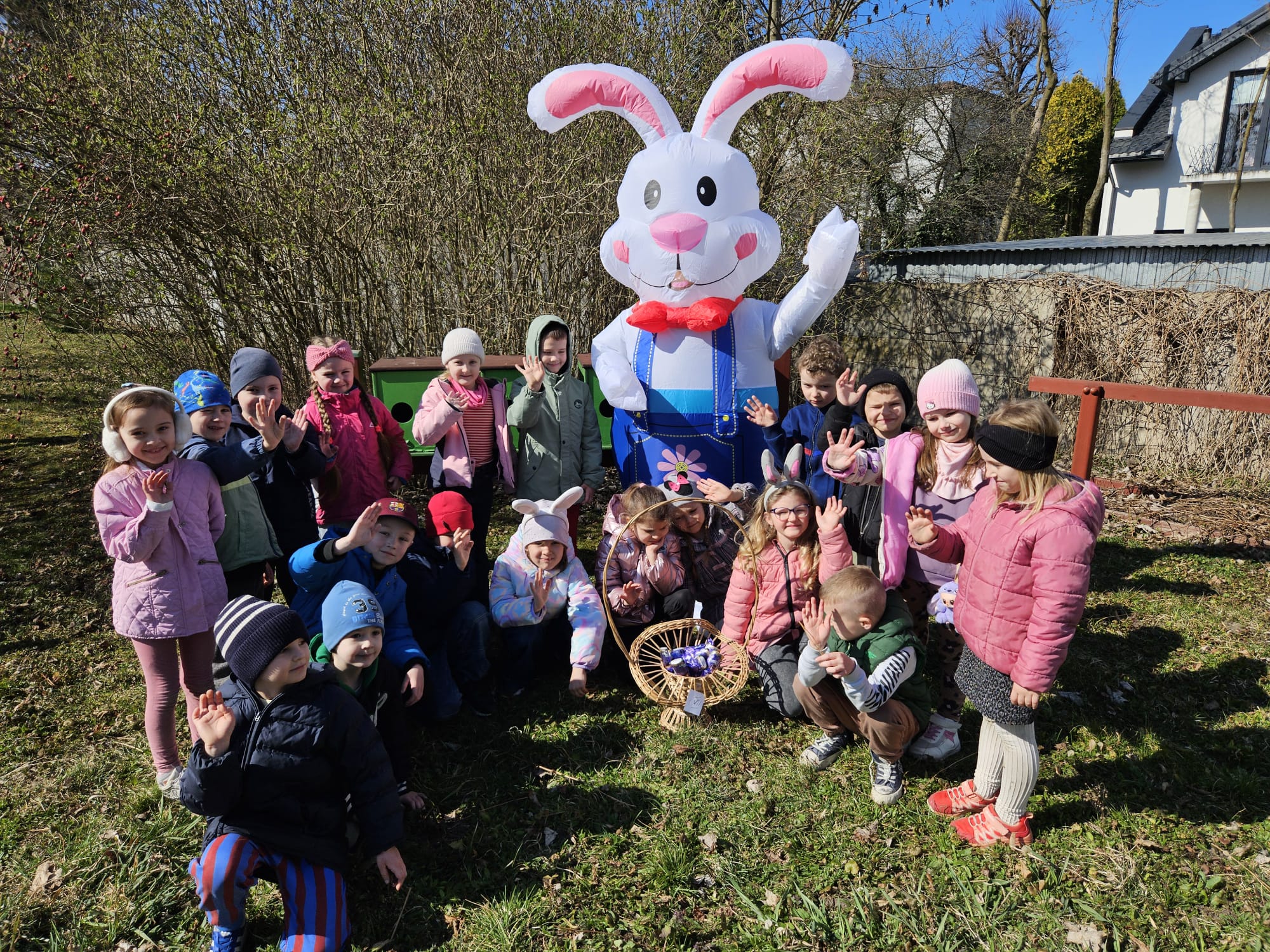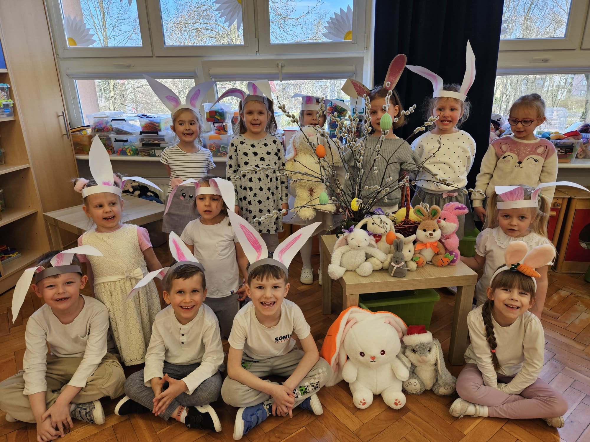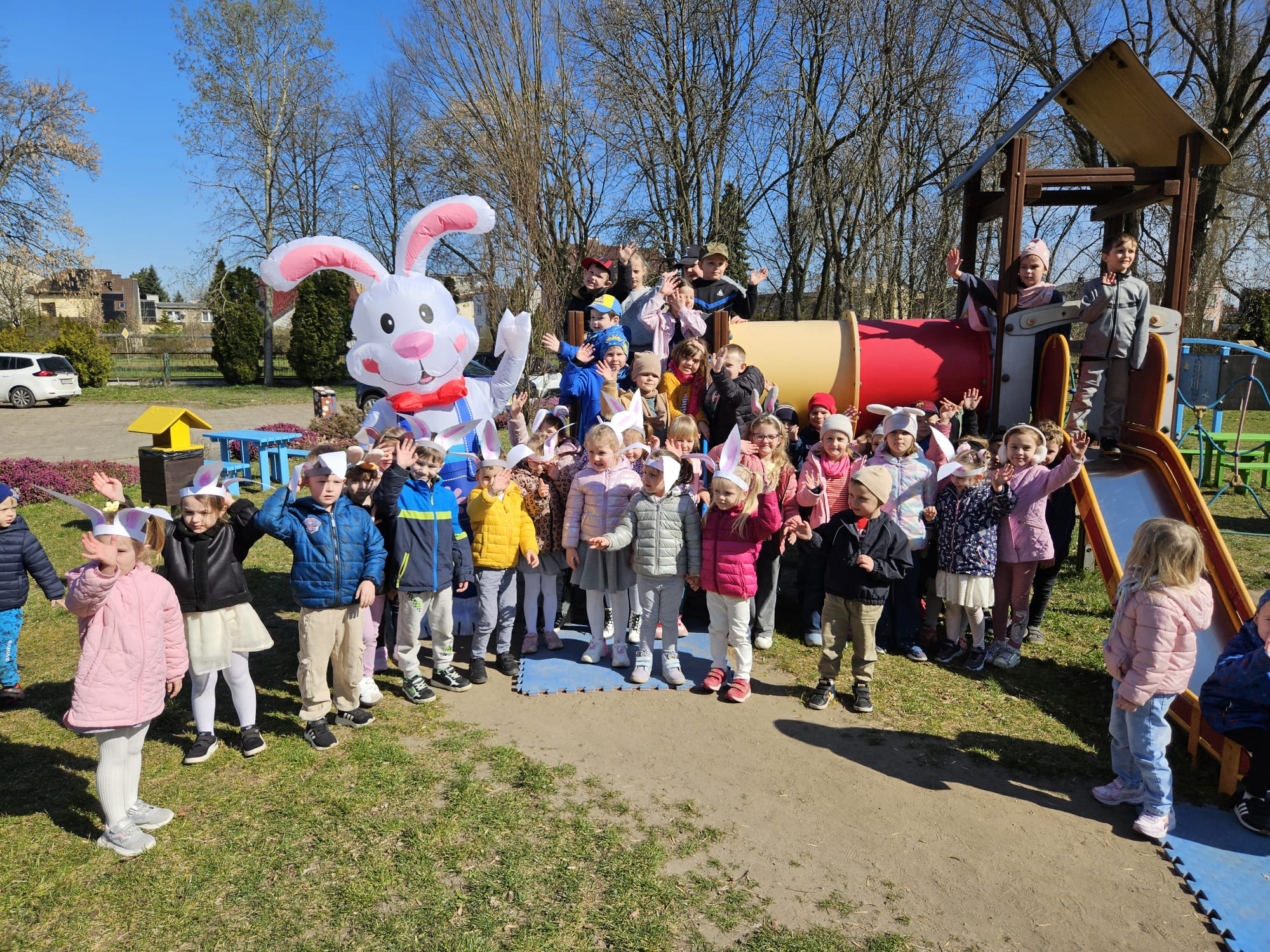 Do przedszkola razem z nami zawitały pluszaki zajączki. Sami próbowaliśmy upodobnić się do zajączków. Do naszych białych i szarych kolorów ubrań dorobiliśmy opaski z uszami i zamiast przedszkolaków biegały zające. Czekaliśmy na naszego Zajączka Wielkanocnego w ogrodzie przedszkolnym. Razem z nim rozwiązywaliśmy zagadki i szukaliśmy ukrytych koszyczków ze słodkościami. Była świetna zabawa. Potem wszyscy rozbiegliśmy się po ogrodzie. W salach kolorowaliśmy zajączki.