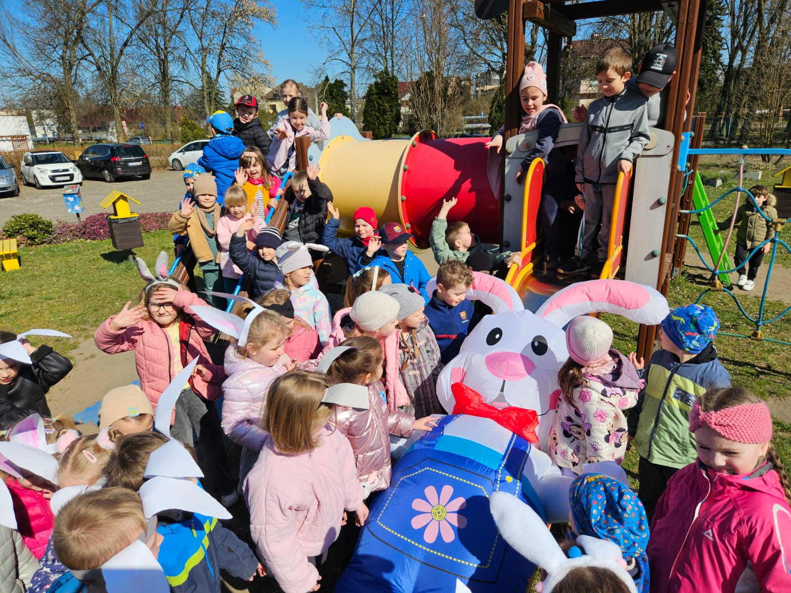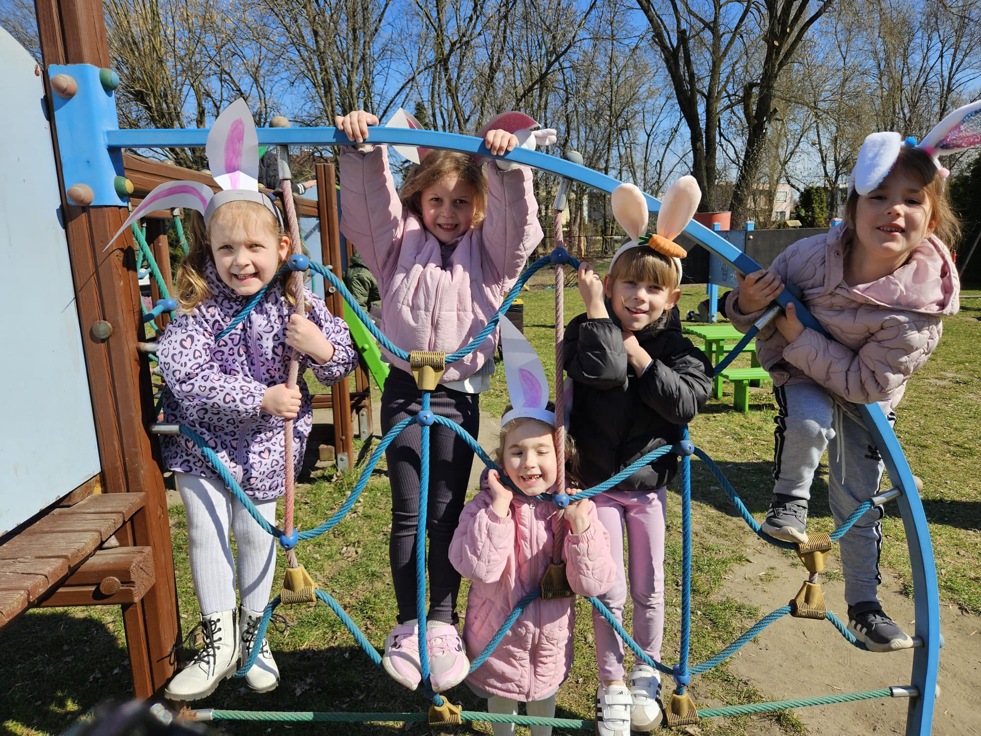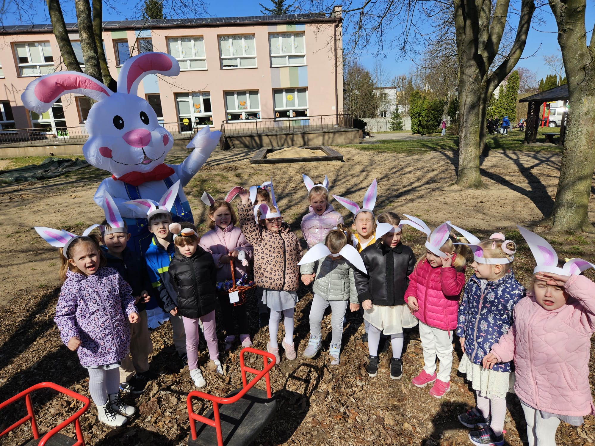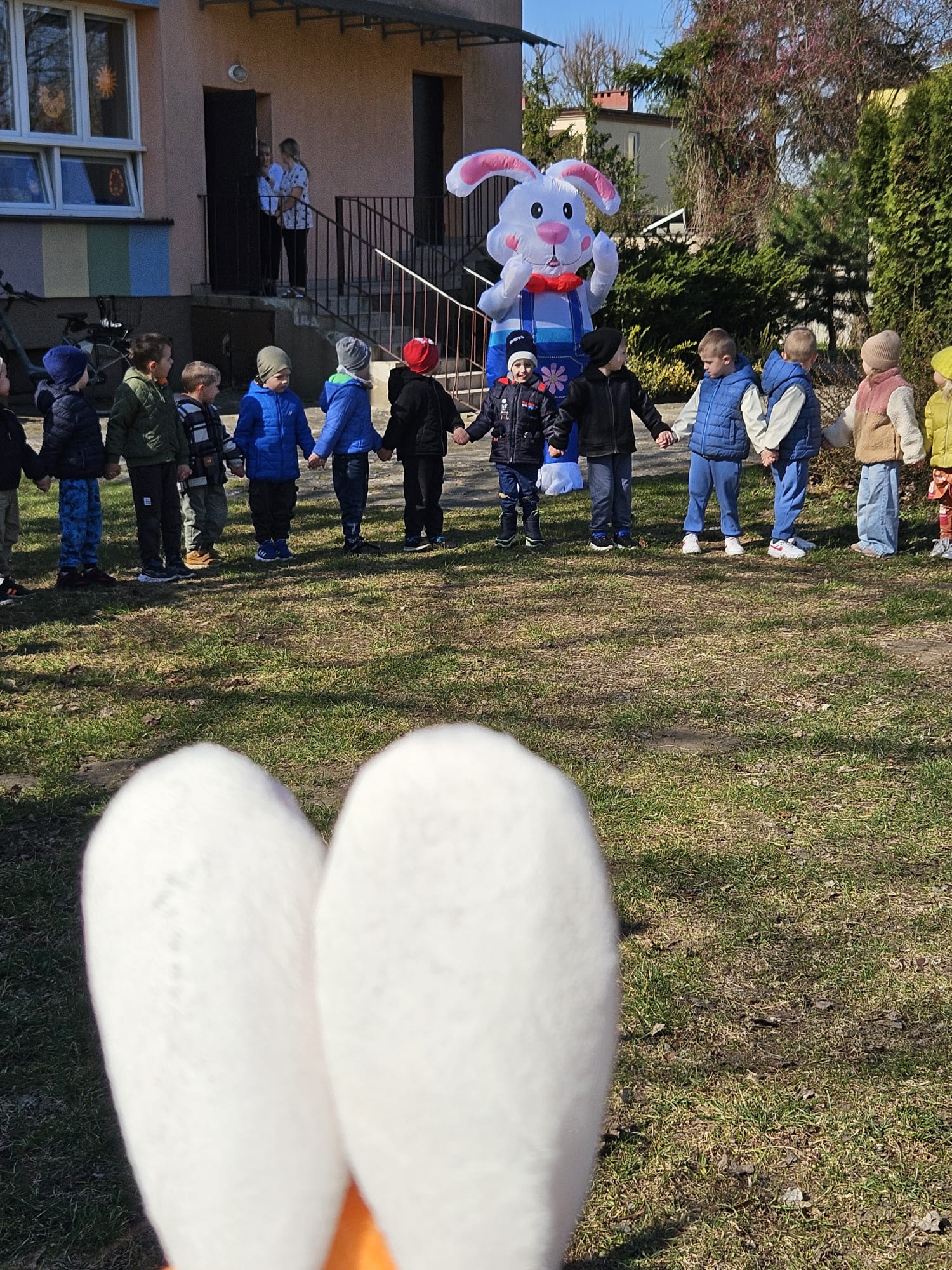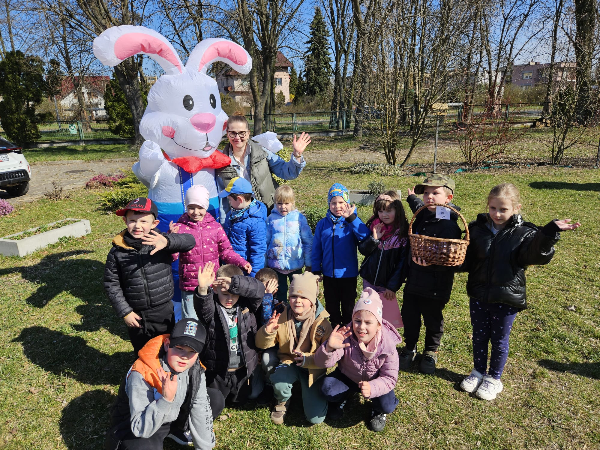 Do przedszkola razem z nami zawitały pluszaki zajączki. Sami próbowaliśmy upodobnić się do zajączków. Do naszych białych i szarych kolorów ubrań dorobiliśmy opaski z uszami i zamiast przedszkolaków biegały zające. Czekaliśmy na naszego Zajączka Wielkanocnego w ogrodzie przedszkolnym. Razem z nim rozwiązywaliśmy zagadki i szukaliśmy ukrytych koszyczków ze słodkościami. Była świetna zabawa. Potem wszyscy rozbiegliśmy się po ogrodzie. W salach kolorowaliśmy zajączki.