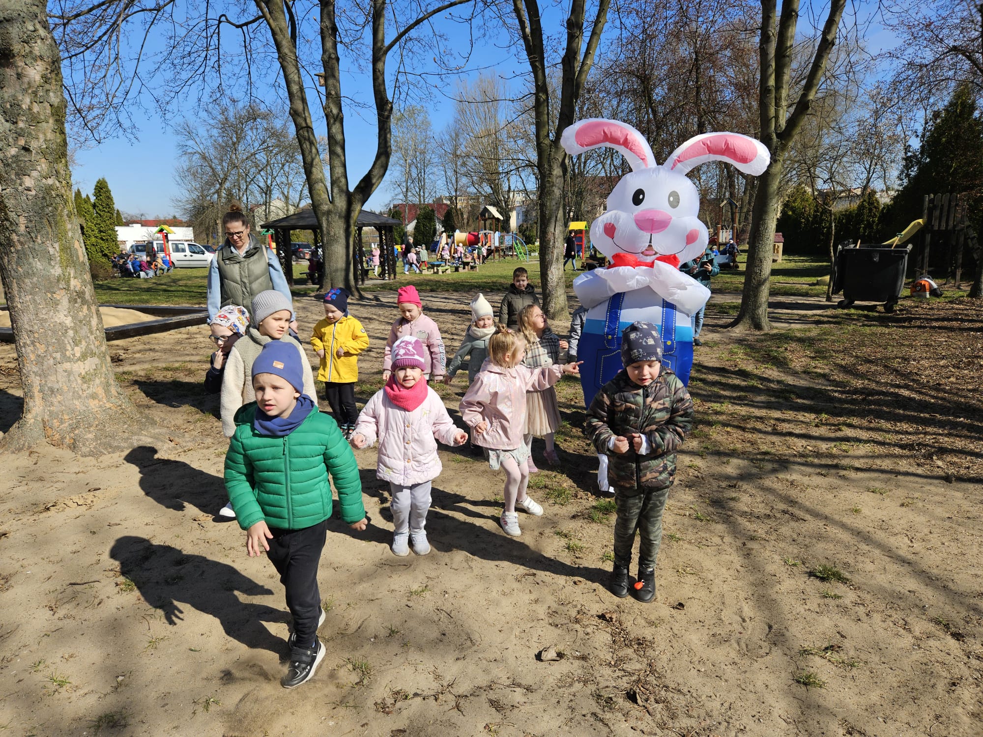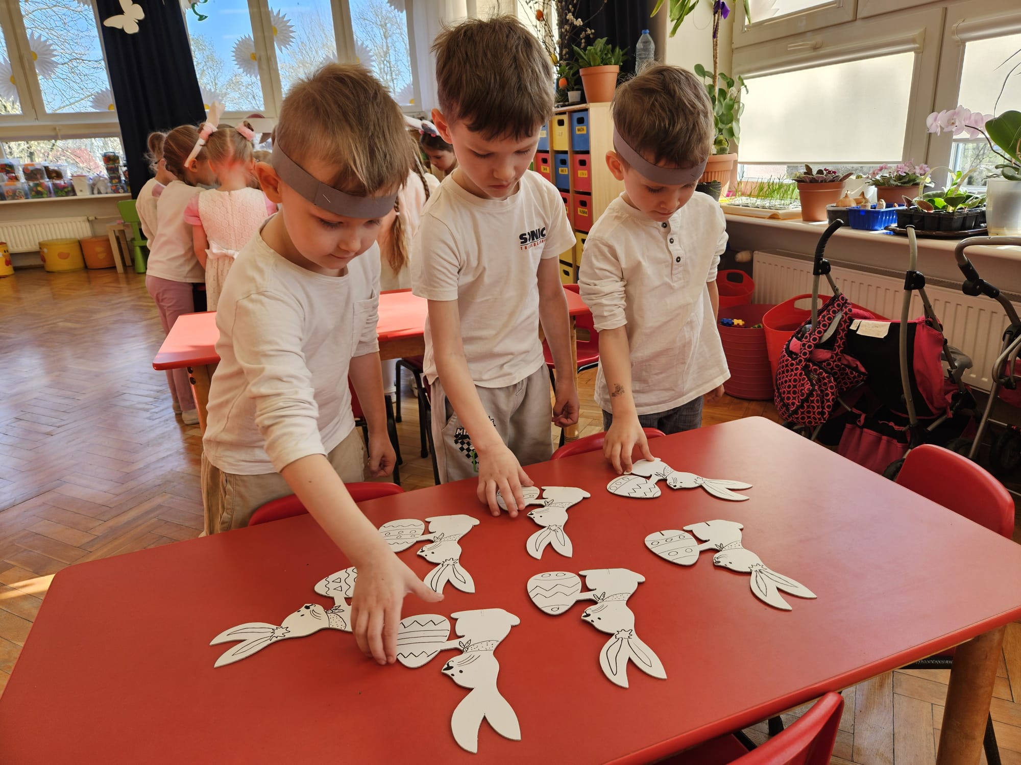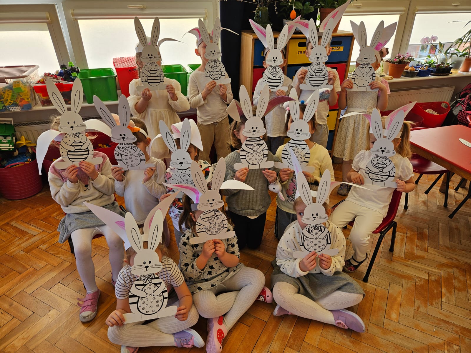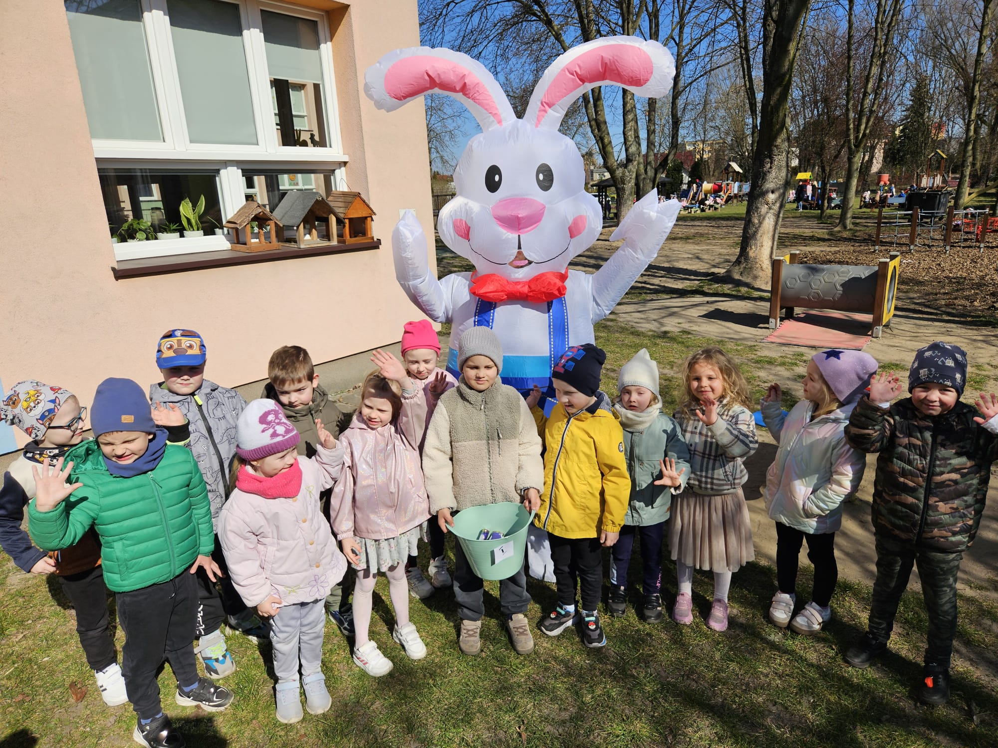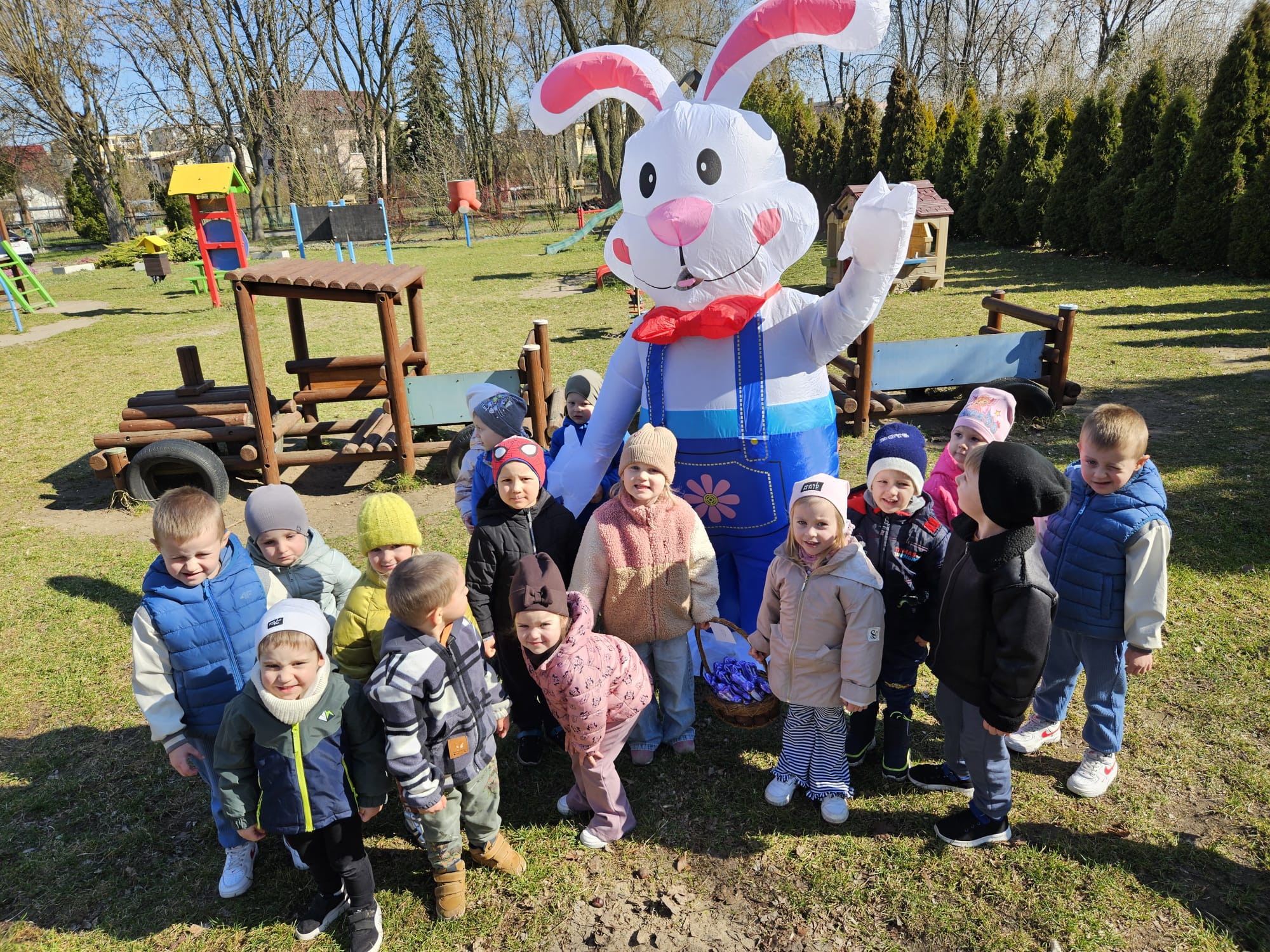 Do przedszkola razem z nami zawitały pluszaki zajączki. Sami próbowaliśmy upodobnić się do zajączków. Do naszych białych i szarych kolorów ubrań dorobiliśmy opaski z uszami i zamiast przedszkolaków biegały zające. Czekaliśmy na naszego Zajączka Wielkanocnego w ogrodzie przedszkolnym. Razem z nim rozwiązywaliśmy zagadki i szukaliśmy ukrytych koszyczków ze słodkościami. Była świetna zabawa. Potem wszyscy rozbiegliśmy się po ogrodzie. W salach kolorowaliśmy zajączki.