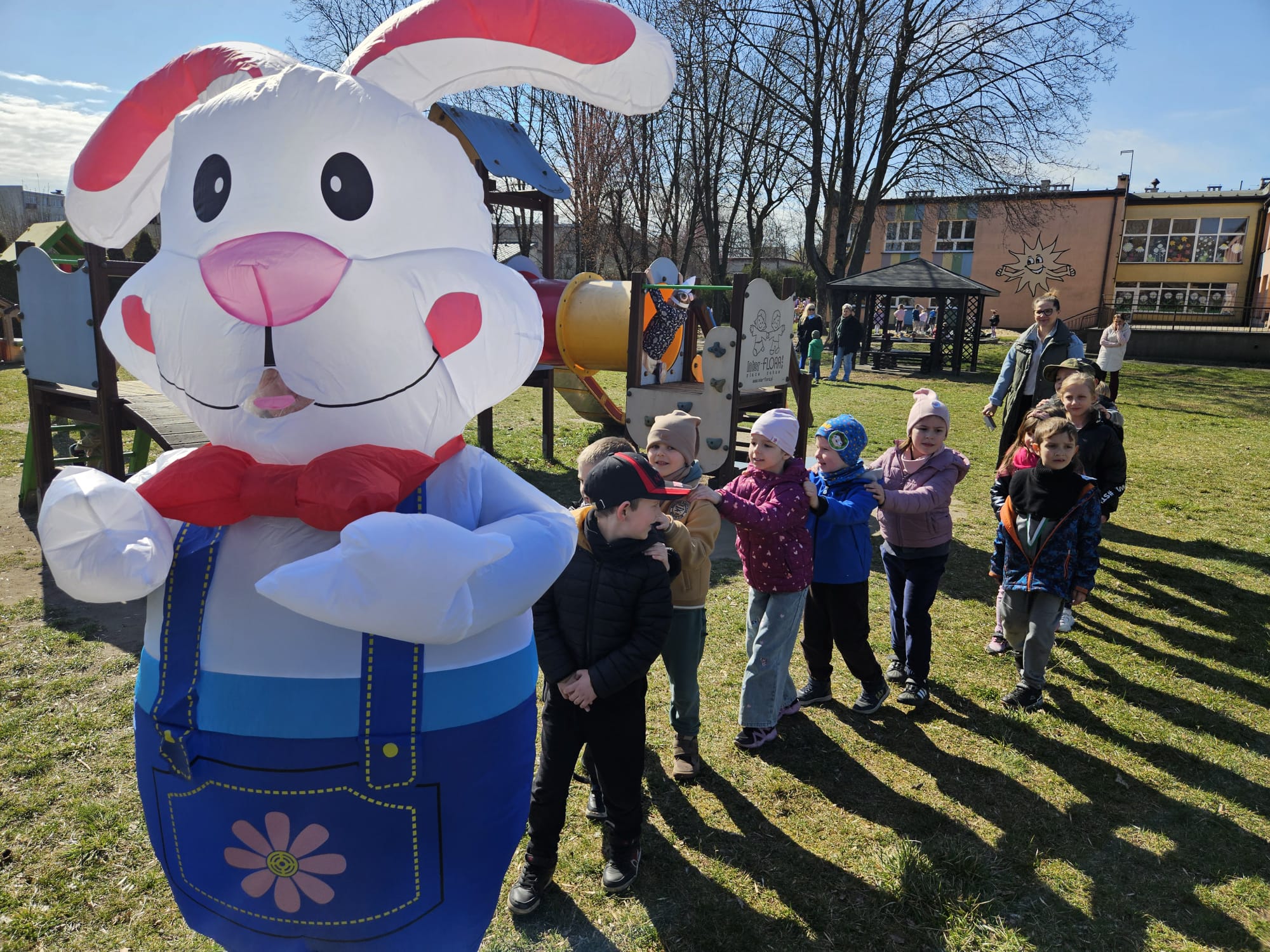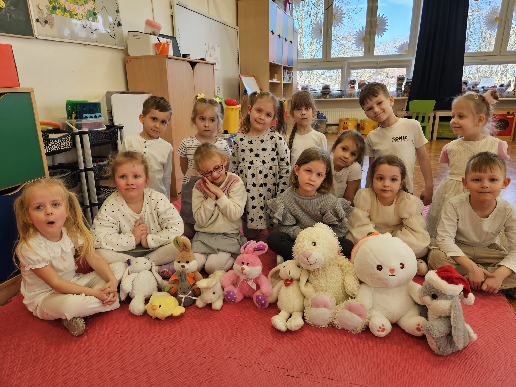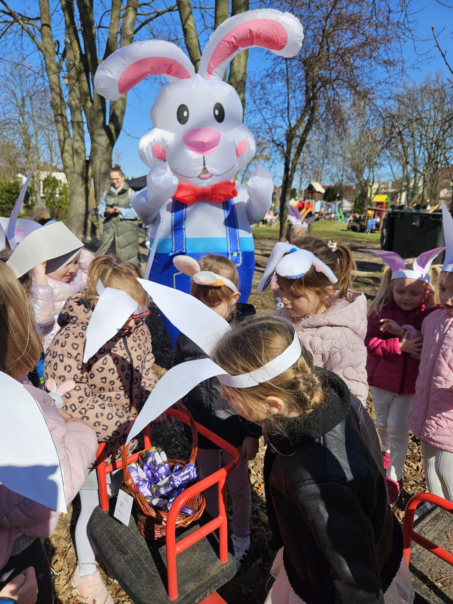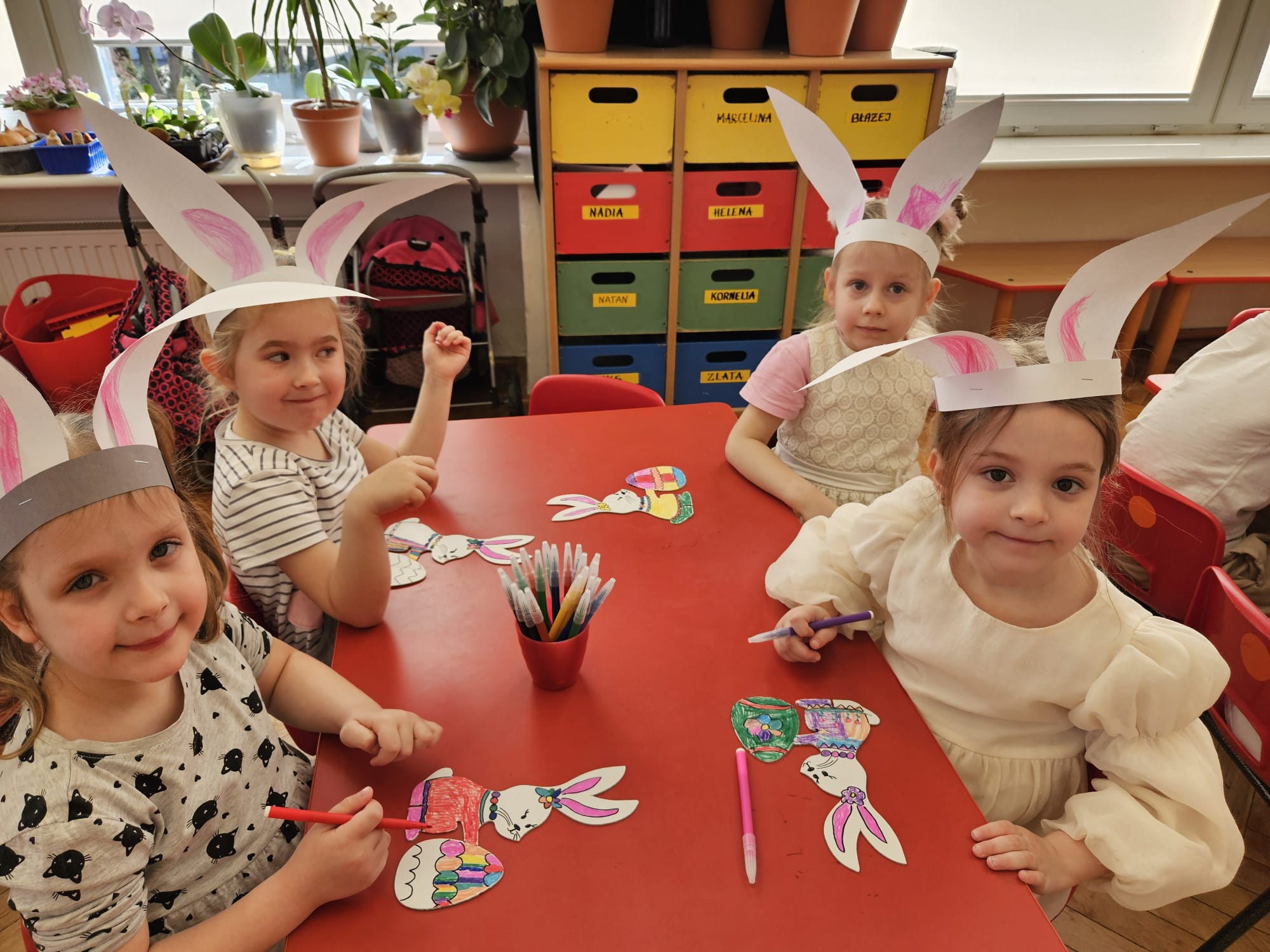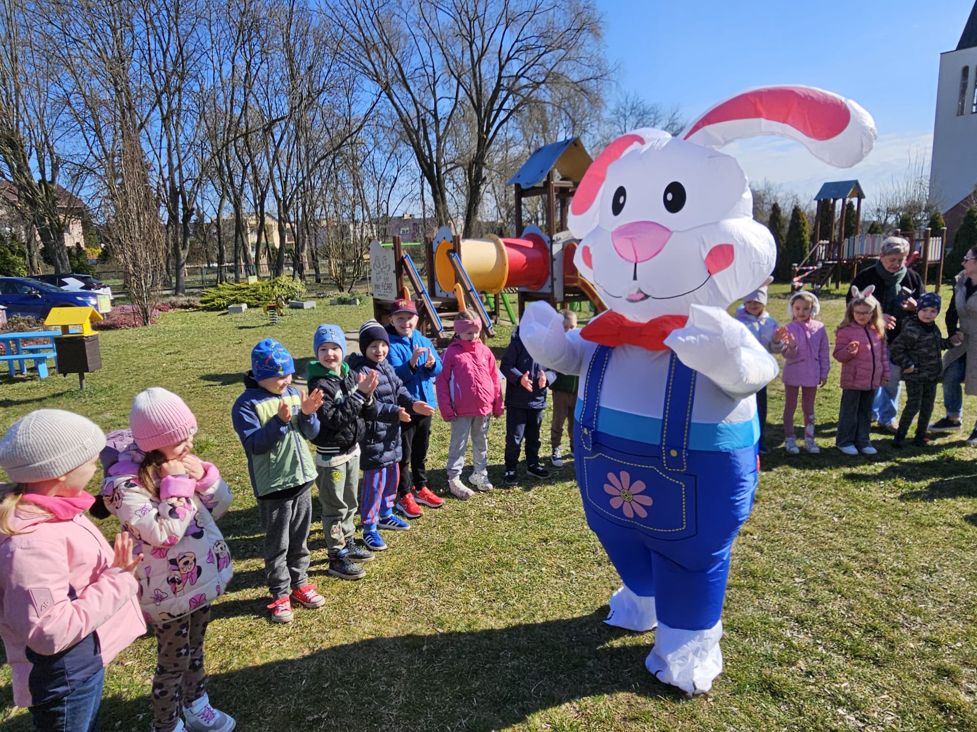 Do przedszkola razem z nami zawitały pluszaki zajączki. Sami próbowaliśmy upodobnić się do zajączków. Do naszych białych i szarych kolorów ubrań dorobiliśmy opaski z uszami i zamiast przedszkolaków biegały zające. Czekaliśmy na naszego Zajączka Wielkanocnego w ogrodzie przedszkolnym. Razem z nim rozwiązywaliśmy zagadki i szukaliśmy ukrytych koszyczków ze słodkościami. Była świetna zabawa. Potem wszyscy rozbiegliśmy się po ogrodzie. W salach kolorowaliśmy zajączki.