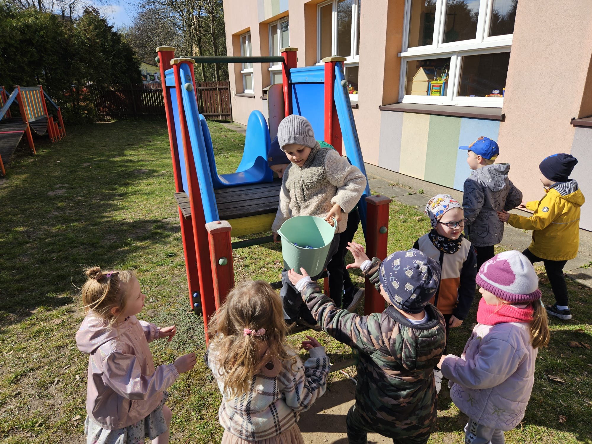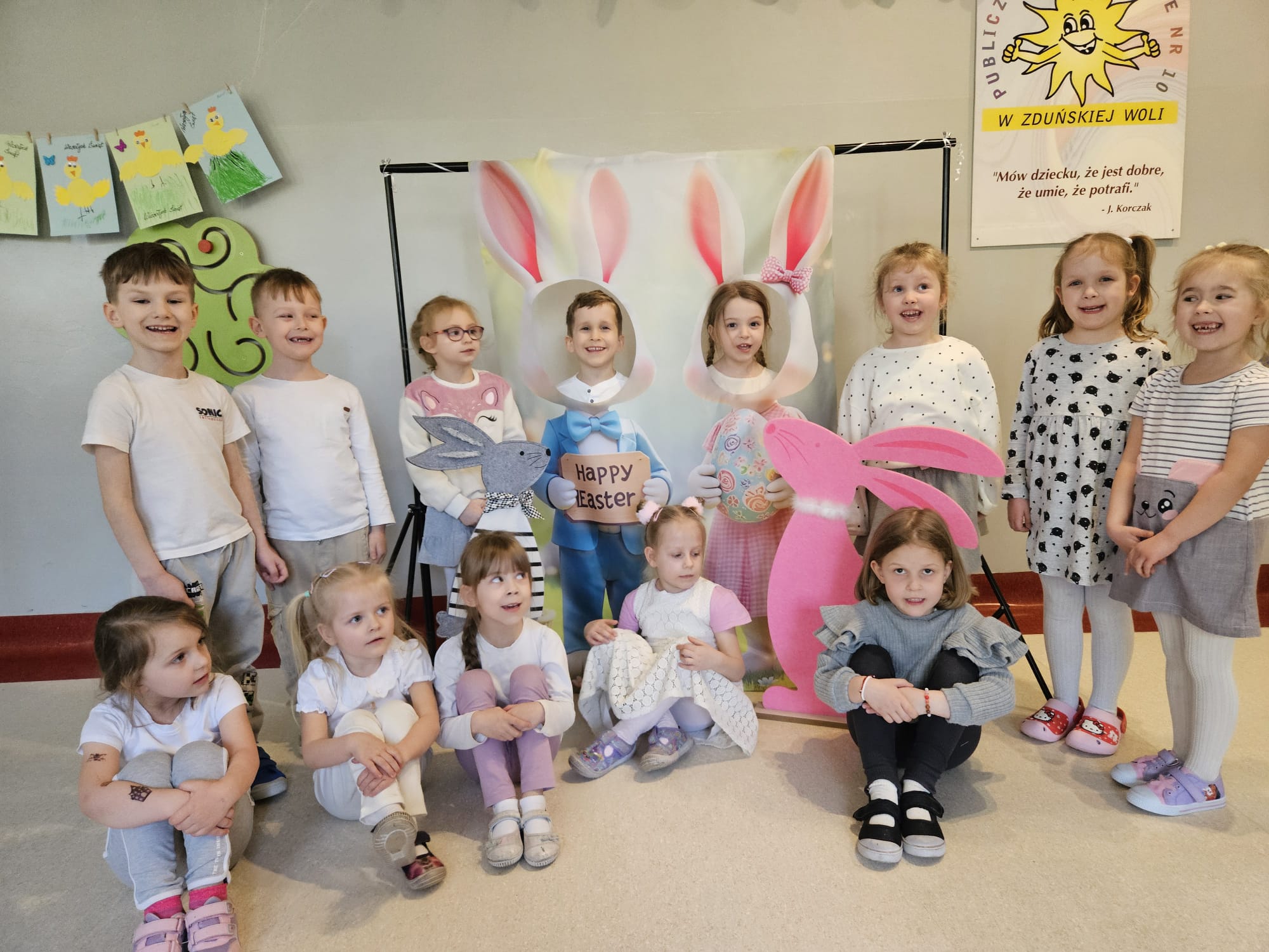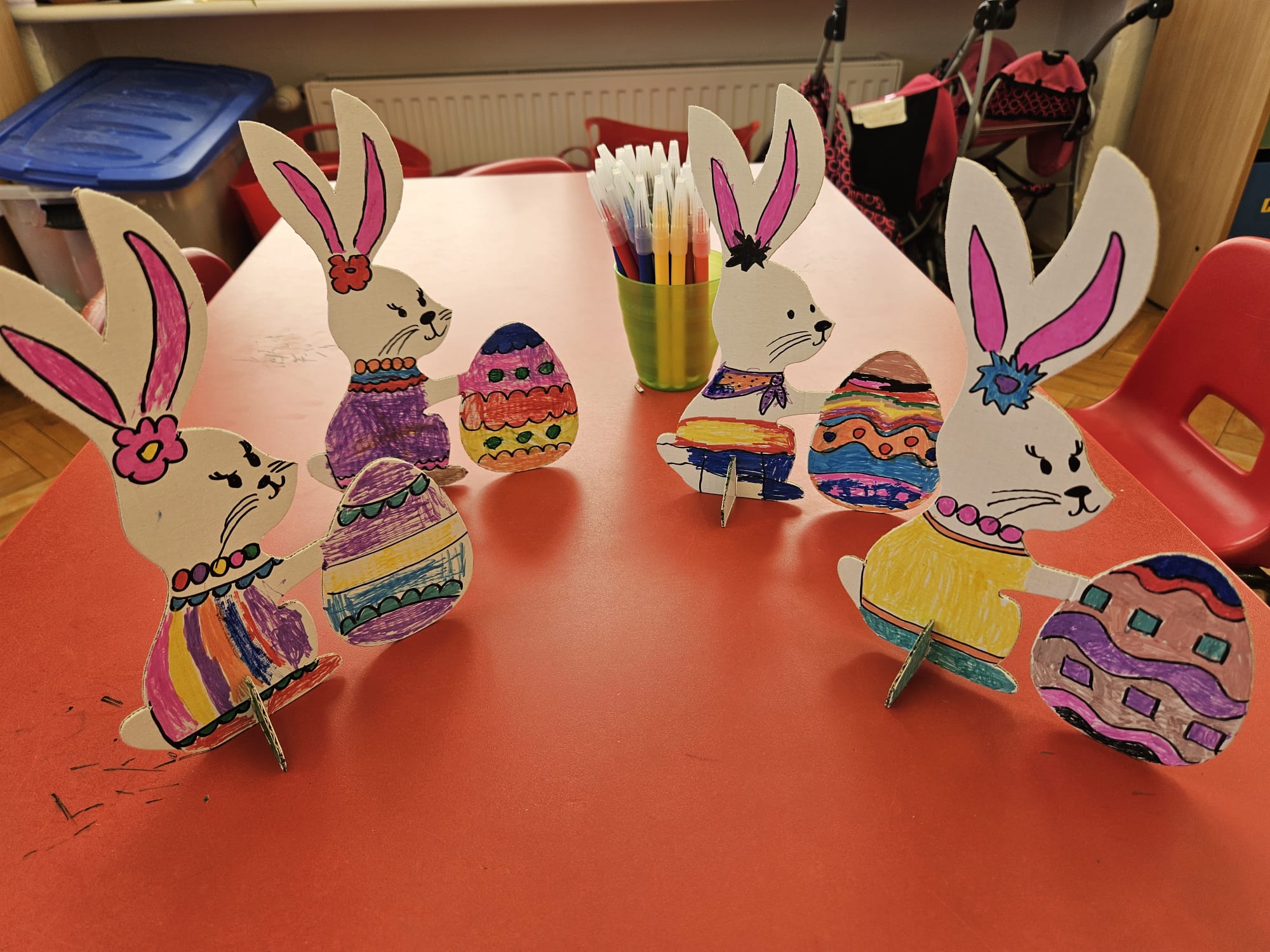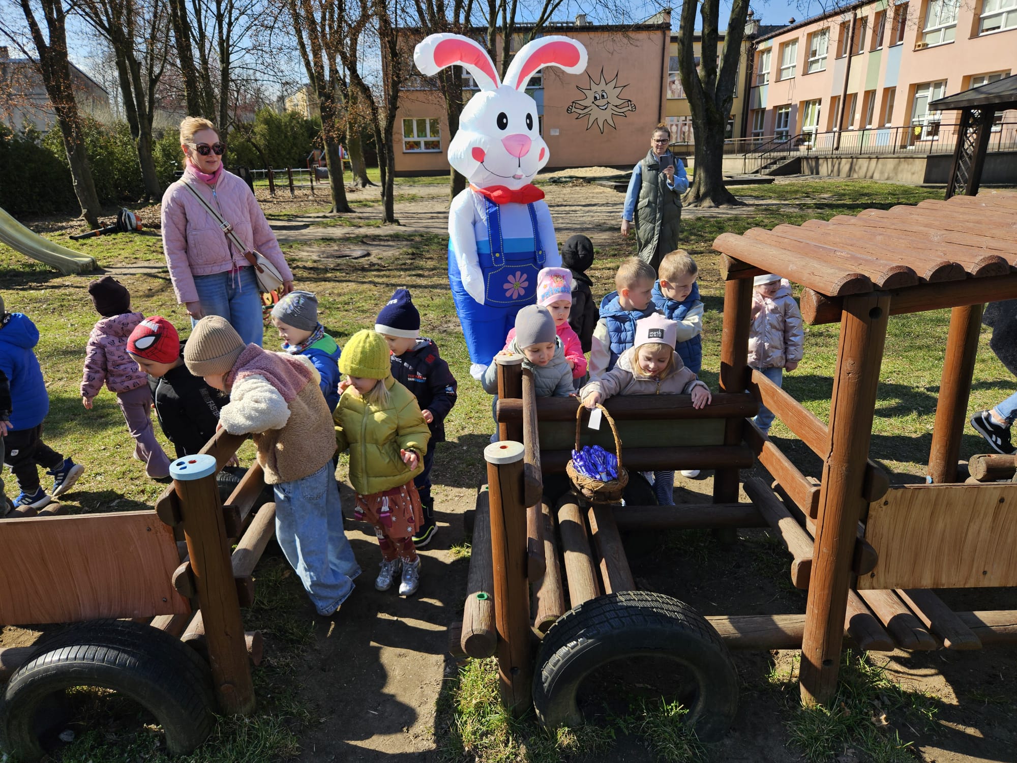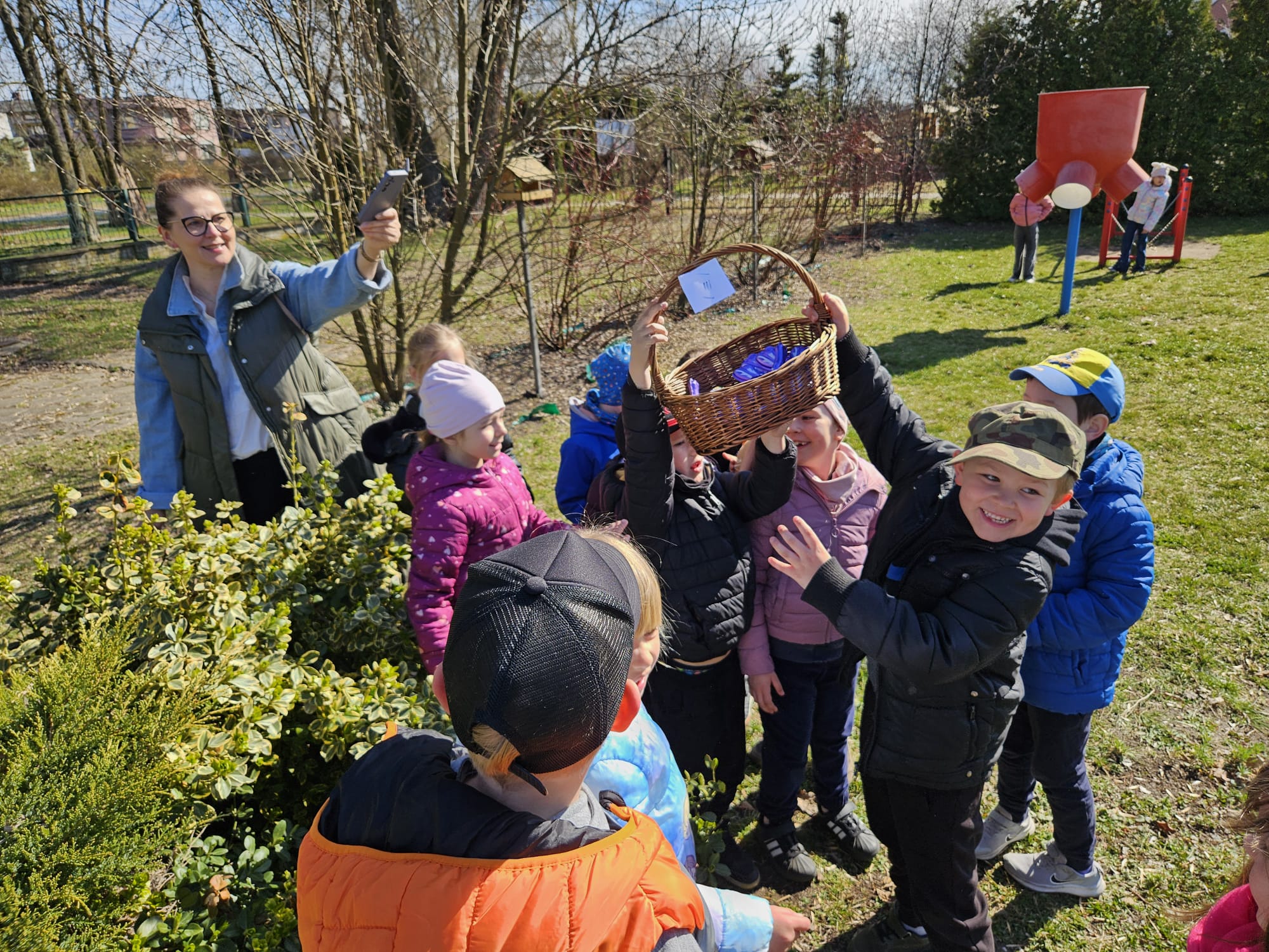 Do przedszkola razem z nami zawitały pluszaki zajączki. Sami próbowaliśmy upodobnić się do zajączków. Do naszych białych i szarych kolorów ubrań dorobiliśmy opaski z uszami i zamiast przedszkolaków biegały zające. Czekaliśmy na naszego Zajączka Wielkanocnego w ogrodzie przedszkolnym. Razem z nim rozwiązywaliśmy zagadki i szukaliśmy ukrytych koszyczków ze słodkościami. Była świetna zabawa. Potem wszyscy rozbiegliśmy się po ogrodzie. W salach kolorowaliśmy zajączki.