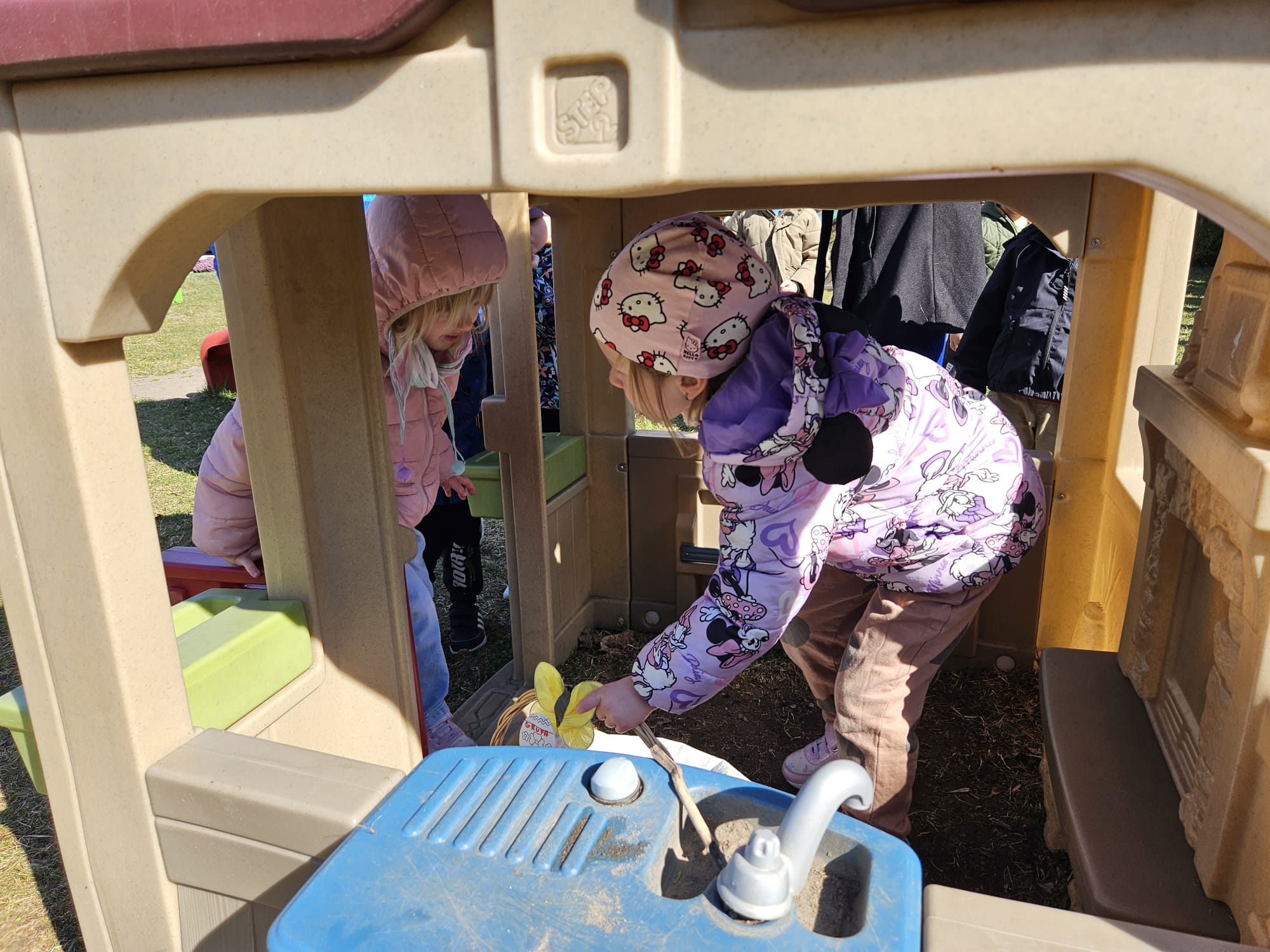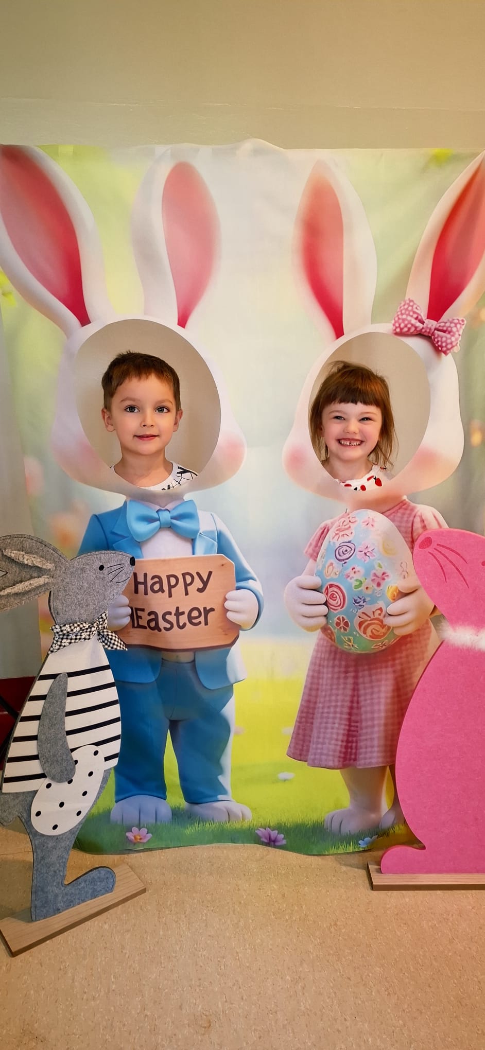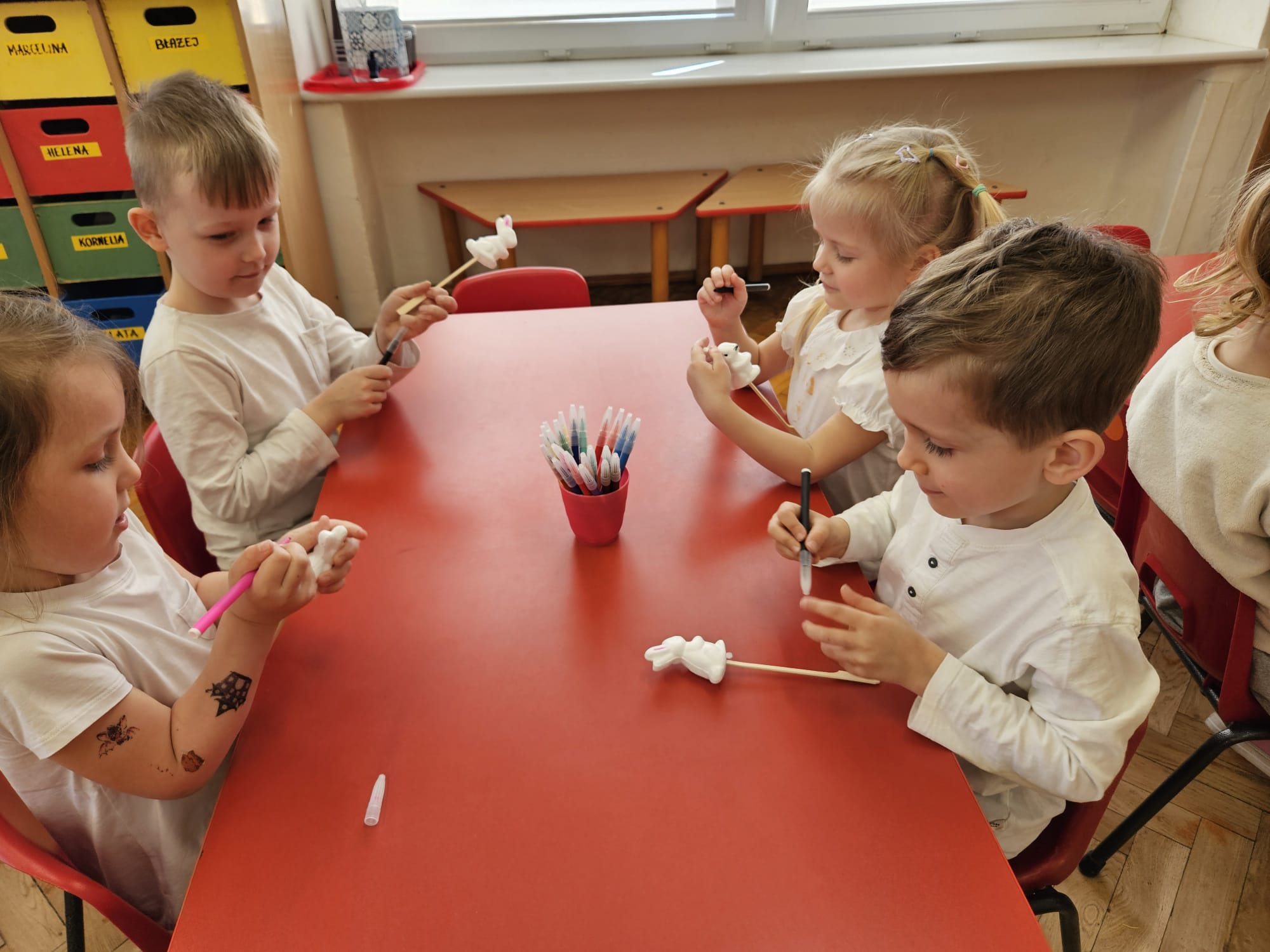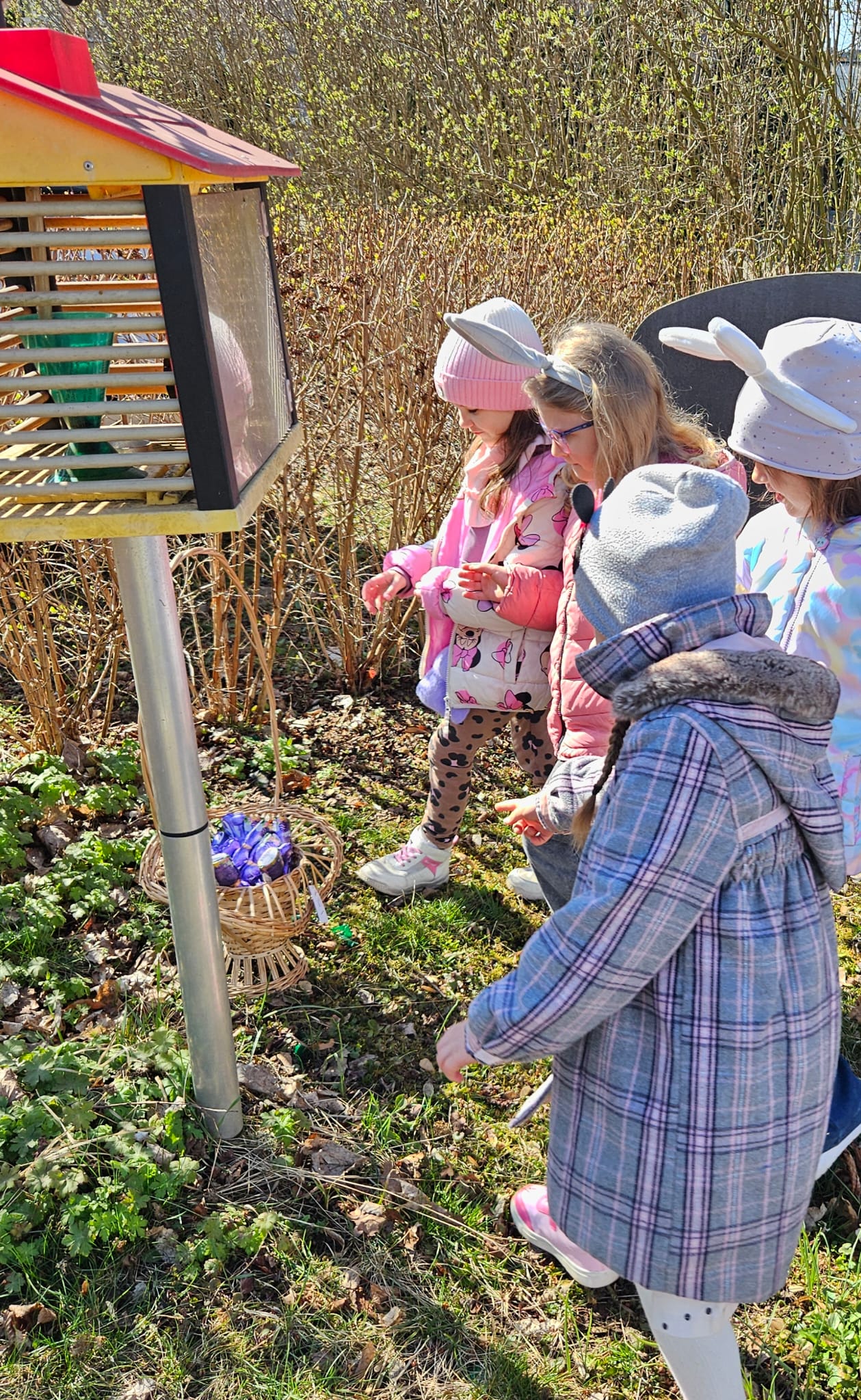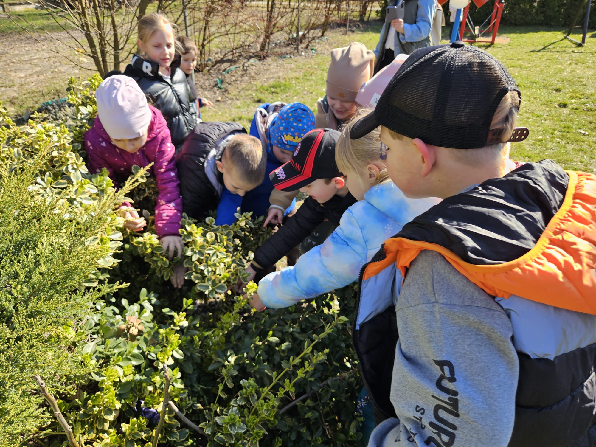 Do przedszkola razem z nami zawitały pluszaki zajączki. Sami próbowaliśmy upodobnić się do zajączków. Do naszych białych i szarych kolorów ubrań dorobiliśmy opaski z uszami i zamiast przedszkolaków biegały zające. Czekaliśmy na naszego Zajączka Wielkanocnego w ogrodzie przedszkolnym. Razem z nim rozwiązywaliśmy zagadki i szukaliśmy ukrytych koszyczków ze słodkościami. Była świetna zabawa. Potem wszyscy rozbiegliśmy się po ogrodzie. W salach kolorowaliśmy zajączki.