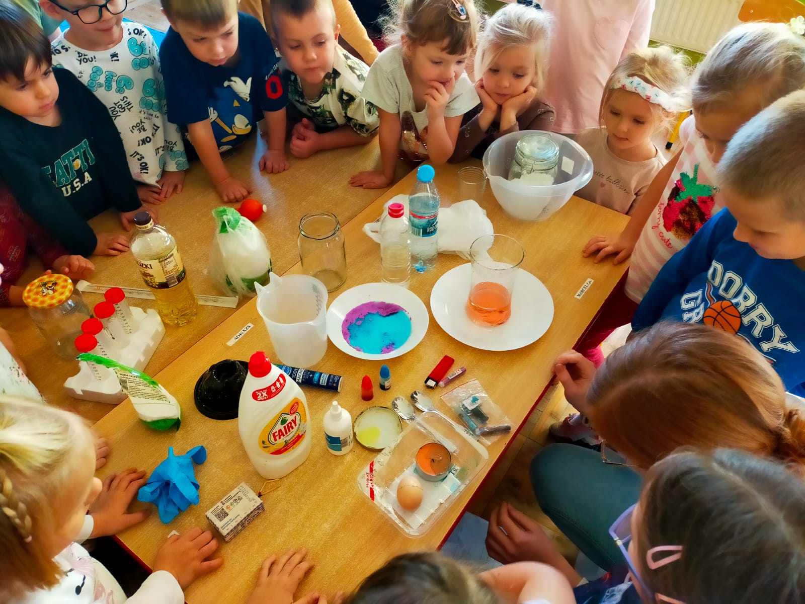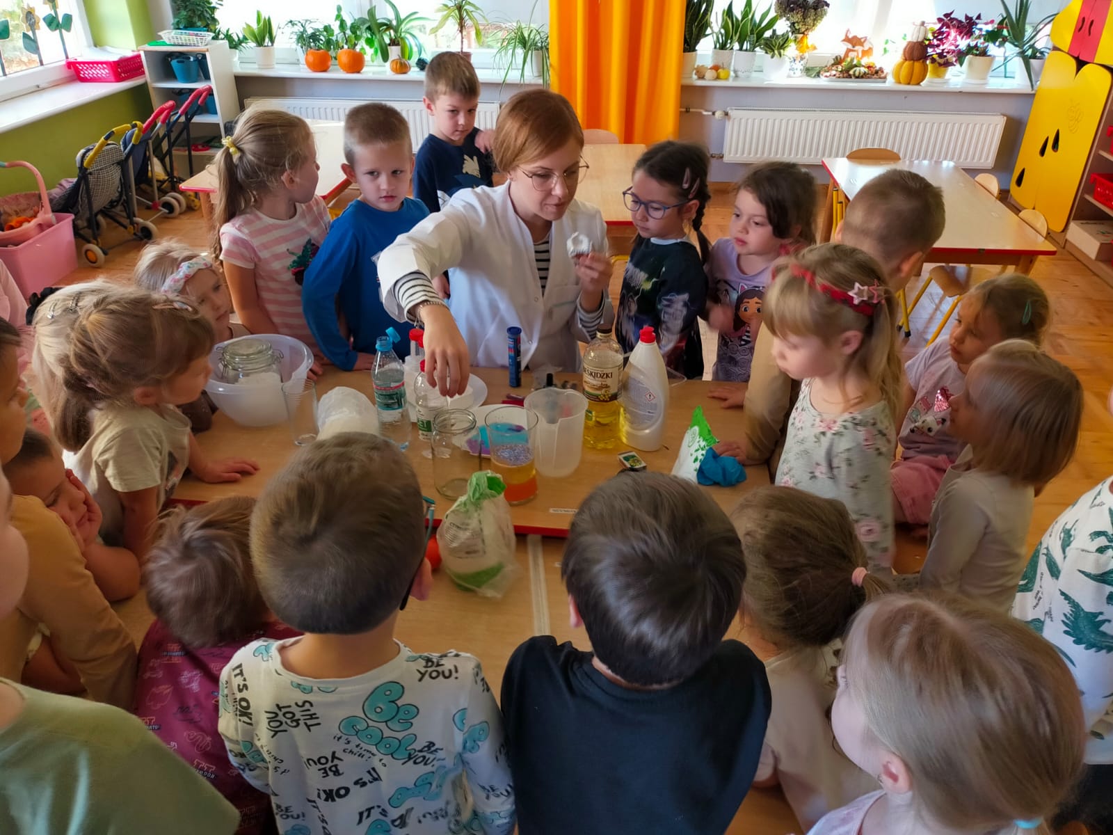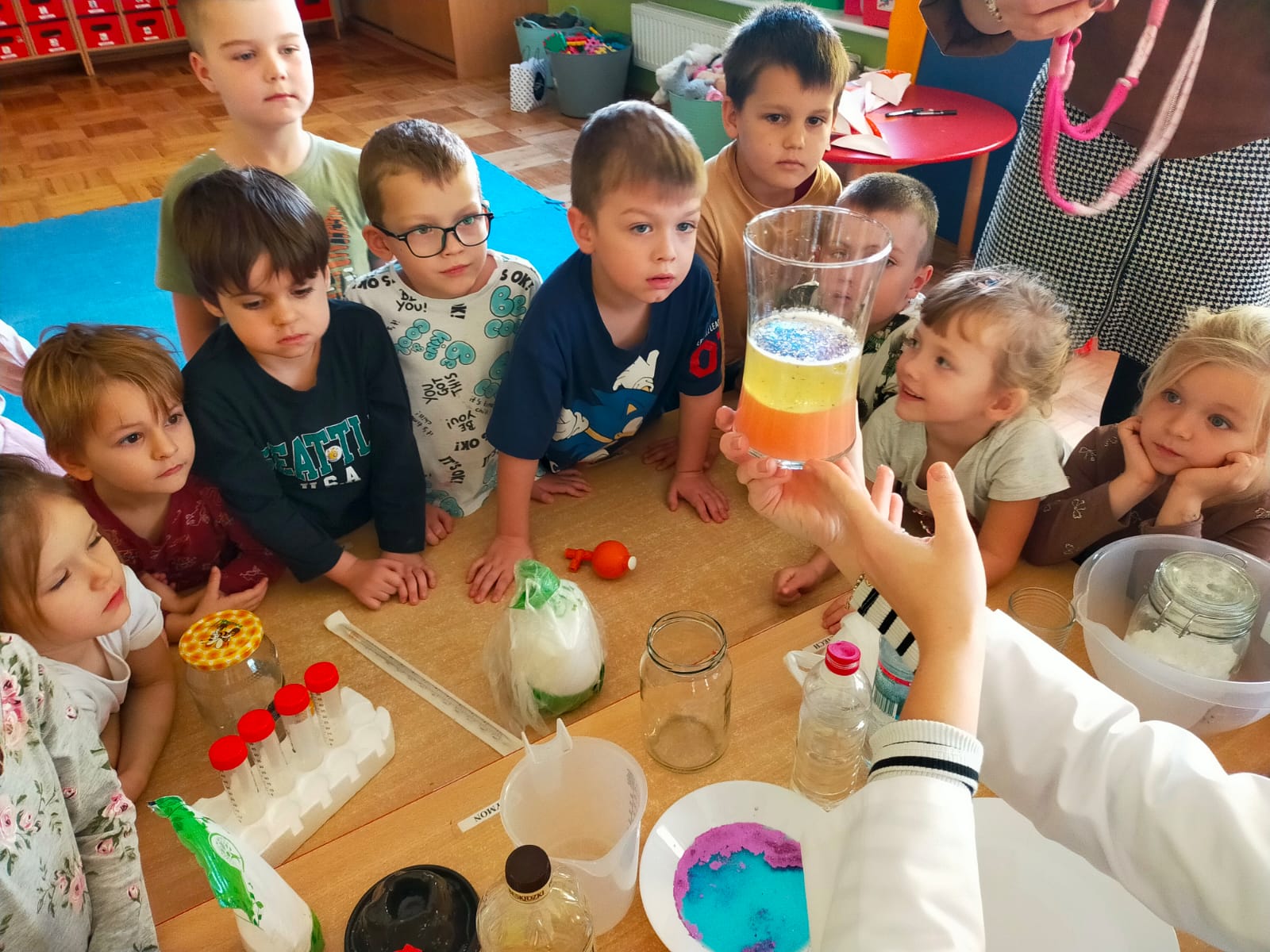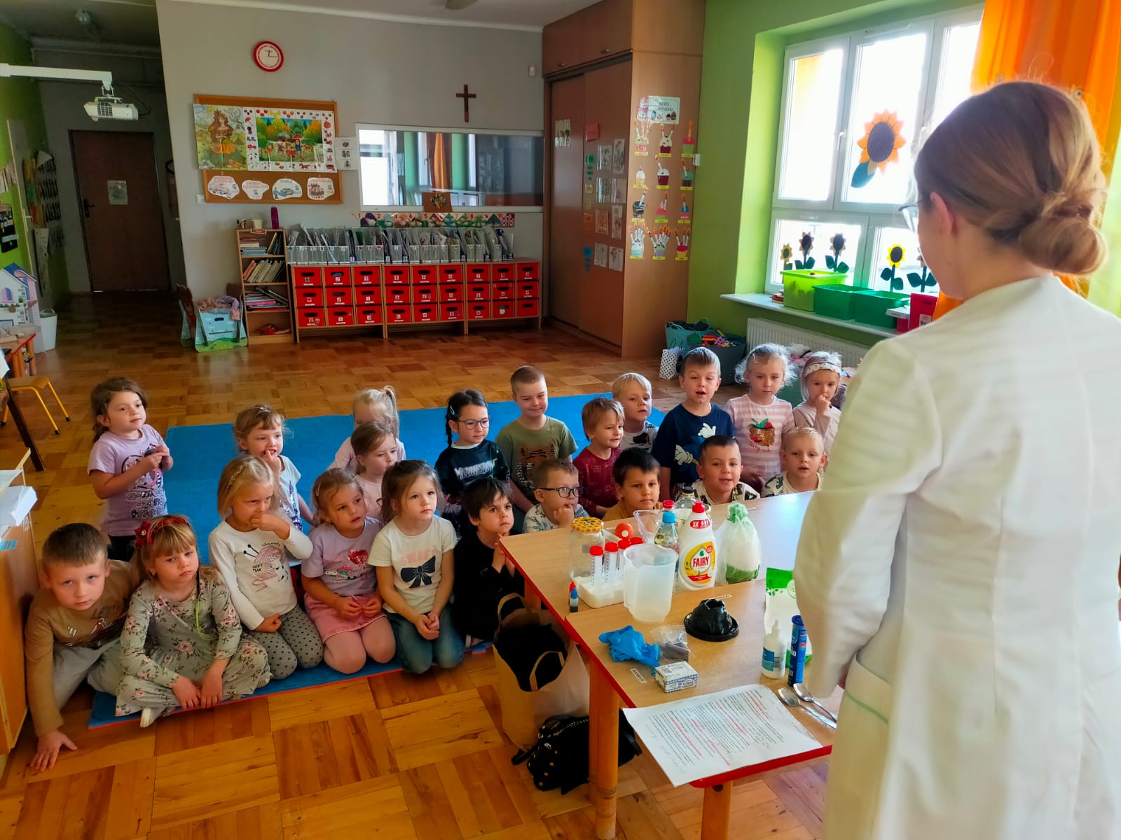 Odwiedziła nas mama Kacpra i opowiedziała o swojej pracy laborantki. Przeprowadziął znami ciekawe doświadczenia. Najbardziej podobało nam się doświadczenie z wulkanem i jajkiem. Były też inne jak choćby jajko w paście, bańki czy tańczące krople. Każdy chciał pomagać przy doświadczeniach.