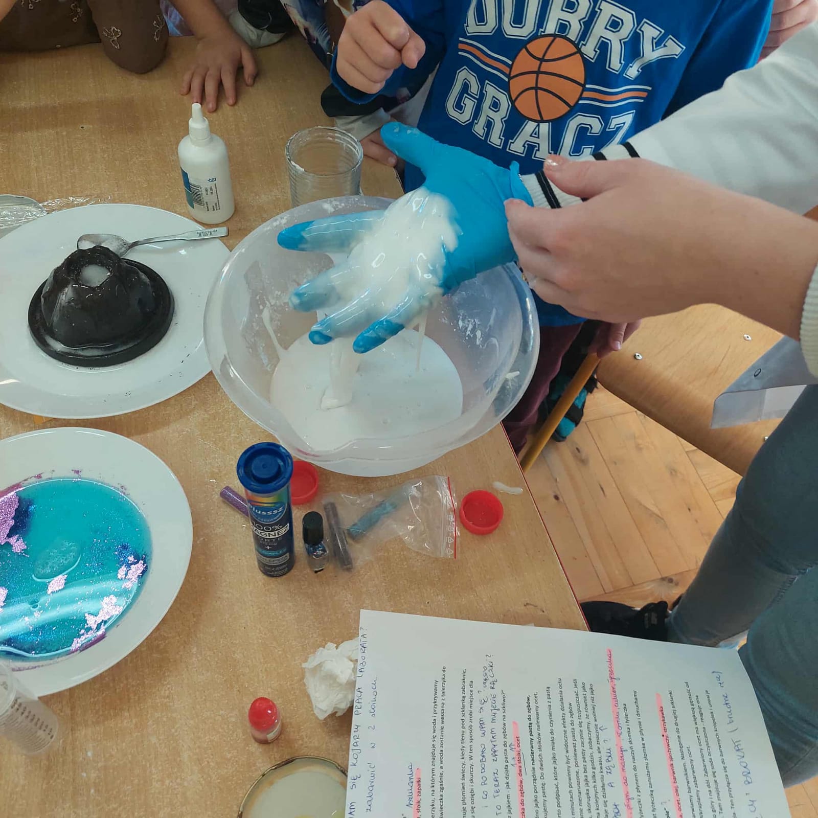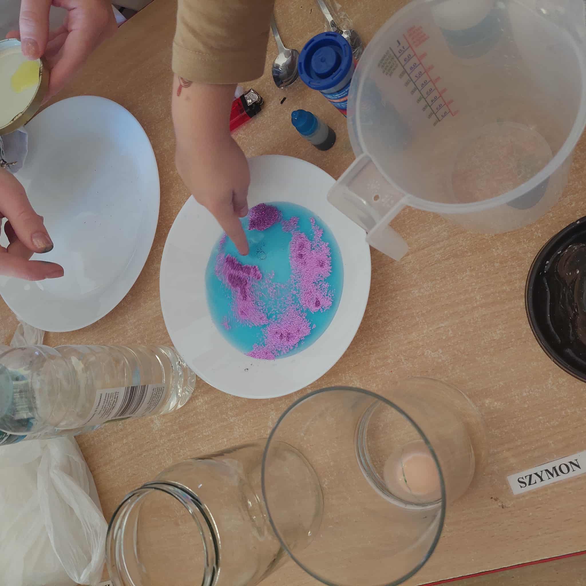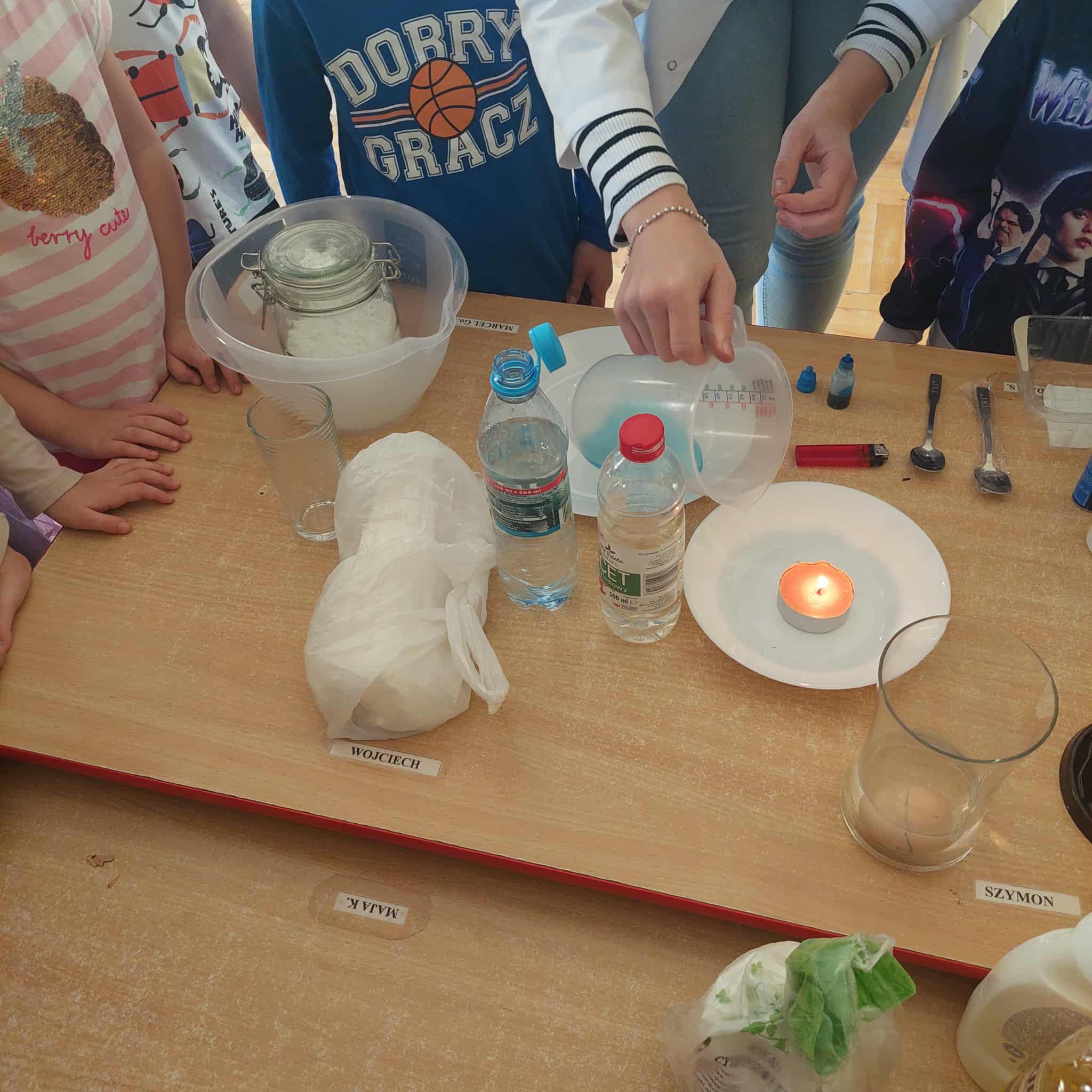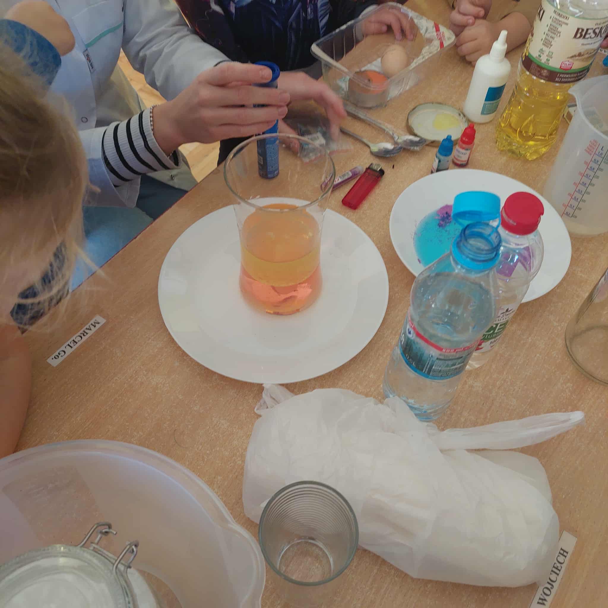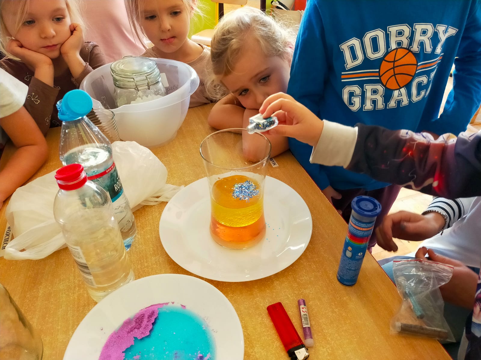 Odwiedziła nas mama Kacpra i opowiedziała o swojej pracy laborantki. Przeprowadziął znami ciekawe doświadczenia. Najbardziej podobało nam się doświadczenie z wulkanem i jajkiem. Były też inne jak choćby jajko w paście, bańki czy tańczące krople. Każdy chciał pomagać przy doświadczeniach.