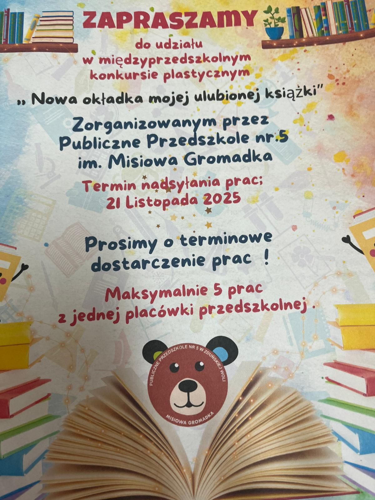 Przyłączyliśmy się do Międzyprzedszkolnego Konkursu Plastycznego - "Nowa okładka mojej ulubionej książki" zorganizowanym przez Publiczne Przedszkole Nr 5 im. Misiowa Gromadka. Zaraszamy do ich obejrzenia.