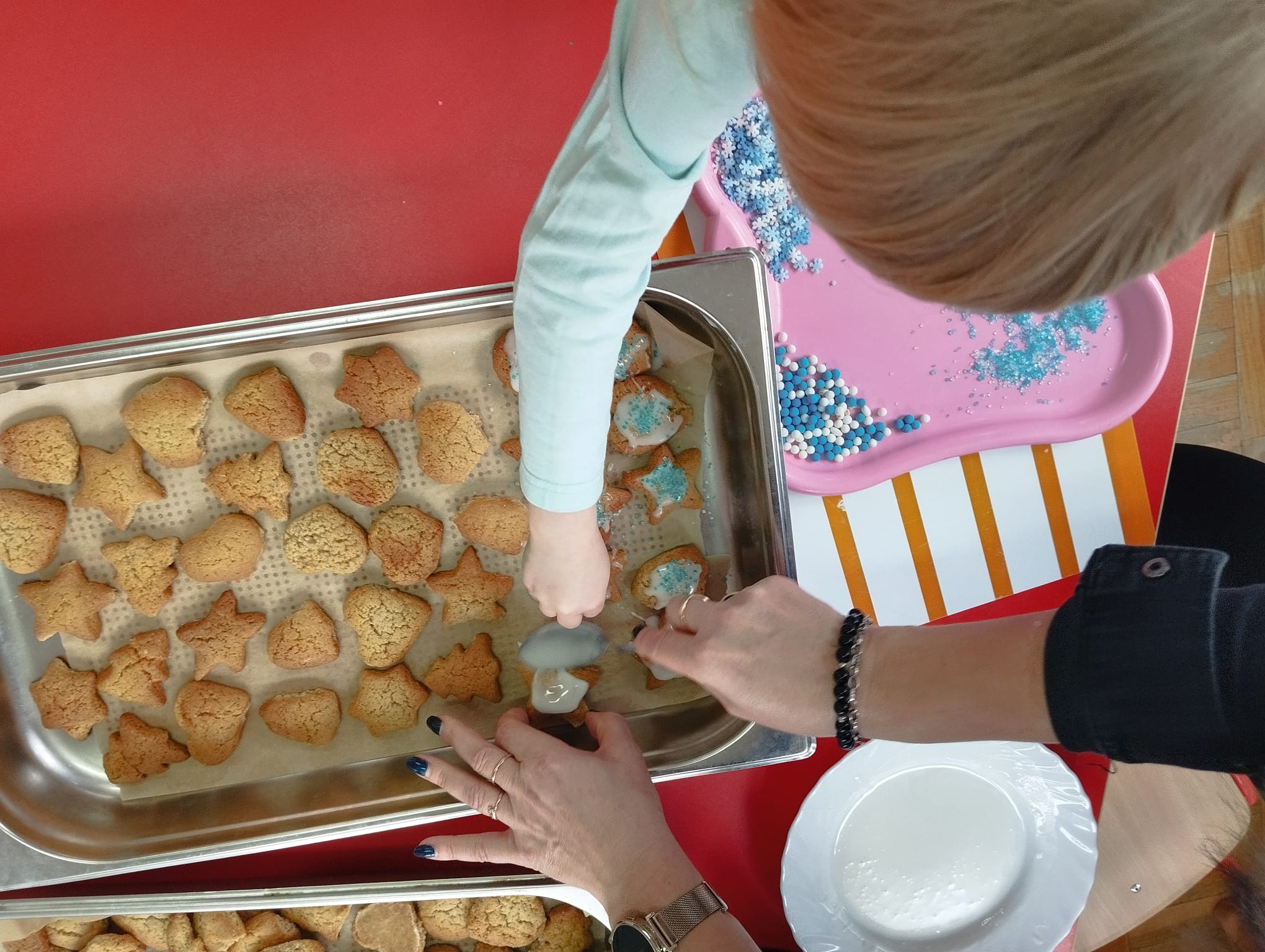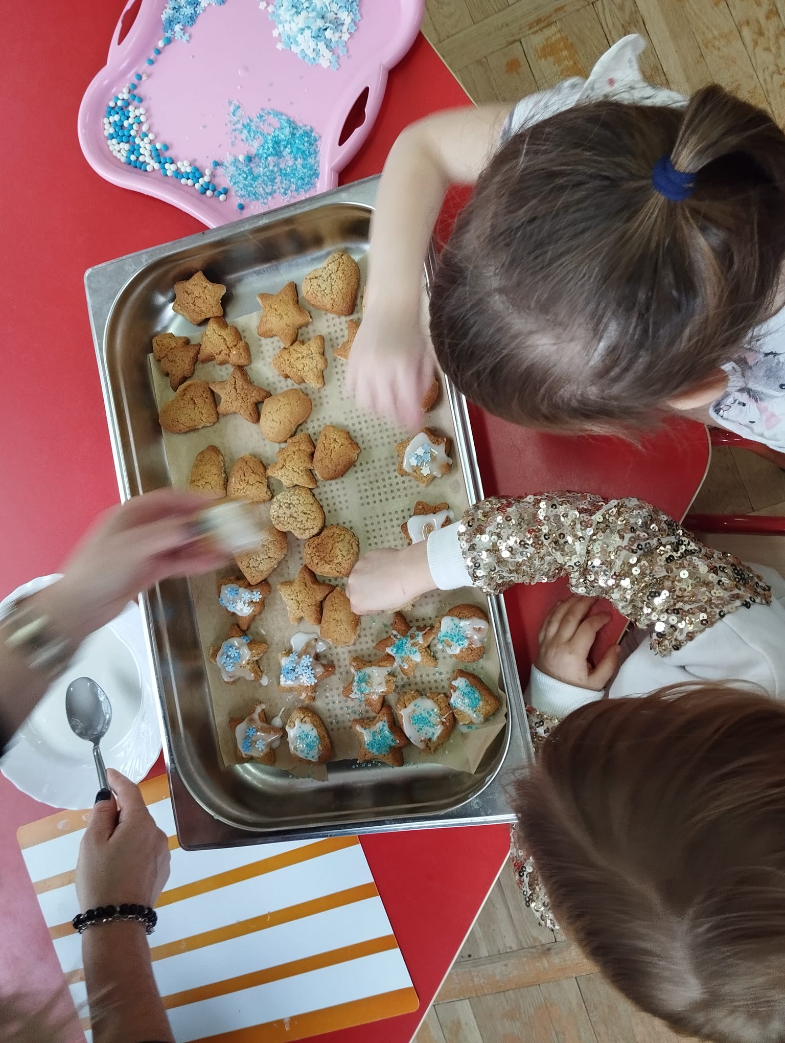 Święta za pasem. Poznajemy różne świąteczne zwyczaje. Ten słodki spodobał nam się bardzo. Postanowiliśmy z pomocą naszych nauczycielek przygotować świąteczne wypieki - pierniczki. Nasze panie pomogły nam przygotować ciasto. My wycinaliśmy kształty za pomocą foremek a kiedy pierniczki się upiekły w przedszkolnej kuchni nadszedł czas na ich ozdobienie.