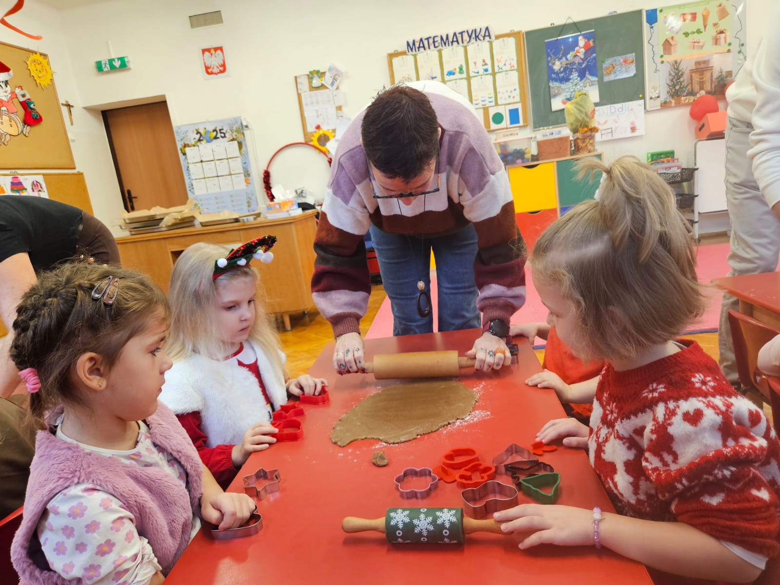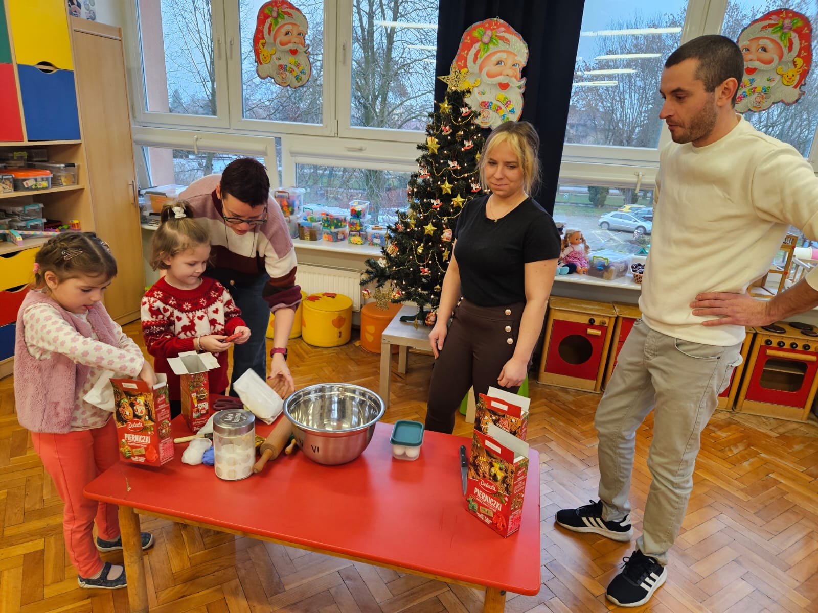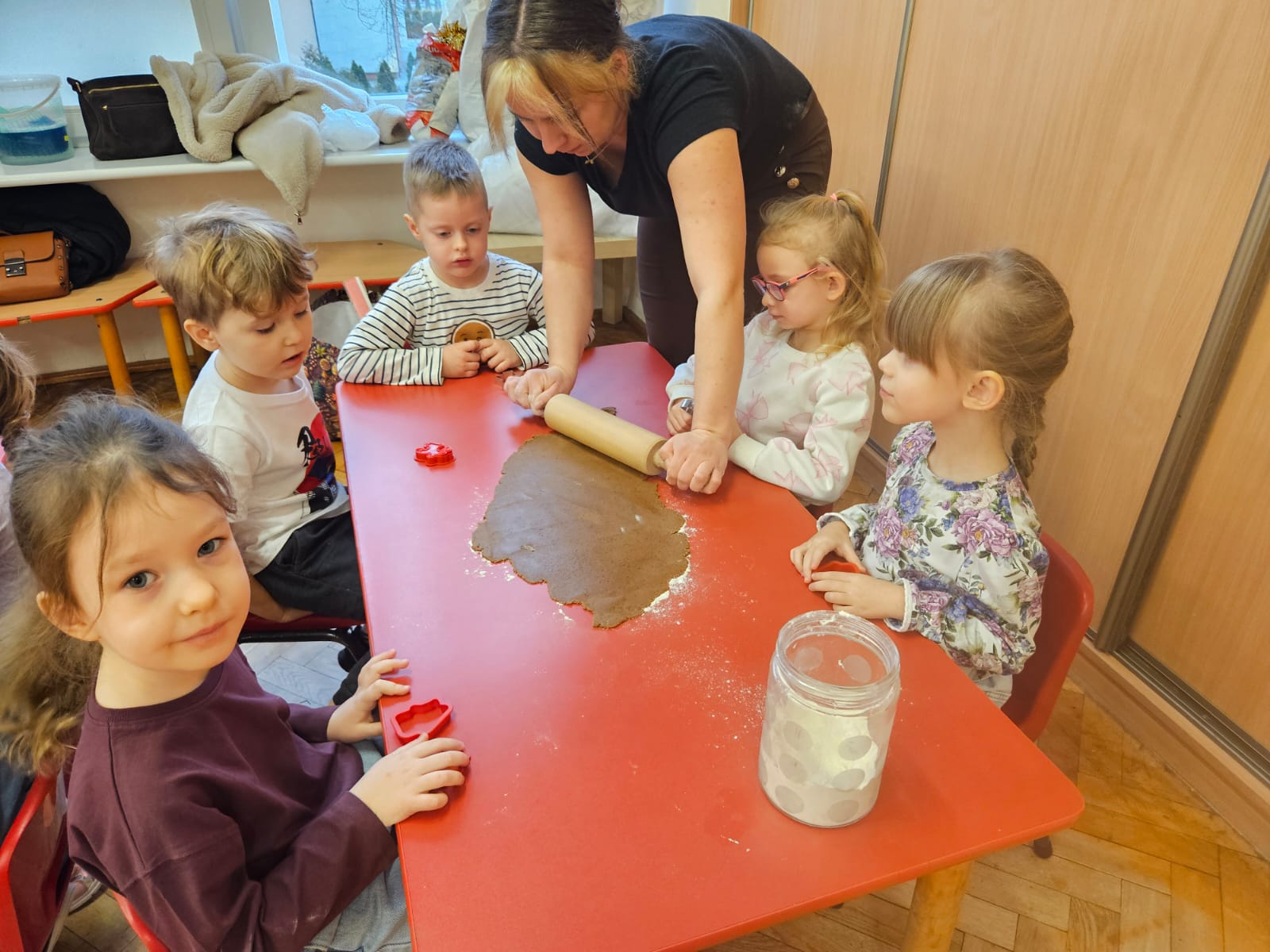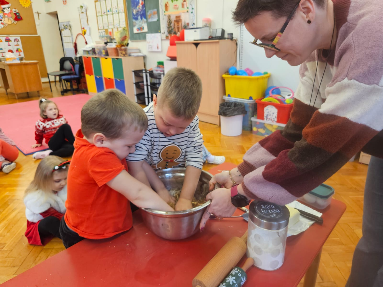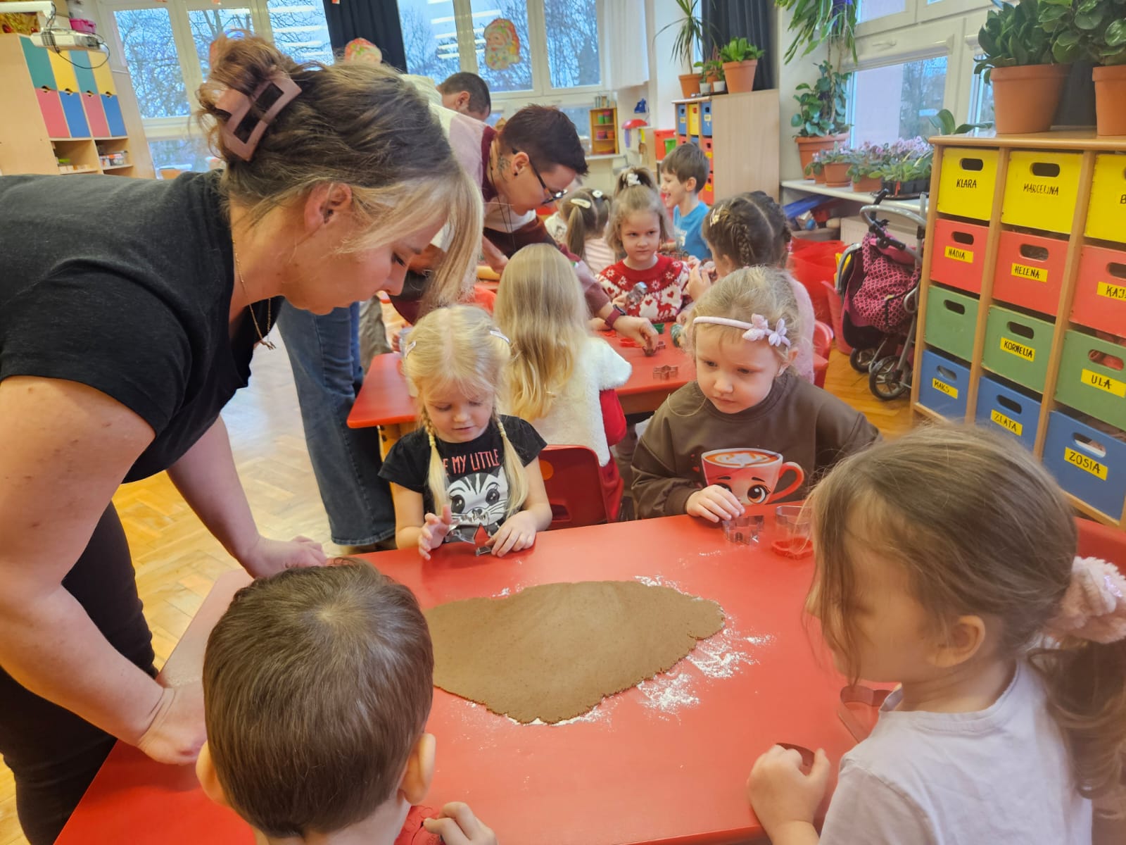 Nasi rodzice przybyli z pomocą. Tym razem wspólnie przygotowaliśmy ciasto na pierniczki. Sypaliśmy mąkę i cukier. Wkładaliśmy masło. Wbijaliśmy jajka. Następnie tata naszej koleżanki, który miał najwięcej siły zagniótł ciasto. Potem było wałkowanie i foremki poszły w ruch. To już tylko nasza zasługa. Całkiem dobrze nam szło. Uzbierało się aż cześć blach, które oddaliśmy w ręce naszych przedszkolnych kucharek i piecyka. Następnego dnia ozdabialiśmy pierniczki jak najładniej potrafiliśmy. Wręczymy je naszym rodzicom po uroczystości choinkowej. Dziękujemy naszym rodzicom za pomoc!
