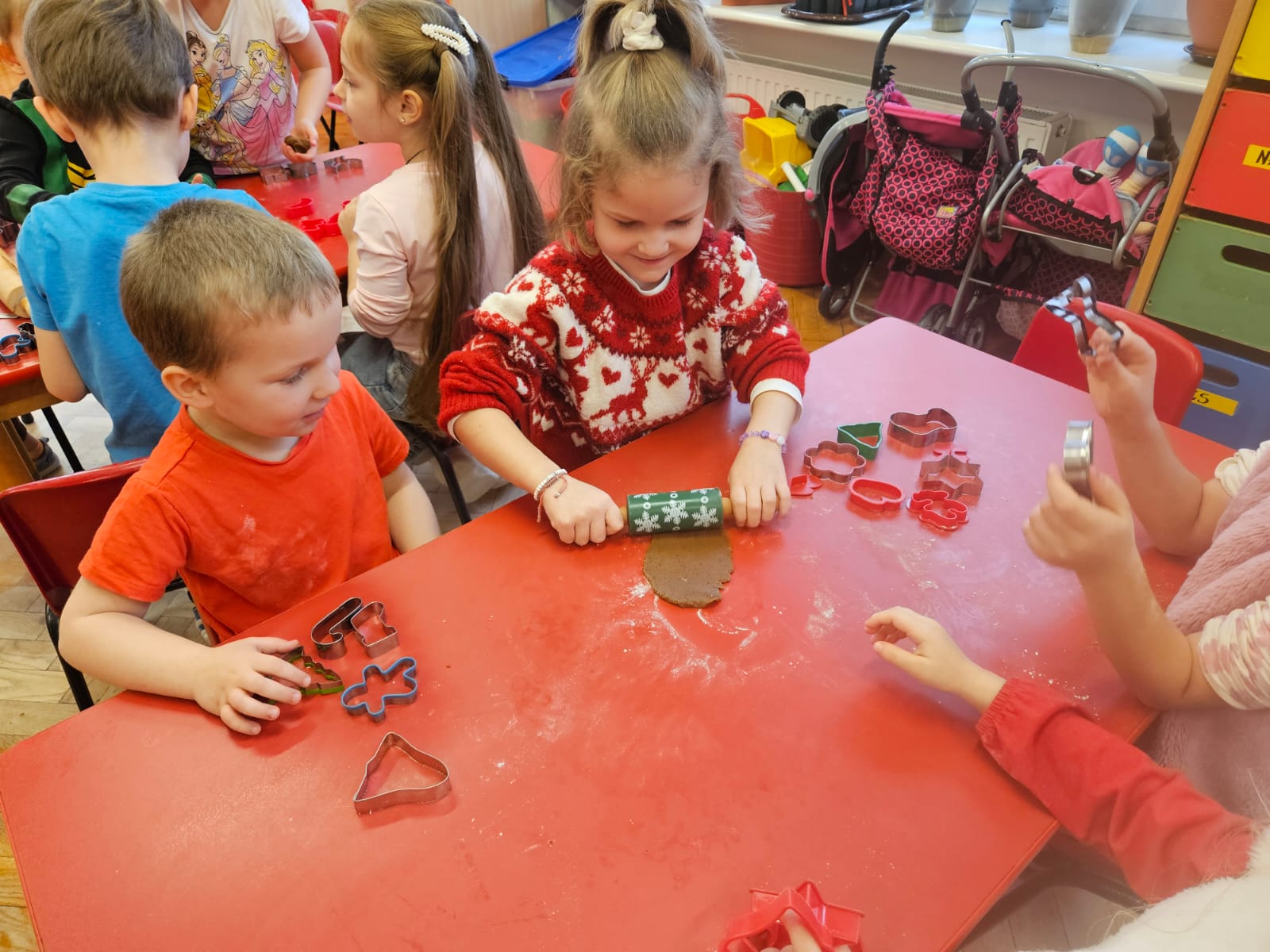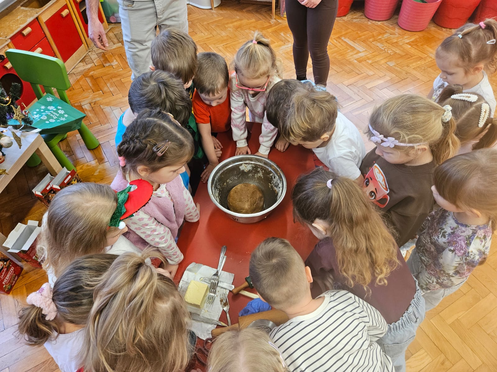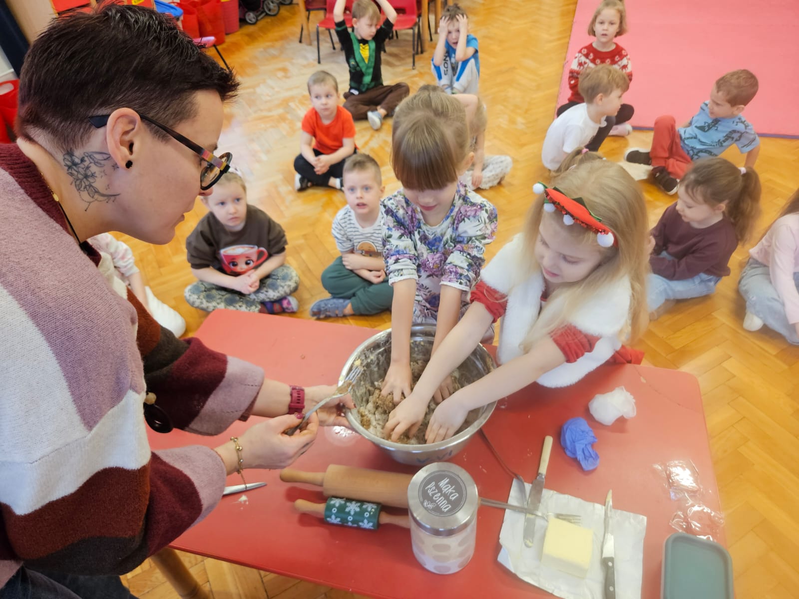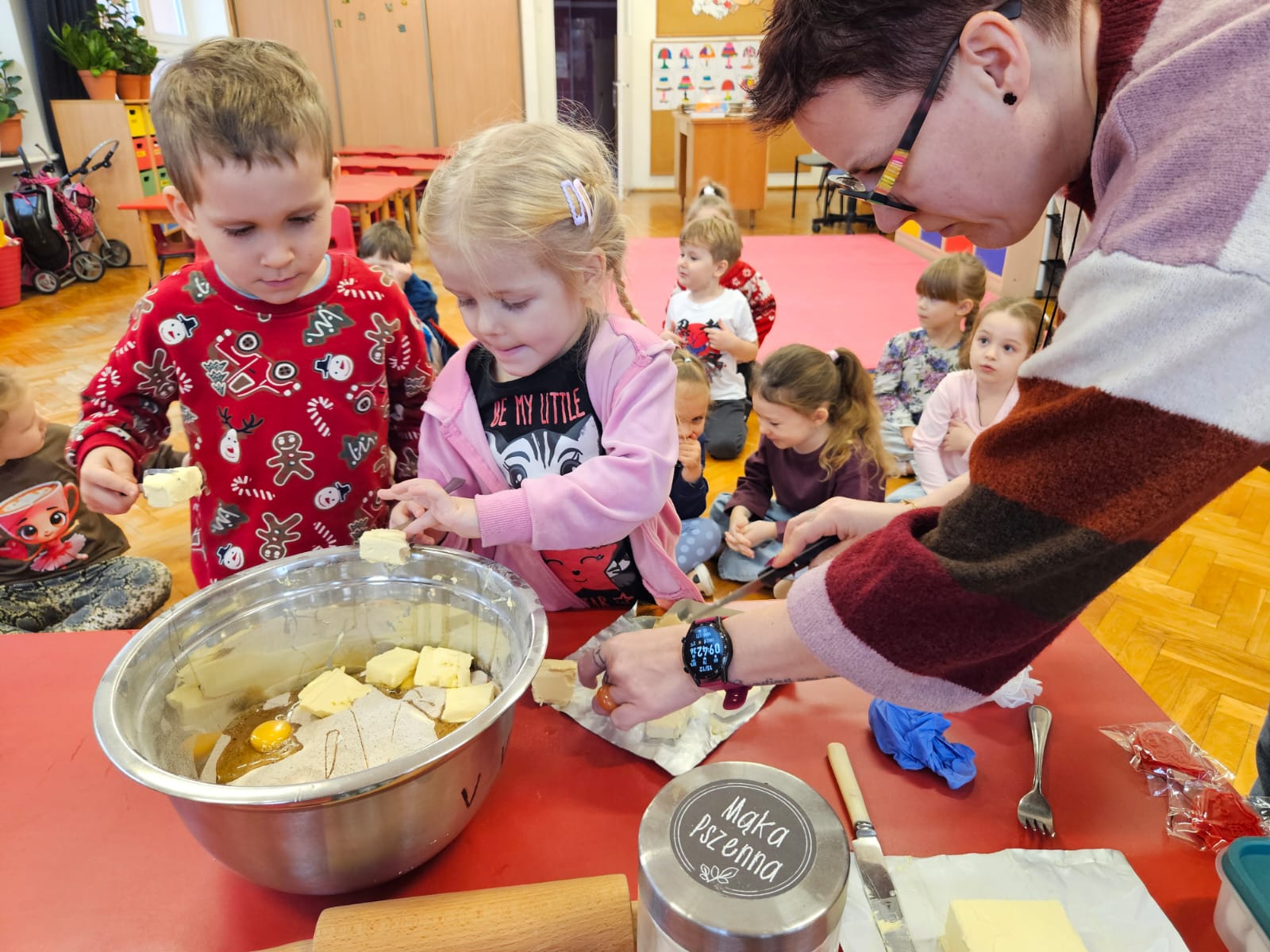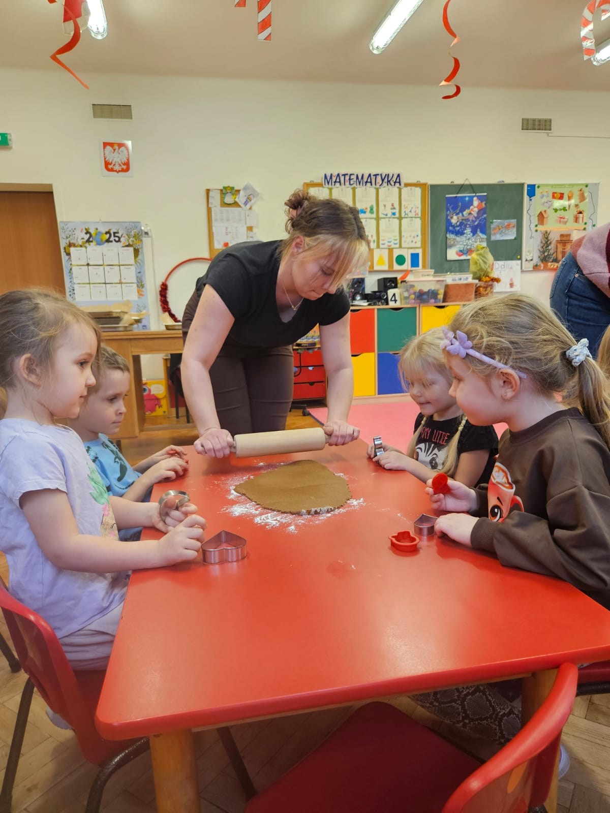 Nasi rodzice przybyli z pomocą. Tym razem wspólnie przygotowaliśmy ciasto na pierniczki. Sypaliśmy mąkę i cukier. Wkładaliśmy masło. Wbijaliśmy jajka. Następnie tata naszej koleżanki, który miał najwięcej siły zagniótł ciasto. Potem było wałkowanie i foremki poszły w ruch. To już tylko nasza zasługa. Całkiem dobrze nam szło. Uzbierało się aż cześć blach, które oddaliśmy w ręce naszych przedszkolnych kucharek i piecyka. Następnego dnia ozdabialiśmy pierniczki jak najładniej potrafiliśmy. Wręczymy je naszym rodzicom po uroczystości choinkowej. Dziękujemy naszym rodzicom za pomoc!