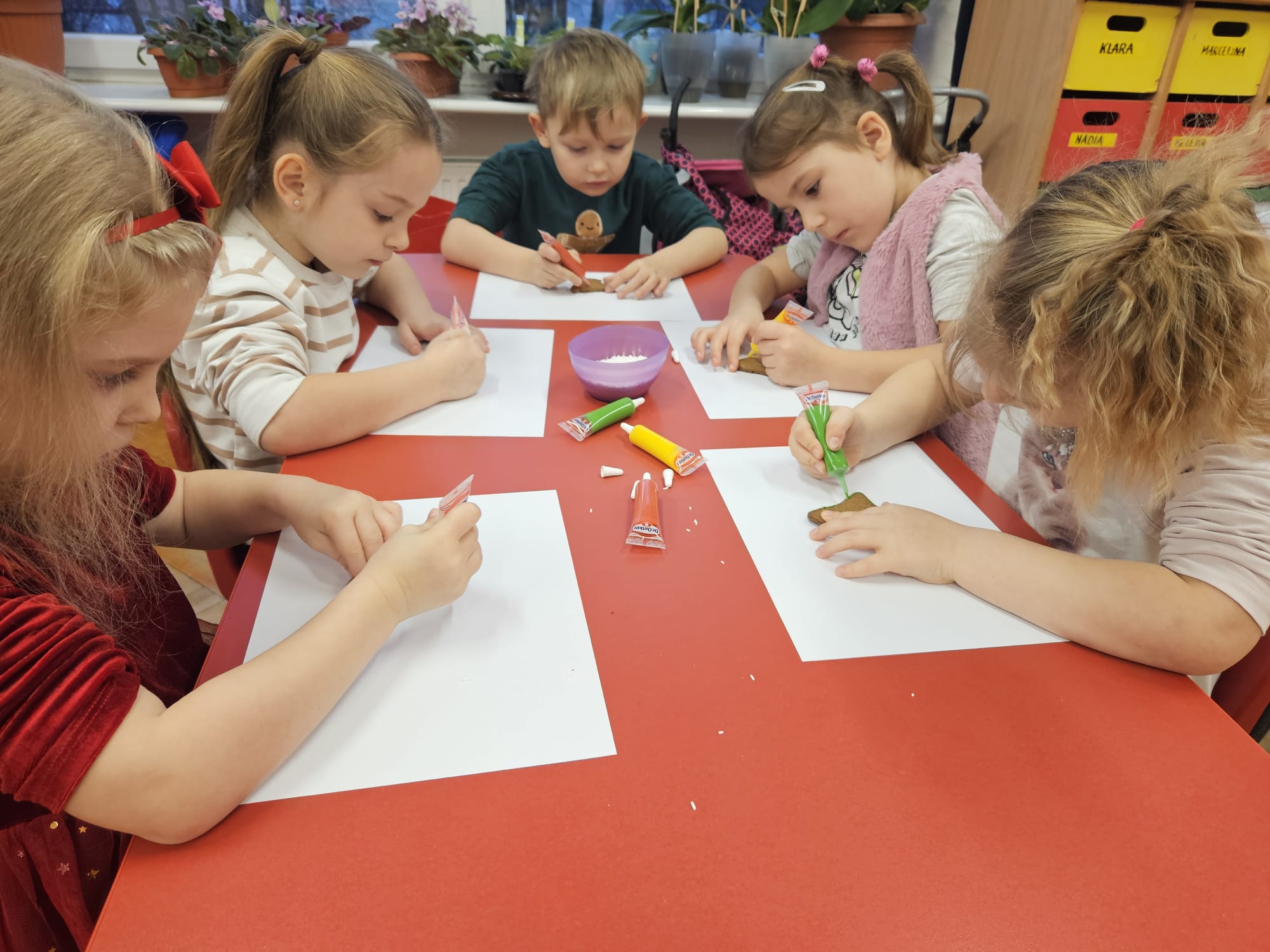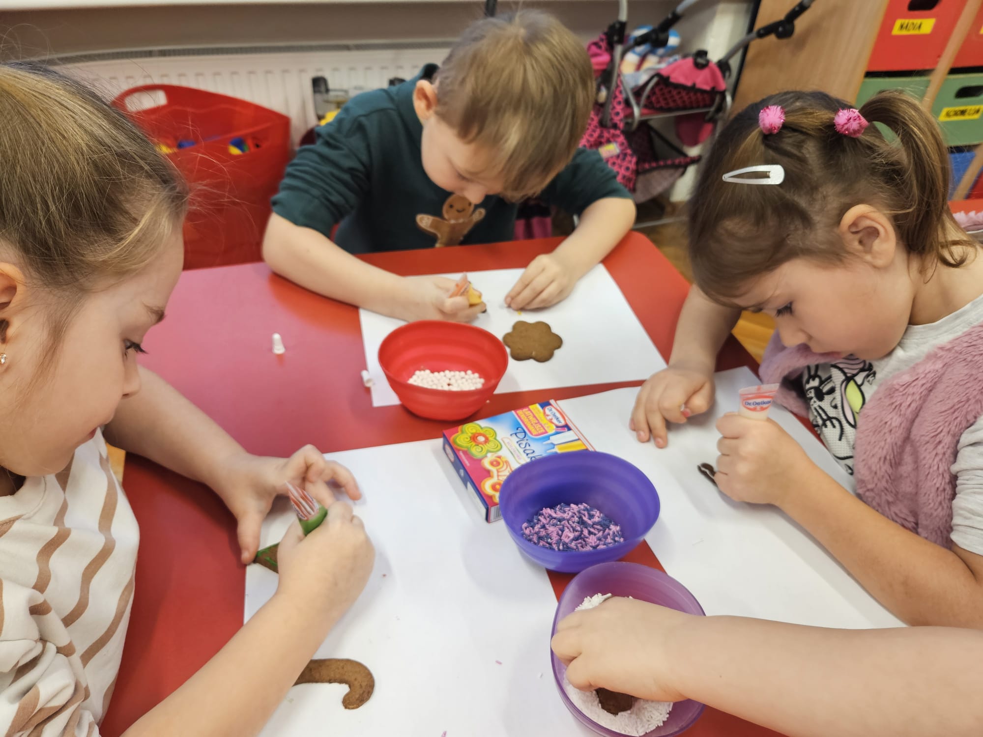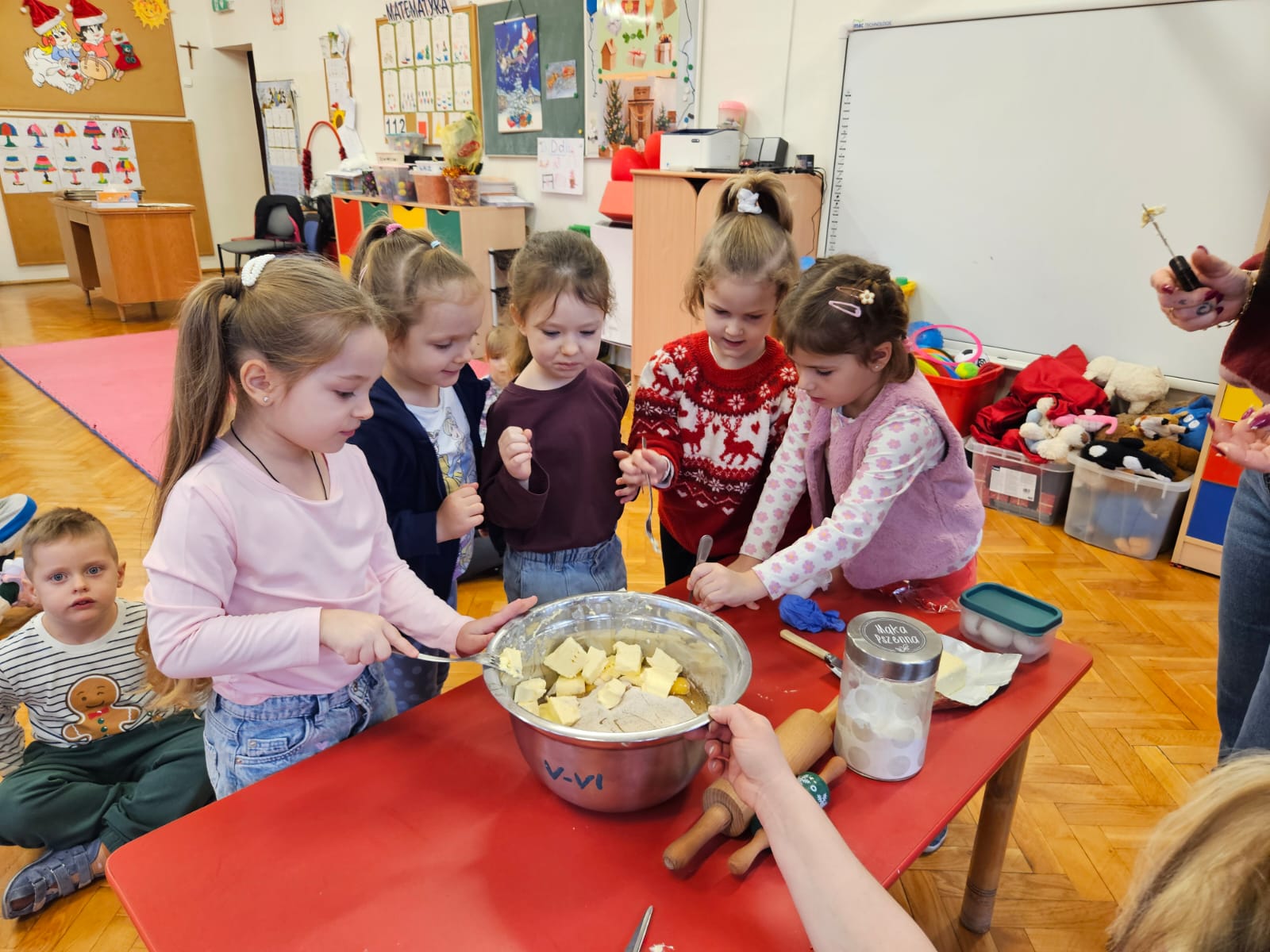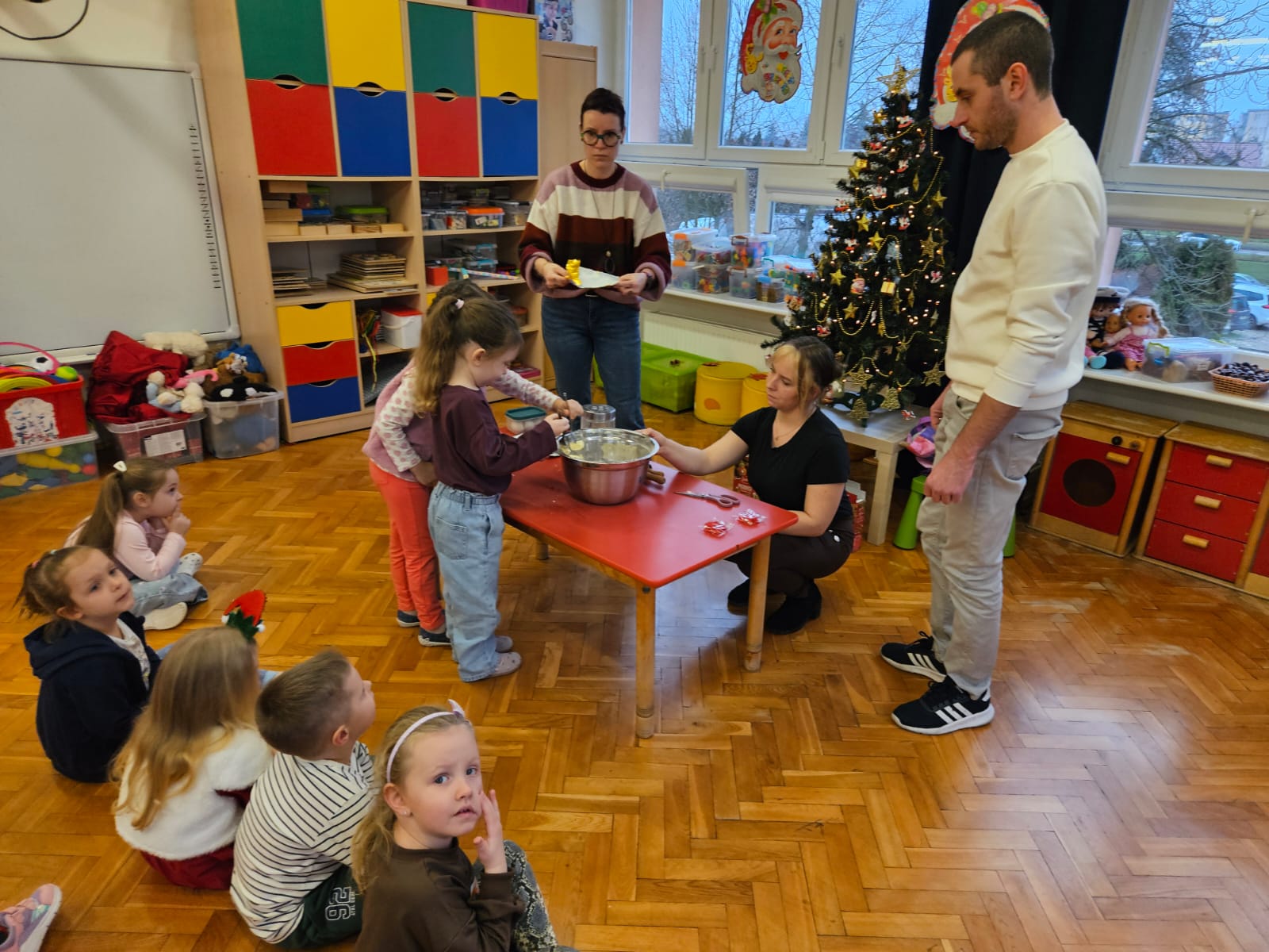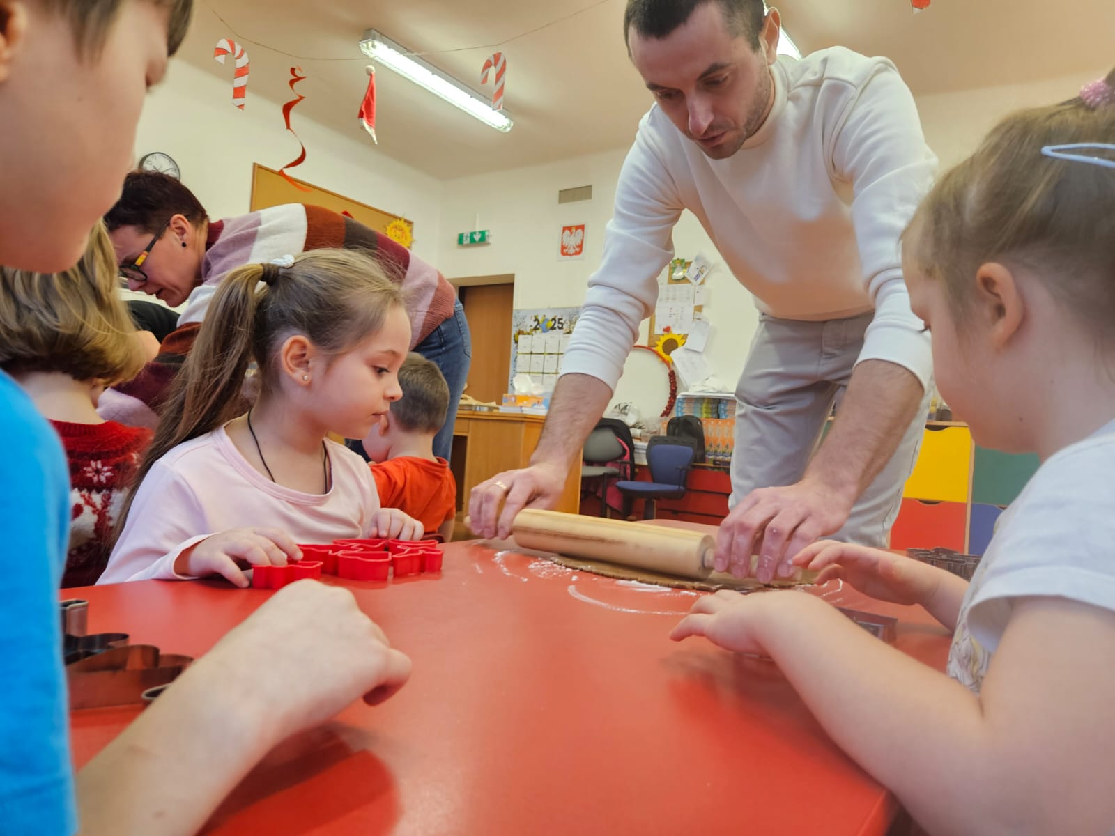 Nasi rodzice przybyli z pomocą. Tym razem wspólnie przygotowaliśmy ciasto na pierniczki. Sypaliśmy mąkę i cukier. Wkładaliśmy masło. Wbijaliśmy jajka. Następnie tata naszej koleżanki, który miał najwięcej siły zagniótł ciasto. Potem było wałkowanie i foremki poszły w ruch. To już tylko nasza zasługa. Całkiem dobrze nam szło. Uzbierało się aż cześć blach, które oddaliśmy w ręce naszych przedszkolnych kucharek i piecyka. Następnego dnia ozdabialiśmy pierniczki jak najładniej potrafiliśmy. Wręczymy je naszym rodzicom po uroczystości choinkowej. Dziękujemy naszym rodzicom za pomoc!