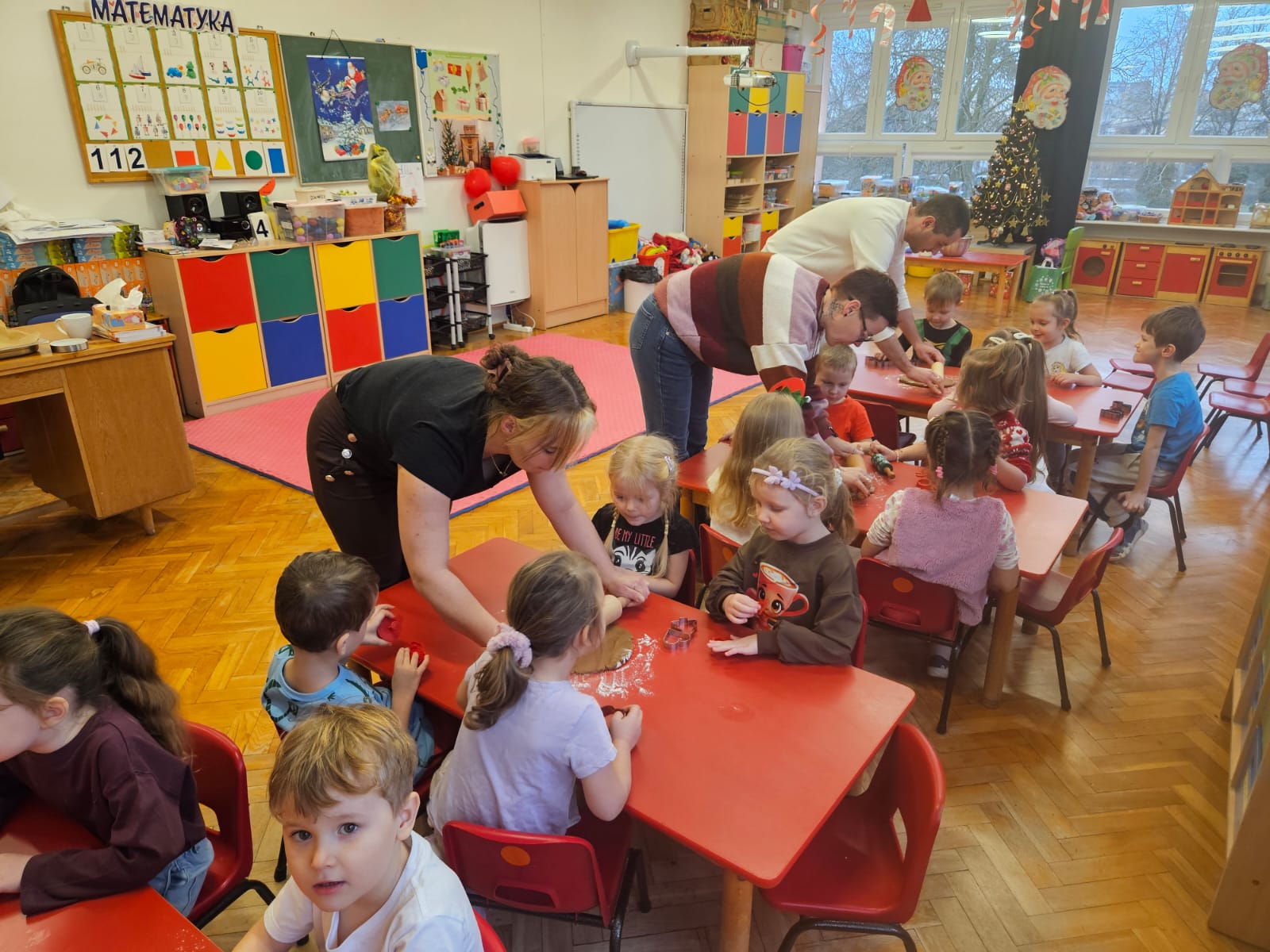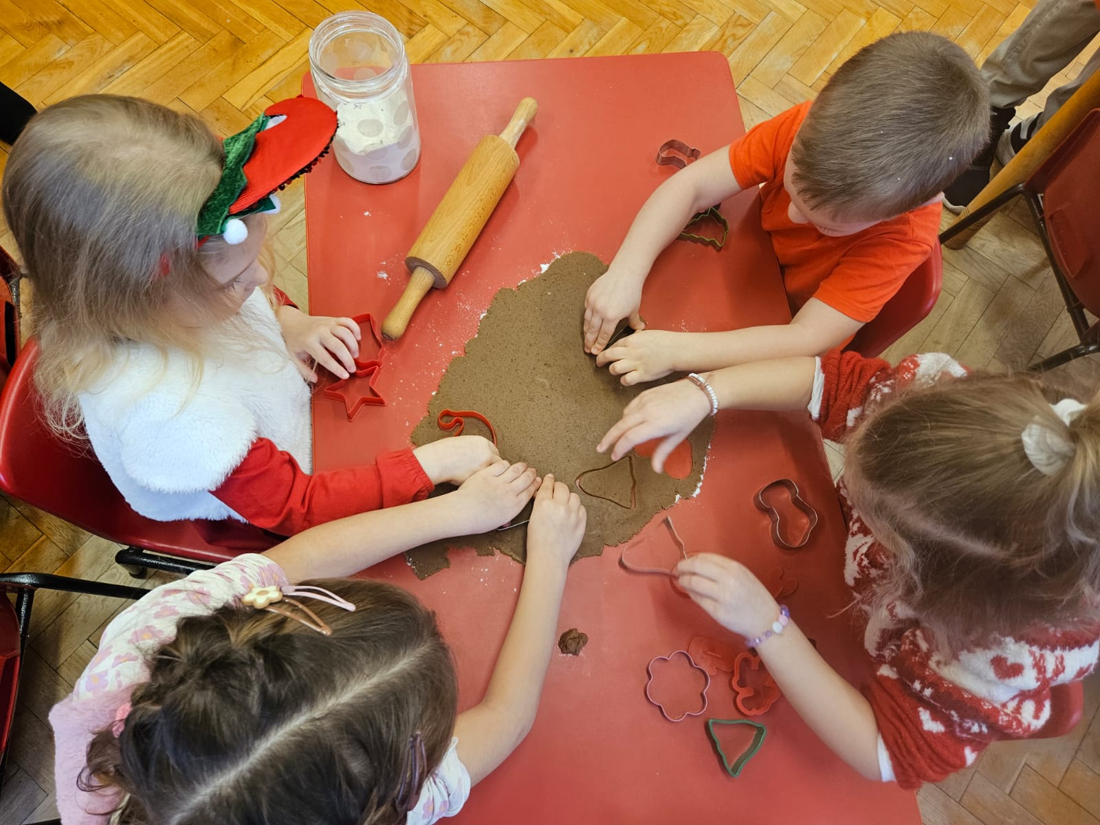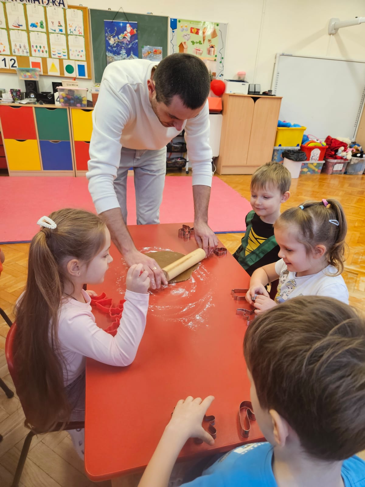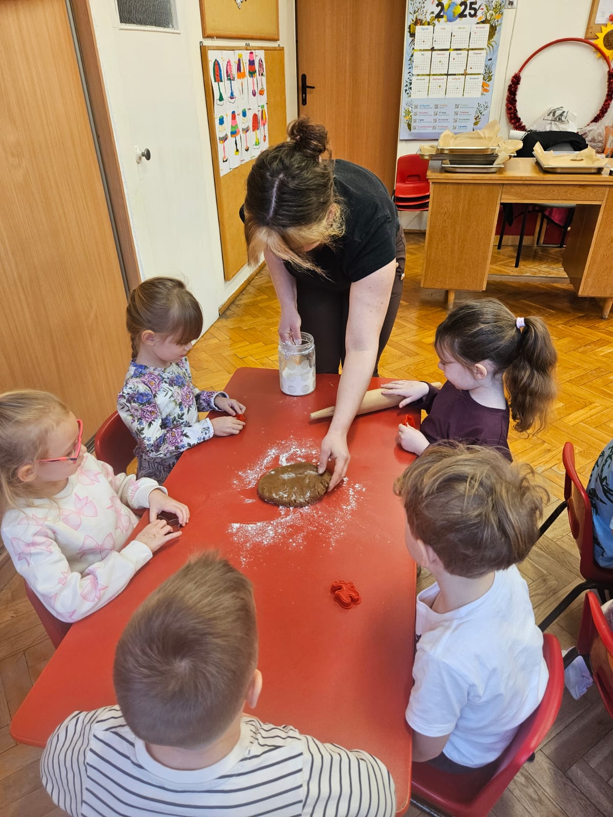 Nasi rodzice przybyli z pomocą. Tym razem wspólnie przygotowaliśmy ciasto na pierniczki. Sypaliśmy mąkę i cukier. Wkładaliśmy masło. Wbijaliśmy jajka. Następnie tata naszej koleżanki, który miał najwięcej siły zagniótł ciasto. Potem było wałkowanie i foremki poszły w ruch. To już tylko nasza zasługa. Całkiem dobrze nam szło. Uzbierało się aż cześć blach, które oddaliśmy w ręce naszych przedszkolnych kucharek i piecyka. Następnego dnia ozdabialiśmy pierniczki jak najładniej potrafiliśmy. Wręczymy je naszym rodzicom po uroczystości choinkowej. Dziękujemy naszym rodzicom za pomoc!