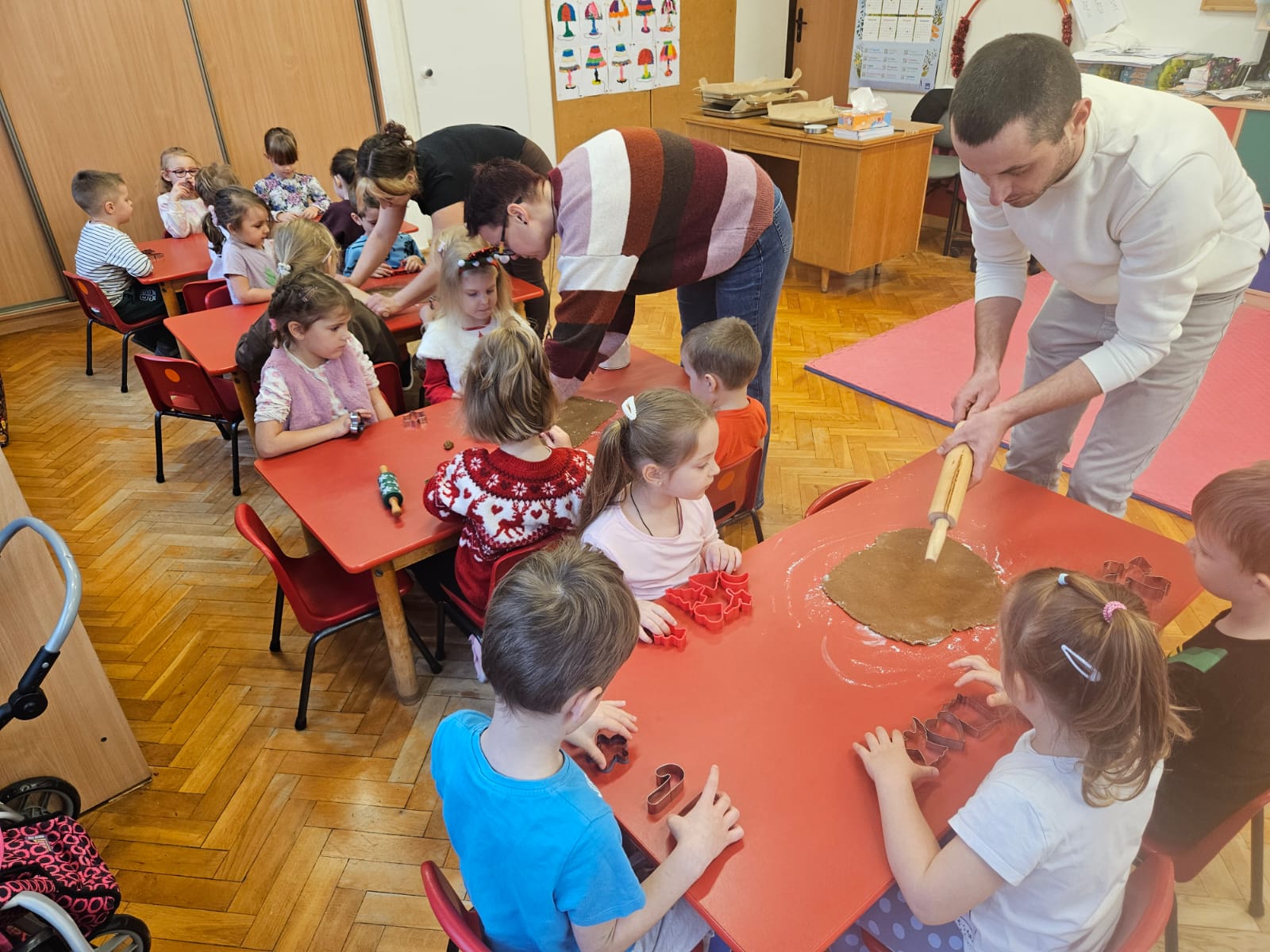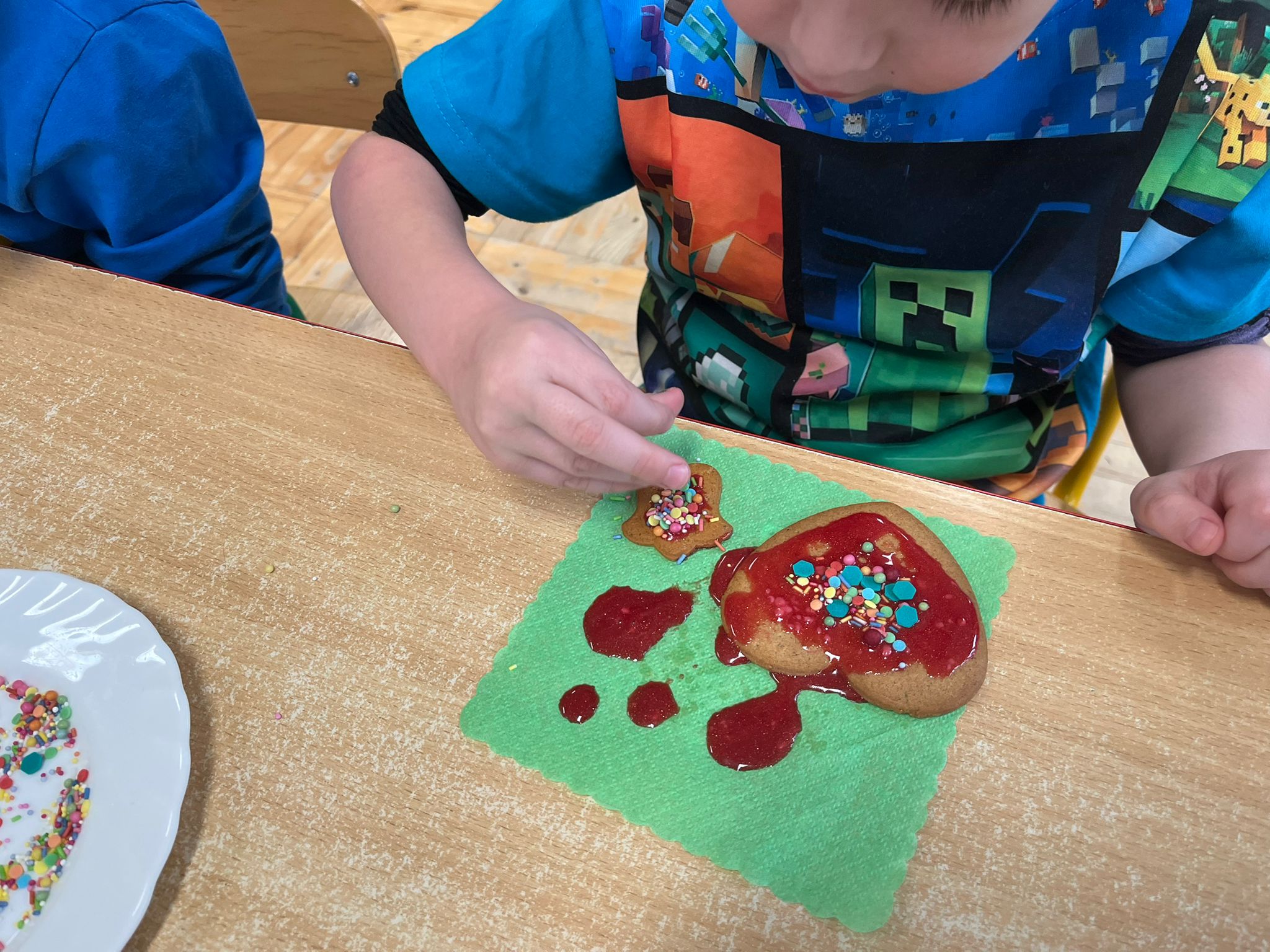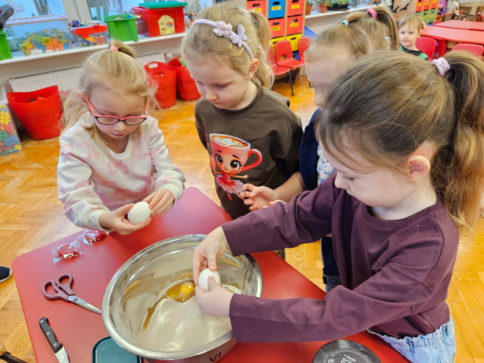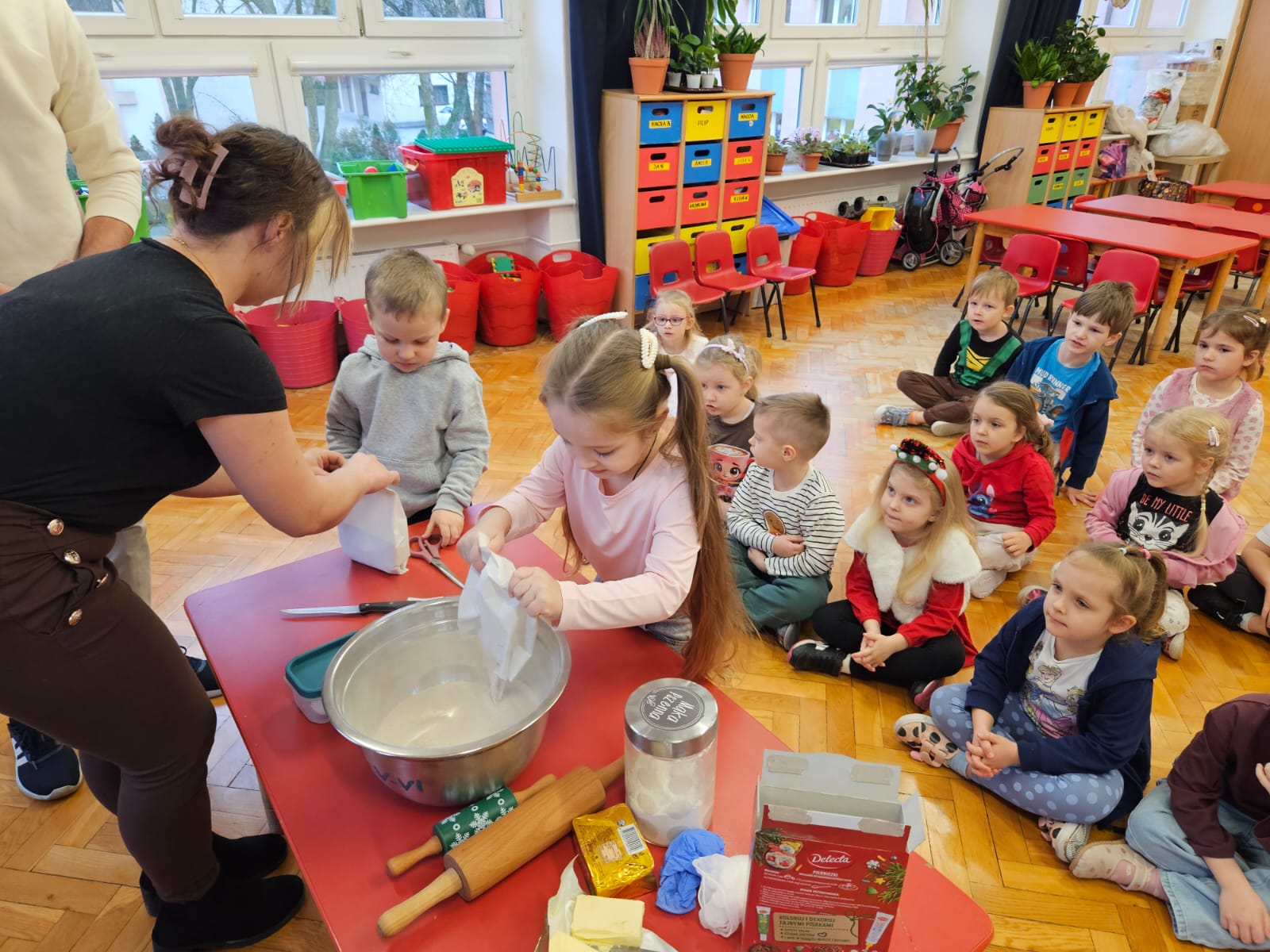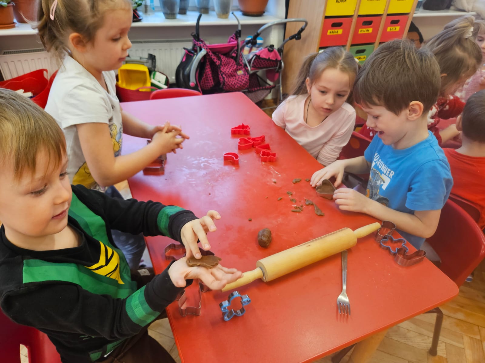 Nasi rodzice przybyli z pomocą. Tym razem wspólnie przygotowaliśmy ciasto na pierniczki. Sypaliśmy mąkę i cukier. Wkładaliśmy masło. Wbijaliśmy jajka. Następnie tata naszej koleżanki, który miał najwięcej siły zagniótł ciasto. Potem było wałkowanie i foremki poszły w ruch. To już tylko nasza zasługa. Całkiem dobrze nam szło. Uzbierało się aż cześć blach, które oddaliśmy w ręce naszych przedszkolnych kucharek i piecyka. Następnego dnia ozdabialiśmy pierniczki jak najładniej potrafiliśmy. Wręczymy je naszym rodzicom po uroczystości choinkowej. Dziękujemy naszym rodzicom za pomoc!