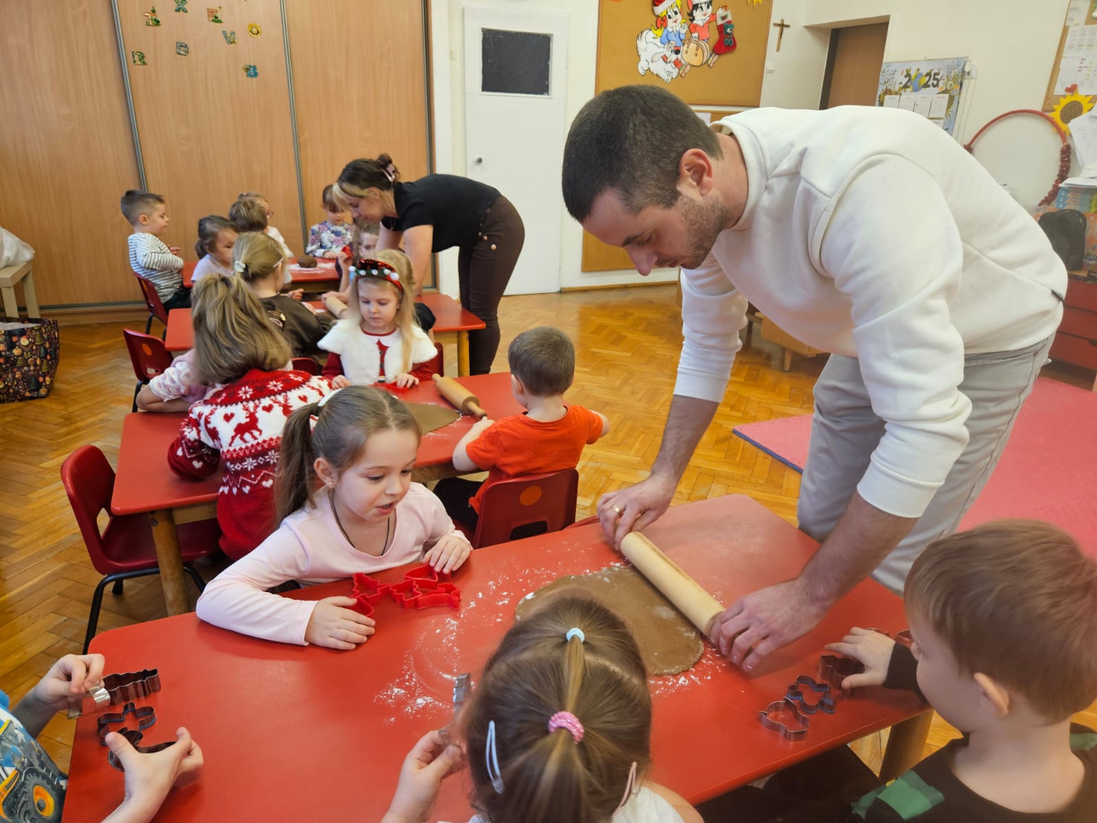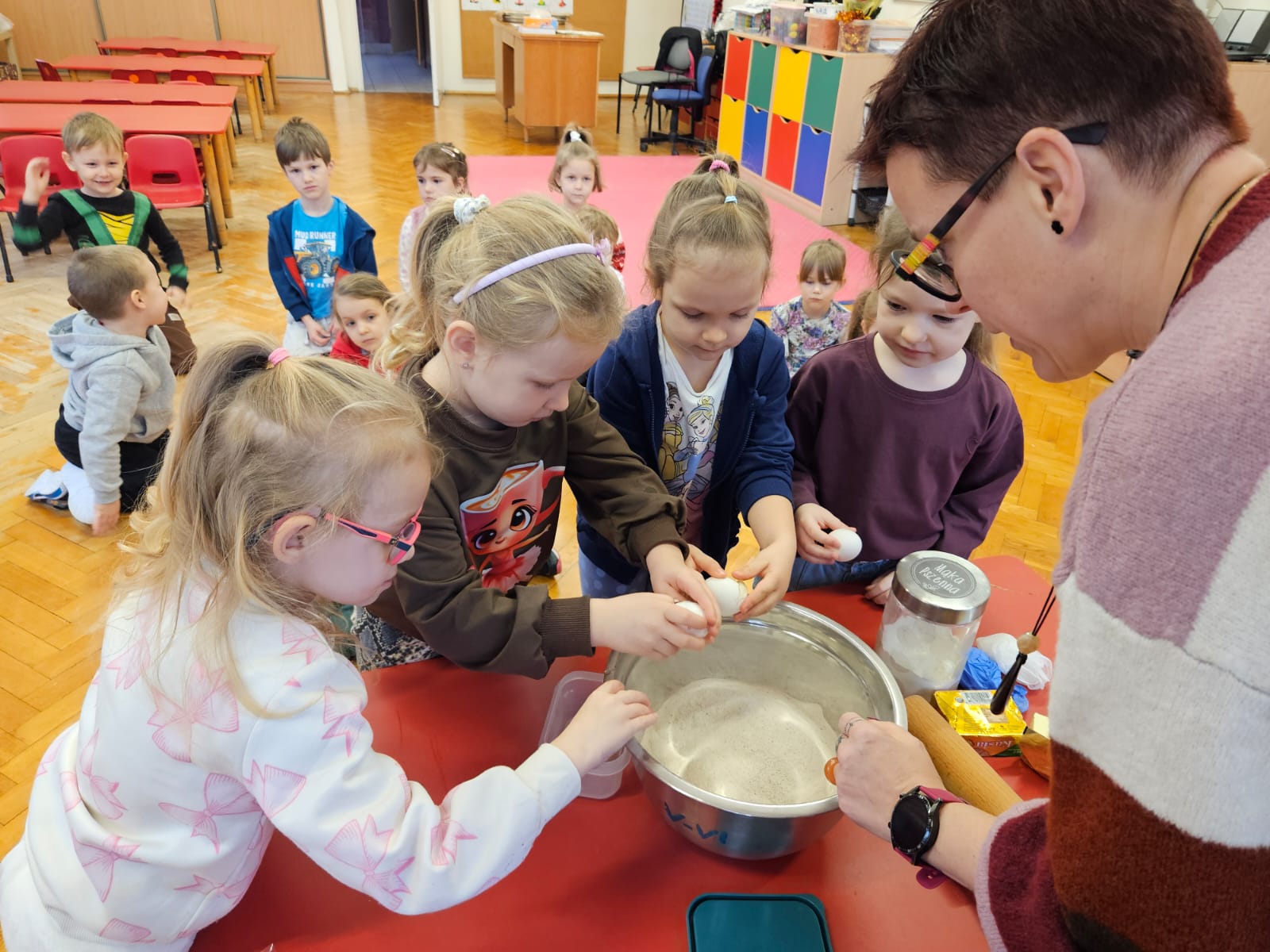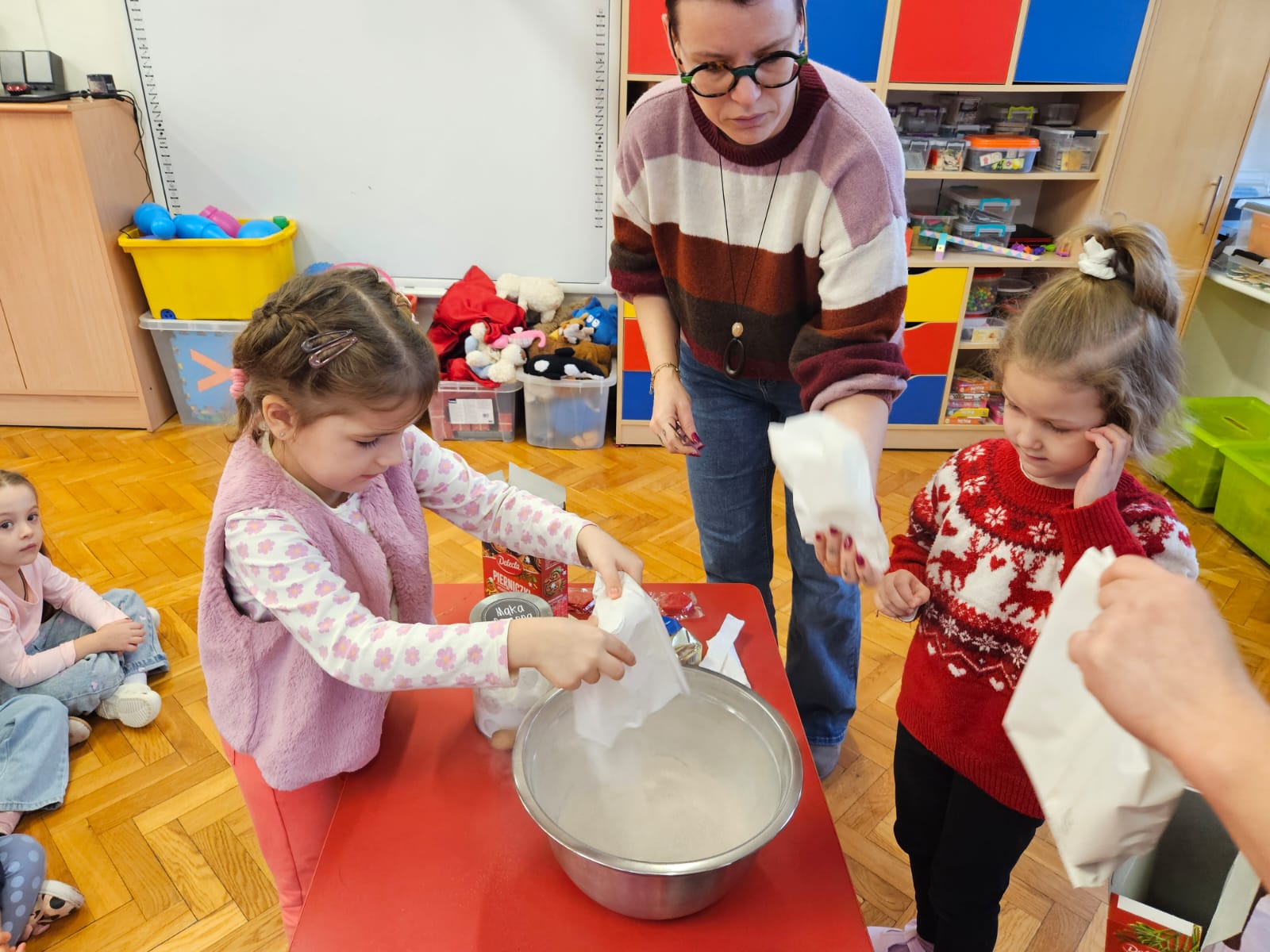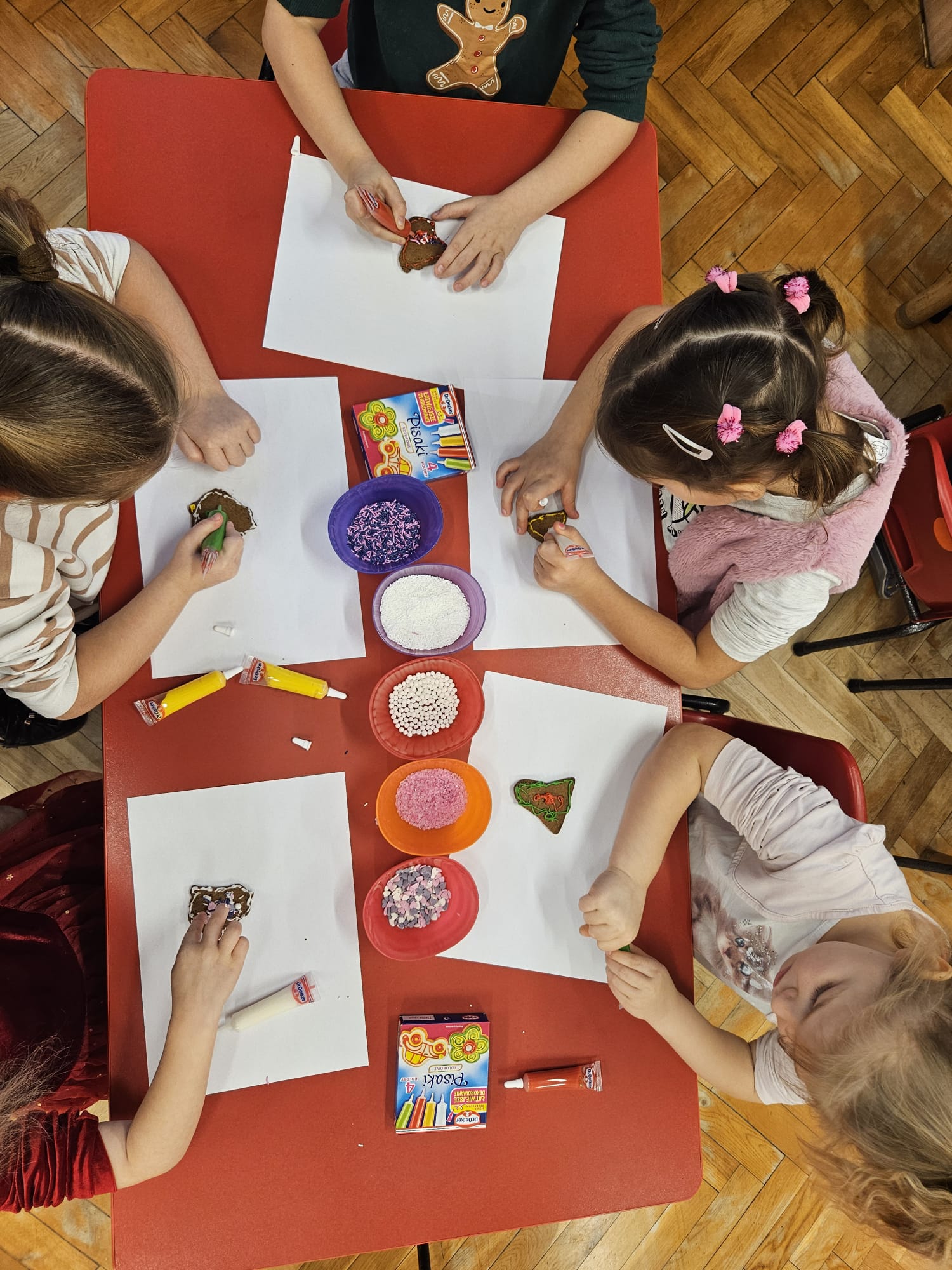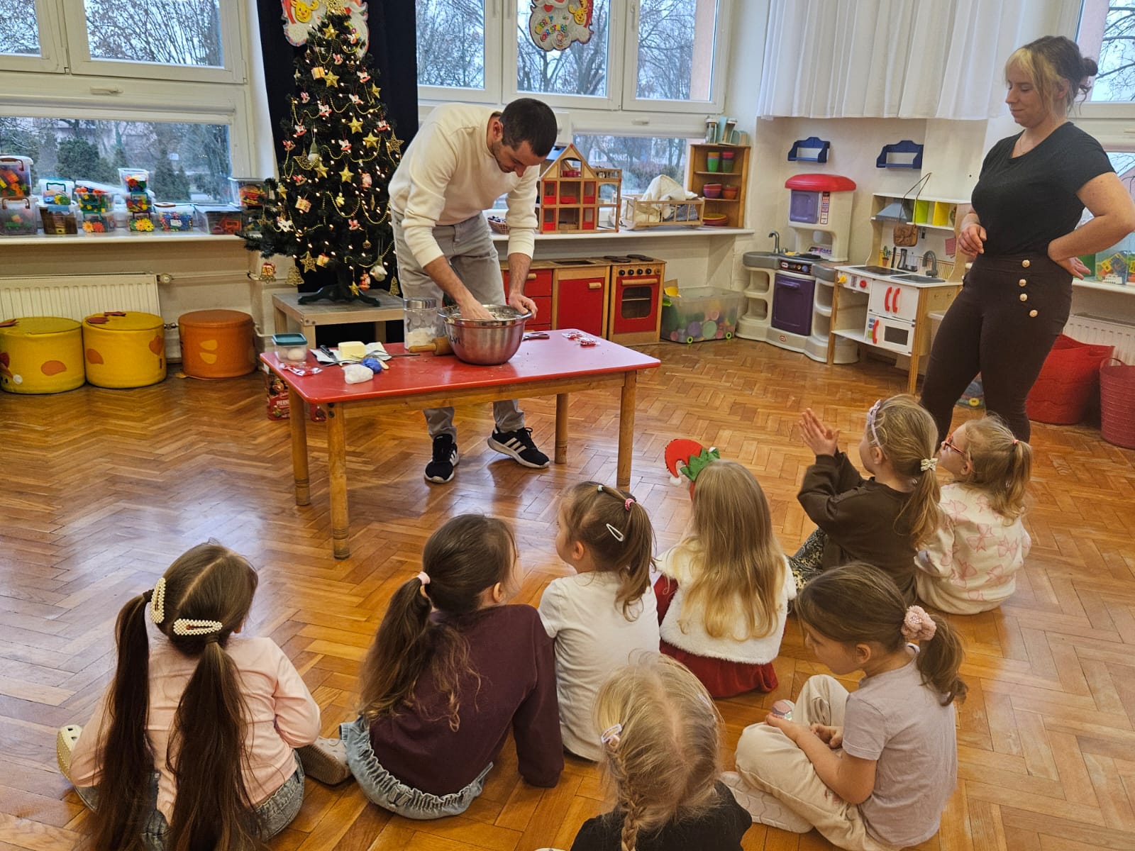 Nasi rodzice przybyli z pomocą. Tym razem wspólnie przygotowaliśmy ciasto na pierniczki. Sypaliśmy mąkę i cukier. Wkładaliśmy masło. Wbijaliśmy jajka. Następnie tata naszej koleżanki, który miał najwięcej siły zagniótł ciasto. Potem było wałkowanie i foremki poszły w ruch. To już tylko nasza zasługa. Całkiem dobrze nam szło. Uzbierało się aż cześć blach, które oddaliśmy w ręce naszych przedszkolnych kucharek i piecyka. Następnego dnia ozdabialiśmy pierniczki jak najładniej potrafiliśmy. Wręczymy je naszym rodzicom po uroczystości choinkowej. Dziękujemy naszym rodzicom za pomoc!
