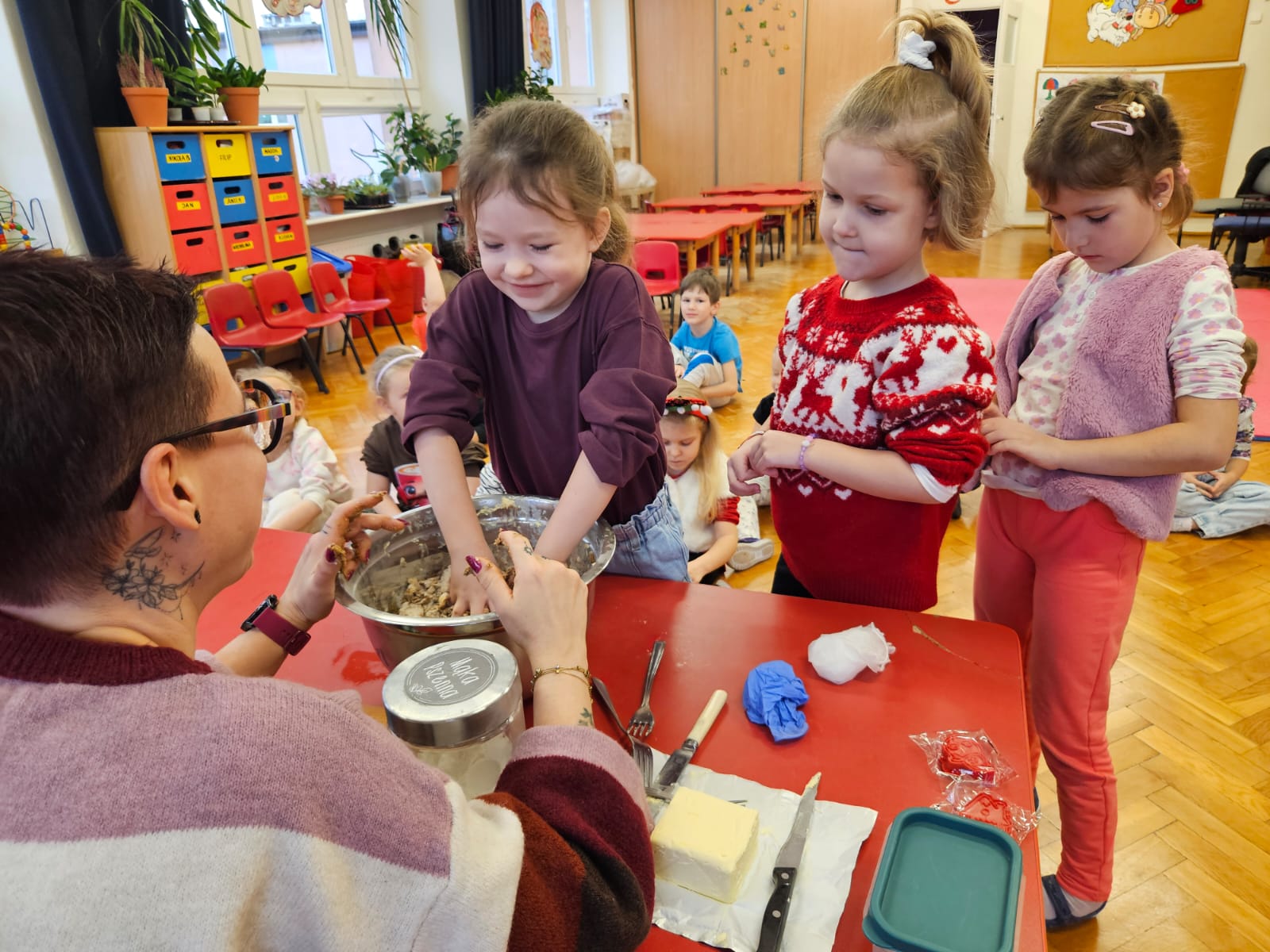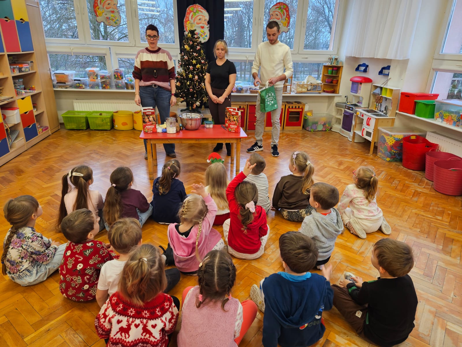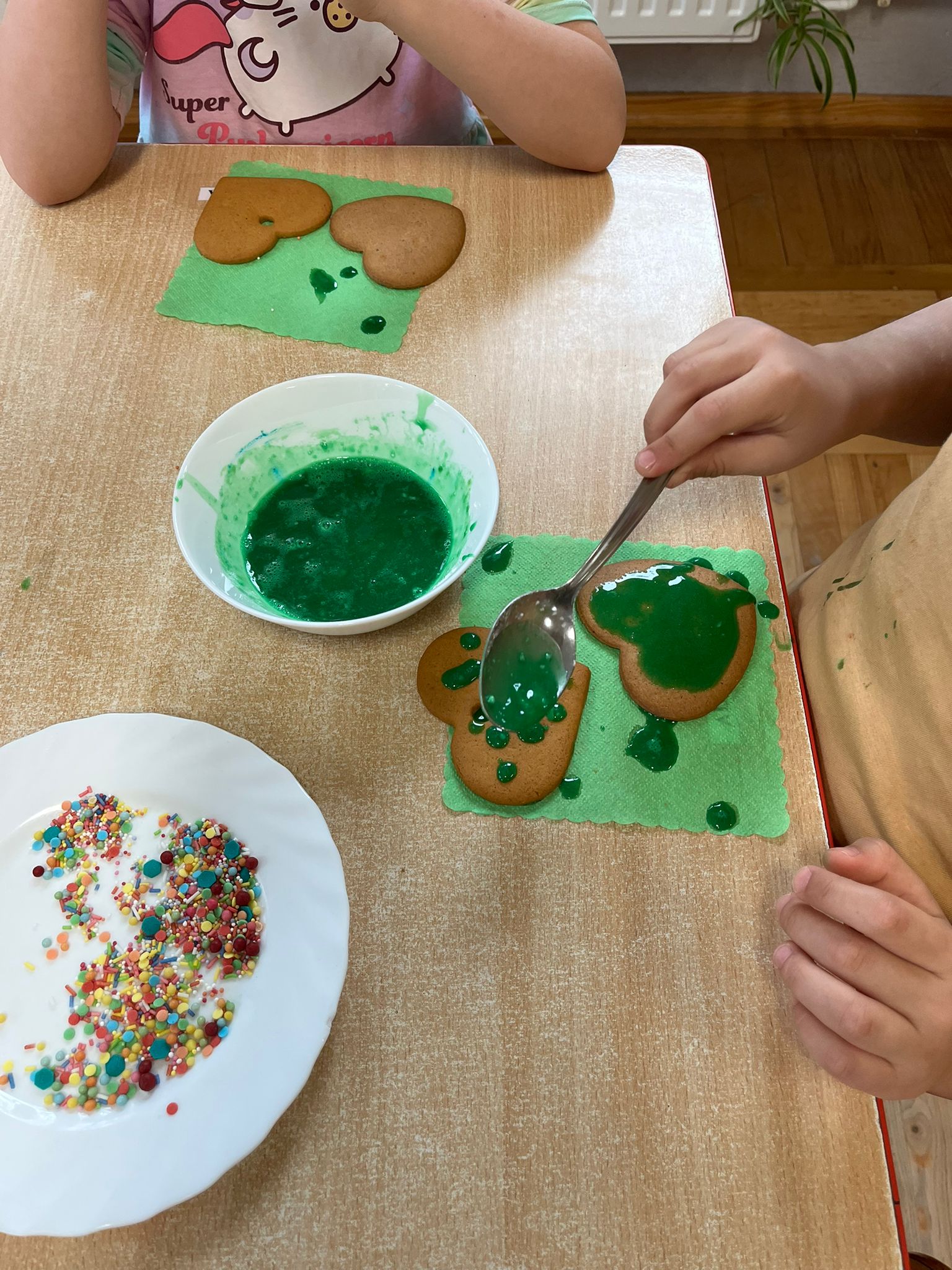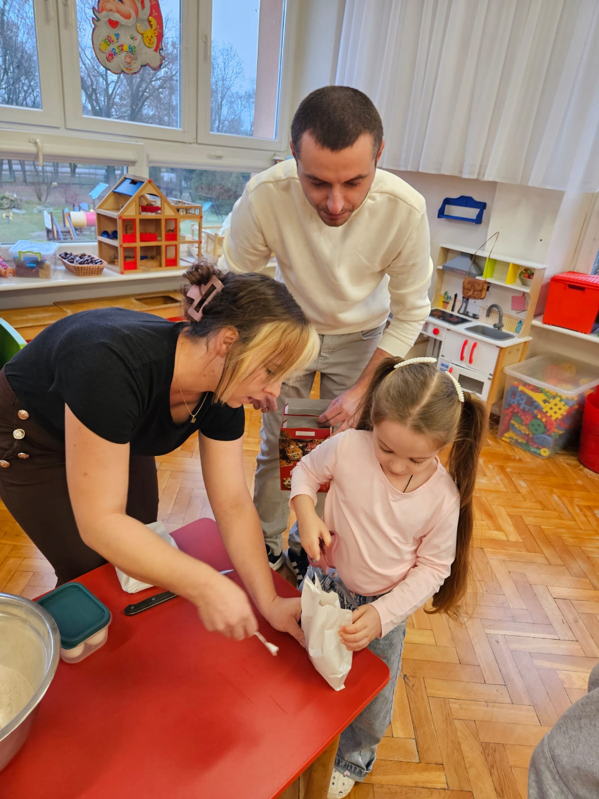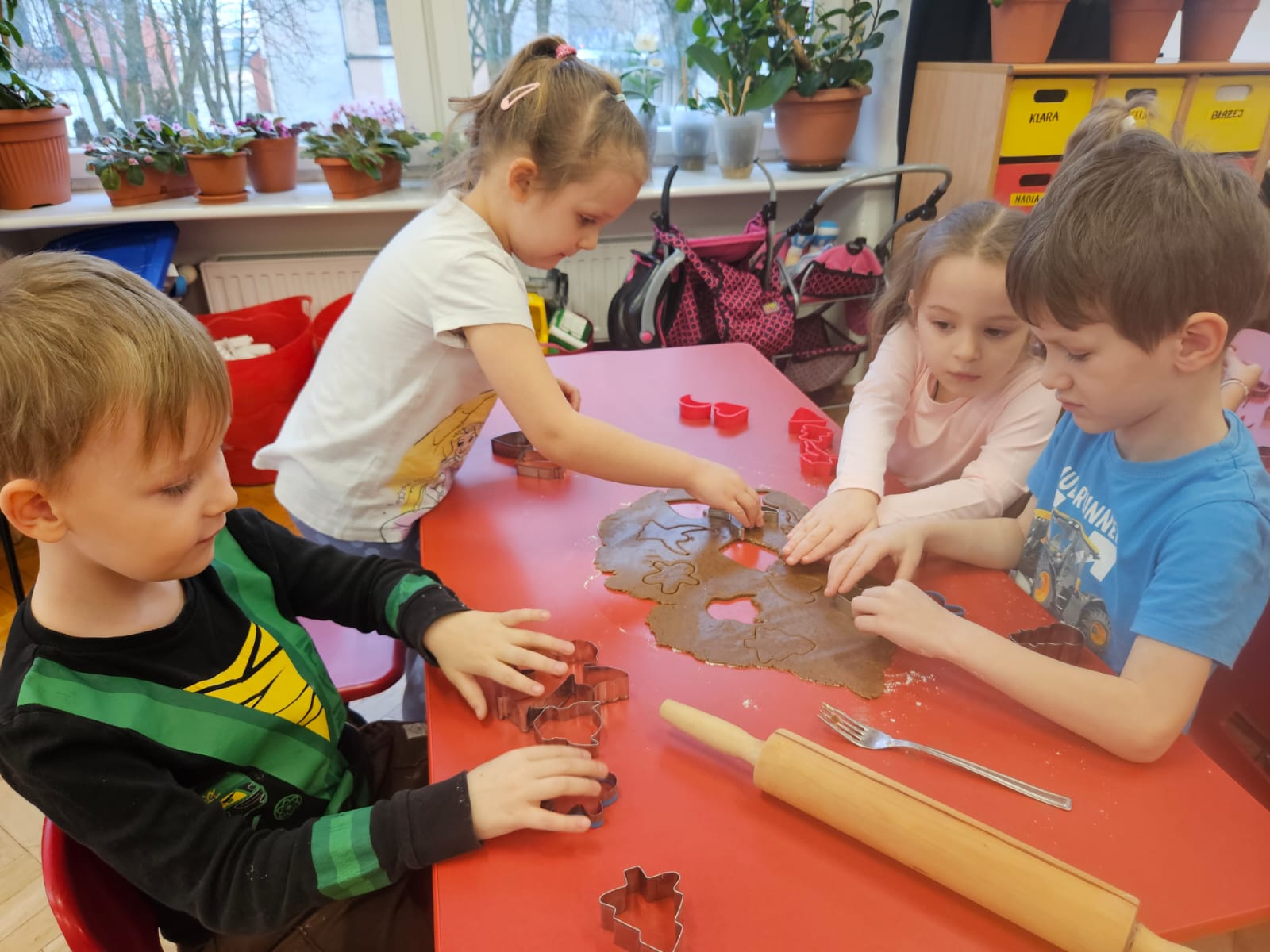 Nasi rodzice przybyli z pomocą. Tym razem wspólnie przygotowaliśmy ciasto na pierniczki. Sypaliśmy mąkę i cukier. Wkładaliśmy masło. Wbijaliśmy jajka. Następnie tata naszej koleżanki, który miał najwięcej siły zagniótł ciasto. Potem było wałkowanie i foremki poszły w ruch. To już tylko nasza zasługa. Całkiem dobrze nam szło. Uzbierało się aż cześć blach, które oddaliśmy w ręce naszych przedszkolnych kucharek i piecyka. Następnego dnia ozdabialiśmy pierniczki jak najładniej potrafiliśmy. Wręczymy je naszym rodzicom po uroczystości choinkowej. Dziękujemy naszym rodzicom za pomoc!