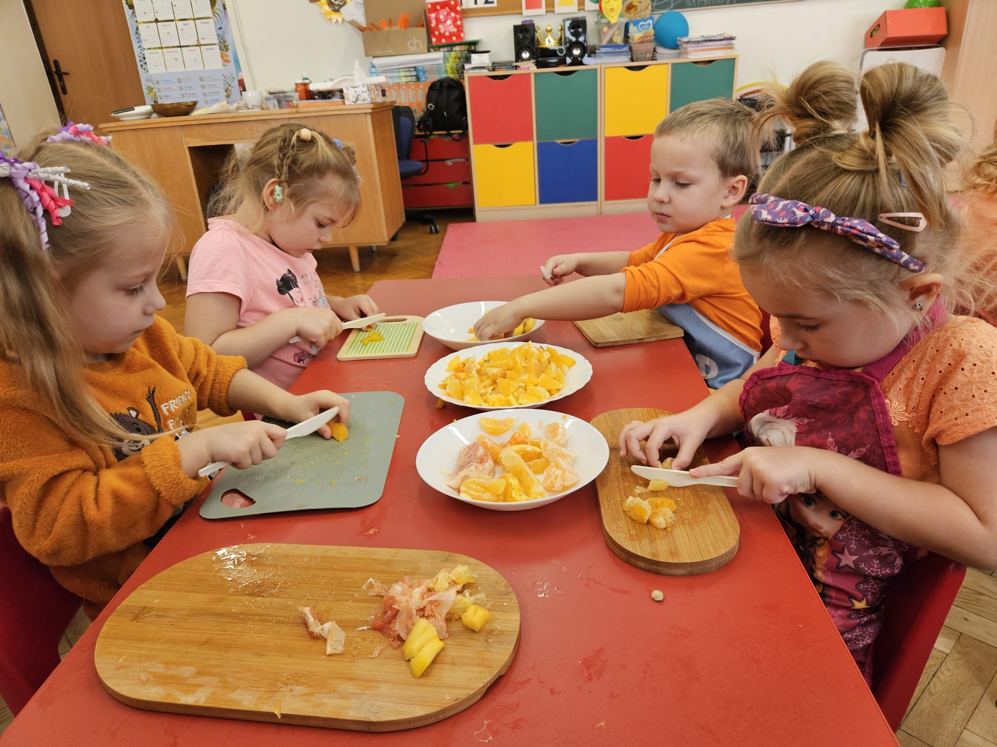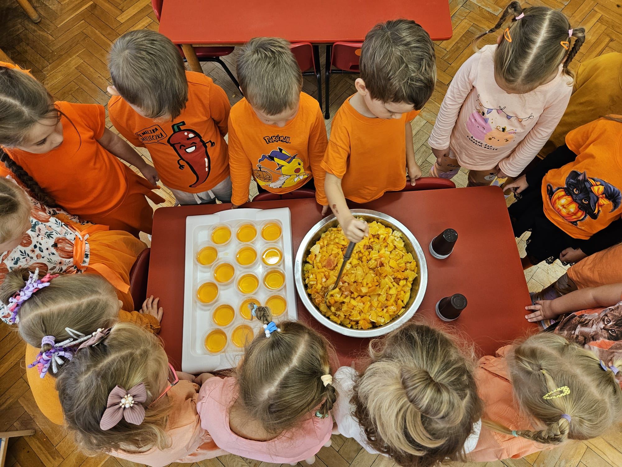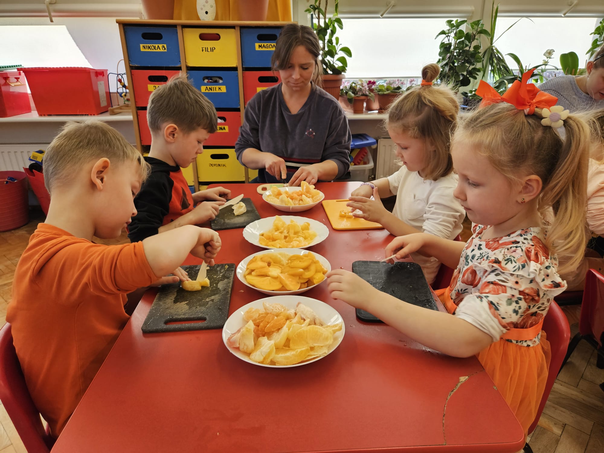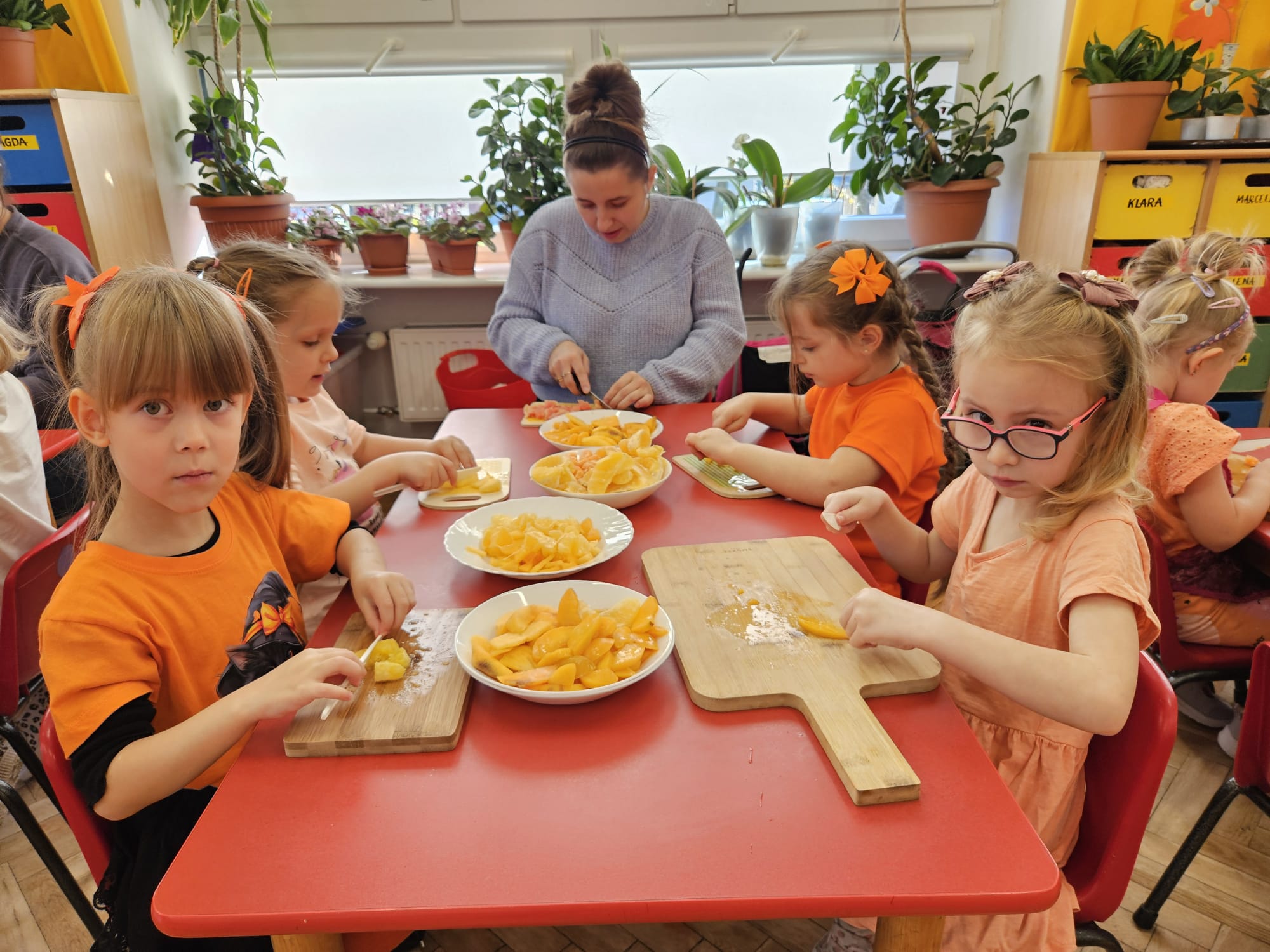 Zaprosiliśmy mamy aby razem z nami spędziły kilka chwil w dniu pomarańczowym. Wspólne poznawaliśmy pomarańczowe przedmioty, owoce i warzywa. Ze stolika każdy mógł wybrać to, co najbardziej podobało mu się (mamy też). Potem mamy pomogły nam przygotować pomarańczowe owoce do wykonania sałatki. My założyliśmy fartuszki. Deski położyliśmy na stołach a plastikowe noże trafiły do naszych rąk. Kroiliśmy jak potrafiliśmy. Nasza pomarańczowa sałatka owocowa to owoce kaki, pomarańczy, mandarynki , czerwonego grapejfruta oraz suszone morele i brzoskwinie z puszki. Potem mamy pomogły nam zrobić galaretkę. Wszystkie nasze smakołyki zabraliśmy do domu i częstowaliśmy nimi naszych bliskich. Mniam!