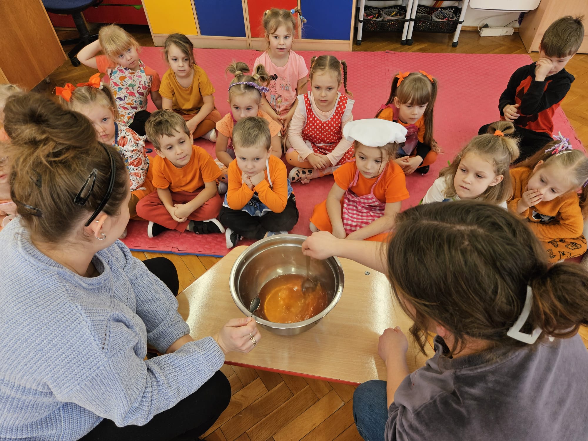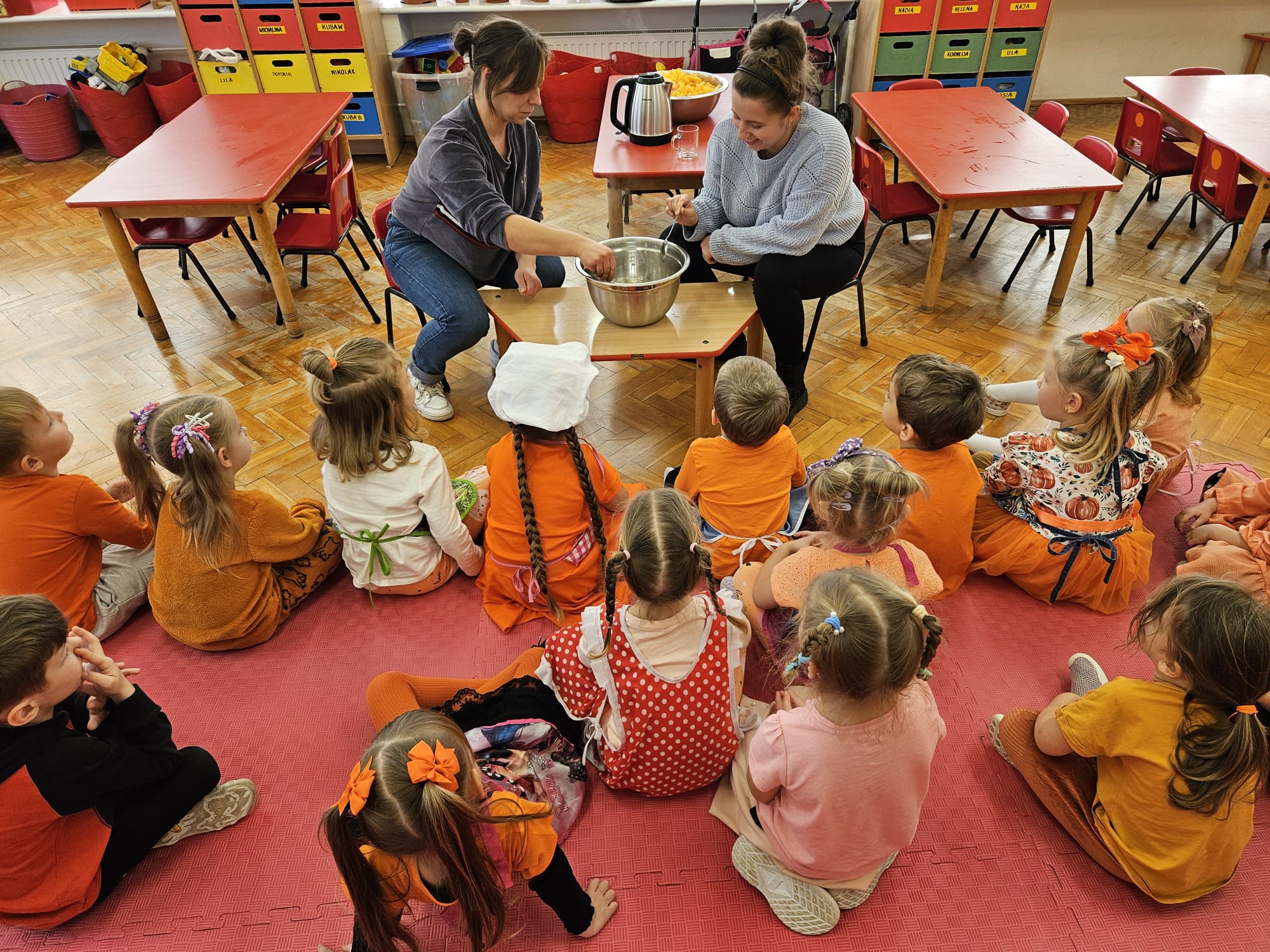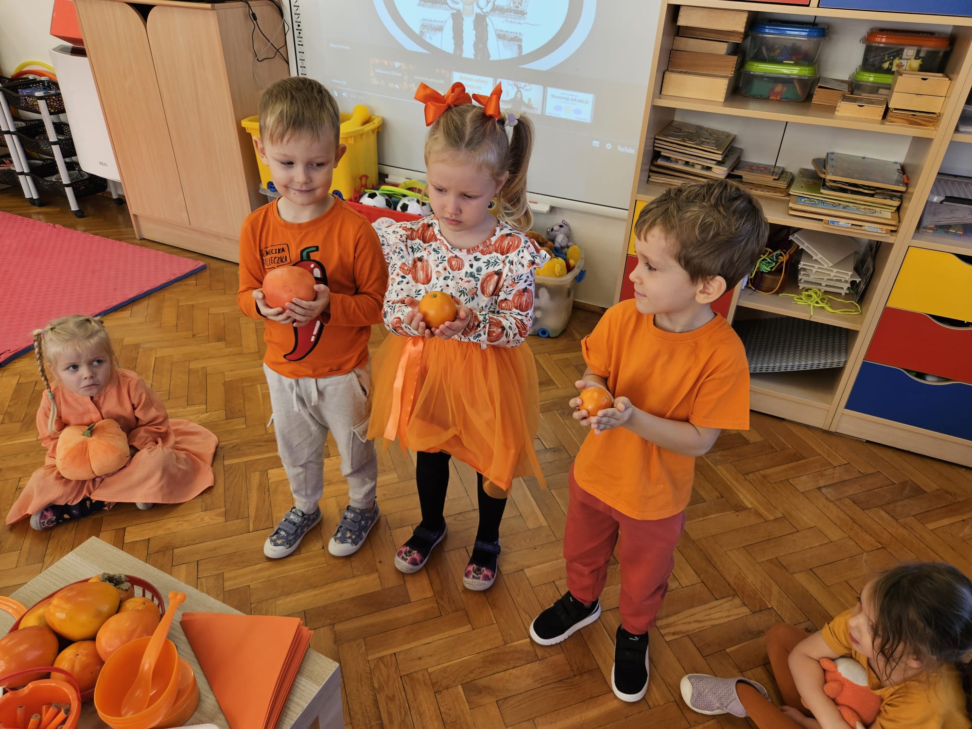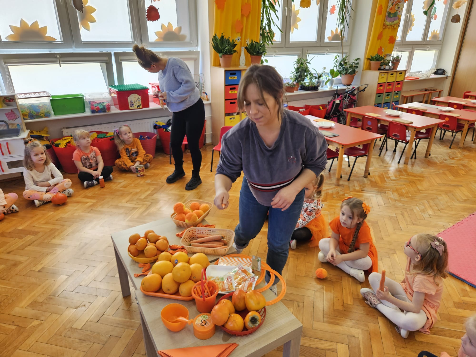 Zaprosiliśmy mamy aby razem z nami spędziły kilka chwil w dniu pomarańczowym. Wspólne poznawaliśmy pomarańczowe przedmioty, owoce i warzywa. Ze stolika każdy mógł wybrać to, co najbardziej podobało mu się (mamy też). Potem mamy pomogły nam przygotować pomarańczowe owoce do wykonania sałatki. My założyliśmy fartuszki. Deski położyliśmy na stołach a plastikowe noże trafiły do naszych rąk. Kroiliśmy jak potrafiliśmy. Nasza pomarańczowa sałatka owocowa to owoce kaki, pomarańczy, mandarynki , czerwonego grapejfruta oraz suszone morele i brzoskwinie z puszki. Potem mamy pomogły nam zrobić galaretkę. Wszystkie nasze smakołyki zabraliśmy do domu i częstowaliśmy nimi naszych bliskich. Mniam!