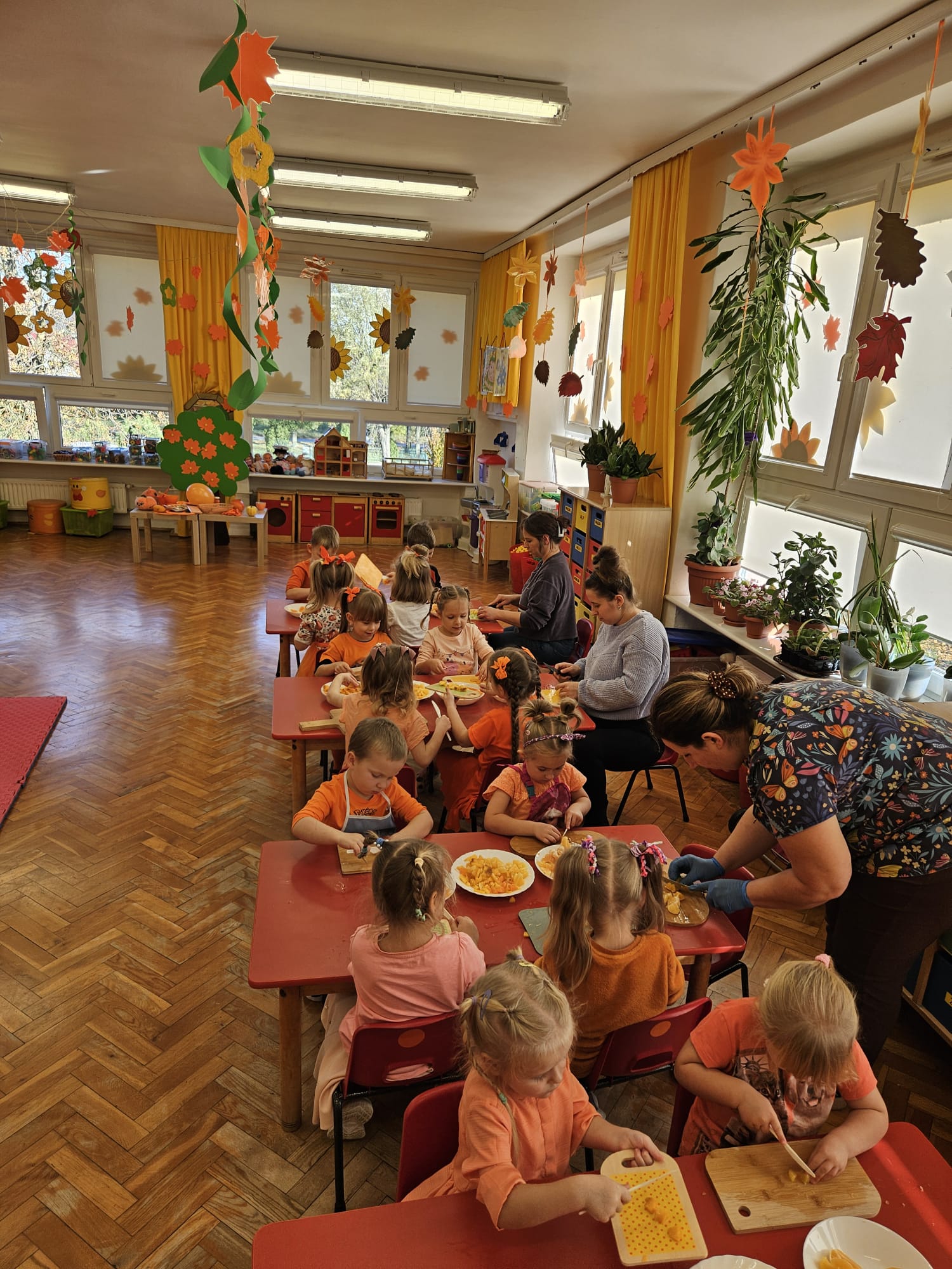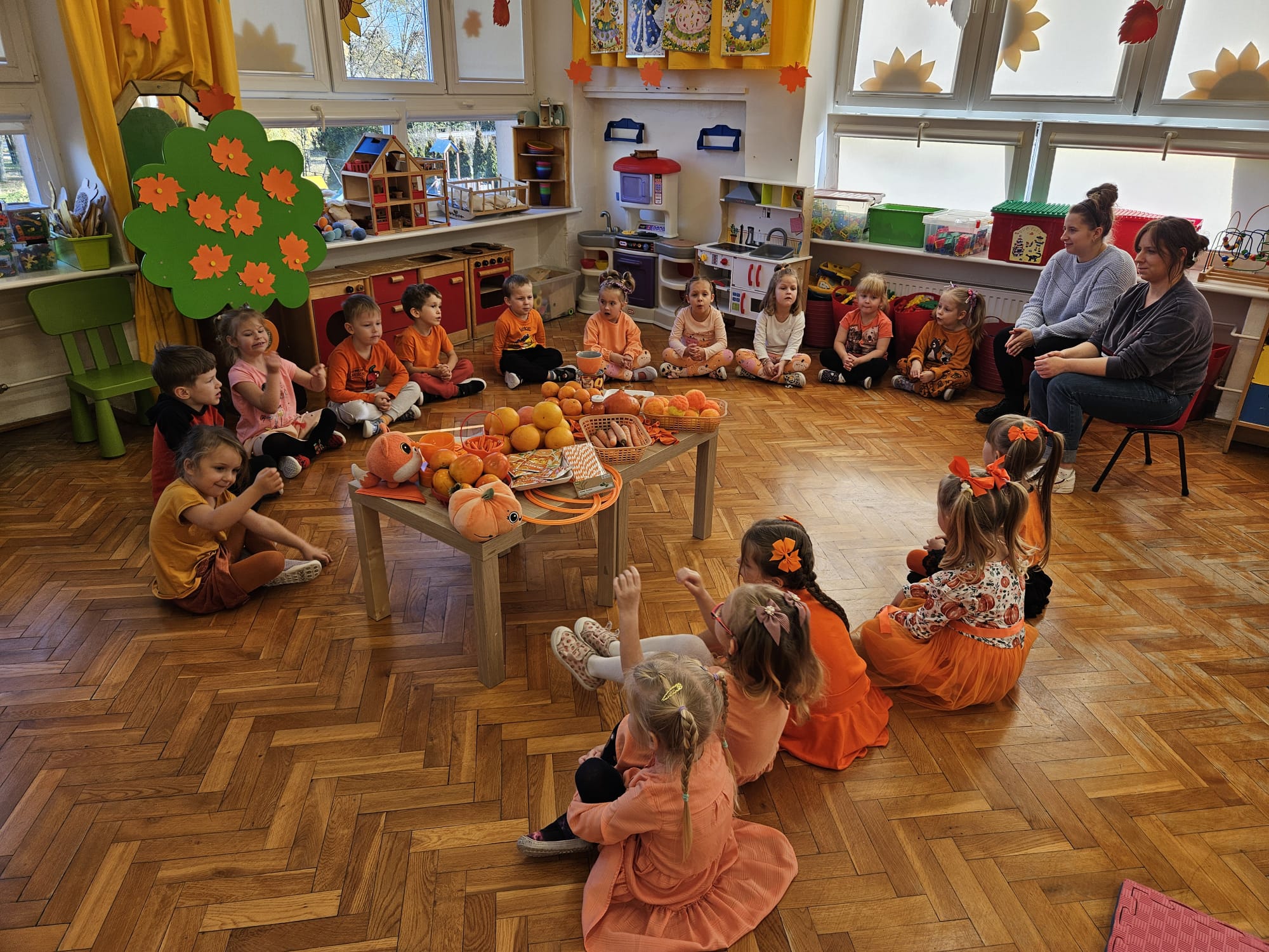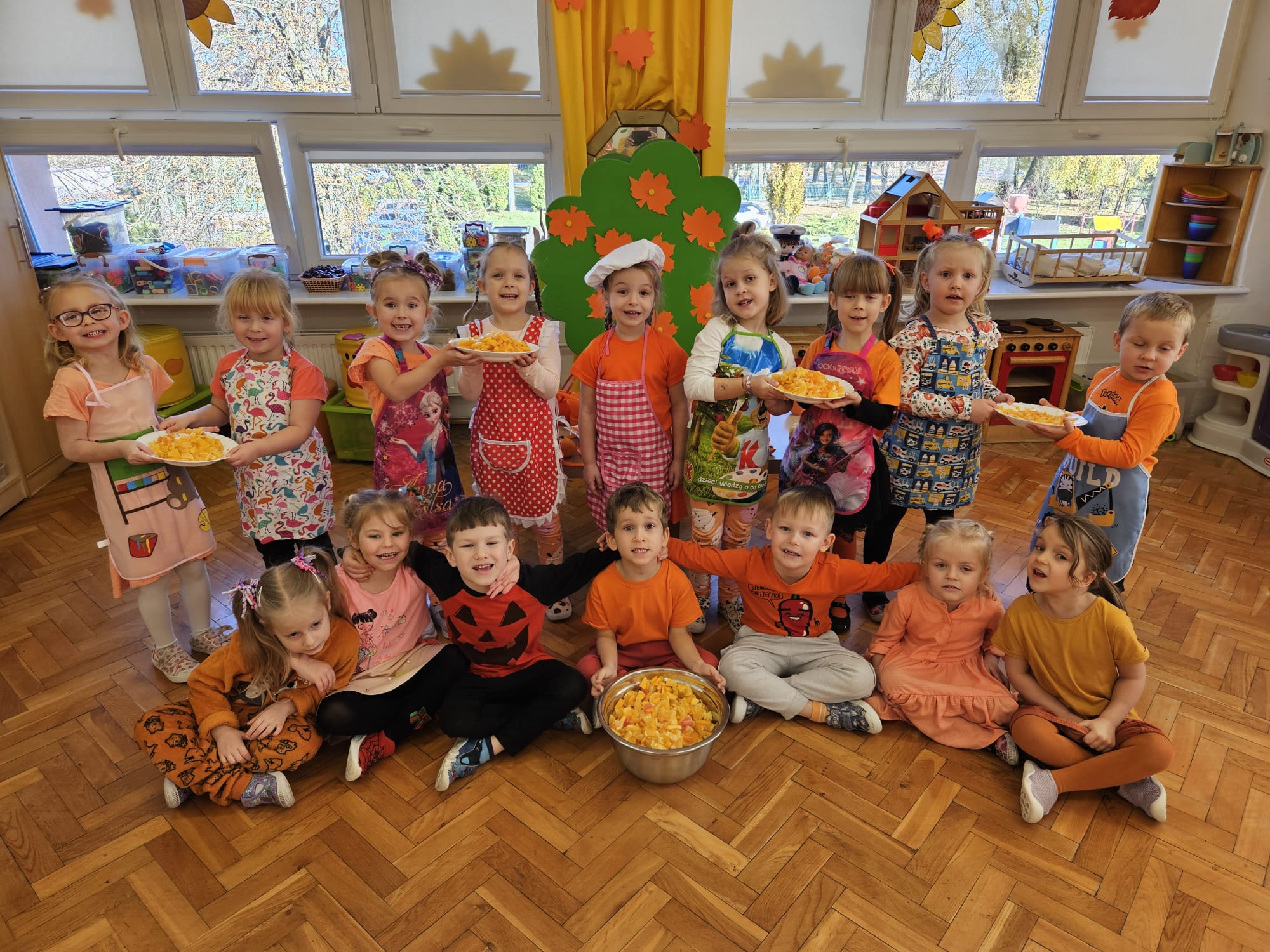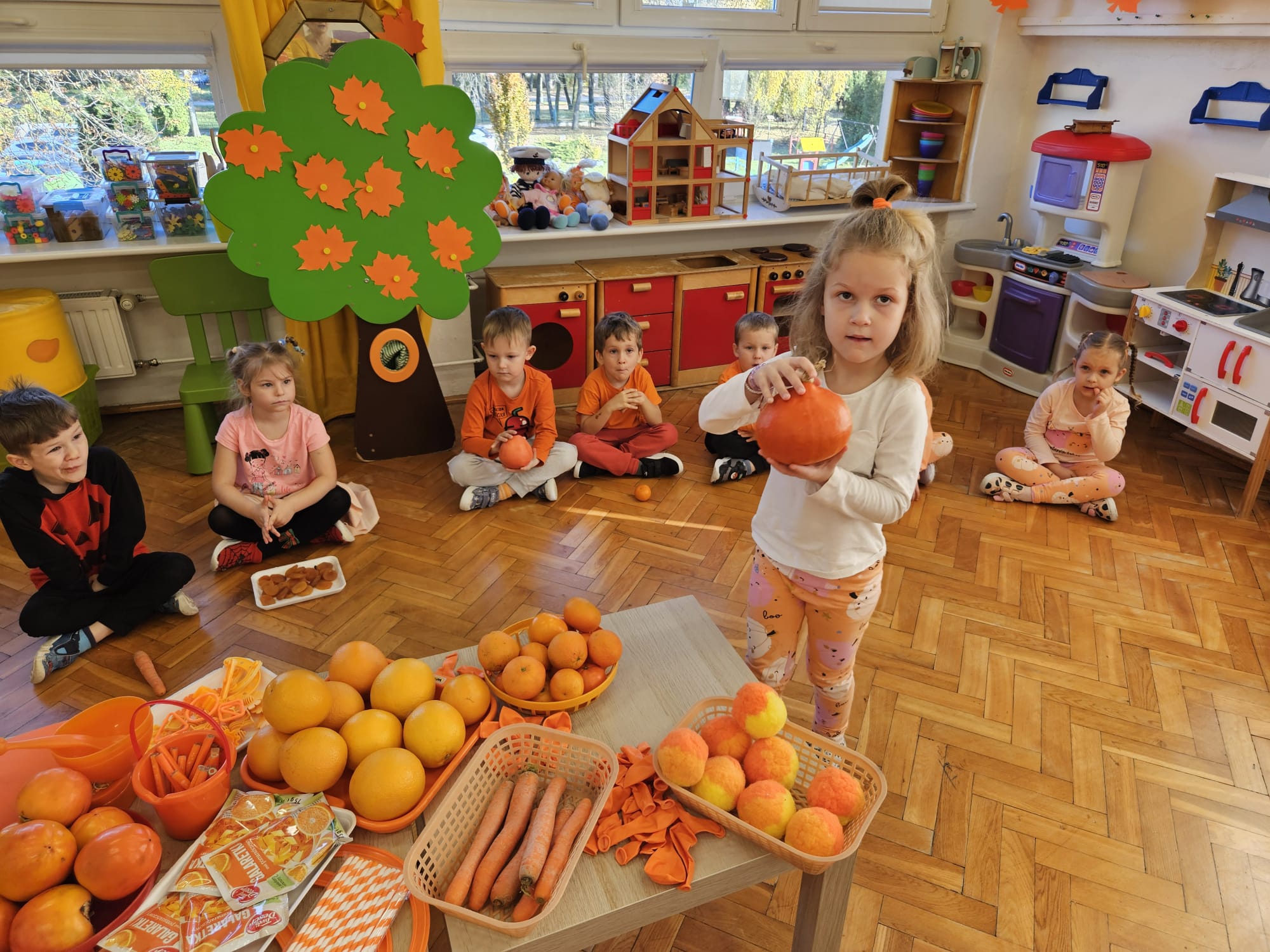 Zaprosiliśmy mamy aby razem z nami spędziły kilka chwil w dniu pomarańczowym. Wspólne poznawaliśmy pomarańczowe przedmioty, owoce i warzywa. Ze stolika każdy mógł wybrać to, co najbardziej podobało mu się (mamy też). Potem mamy pomogły nam przygotować pomarańczowe owoce do wykonania sałatki. My założyliśmy fartuszki. Deski położyliśmy na stołach a plastikowe noże trafiły do naszych rąk. Kroiliśmy jak potrafiliśmy. Nasza pomarańczowa sałatka owocowa to owoce kaki, pomarańczy, mandarynki , czerwonego grapejfruta oraz suszone morele i brzoskwinie z puszki. Potem mamy pomogły nam zrobić galaretkę. Wszystkie nasze smakołyki zabraliśmy do domu i częstowaliśmy nimi naszych bliskich. Mniam!