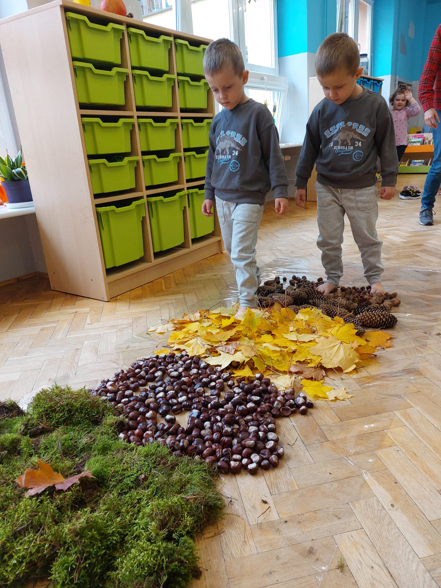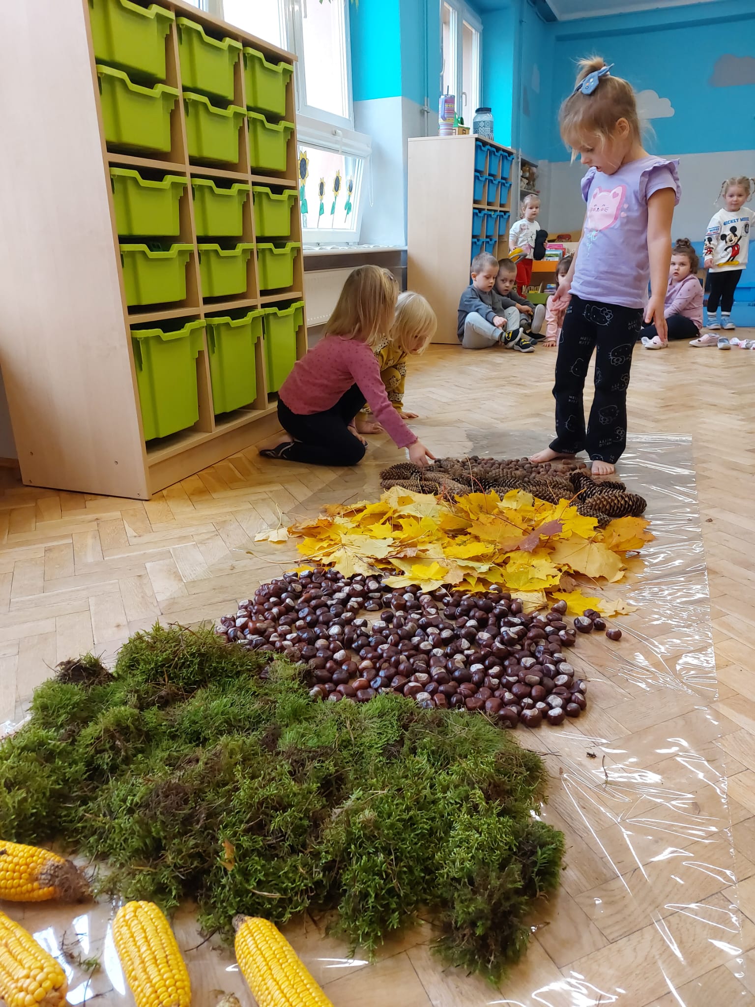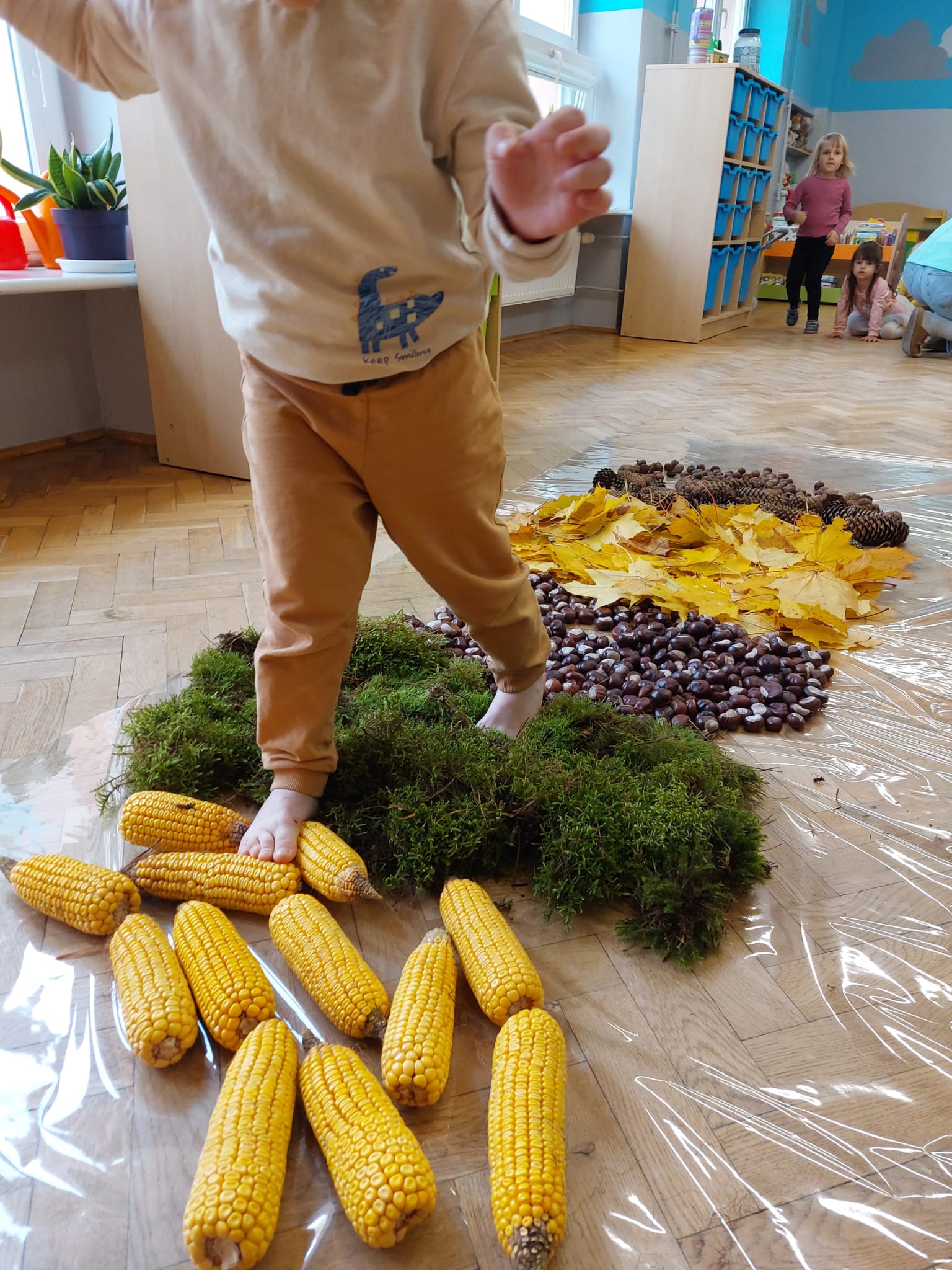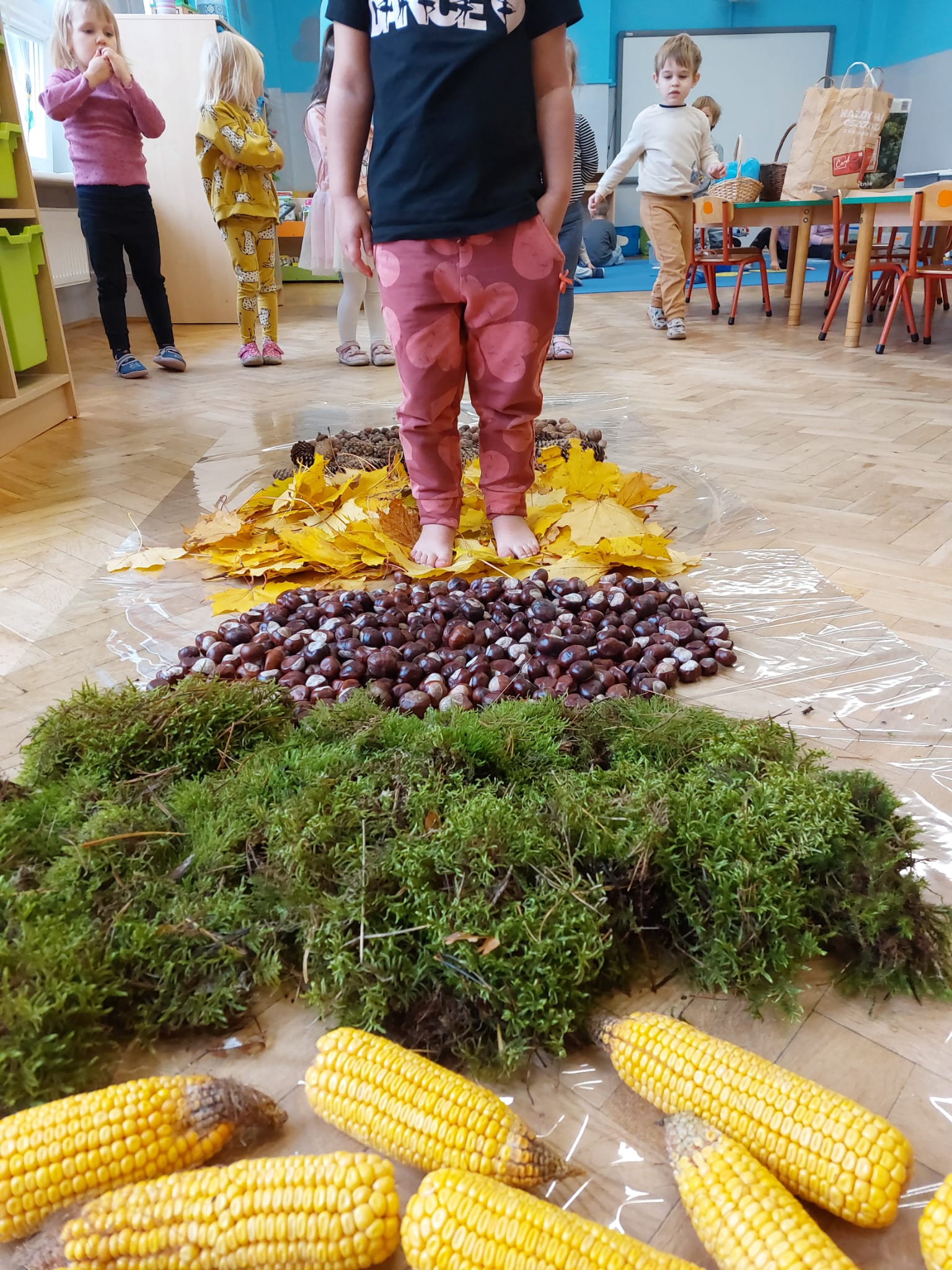 Niektórzy las jesienny odwiedzili a do nas można powiedzieć przyszedł. Jesienną ścieżkę sensoryczną odkrywaliśmy stopami i dłońmi poznając i ucząc się poprzez bezpośrednie doświadczenie i czucie.