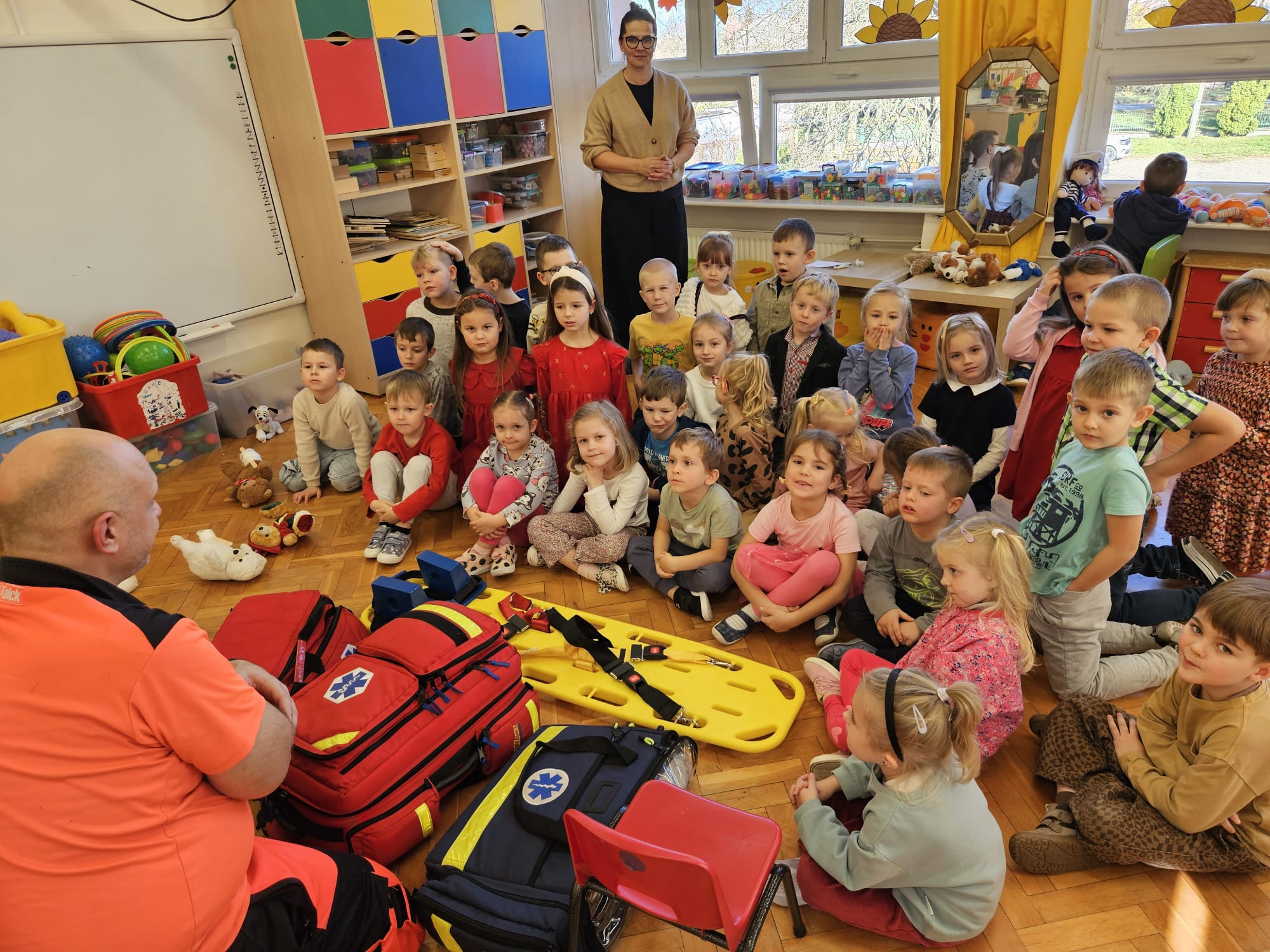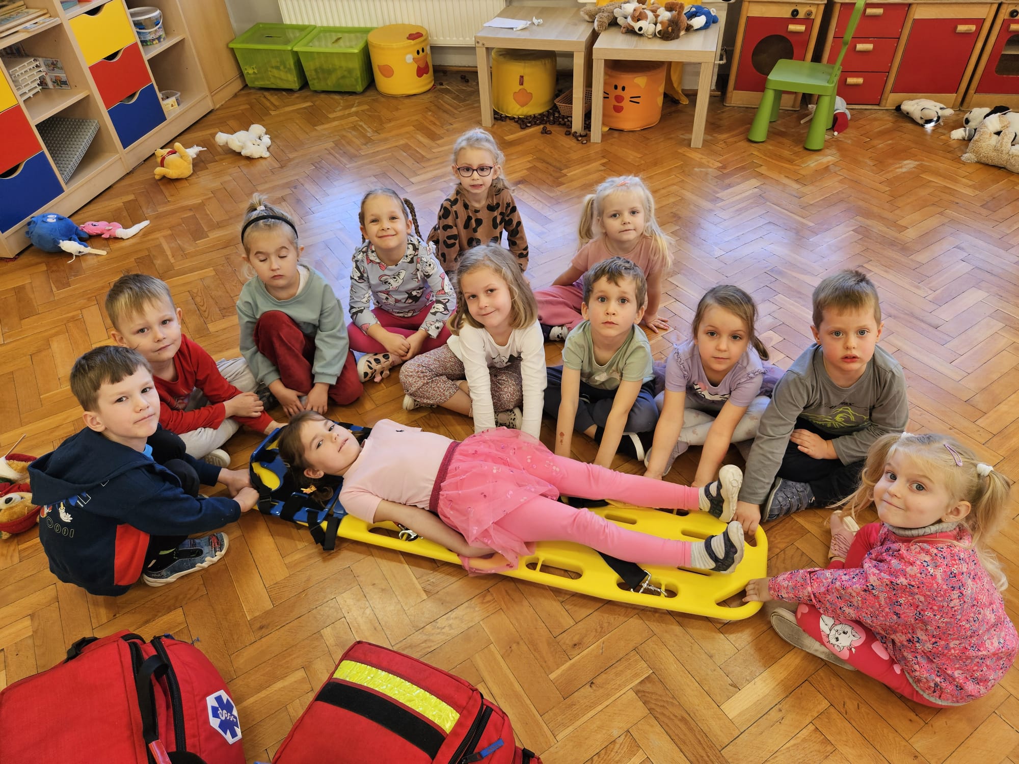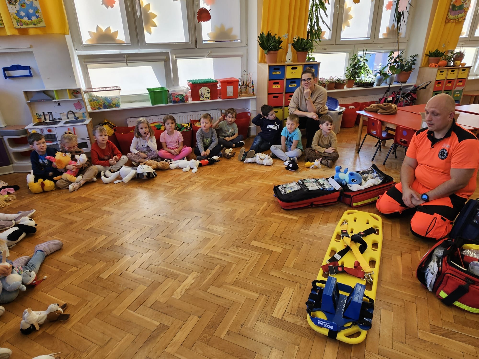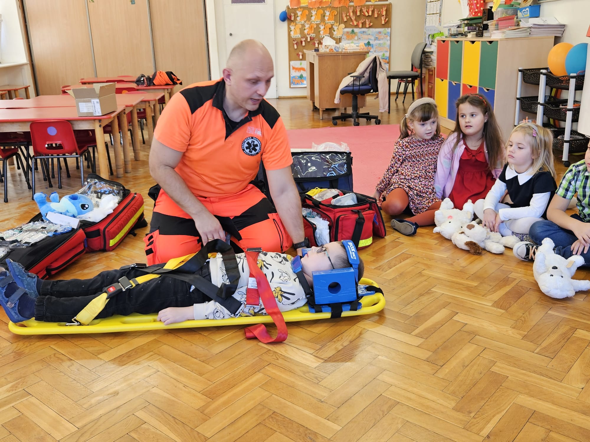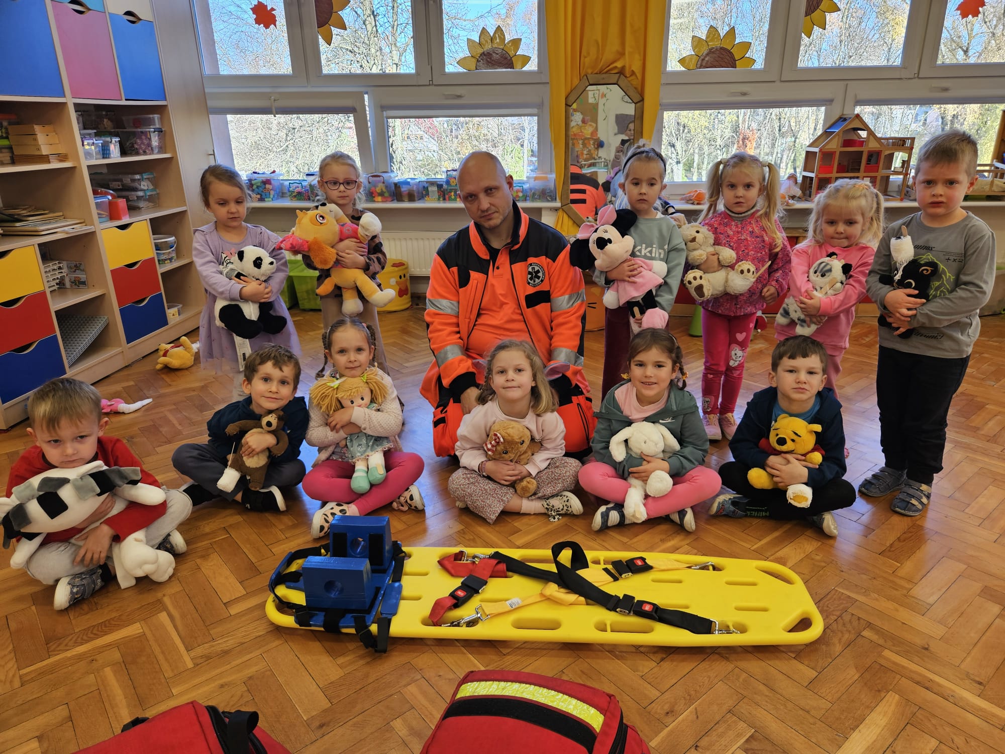 Dziś pod przedszkole zajechała karetka a do przedszkola z wielkimi i ciężkimi torbami wszedł w odblaskowym ubranku ratownik medyczny. To tata naszej koleżanki Poli. Utrwaliliśmy numery alarmowe. Musimy poćwiczyć jeszcze znajomość adresu (przynajmniej niektórzy). Widzieliśmy urządzenia, które pomagają ratować człowieka - respirator, defibrylator. Strasznie trudne nazwy. Wiemy jak zmierzyć cukier i to nie w cukiernicy. Jak zrobić zdjęcie kości i że nie wystarczy do tego aparat fotograficzny. Nasze przytulanki pomogły nam nauczyć się opatrywać rany. Usztywnialiśmy szpatułkami i zawijaliśmy bandażami łapki naszych przytulanek. Nasz kolega leżąc na desce miał fajnie. Kolegom udało się podnieść go razem z nią. To nie takie proste. Na koniec mogliśmy wejść do karetki i zobaczyć jej wnętrze. Obyśmy nigdy nie musieli z niej korzystać. Dziękujemy za ogrom wiedzy, cierpliwość i za wizytę.