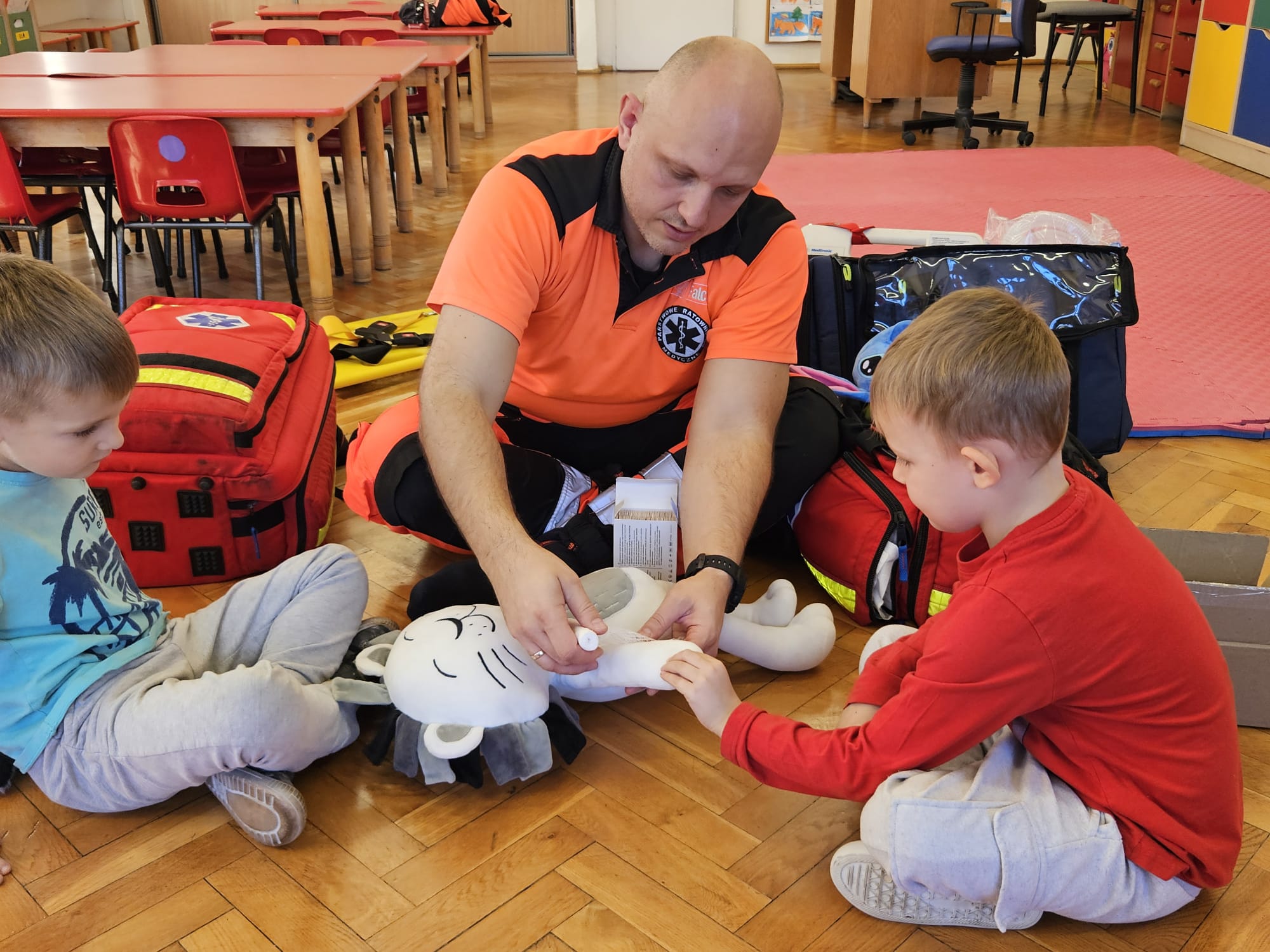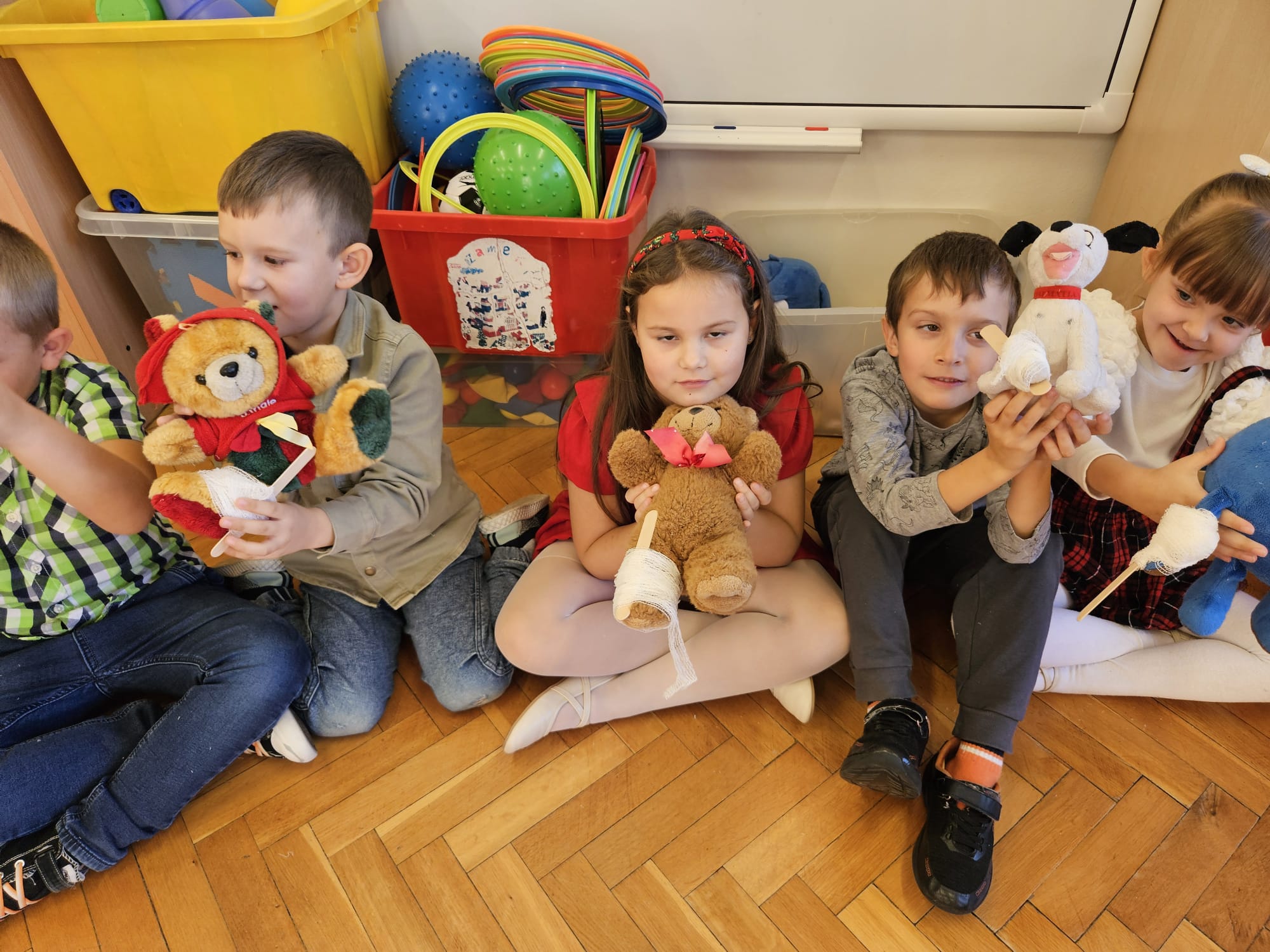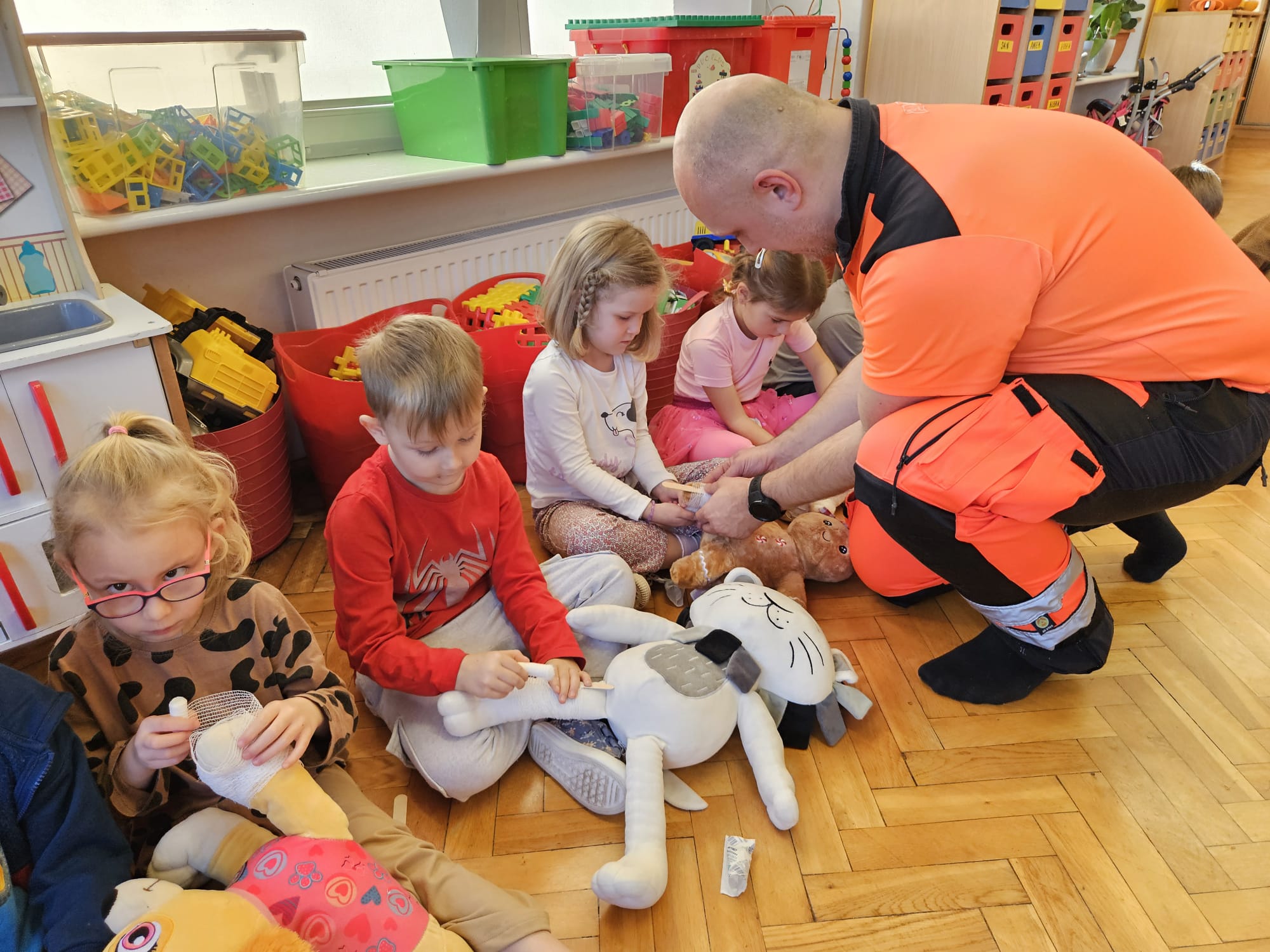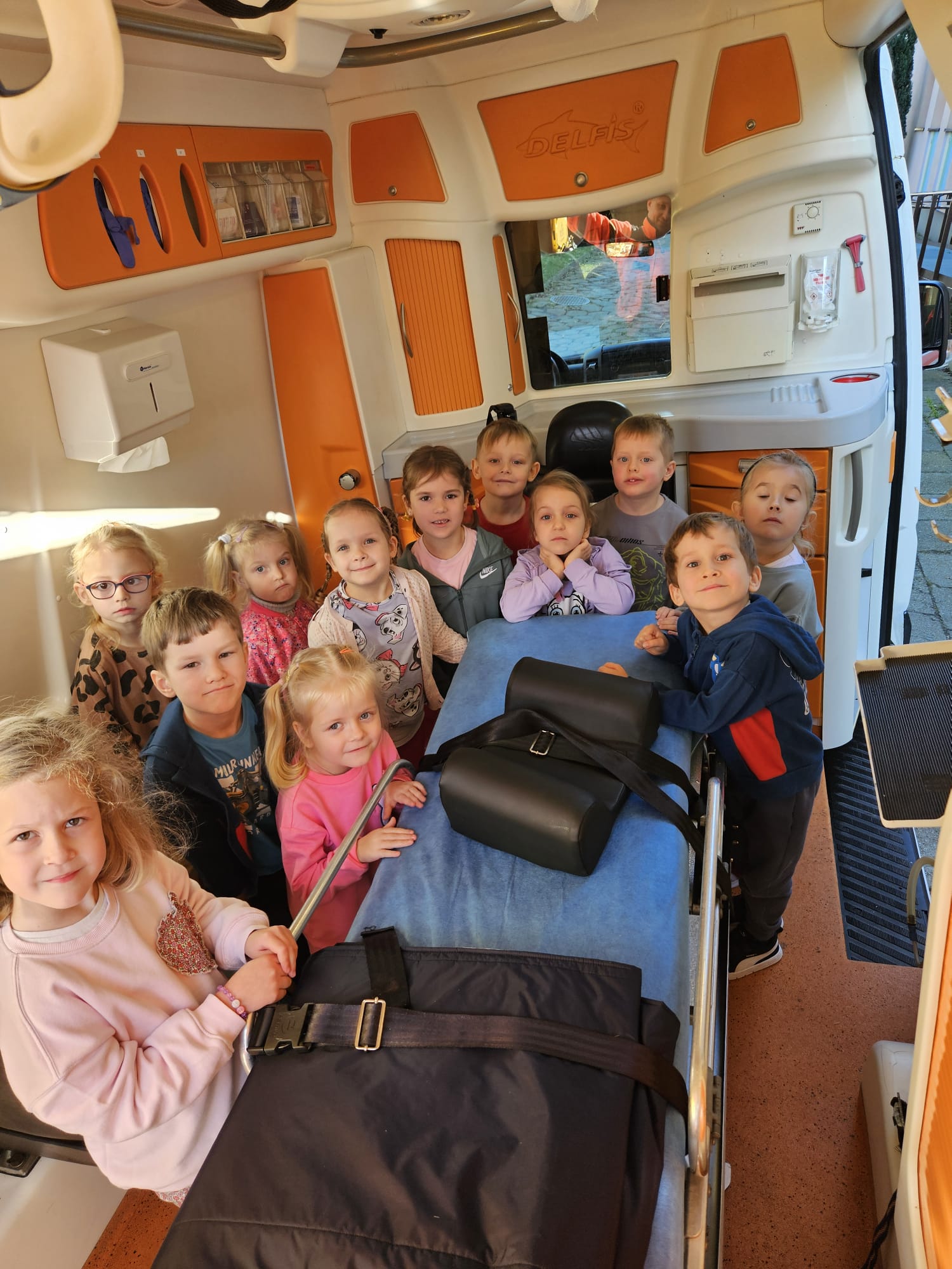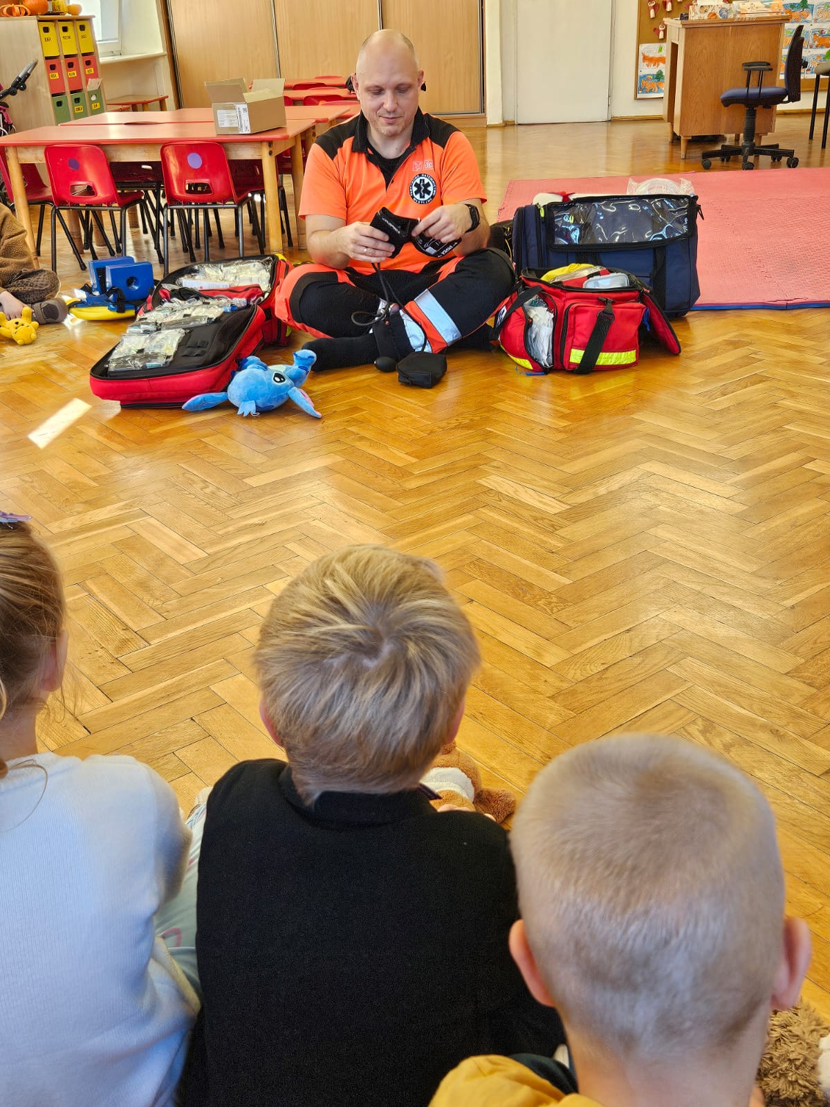 Dziś pod przedszkole zajechała karetka a do przedszkola z wielkimi i ciężkimi torbami wszedł w odblaskowym ubranku ratownik medyczny. To tata naszej koleżanki Poli. Utrwaliliśmy numery alarmowe. Musimy poćwiczyć jeszcze znajomość adresu (przynajmniej niektórzy). Widzieliśmy urządzenia, które pomagają ratować człowieka - respirator, defibrylator. Strasznie trudne nazwy. Wiemy jak zmierzyć cukier i to nie w cukiernicy. Jak zrobić zdjęcie kości i że nie wystarczy do tego aparat fotograficzny. Nasze przytulanki pomogły nam nauczyć się opatrywać rany. Usztywnialiśmy szpatułkami i zawijaliśmy bandażami łapki naszych przytulanek. Nasz kolega leżąc na desce miał fajnie. Kolegom udało się podnieść go razem z nią. To nie takie proste. Na koniec mogliśmy wejść do karetki i zobaczyć jej wnętrze. Obyśmy nigdy nie musieli z niej korzystać. Dziękujemy za ogrom wiedzy, cierpliwość i za wizytę.