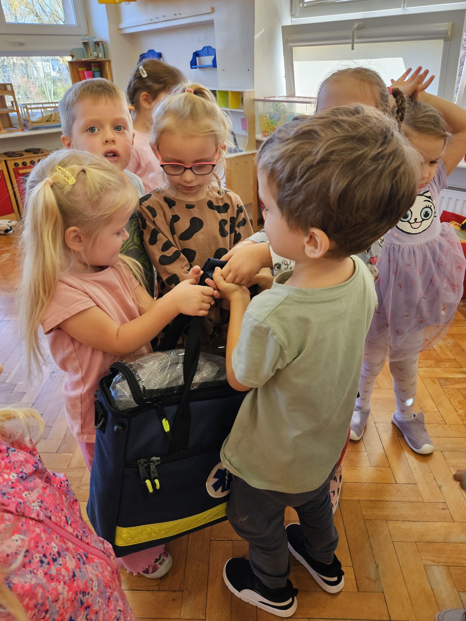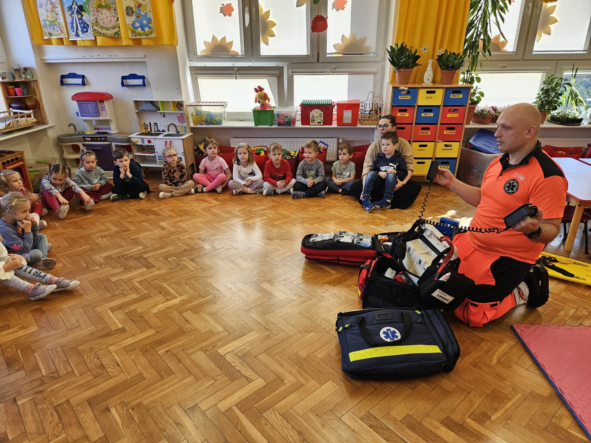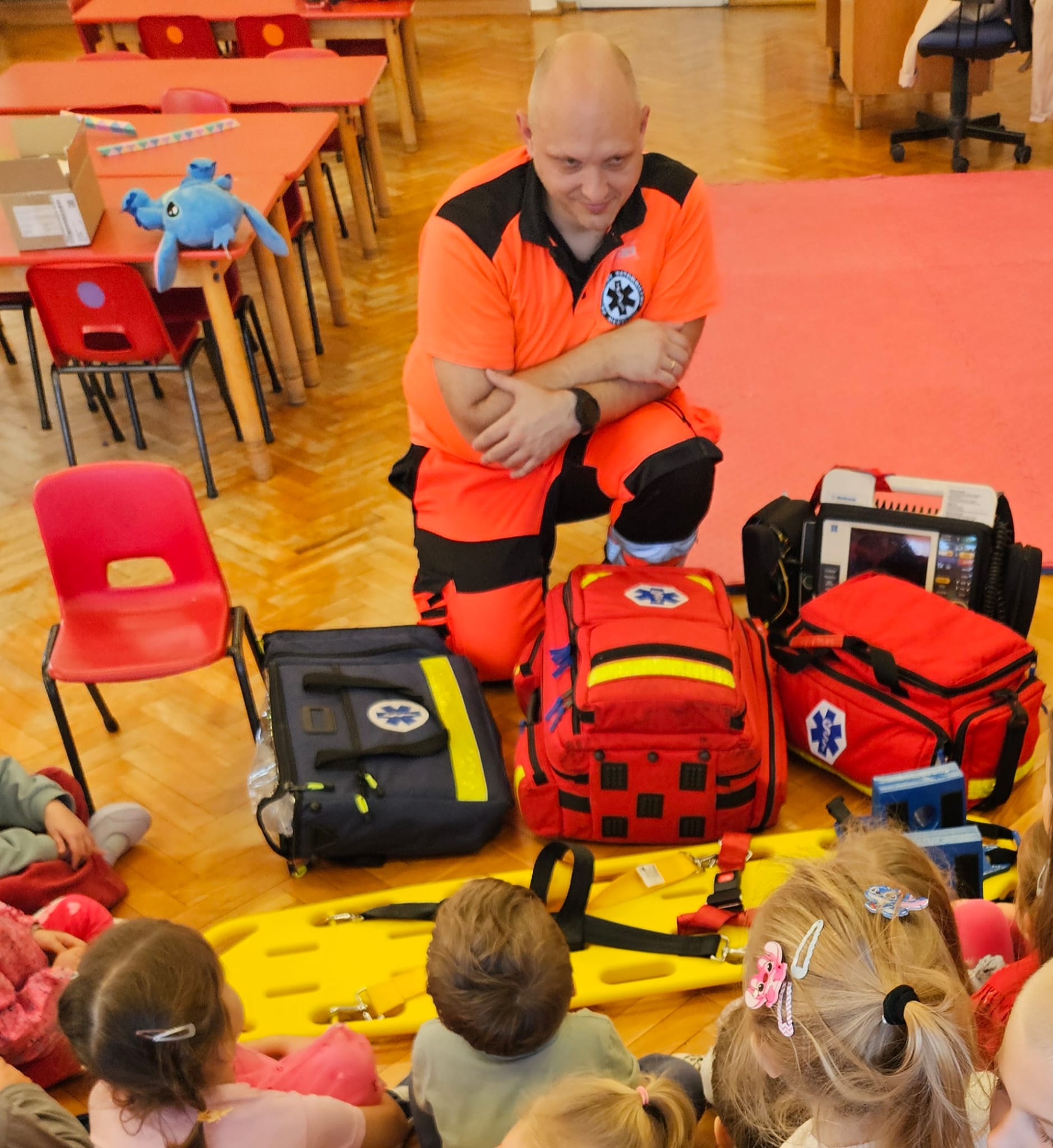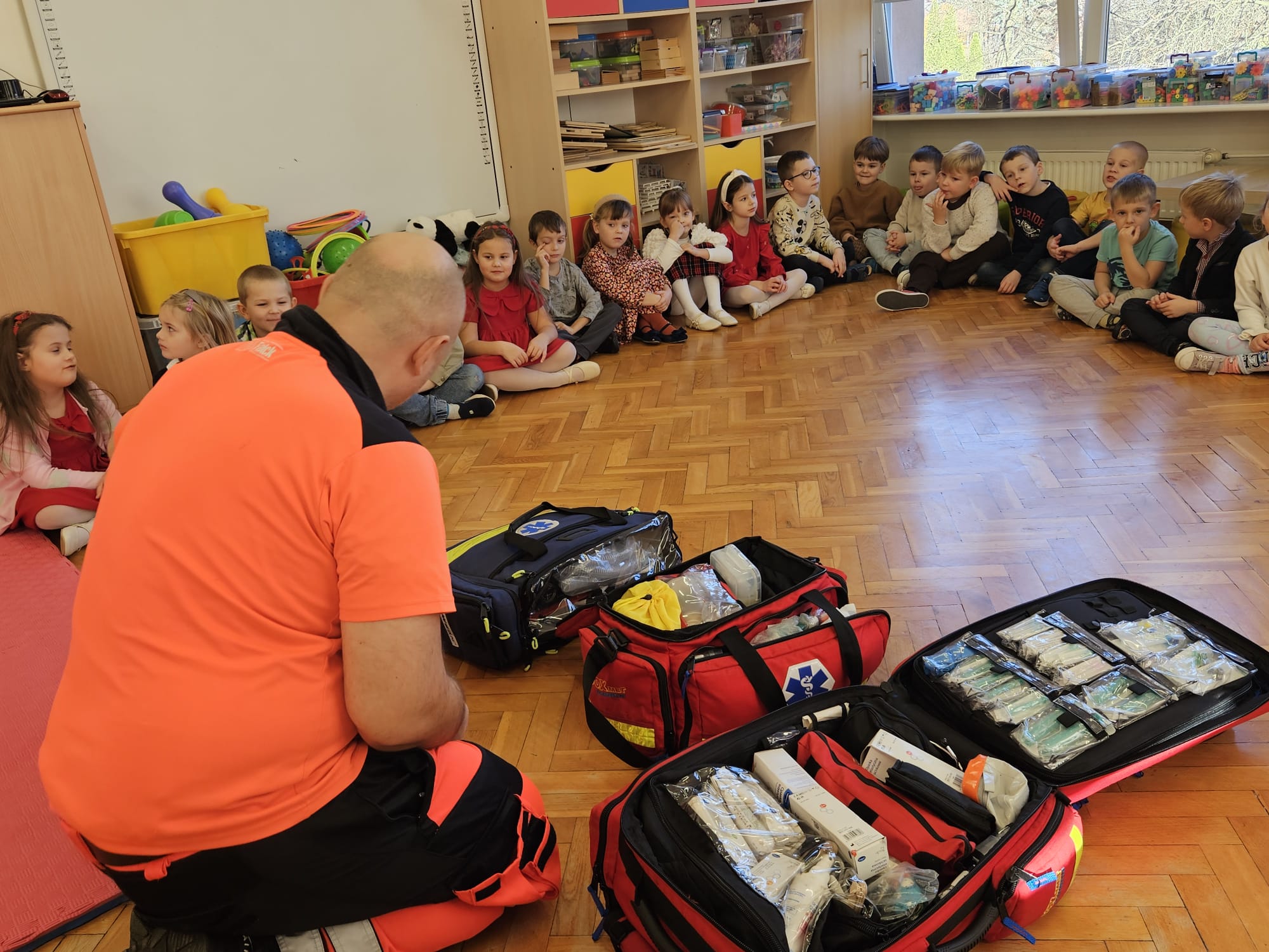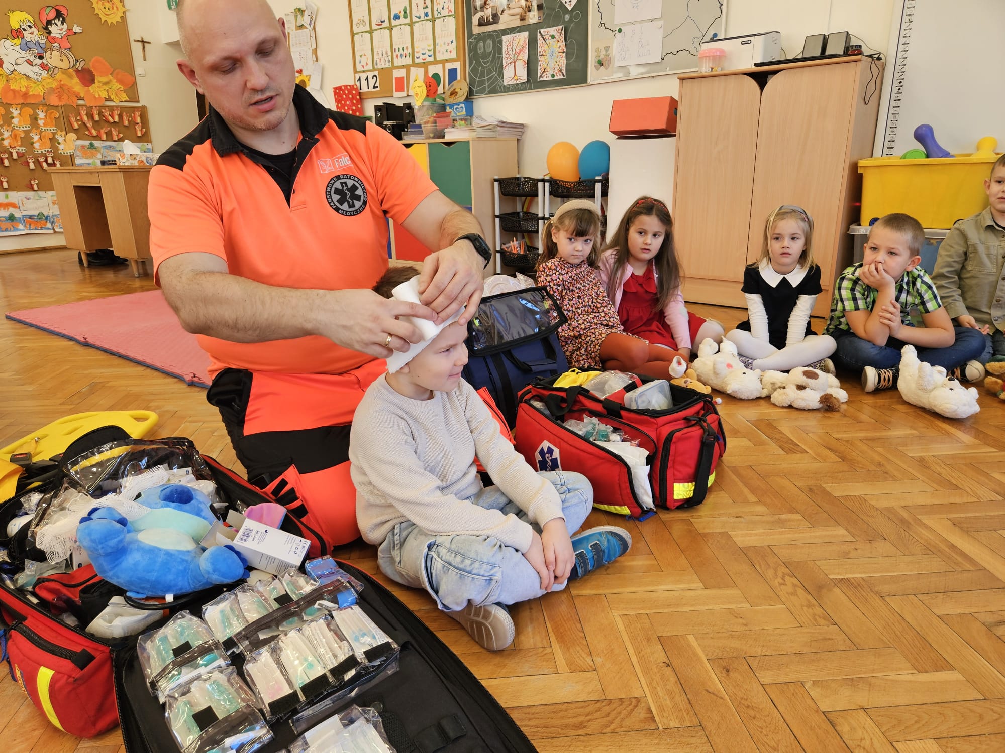 Dziś pod przedszkole zajechała karetka a do przedszkola z wielkimi i ciężkimi torbami wszedł w odblaskowym ubranku ratownik medyczny. To tata naszej koleżanki Poli. Utrwaliliśmy numery alarmowe. Musimy poćwiczyć jeszcze znajomość adresu (przynajmniej niektórzy). Widzieliśmy urządzenia, które pomagają ratować człowieka - respirator, defibrylator. Strasznie trudne nazwy. Wiemy jak zmierzyć cukier i to nie w cukiernicy. Jak zrobić zdjęcie kości i że nie wystarczy do tego aparat fotograficzny. Nasze przytulanki pomogły nam nauczyć się opatrywać rany. Usztywnialiśmy szpatułkami i zawijaliśmy bandażami łapki naszych przytulanek. Nasz kolega leżąc na desce miał fajnie. Kolegom udało się podnieść go razem z nią. To nie takie proste. Na koniec mogliśmy wejść do karetki i zobaczyć jej wnętrze. Obyśmy nigdy nie musieli z niej korzystać. Dziękujemy za ogrom wiedzy, cierpliwość i za wizytę.