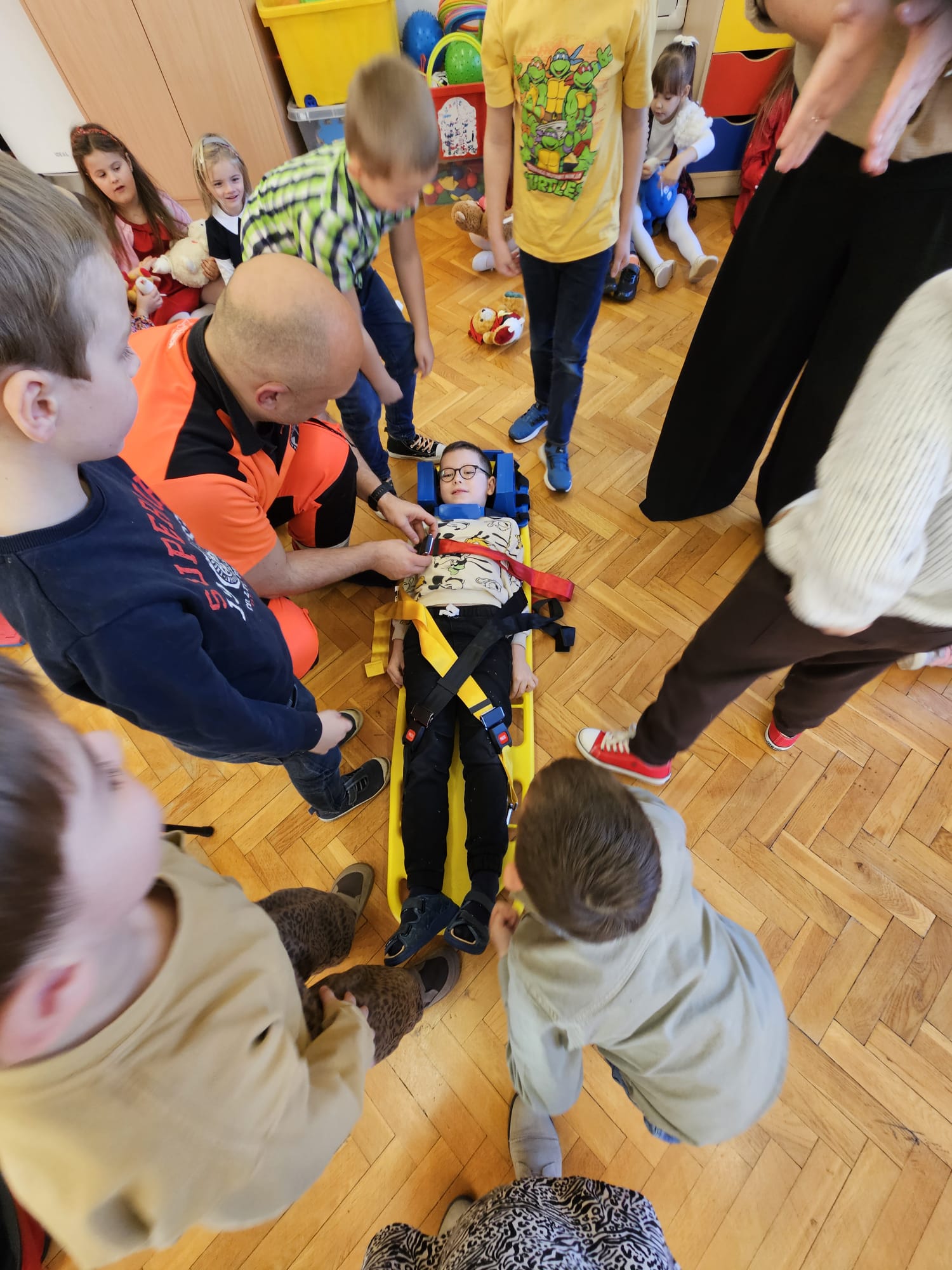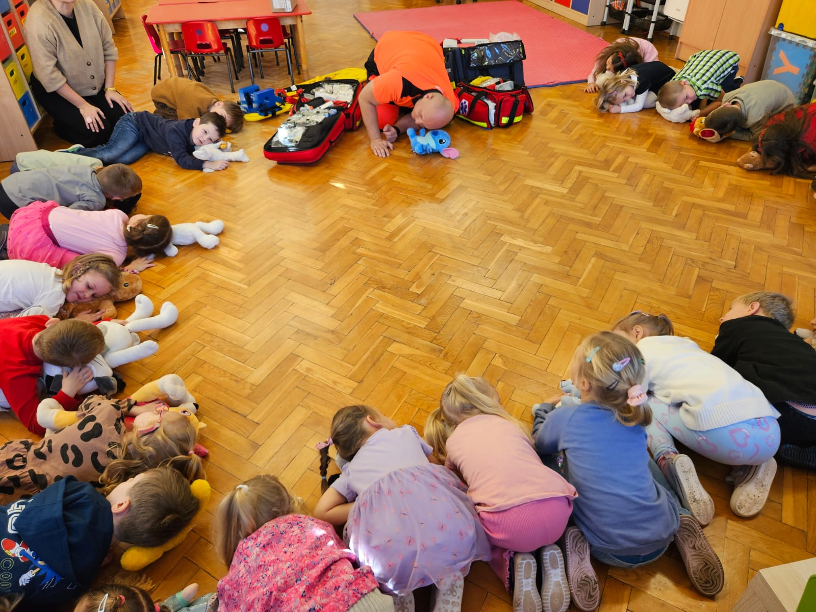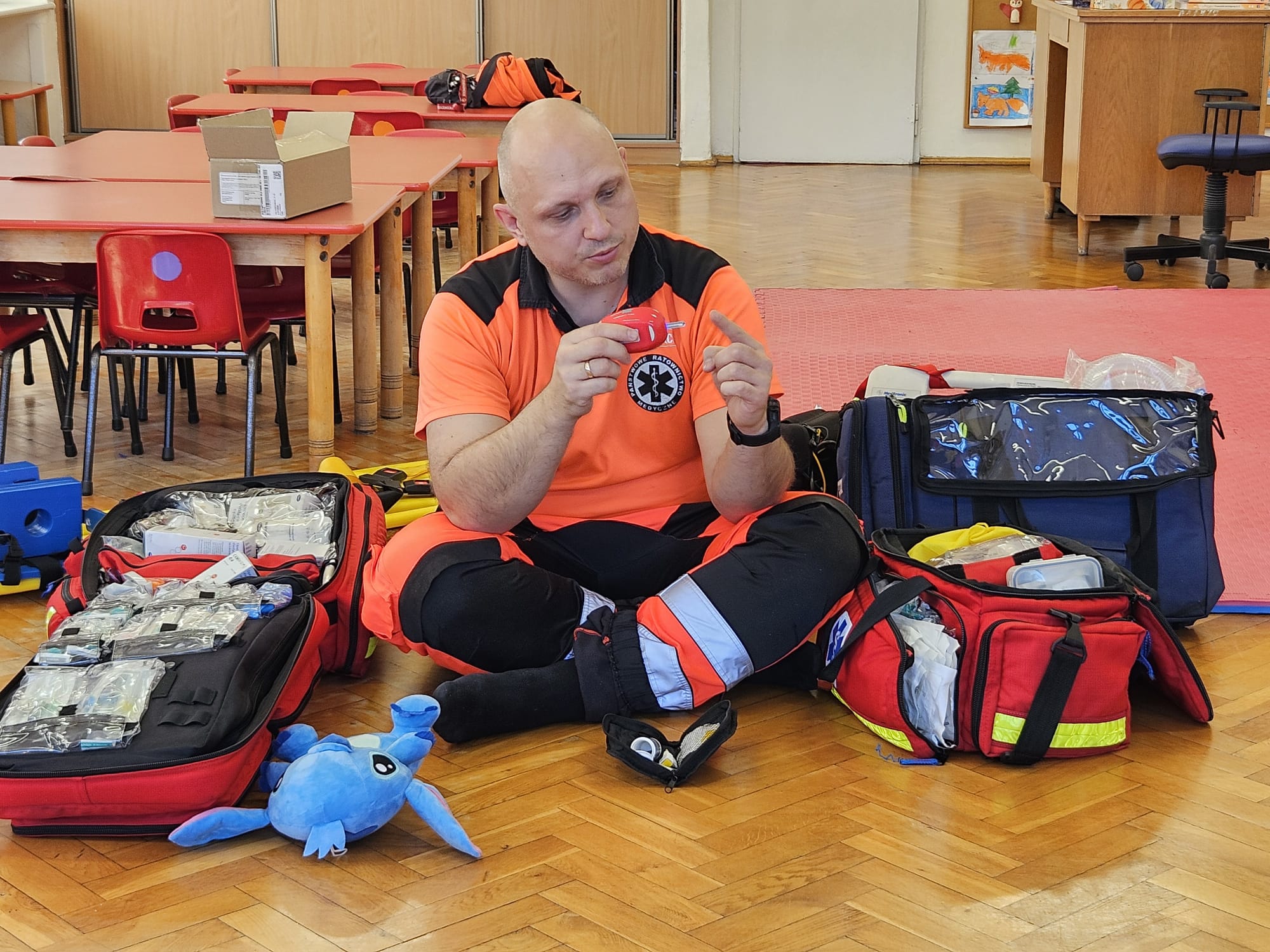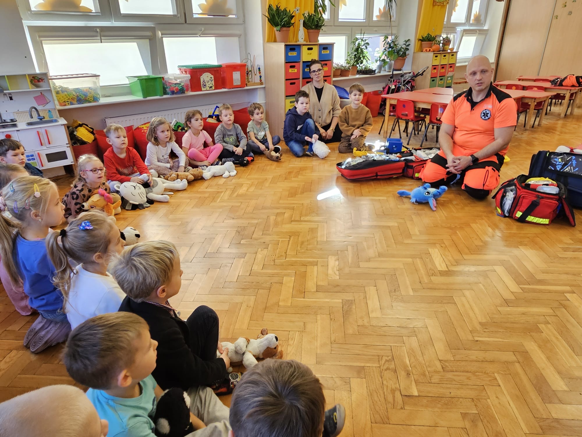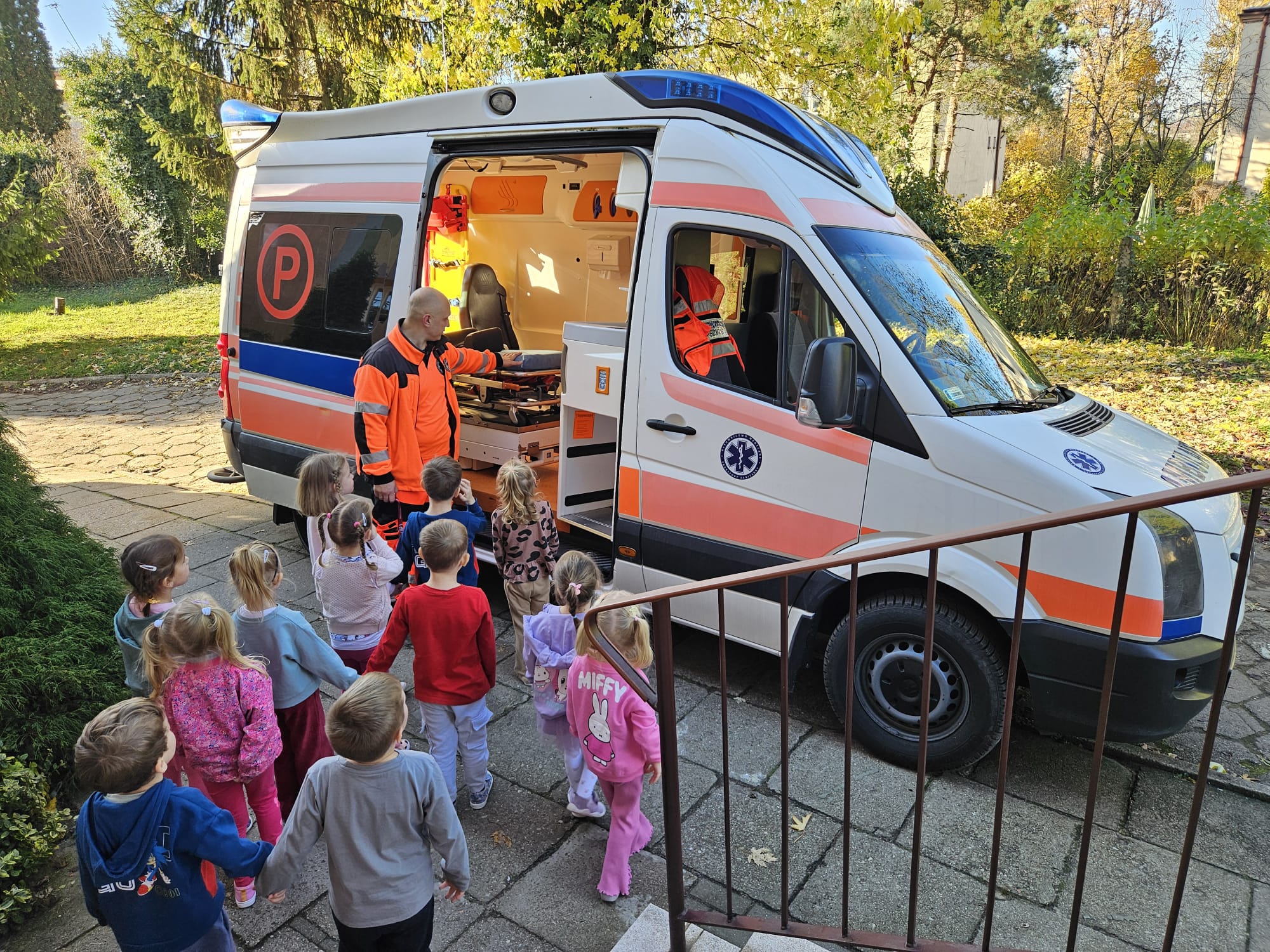 Dziś pod przedszkole zajechała karetka a do przedszkola z wielkimi i ciężkimi torbami wszedł w odblaskowym ubranku ratownik medyczny. To tata naszej koleżanki Poli. Utrwaliliśmy numery alarmowe. Musimy poćwiczyć jeszcze znajomość adresu (przynajmniej niektórzy). Widzieliśmy urządzenia, które pomagają ratować człowieka - respirator, defibrylator. Strasznie trudne nazwy. Wiemy jak zmierzyć cukier i to nie w cukiernicy. Jak zrobić zdjęcie kości i że nie wystarczy do tego aparat fotograficzny. Nasze przytulanki pomogły nam nauczyć się opatrywać rany. Usztywnialiśmy szpatułkami i zawijaliśmy bandażami łapki naszych przytulanek. Nasz kolega leżąc na desce miał fajnie. Kolegom udało się podnieść go razem z nią. To nie takie proste. Na koniec mogliśmy wejść do karetki i zobaczyć jej wnętrze. Obyśmy nigdy nie musieli z niej korzystać. Dziękujemy za ogrom wiedzy, cierpliwość i za wizytę.