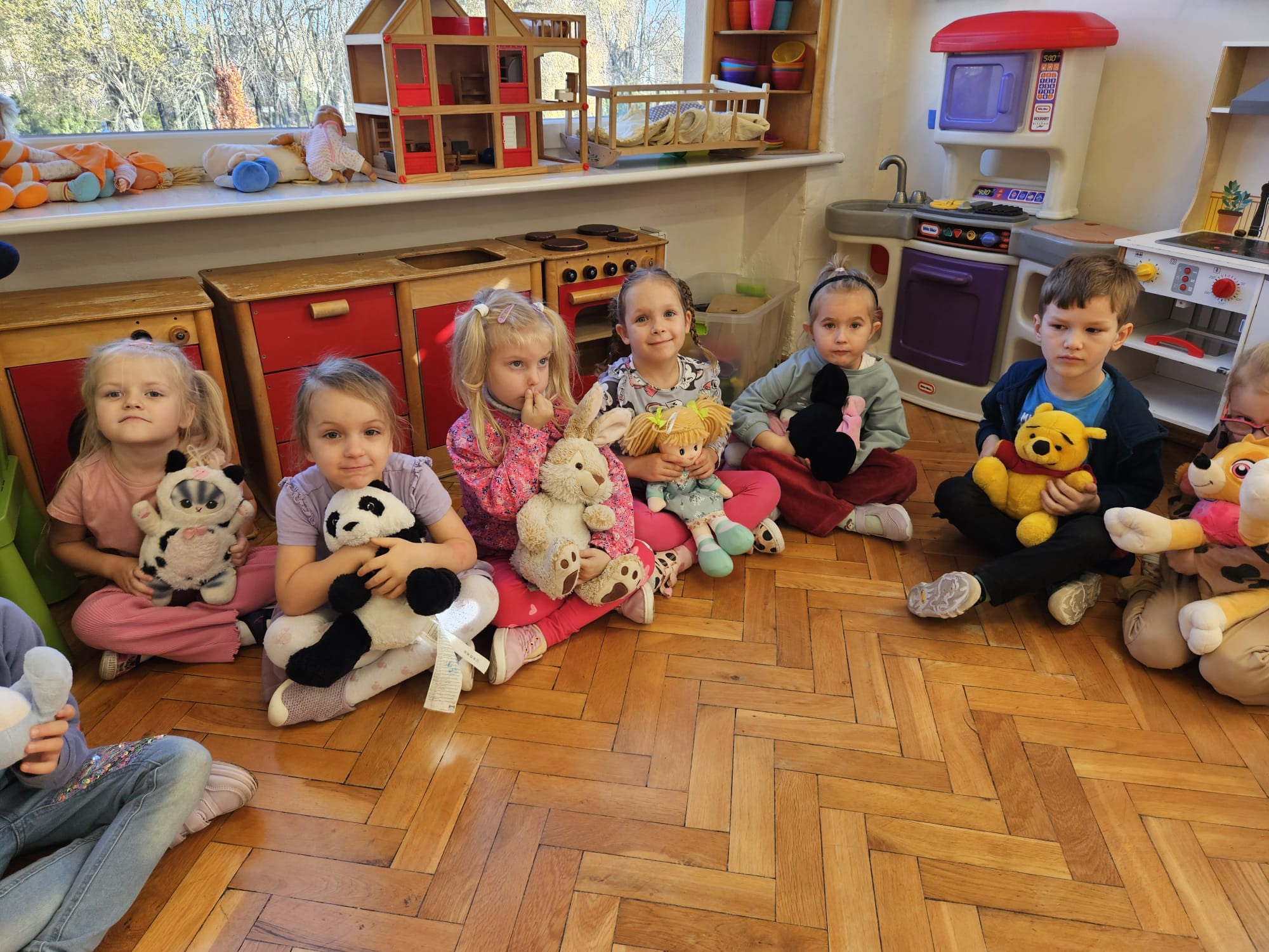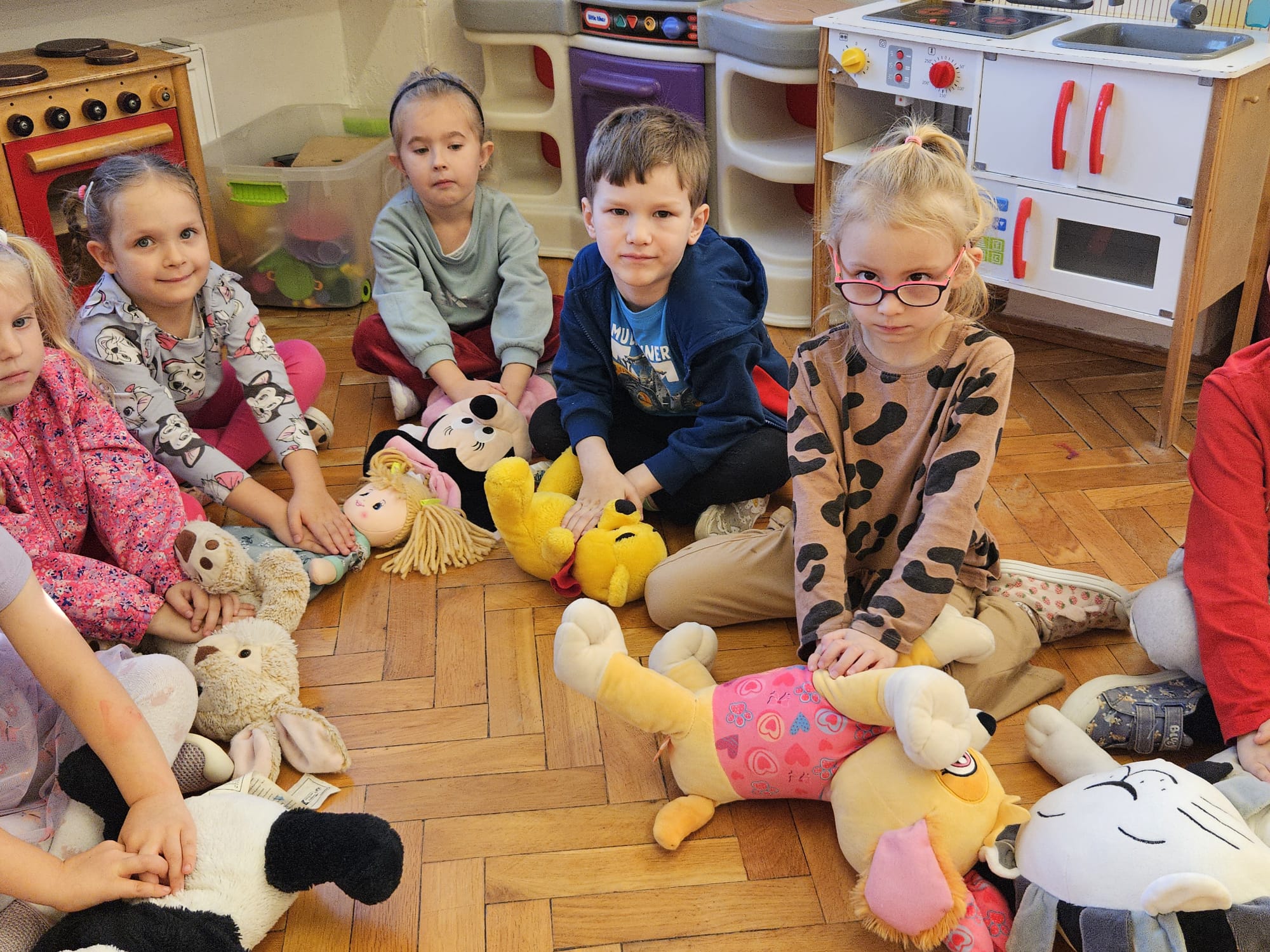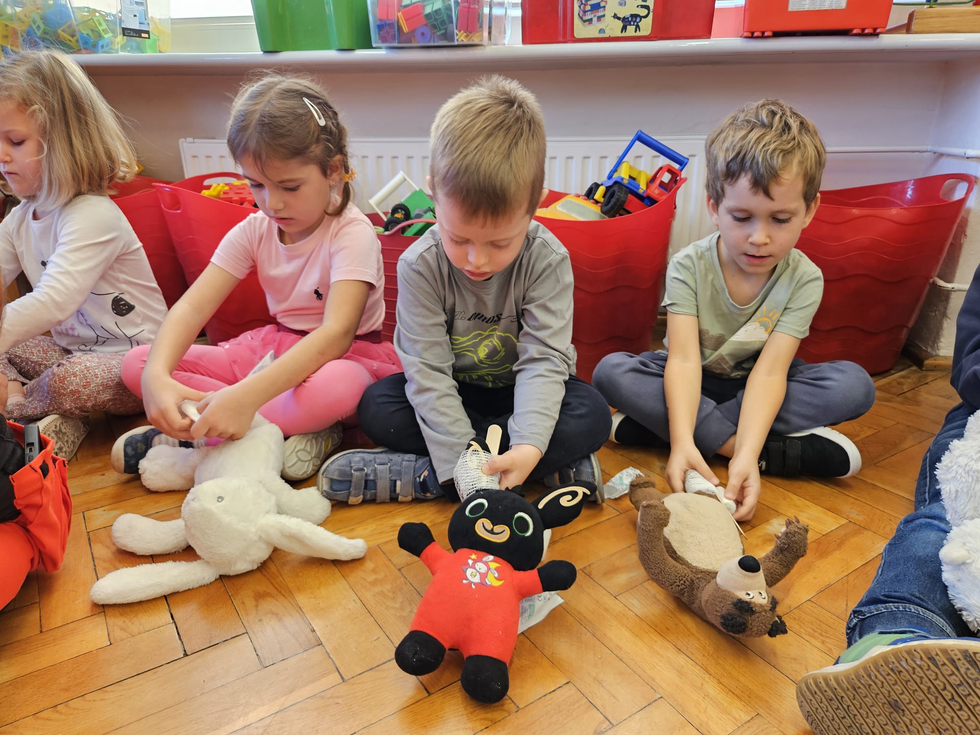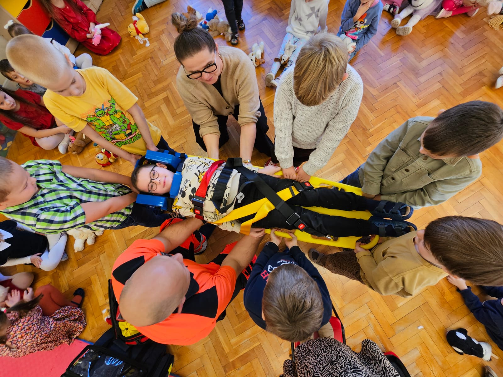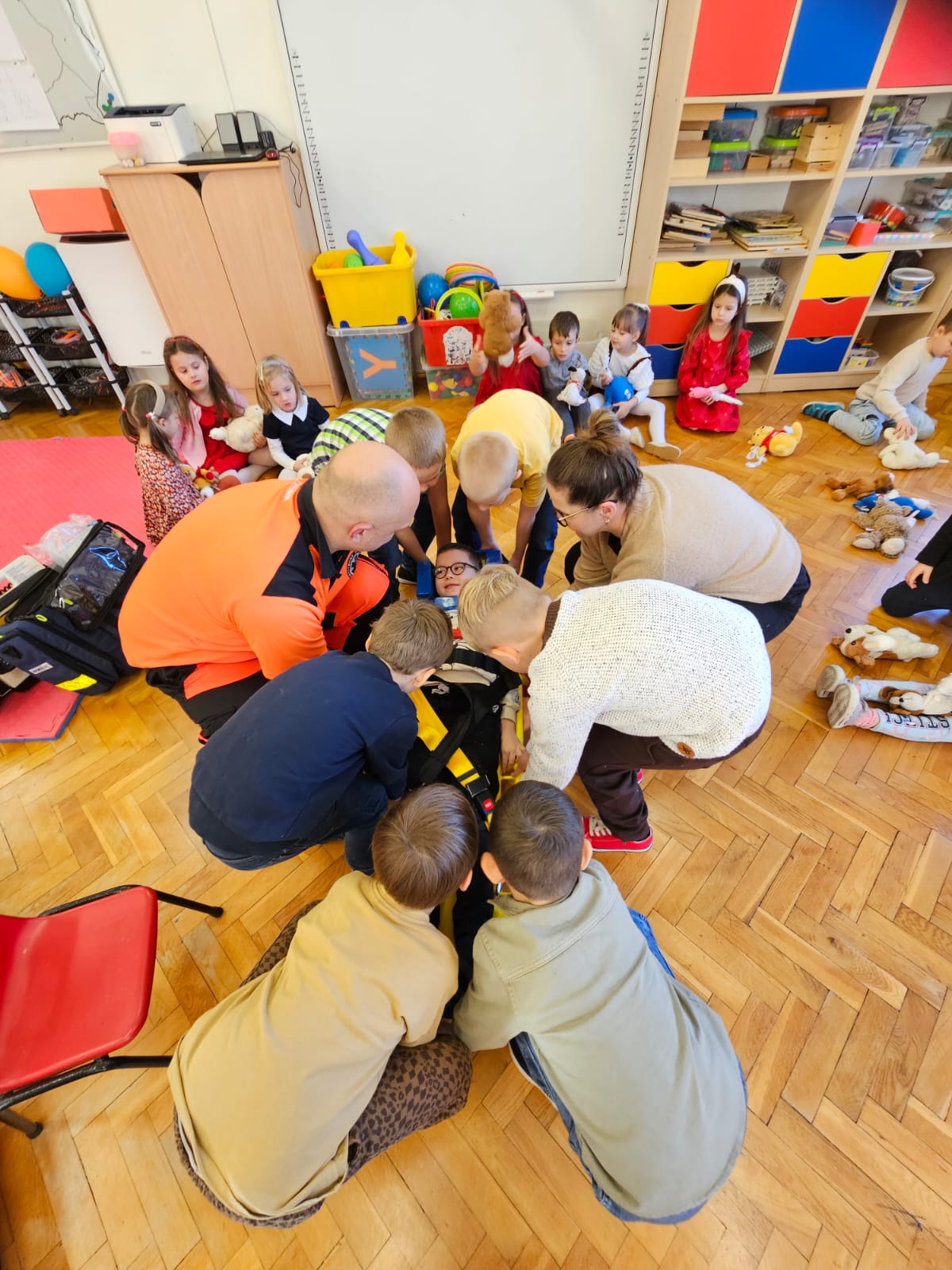 Dziś pod przedszkole zajechała karetka a do przedszkola z wielkimi i ciężkimi torbami wszedł w odblaskowym ubranku ratownik medyczny. To tata naszej koleżanki Poli. Utrwaliliśmy numery alarmowe. Musimy poćwiczyć jeszcze znajomość adresu (przynajmniej niektórzy). Widzieliśmy urządzenia, które pomagają ratować człowieka - respirator, defibrylator. Strasznie trudne nazwy. Wiemy jak zmierzyć cukier i to nie w cukiernicy. Jak zrobić zdjęcie kości i że nie wystarczy do tego aparat fotograficzny. Nasze przytulanki pomogły nam nauczyć się opatrywać rany. Usztywnialiśmy szpatułkami i zawijaliśmy bandażami łapki naszych przytulanek. Nasz kolega leżąc na desce miał fajnie. Kolegom udało się podnieść go razem z nią. To nie takie proste. Na koniec mogliśmy wejść do karetki i zobaczyć jej wnętrze. Obyśmy nigdy nie musieli z niej korzystać. Dziękujemy za ogrom wiedzy, cierpliwość i za wizytę.