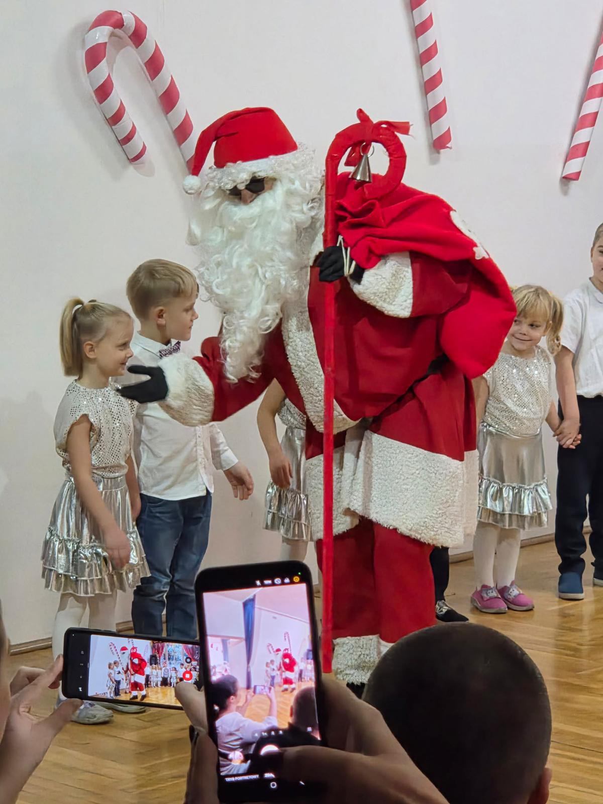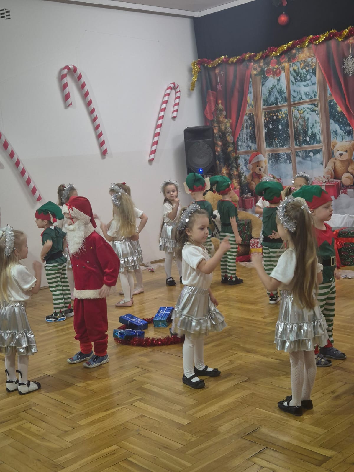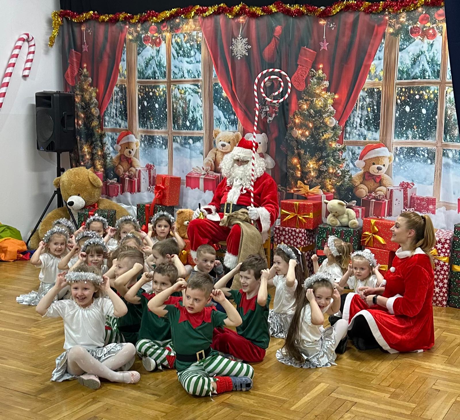 Jak co roku o tej porze... tak właśnie nadeszła długo wyczekiwana chwila - spotkanie z Mikołajem i prezenty. Ale na początek zaprosiliśmy naszych bliskich i prezentowaliśmy się na scenie z repertuarem świątecznym. Były tańce, wiersze, piosenki, (z mamami) kolędy a nawet inscenizacja zimowo-świąteczna. Na scenie wystąpili bałwan, choinka, Mikołaj, Elfy oraz Śnieżynki. Naszym popisom przyglądł się uważnie Mikołaj. Na koniec wręczył nam prezenty, pogłaskał po głowie, przybił piątkę. Nikt nie dostał rózgi. Chyba same grzeczne dzieci w naszym przedszkolu.