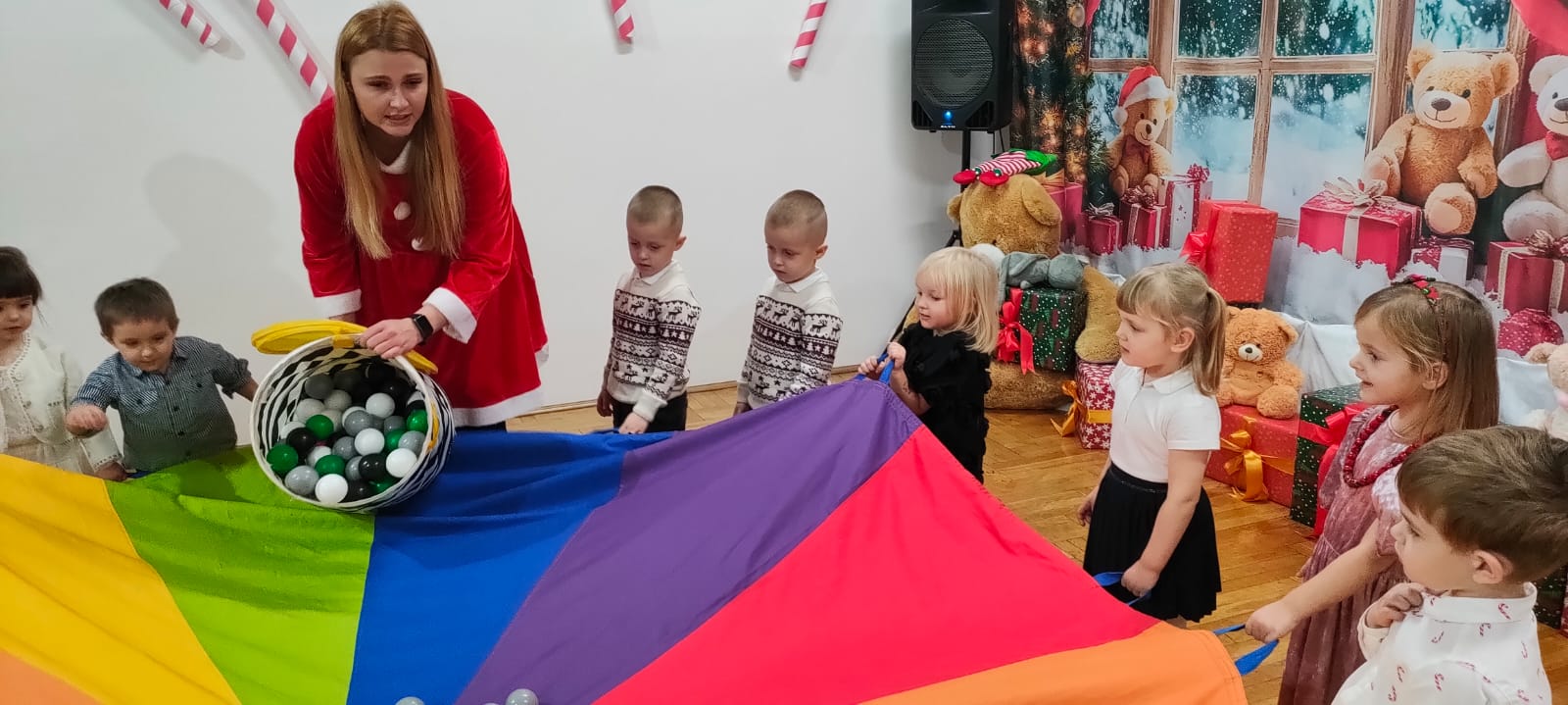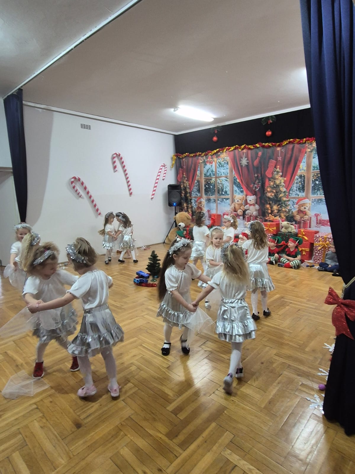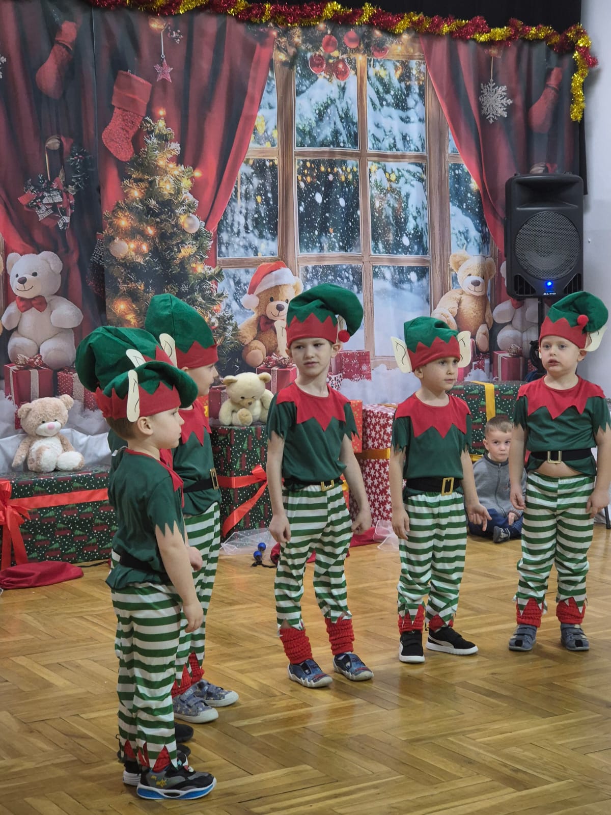 Jak co roku o tej porze... tak właśnie nadeszła długo wyczekiwana chwila - spotkanie z Mikołajem i prezenty. Ale na początek zaprosiliśmy naszych bliskich i prezentowaliśmy się na scenie z repertuarem świątecznym. Były tańce, wiersze, piosenki, (z mamami) kolędy a nawet inscenizacja zimowo-świąteczna. Na scenie wystąpili bałwan, choinka, Mikołaj, Elfy oraz Śnieżynki. Naszym popisom przyglądł się uważnie Mikołaj. Na koniec wręczył nam prezenty, pogłaskał po głowie, przybił piątkę. Nikt nie dostał rózgi. Chyba same grzeczne dzieci w naszym przedszkolu.