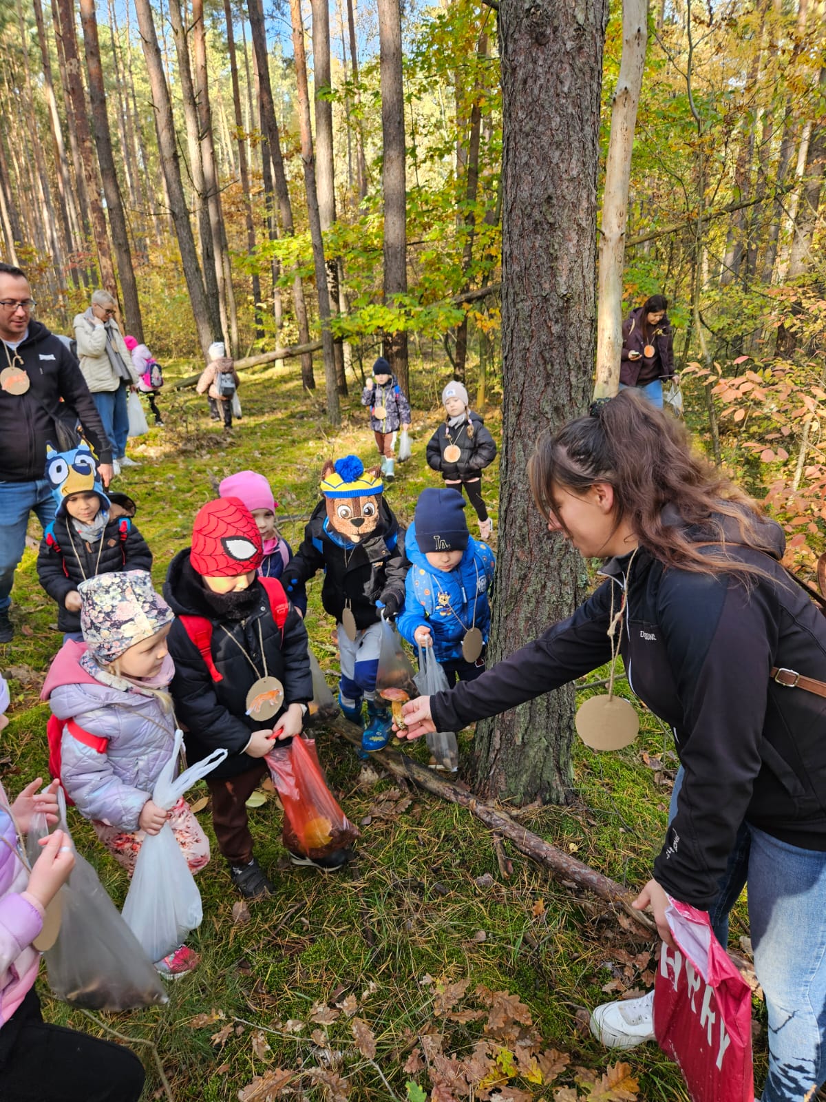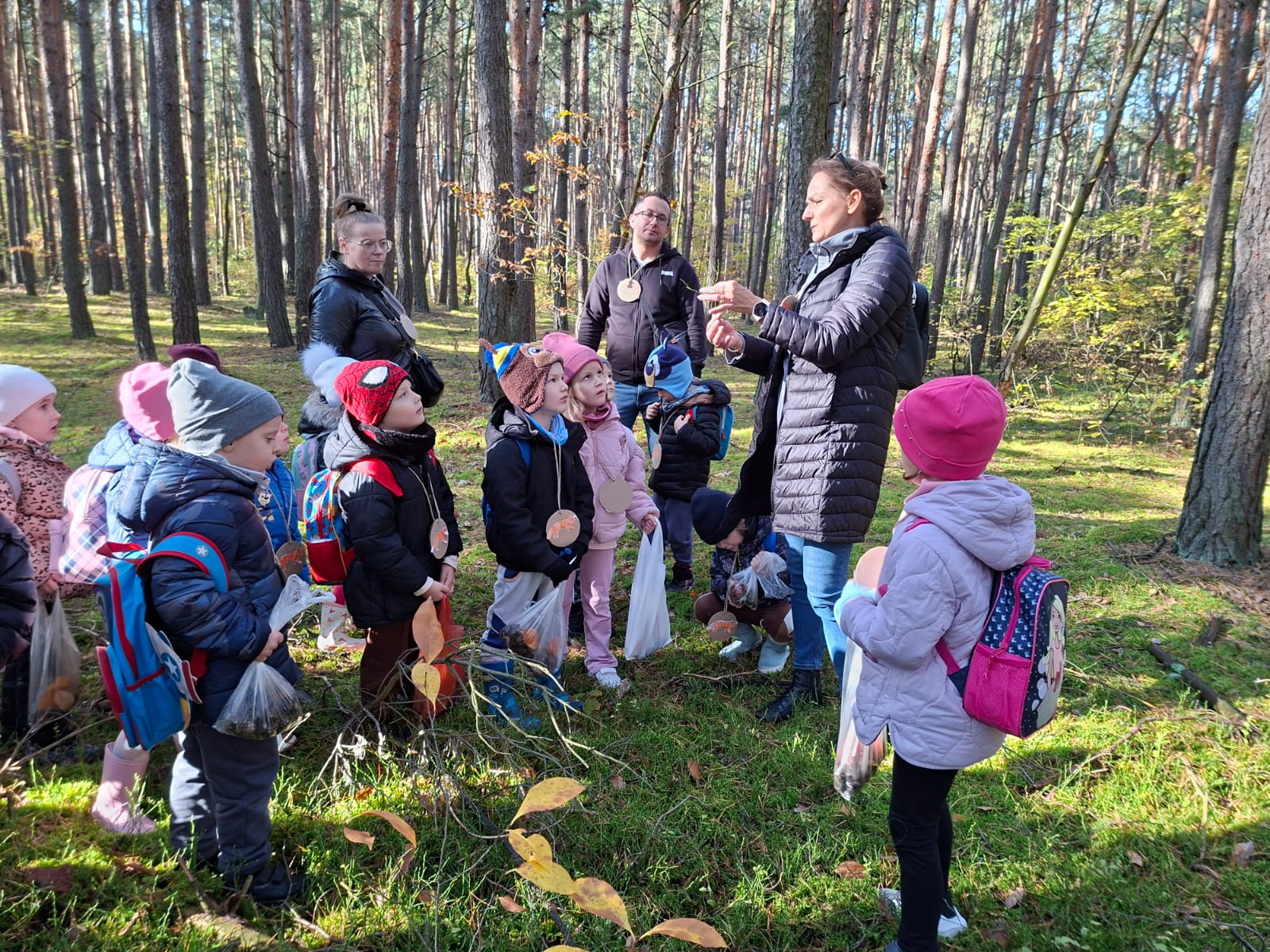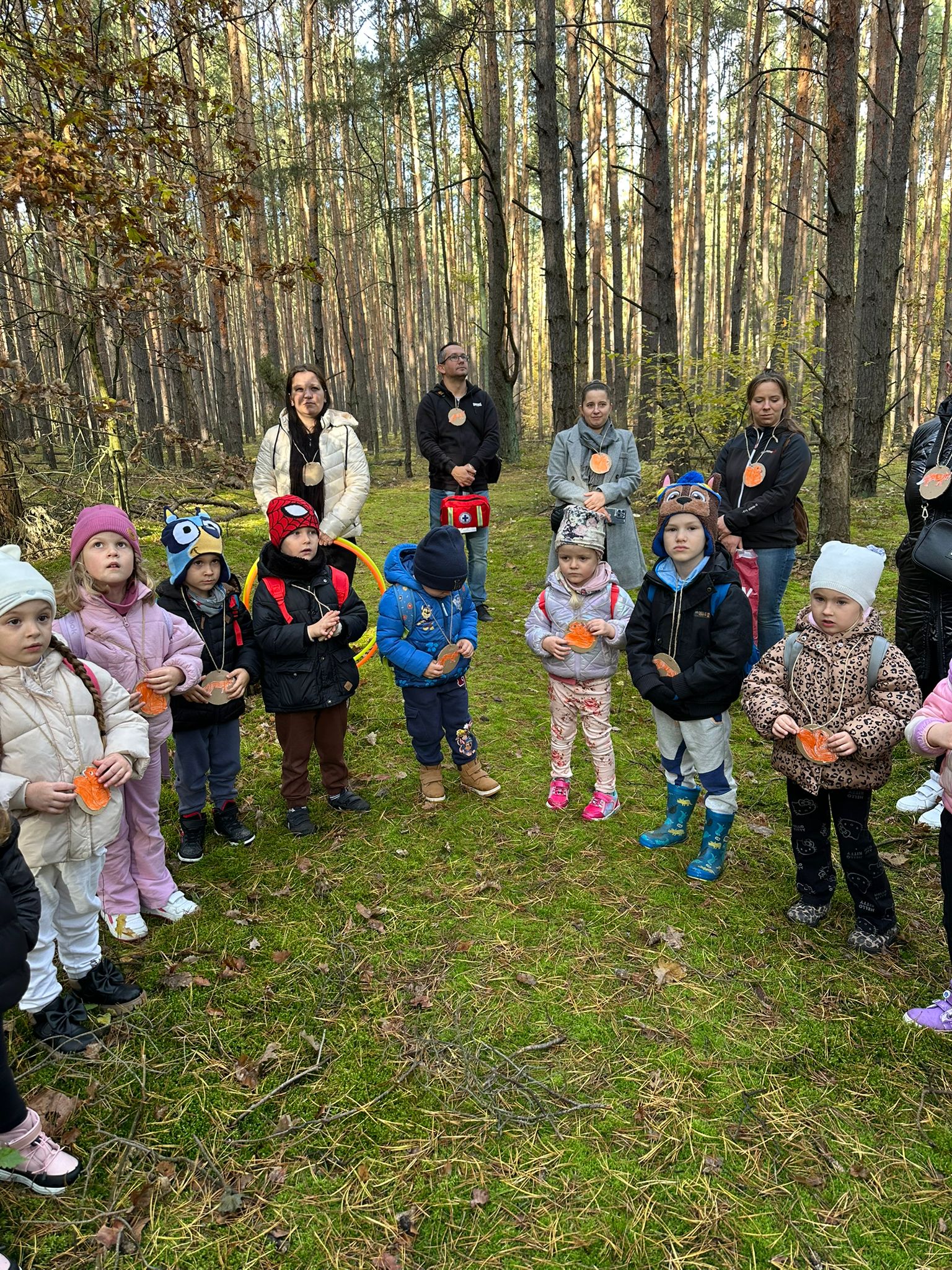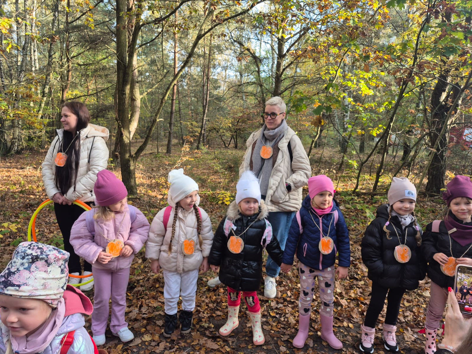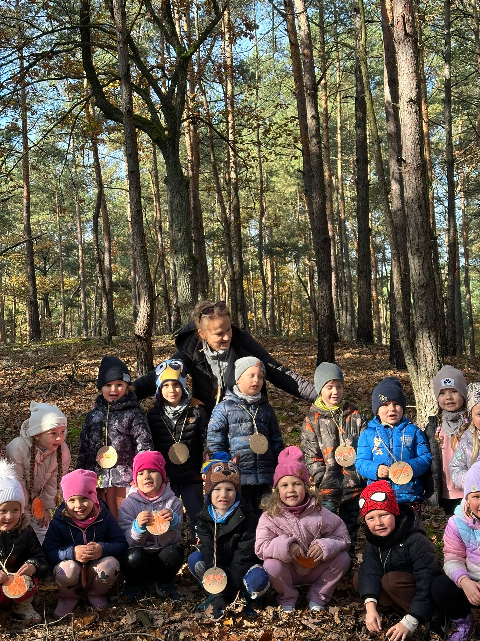 Na wycieczkę do jesiennego lasu zaprosiliśmy naszych rodziców. Nasza nauczycielka odczytała na początek list od pani Jesieni, która zaprosiła nas do poznania środowiska leśnego. Mianowała nas wiewiórkami i liskami. Każdy otrzymał emblemat ze zwierzątkiem (również rodzice i pani). Poznawaliśmy drzewa, poszycie i zwierzęta leśne. Widzielismy żuczki i mrówki. Zbieraliśmy dary lasu. Ale były też zabawy. POkonywaliśmy rożne przeszkody. Wiewiórki wskakiwały do dziupli a liski do nory. Rzucaliśmy szyszkami do celu. Zdobywaliśmy leśną górkę. Na koniec każdy otrzymał dyplom "Przyjaciela Lasu" i tuliliśmy się do drzew. Pozostawiliśmy porządek w lesie i z niechęcią wróciliśmy do autobusu.