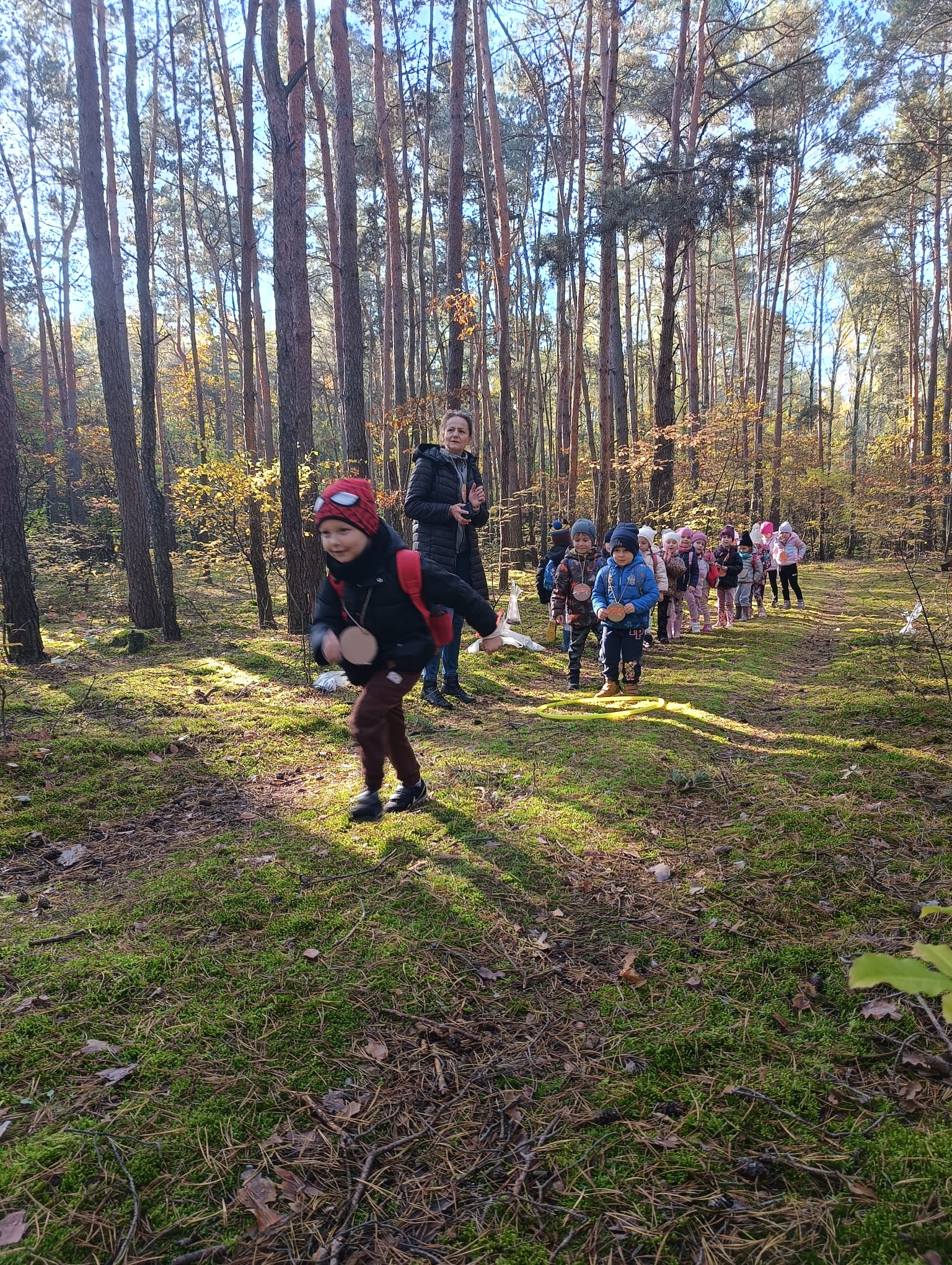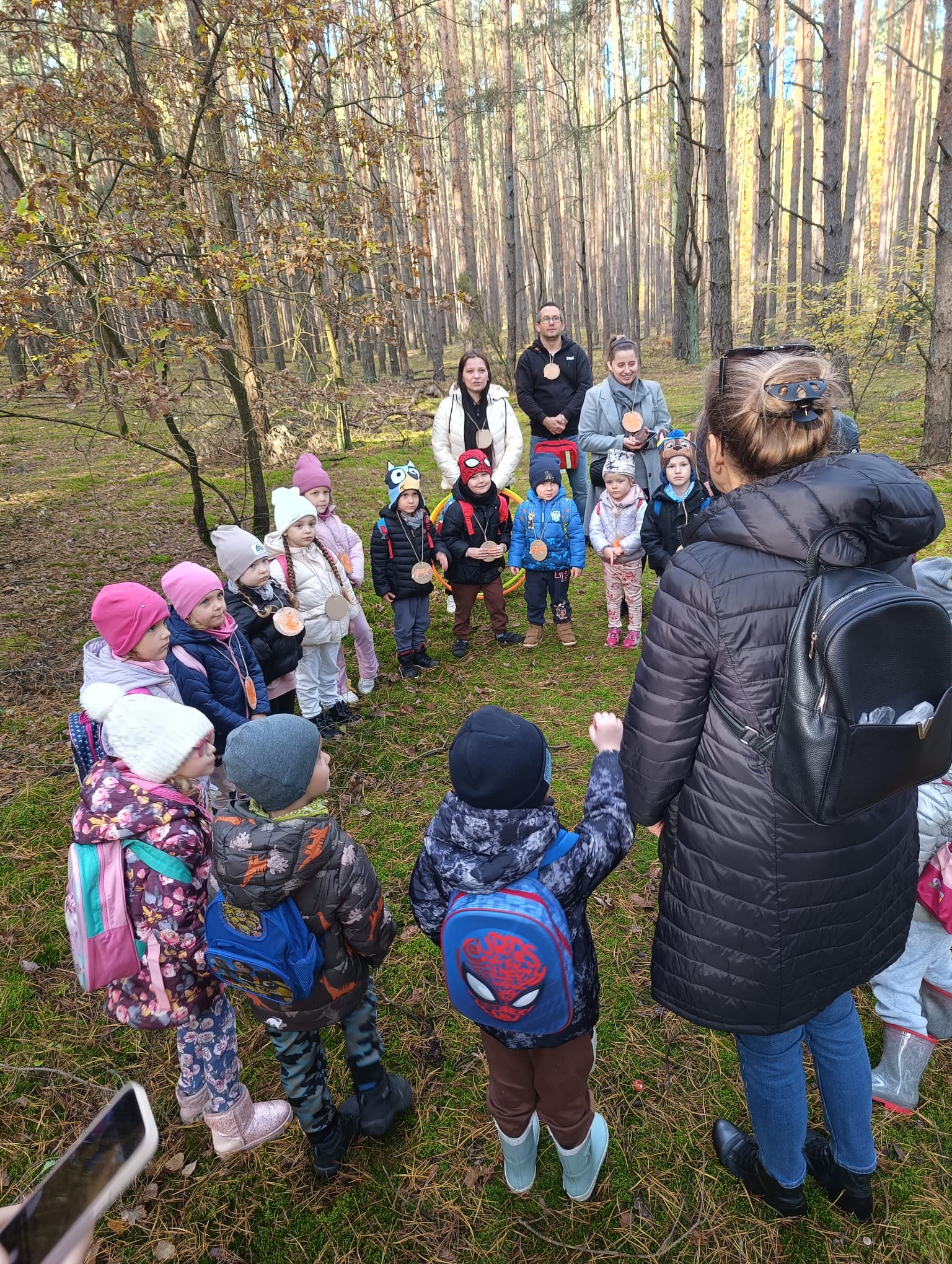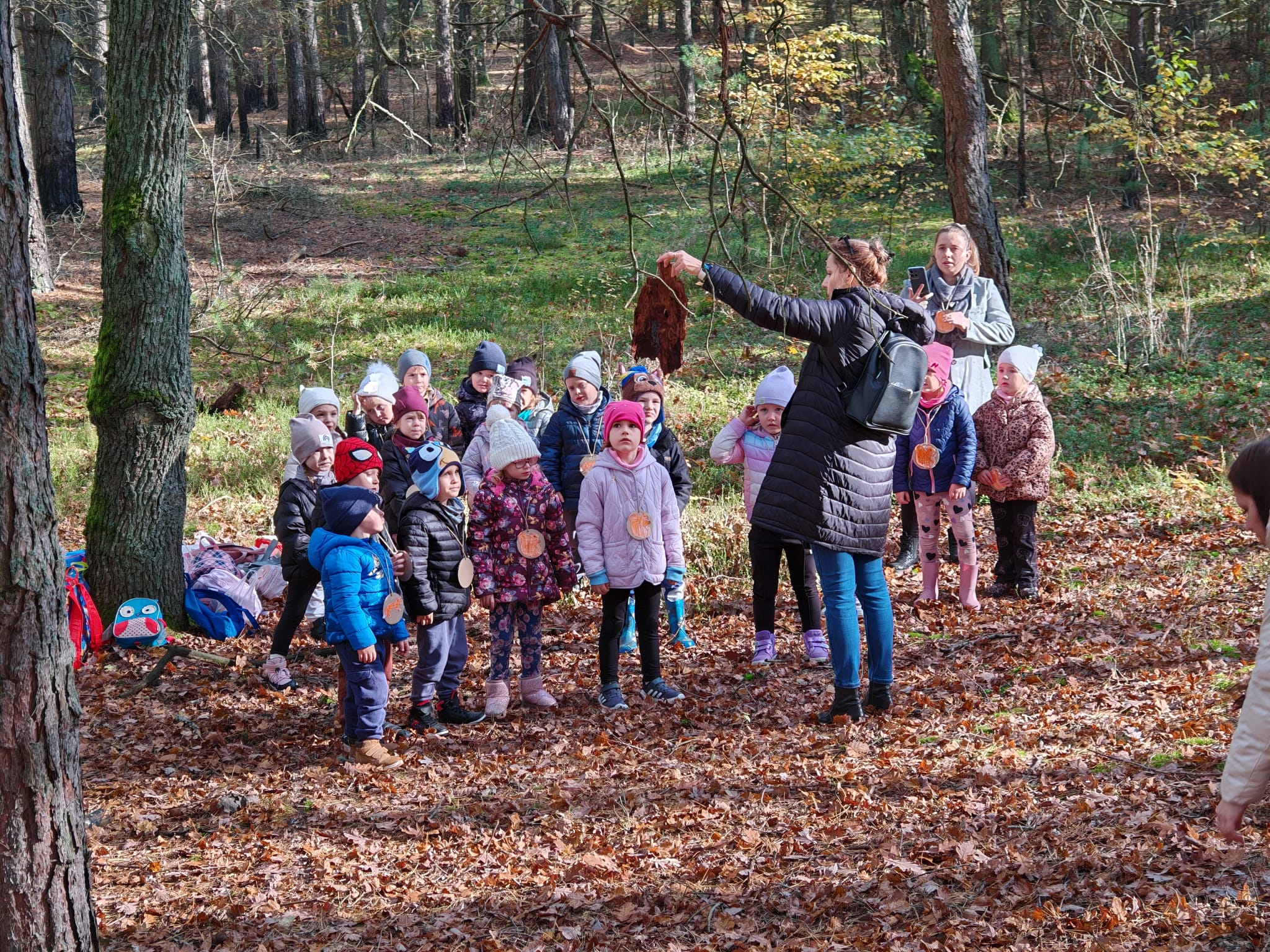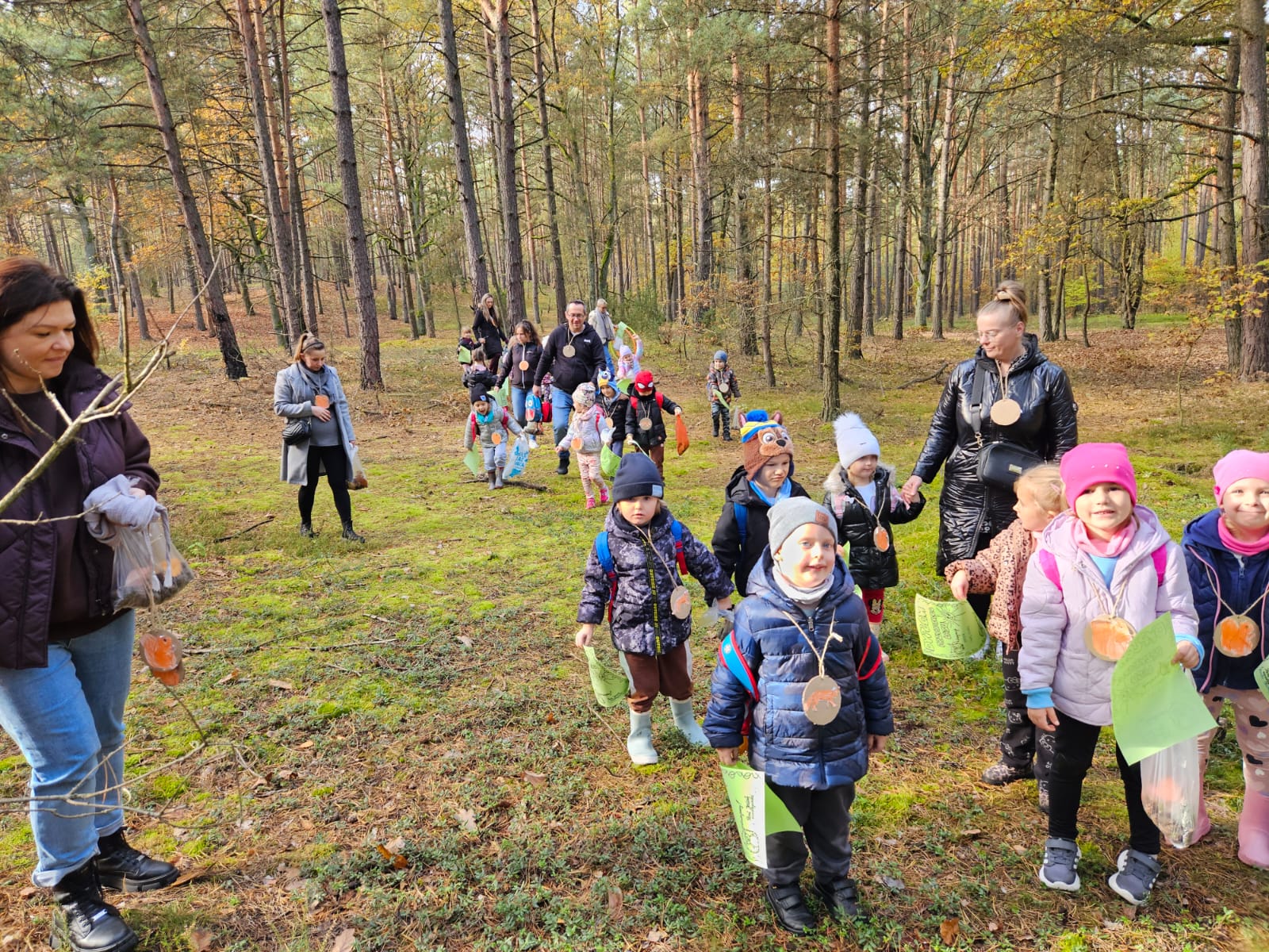 Na wycieczkę do jesiennego lasu zaprosiliśmy naszych rodziców. Nasza nauczycielka odczytała na początek list od pani Jesieni, która zaprosiła nas do poznania środowiska leśnego. Mianowała nas wiewiórkami i liskami. Każdy otrzymał emblemat ze zwierzątkiem (również rodzice i pani). Poznawaliśmy drzewa, poszycie i zwierzęta leśne. Widzielismy żuczki i mrówki. Zbieraliśmy dary lasu. Ale były też zabawy. POkonywaliśmy rożne przeszkody. Wiewiórki wskakiwały do dziupli a liski do nory. Rzucaliśmy szyszkami do celu. Zdobywaliśmy leśną górkę. Na koniec każdy otrzymał dyplom "Przyjaciela Lasu" i tuliliśmy się do drzew. Pozostawiliśmy porządek w lesie i z niechęcią wróciliśmy do autobusu.