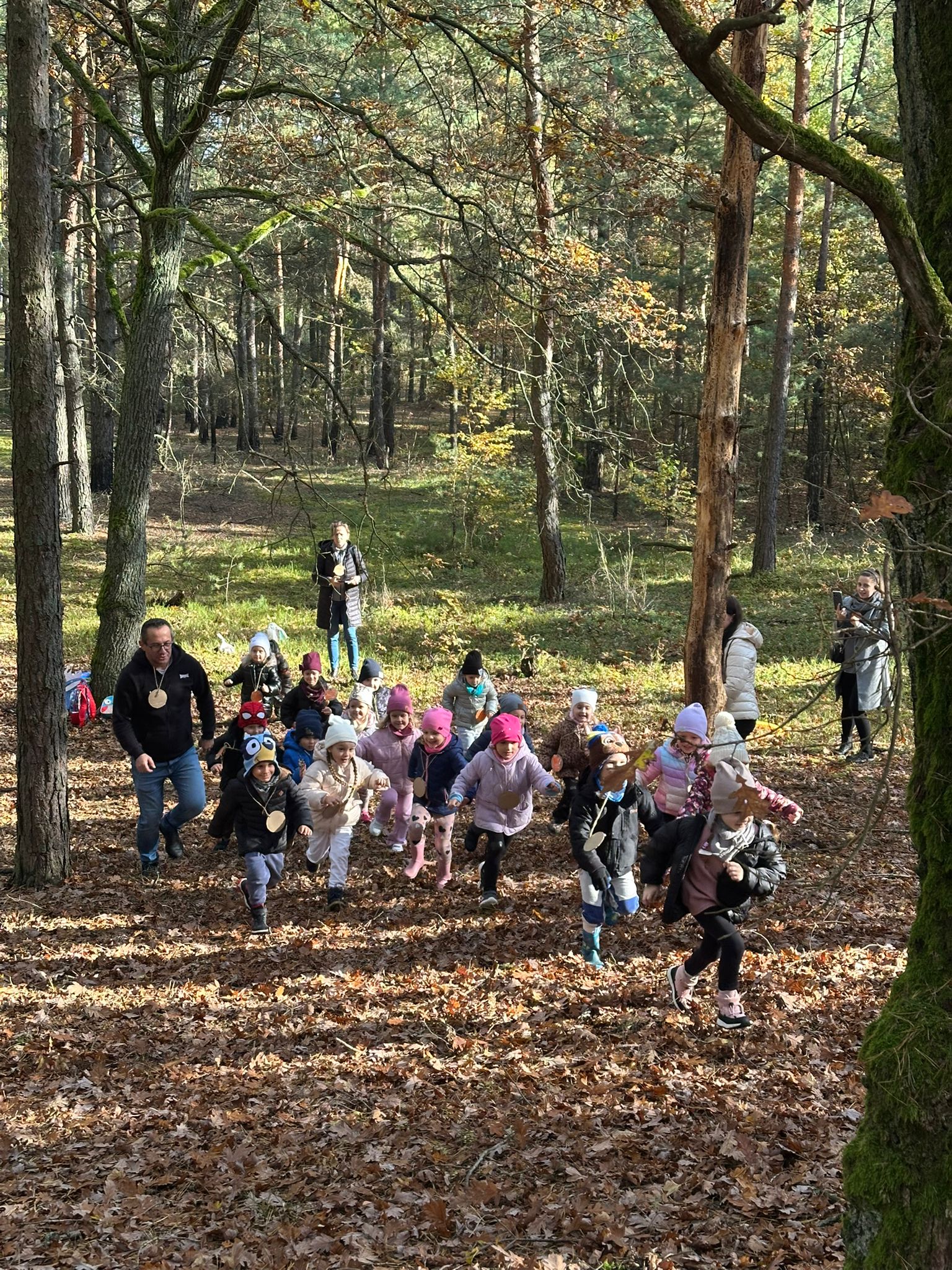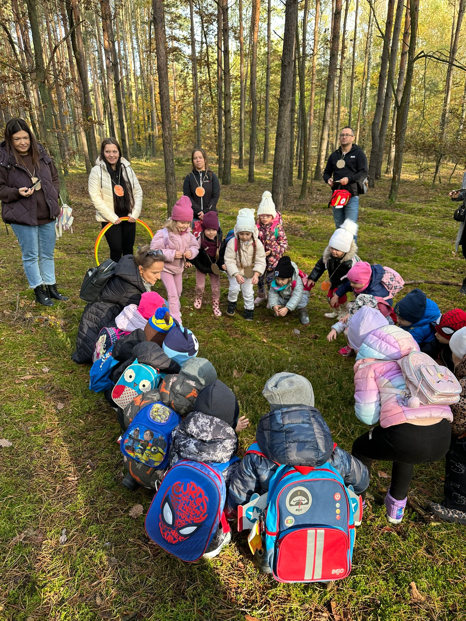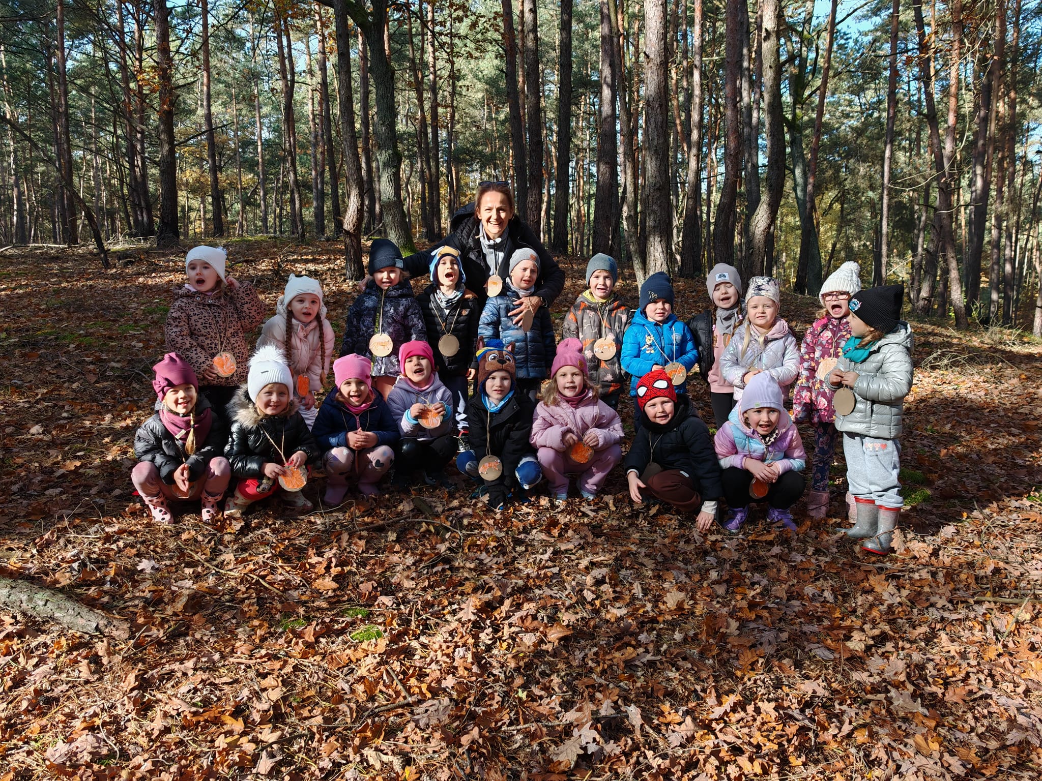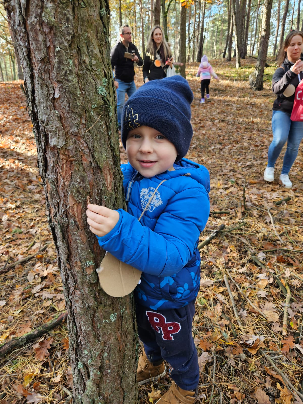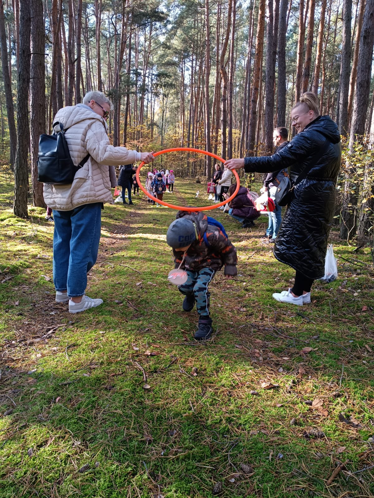 Na wycieczkę do jesiennego lasu zaprosiliśmy naszych rodziców. Nasza nauczycielka odczytała na początek list od pani Jesieni, która zaprosiła nas do poznania środowiska leśnego. Mianowała nas wiewiórkami i liskami. Każdy otrzymał emblemat ze zwierzątkiem (również rodzice i pani). Poznawaliśmy drzewa, poszycie i zwierzęta leśne. Widzielismy żuczki i mrówki. Zbieraliśmy dary lasu. Ale były też zabawy. POkonywaliśmy rożne przeszkody. Wiewiórki wskakiwały do dziupli a liski do nory. Rzucaliśmy szyszkami do celu. Zdobywaliśmy leśną górkę. Na koniec każdy otrzymał dyplom "Przyjaciela Lasu" i tuliliśmy się do drzew. Pozostawiliśmy porządek w lesie i z niechęcią wróciliśmy do autobusu.