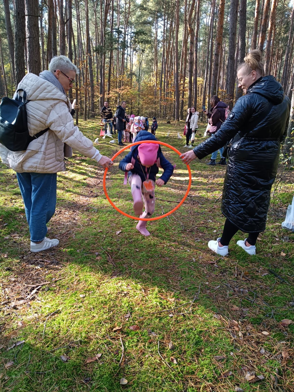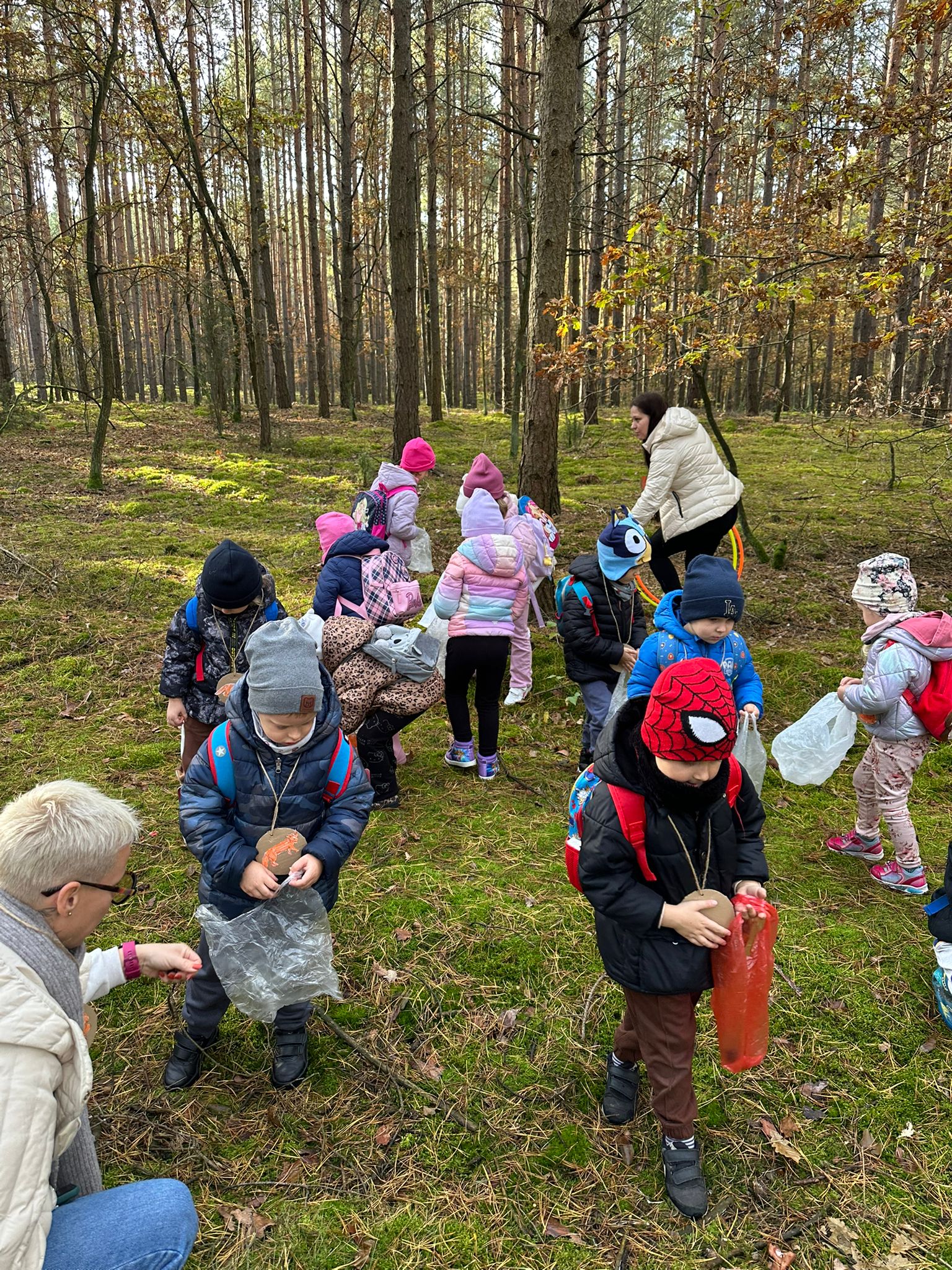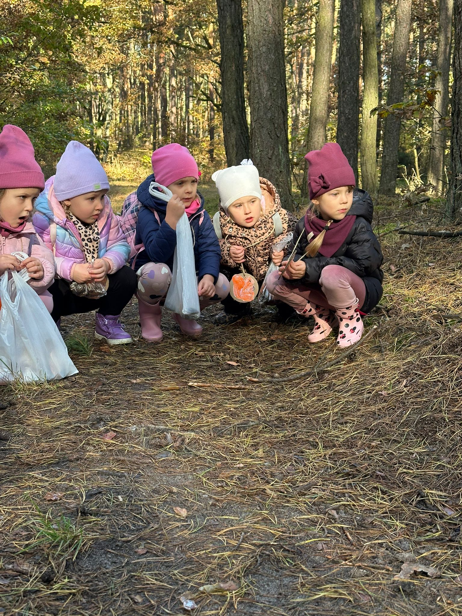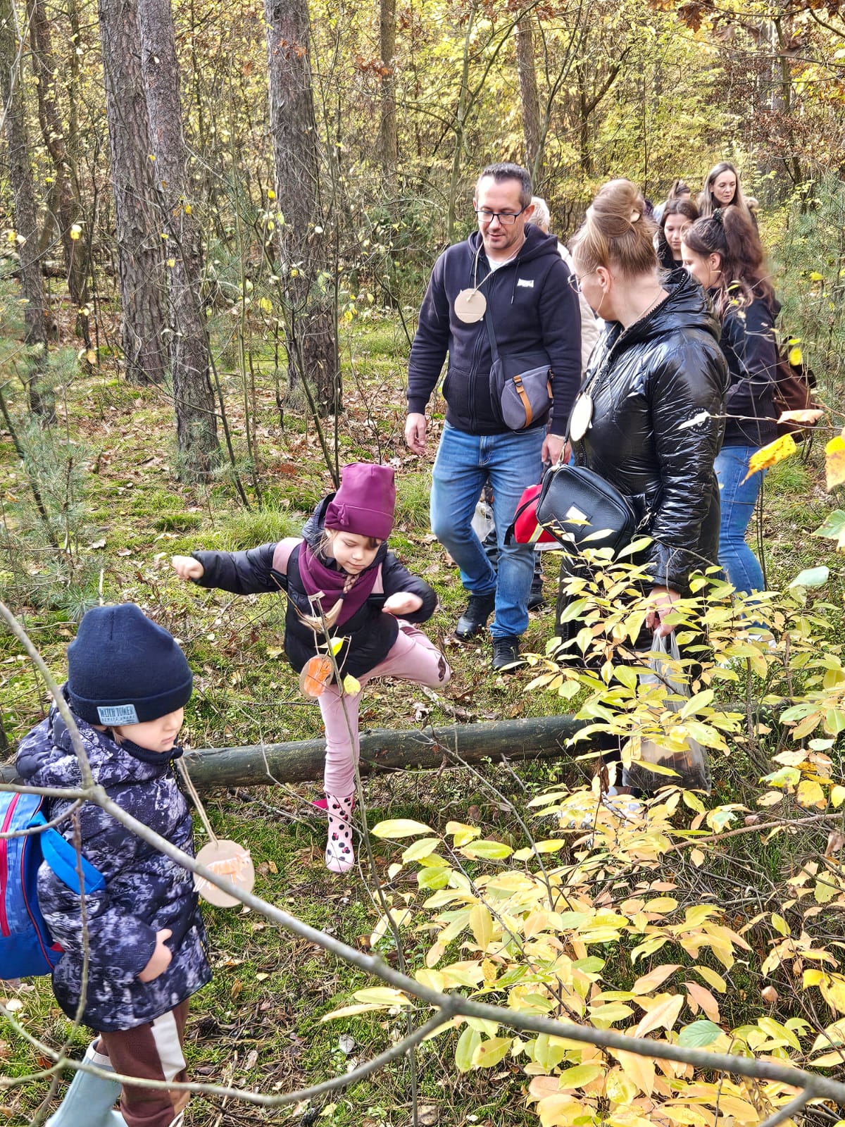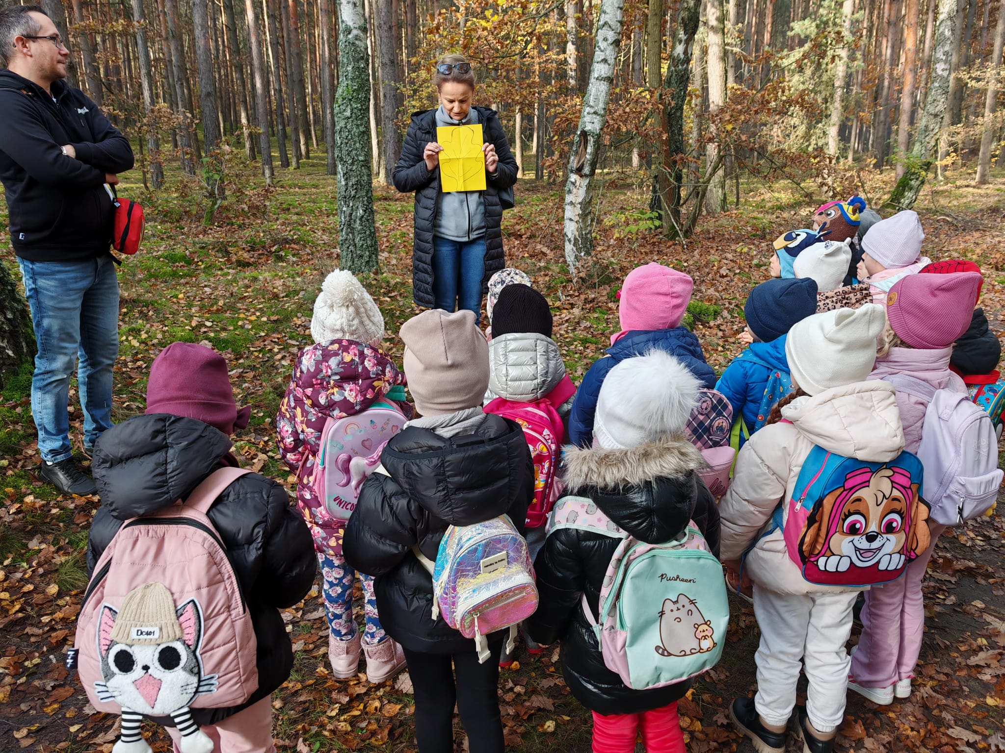 Na wycieczkę do jesiennego lasu zaprosiliśmy naszych rodziców. Nasza nauczycielka odczytała na początek list od pani Jesieni, która zaprosiła nas do poznania środowiska leśnego. Mianowała nas wiewiórkami i liskami. Każdy otrzymał emblemat ze zwierzątkiem (również rodzice i pani). Poznawaliśmy drzewa, poszycie i zwierzęta leśne. Widzielismy żuczki i mrówki. Zbieraliśmy dary lasu. Ale były też zabawy. POkonywaliśmy rożne przeszkody. Wiewiórki wskakiwały do dziupli a liski do nory. Rzucaliśmy szyszkami do celu. Zdobywaliśmy leśną górkę. Na koniec każdy otrzymał dyplom "Przyjaciela Lasu" i tuliliśmy się do drzew. Pozostawiliśmy porządek w lesie i z niechęcią wróciliśmy do autobusu.